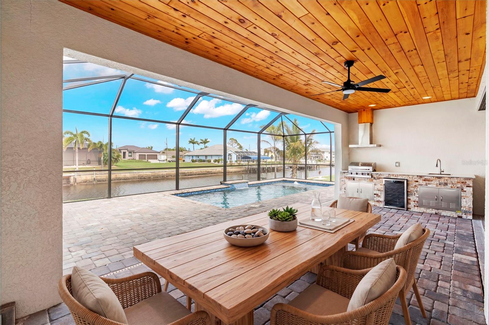 Step outside and enjoy the ultimate Florida lifestyle with a FULLY EQUIPPED OUTDOOR KITCHEN, a GUNITE STEP-IN SWIMMING POOL, and UPGRADED LANDSCAPING that enhances curb appeal and privacy. Situated on a premium lot, this home offers WATERFRONT LIVING WITH DIRECT GULF ACCESS, complete with a REINFORCED CONCRETE SEAWALL—ideal for boating and water enthusiasts.