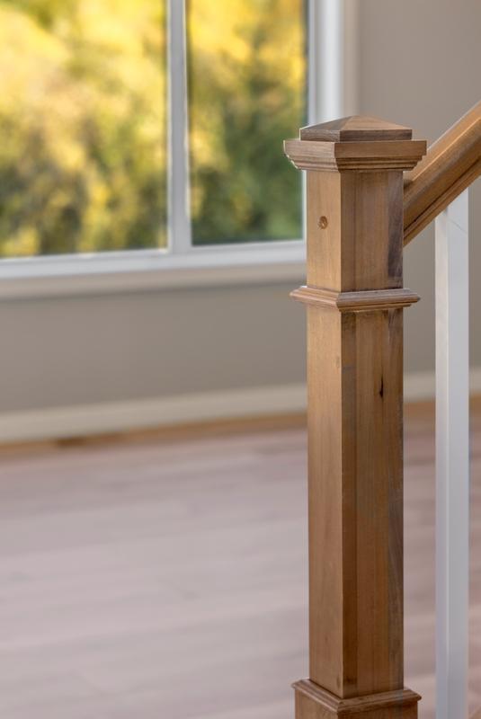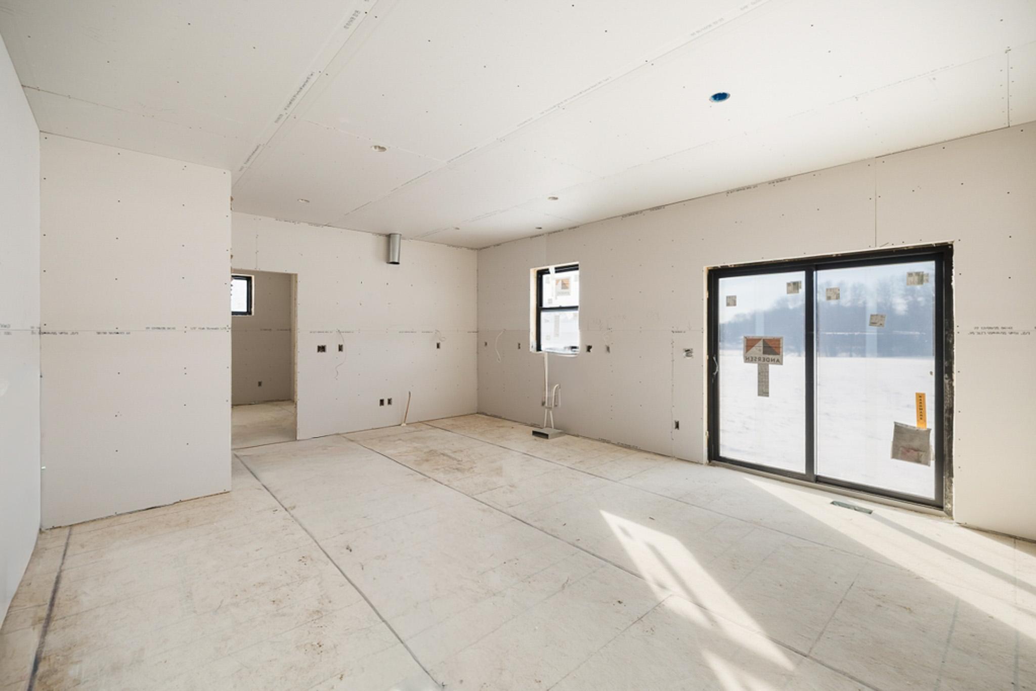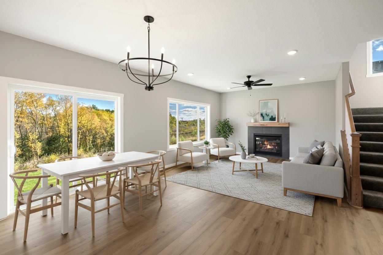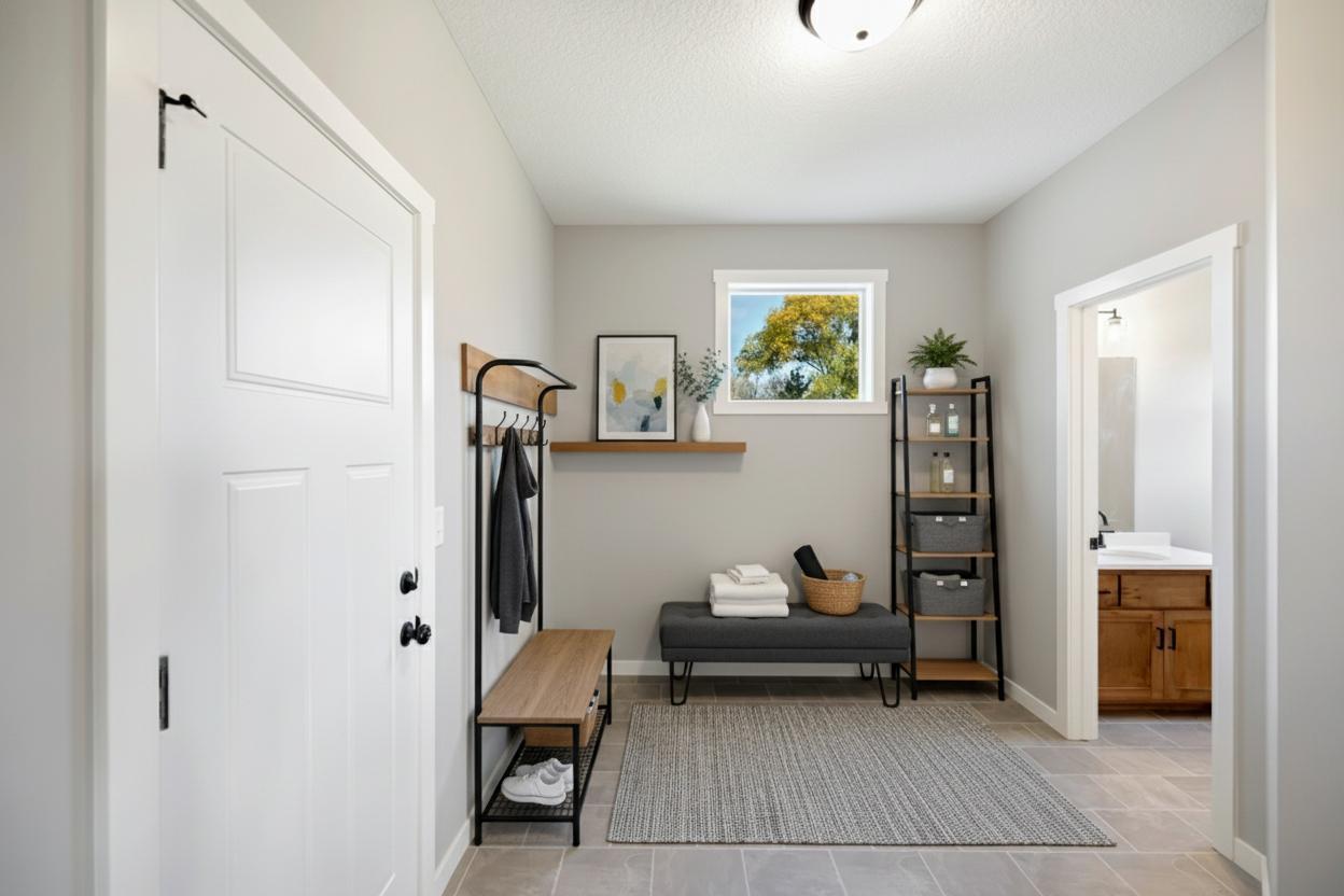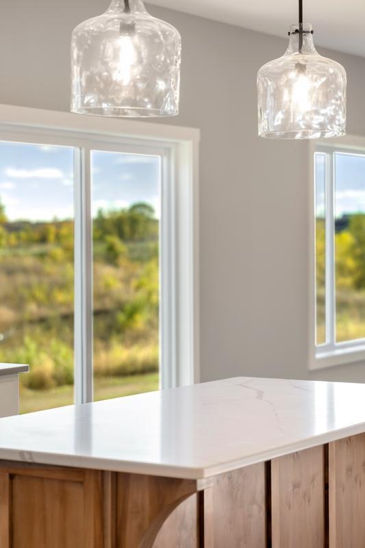 The open-concept main level features upgraded laminate flooring, custom cabinetry, quartz countertops, and stainless-steel appliances. The kitchen includes a center island, soft-close drawers, and a walk-in pantry. Adjacent dining area overlooks the acreage and connects to future deck or patio space. A main-level half bath and direct access to the insulated 4-stall garage (40×23) with asphalt driveway complete the main floor.
