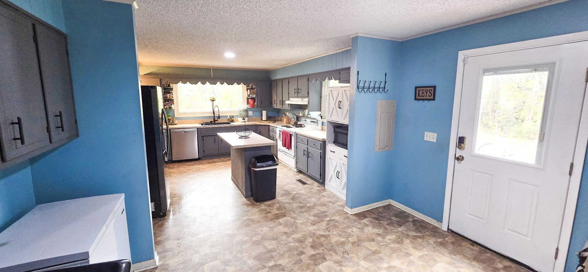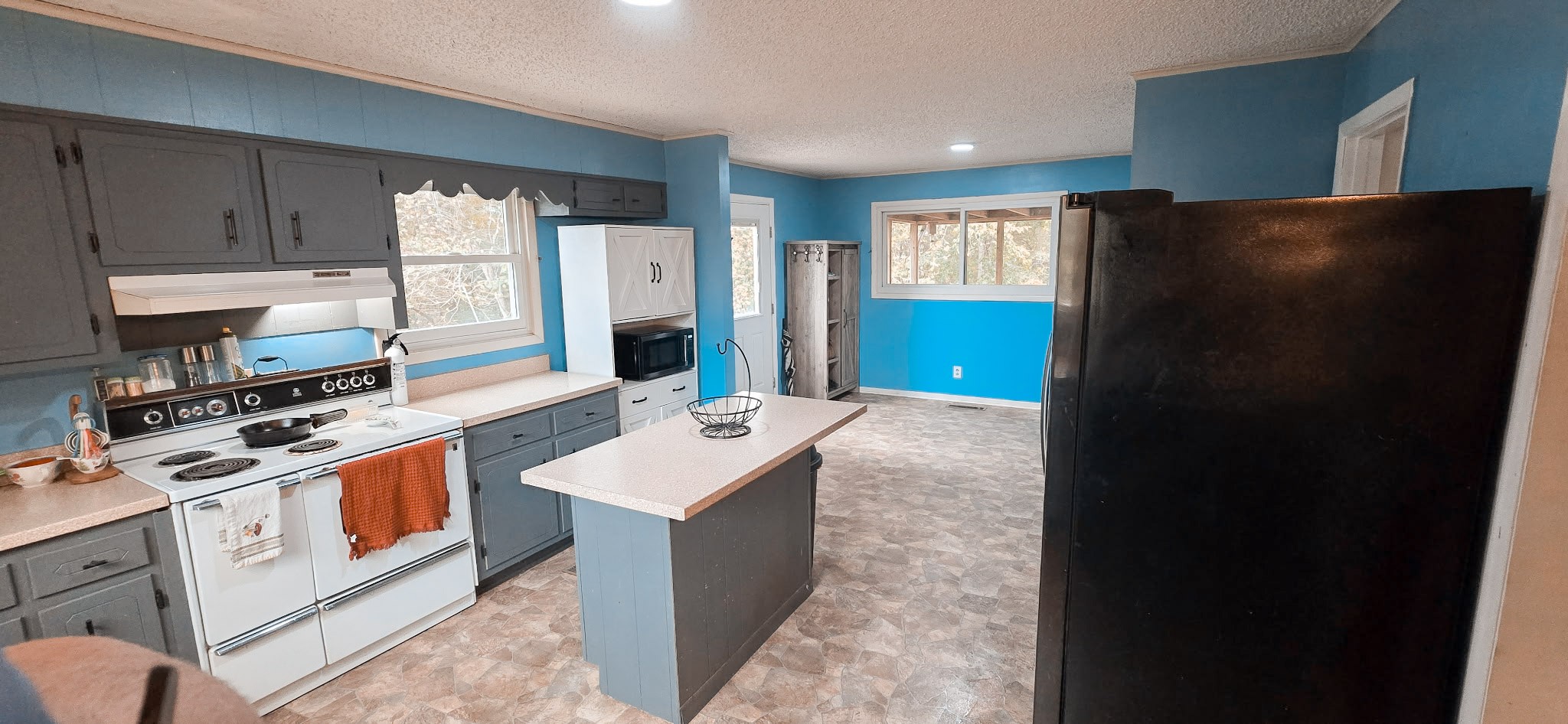 Inside, you’ll find a bright living room that flows right into a cozy dining room with a brick wood-burning fireplace (perfect for s’mores or story-telling). The kitchen’s got plenty of cabinets, an island for added space, and even a pass-thru window so you can chat while cooking.
