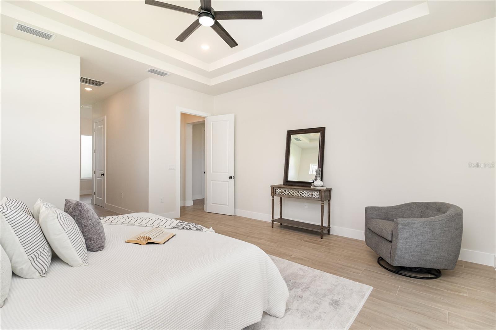 The luxurious primary suite features a spa-inspired bathroom with a walk-in shower, garden tub, and dual sinks, while the split floor plan offers comfort and privacy for family or guests.