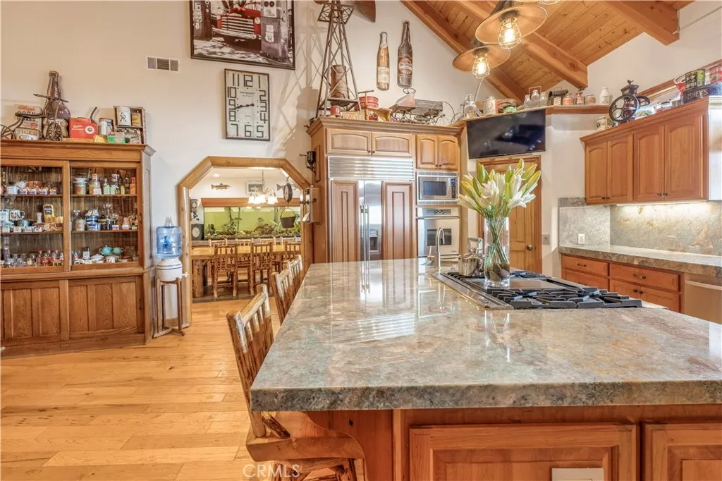 At the end of a private drive where the air turns crisp & the forest seems to stand still, Knoll View Ranch stretches across approximately 7 secluded acres of pristine alpine landscape. This rare legacy estate is a masterwork of natural materials & timeless design, offering a lifestyle defined by beauty, peace, & permanence. Wrapped in hand-laid slate stone with a Presidential roof & copper detailing, the homes architecture is as enduring as the land it rests upon. Over 3,000 sq ft of Trex decking seamlessly connects the indoors to the outdoors, framing panoramic ridgeline views that transform with each season mornings filled with soft birdsong, evenings drenched in golden light drifting through the pines. Inside, craftsmanship is evident in every detail. Rich hardwood floors maple, hickory & white oak flow throughout. Solid cherry cabinetry, alder doors, tongue-and-groove ceilings, & hand-finished touches add warmth & timeless character. The chefs kitchen combines elegance with function, appointed with slab granite counters, Sub-Zero refrigeration, & custom cabinetry designed to last for generations. Just steps away, the great room showcases a dramatic floor-to-ceiling river rock fireplace, creating a space as inviting as it is impressive. A luminous bonus living room with walls of windows offers a sunlit retreat for reading, gathering, or simply soaking in the mountain views. The primary suite occupies its own private wing, complete with a secluded deck framing panoramic vistas for the perfect wellness escape. Beyond the primary, this home features an ensuite main level b