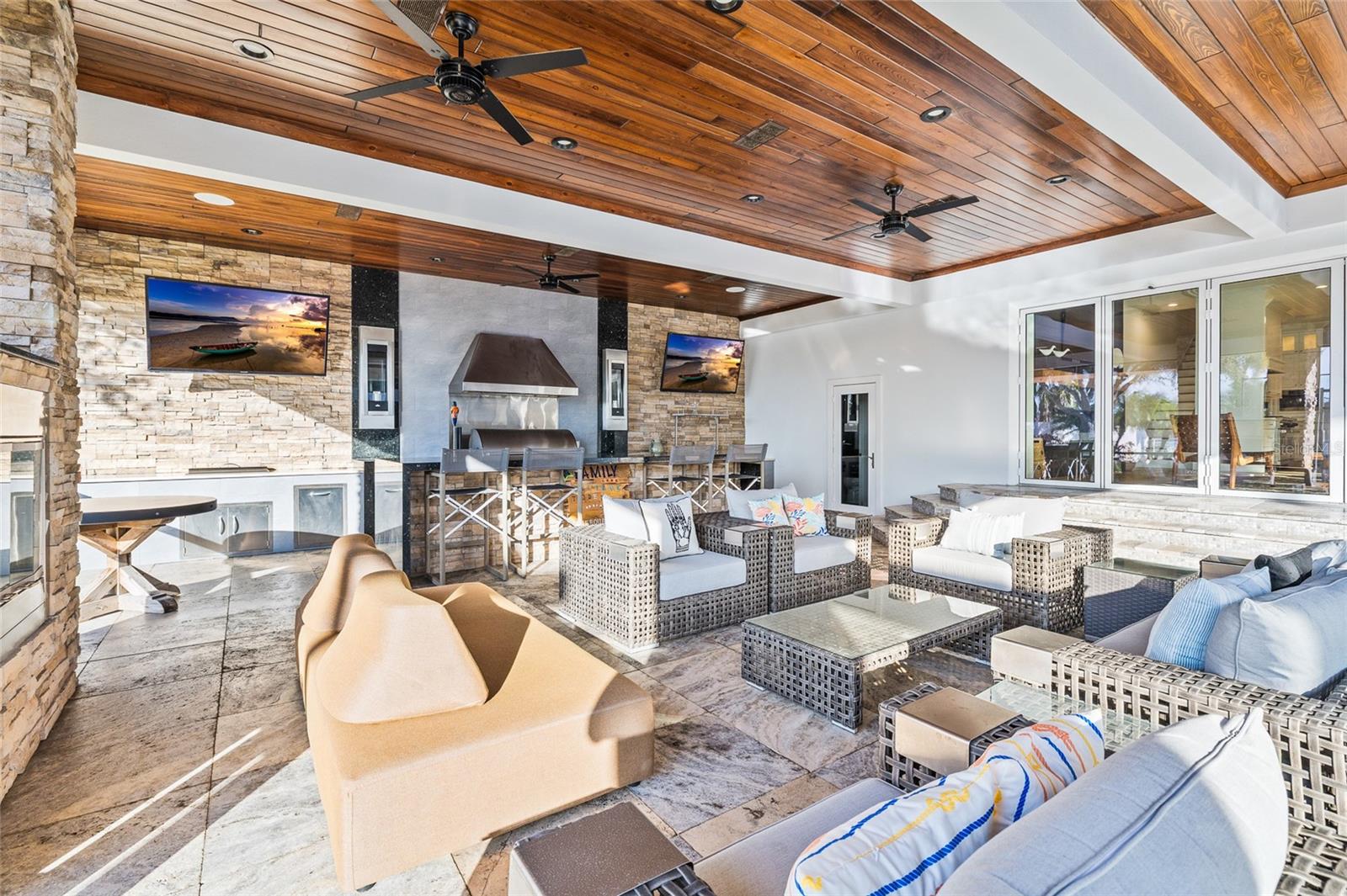 Interior features include high ceilings, an open floor plan, solid wood cabinetry, stone counters, and a private elevator servicing multiple levels. The primary suite is positioned to capture water views and offers a spacious layout with a well-appointed en suite bath. Additional highlights include a dedicated office, game room with bar, and multiple living and dining areas designed to maximize functionality and flow.