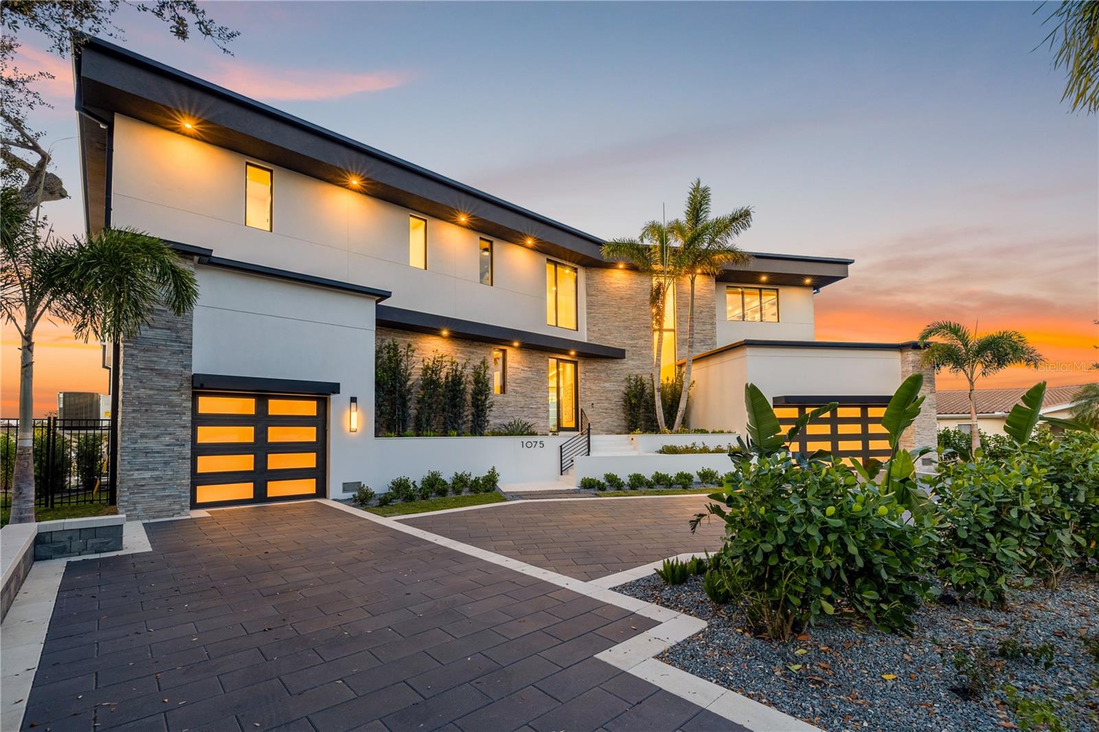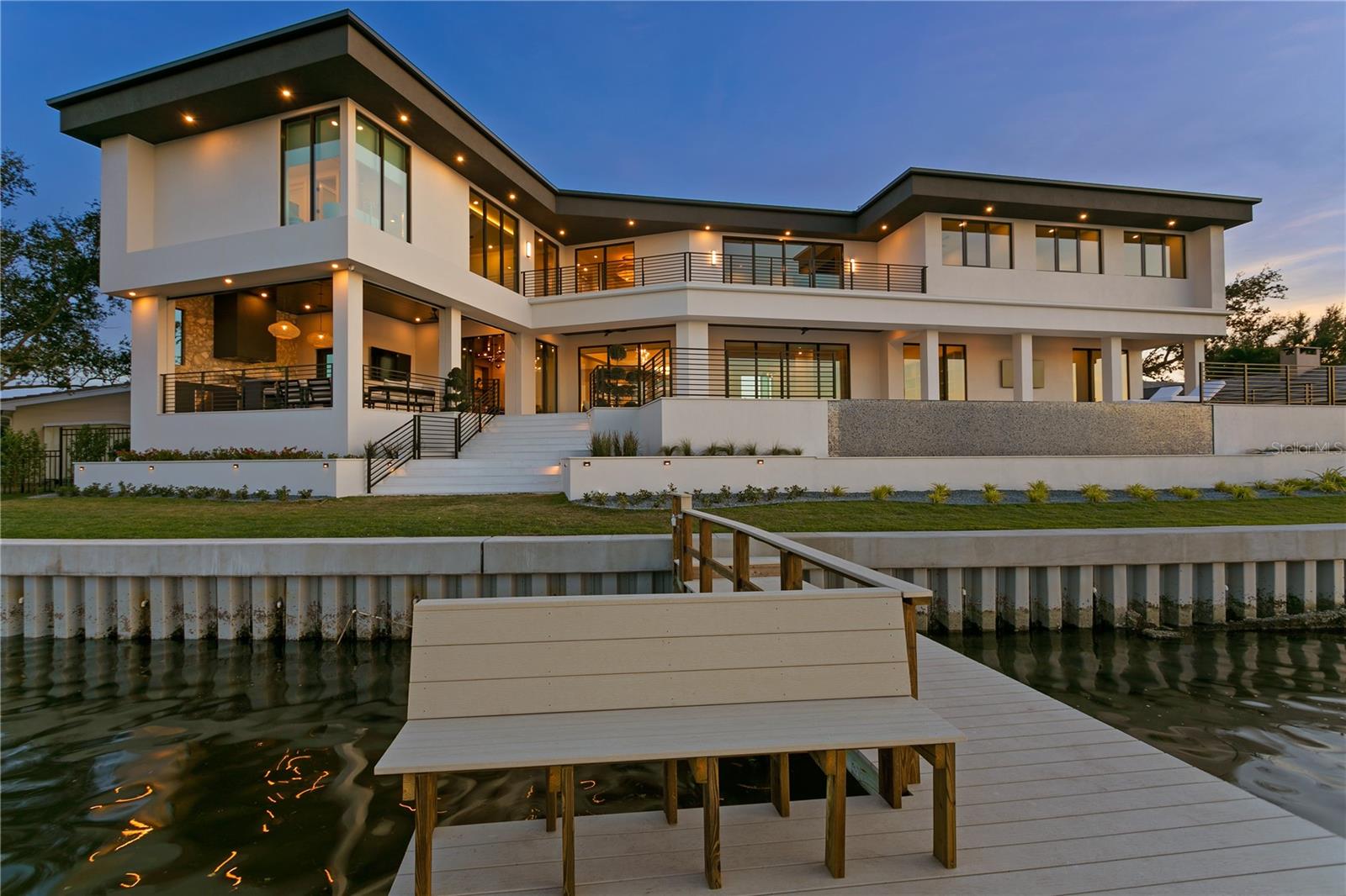 Outdoors, the property transforms into a private waterfront retreat, featuring a fully equipped outdoor kitchen wrapped in sunshades, lush landscaping irrigated by reclaimed water, and a dock setting for a 24,000-lb boat lift—ready for life on the bay.