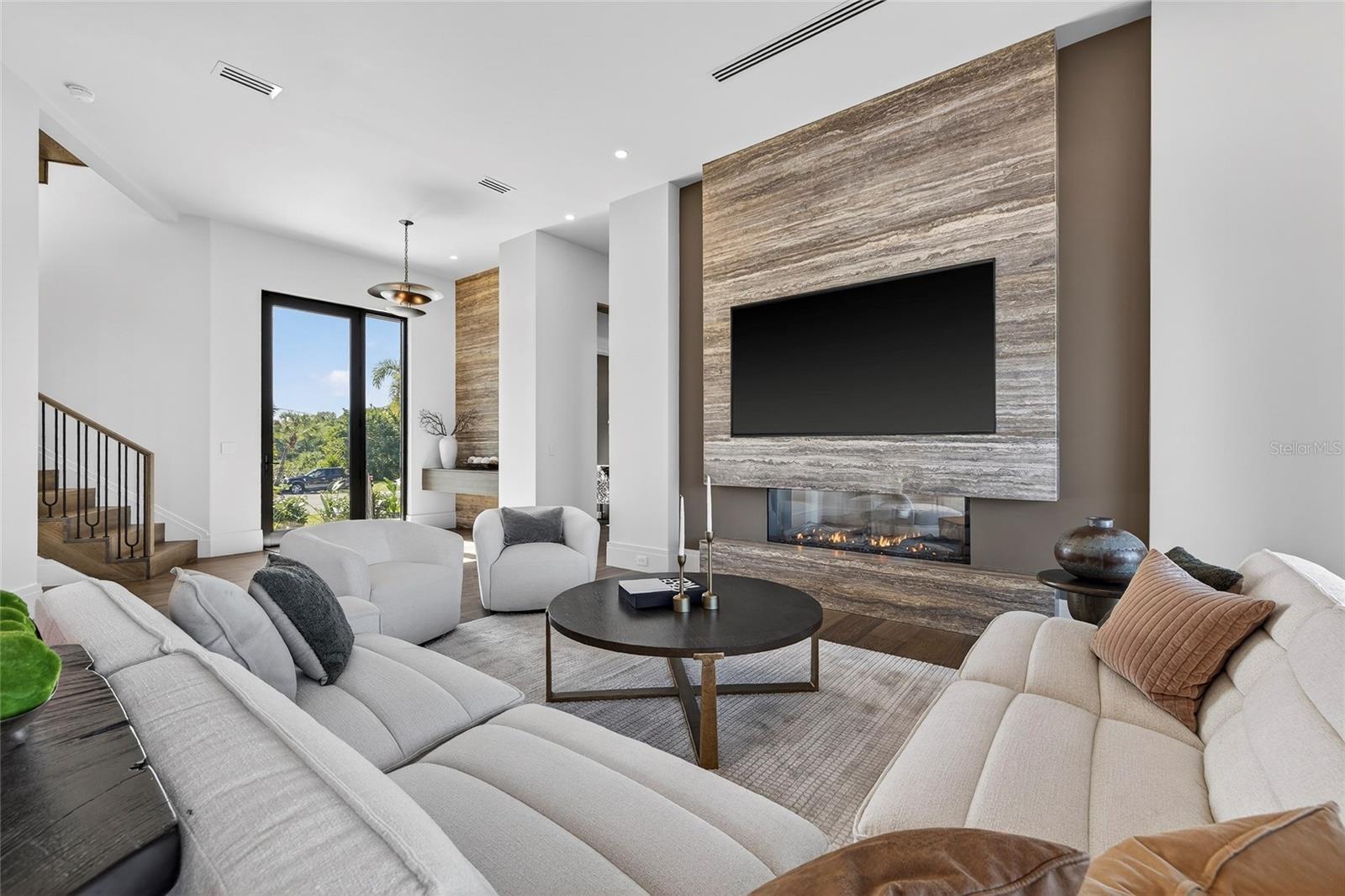 Inside, refined craftsmanship defines every space. European oak flooring, white oak staircases, custom all-wood cabinetry, and dramatic travertine and marble feature walls create a timeless yet modern aesthetic. The chef’s kitchen is a statement of both form and function, appointed with Wolf, Sub-Zero, and Cove appliances, quartz, quartzite, and travertine surfaces, a full bar with ice maker, and meticulously curated architectural detailing.