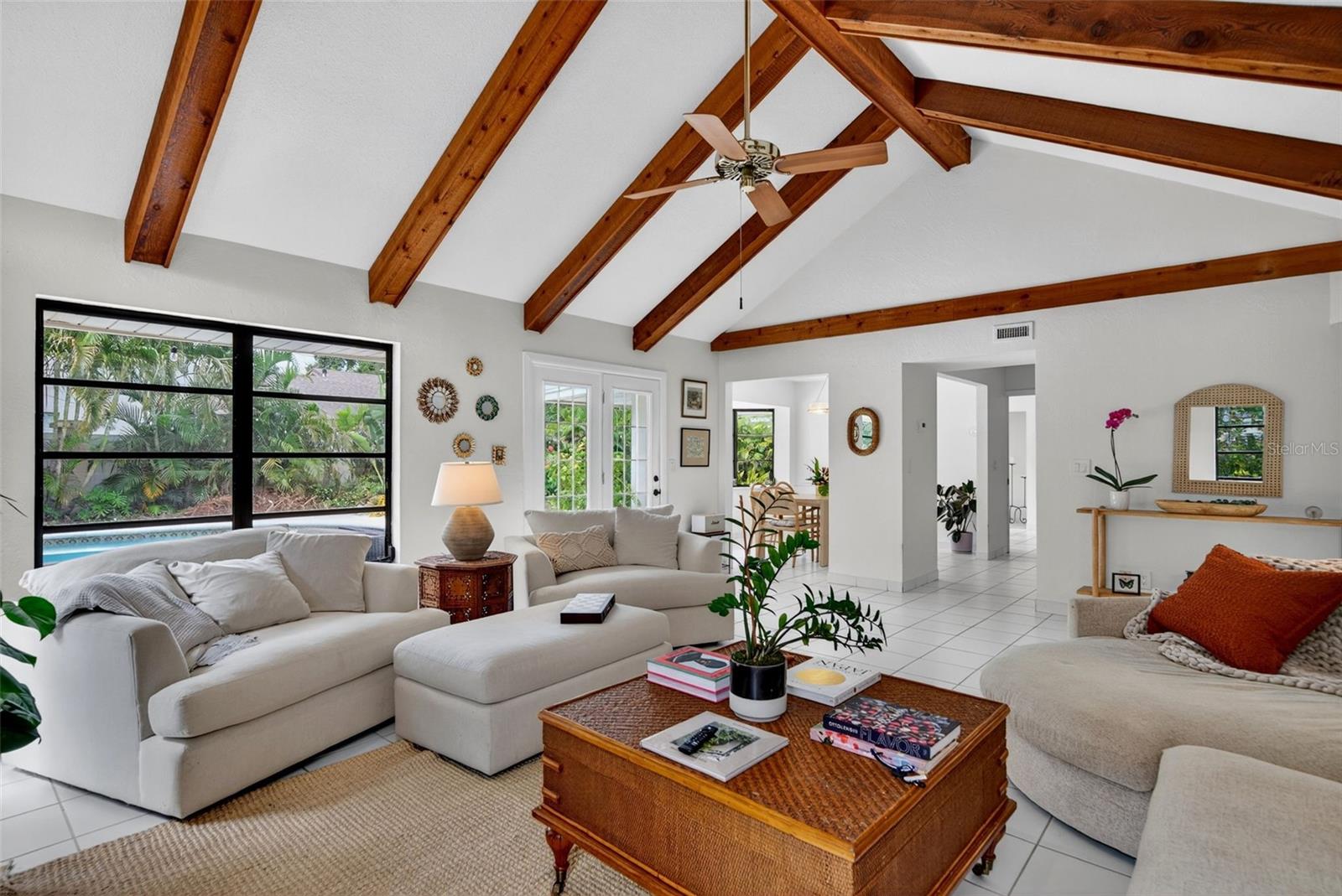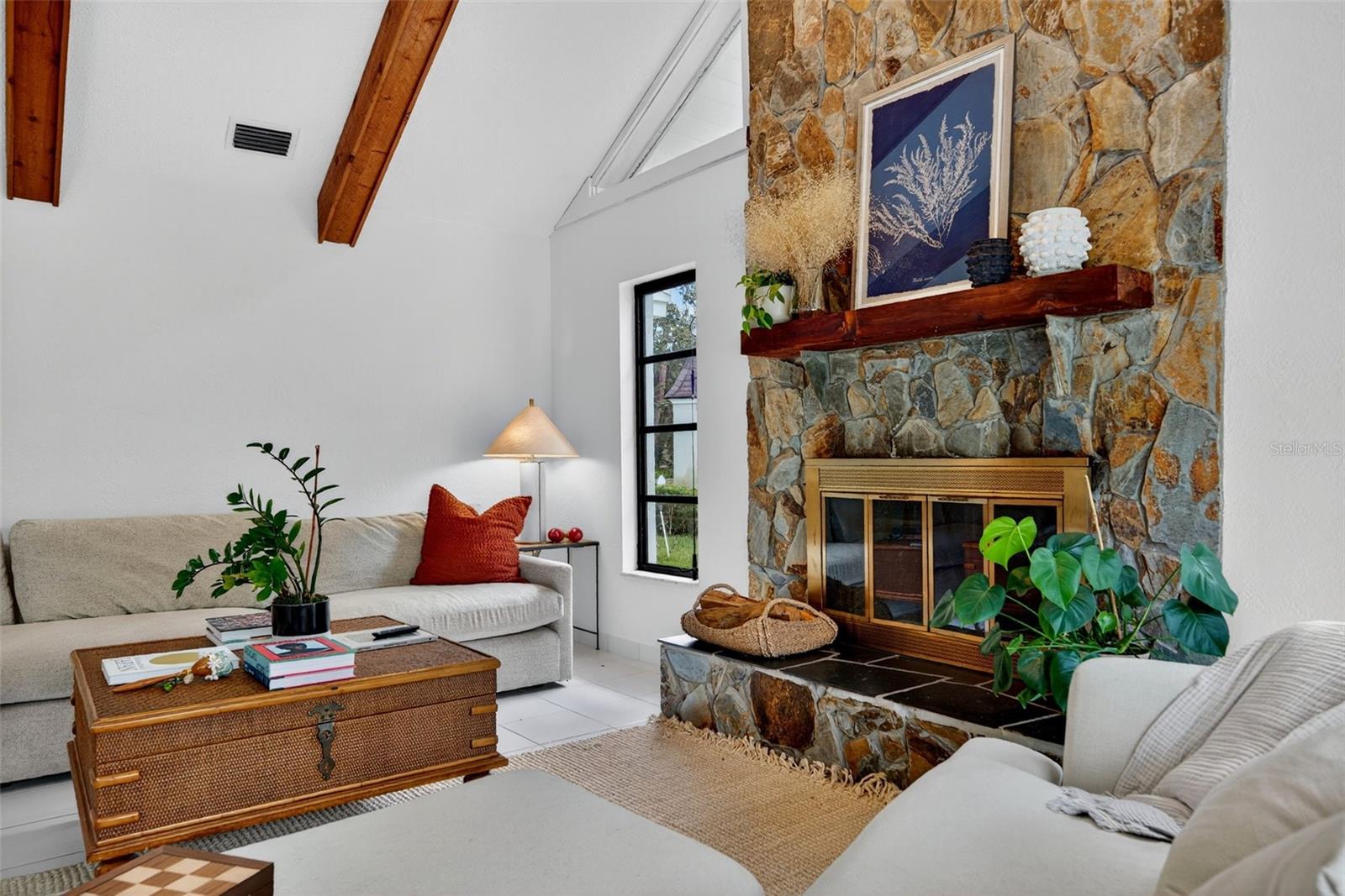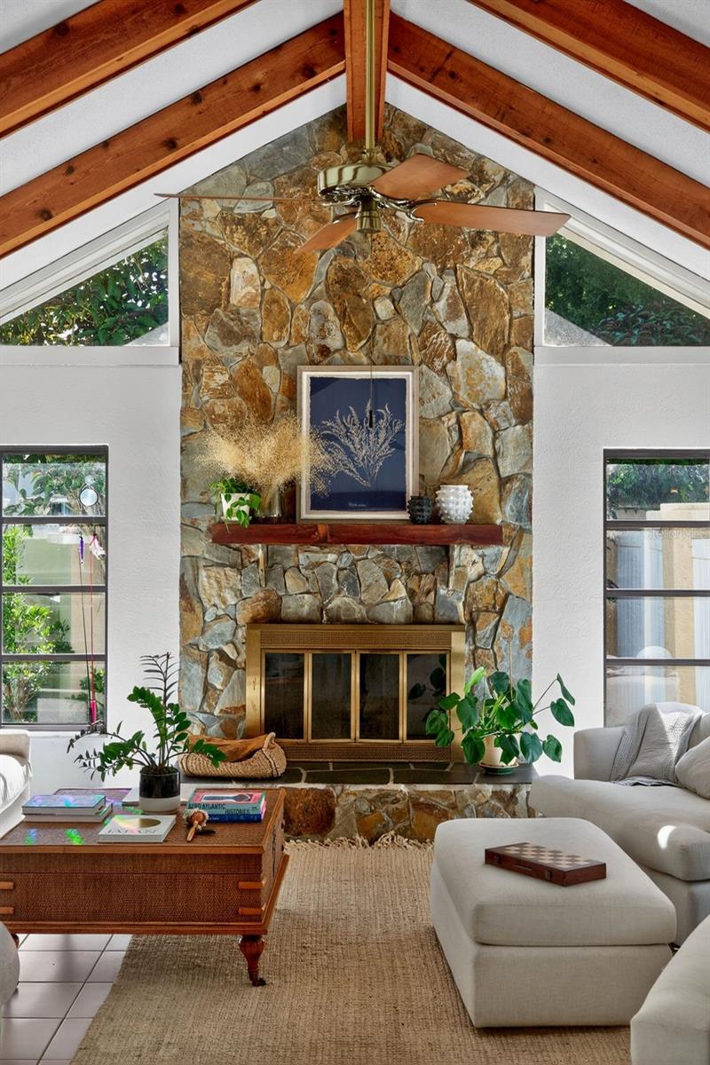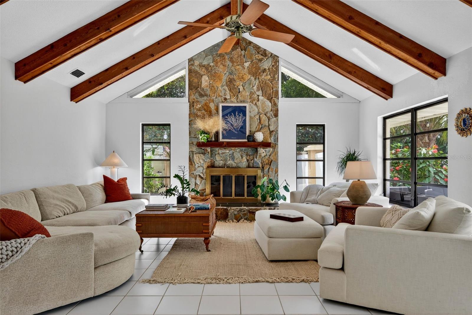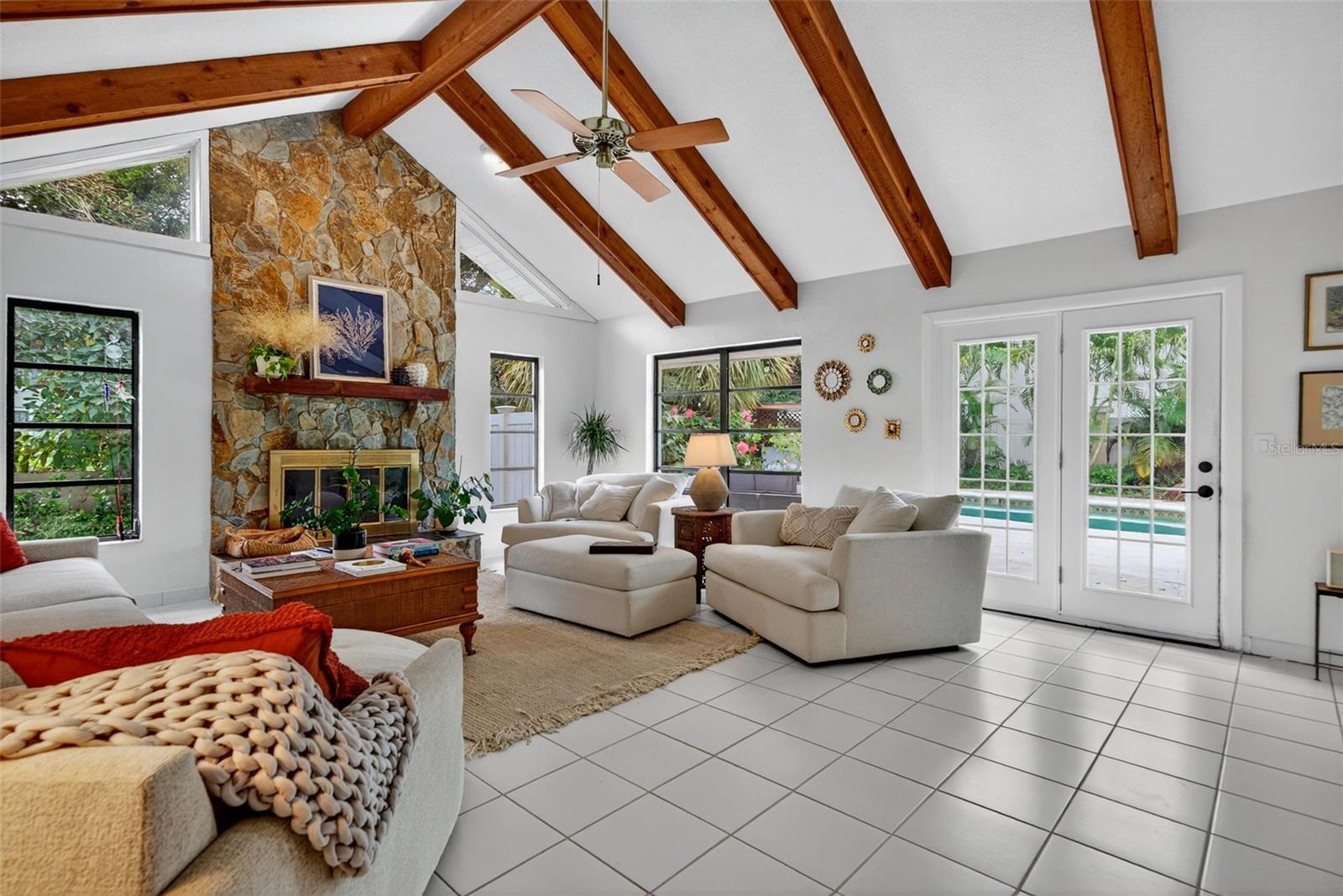 Inside, you feel one with nature with the exposed wood beams in the vaulted living room, perfectly framed around a fireplace where natural light pours in throughout the day. The thoughtful layout includes four bedrooms each with it's own walk-in closet, two and a half baths, a downstairs primary suite, and a two-car garage. Outdoors, travertine pavers add to the natural element around the salt-water pool, a tropical oasis, where flora and fauna thrive. The fenced yard offers space where native sunshine mimosa blooms with plenty of room for gardening and entertaining. You'll find plenty of Florida native landscaping for easy maintenance.