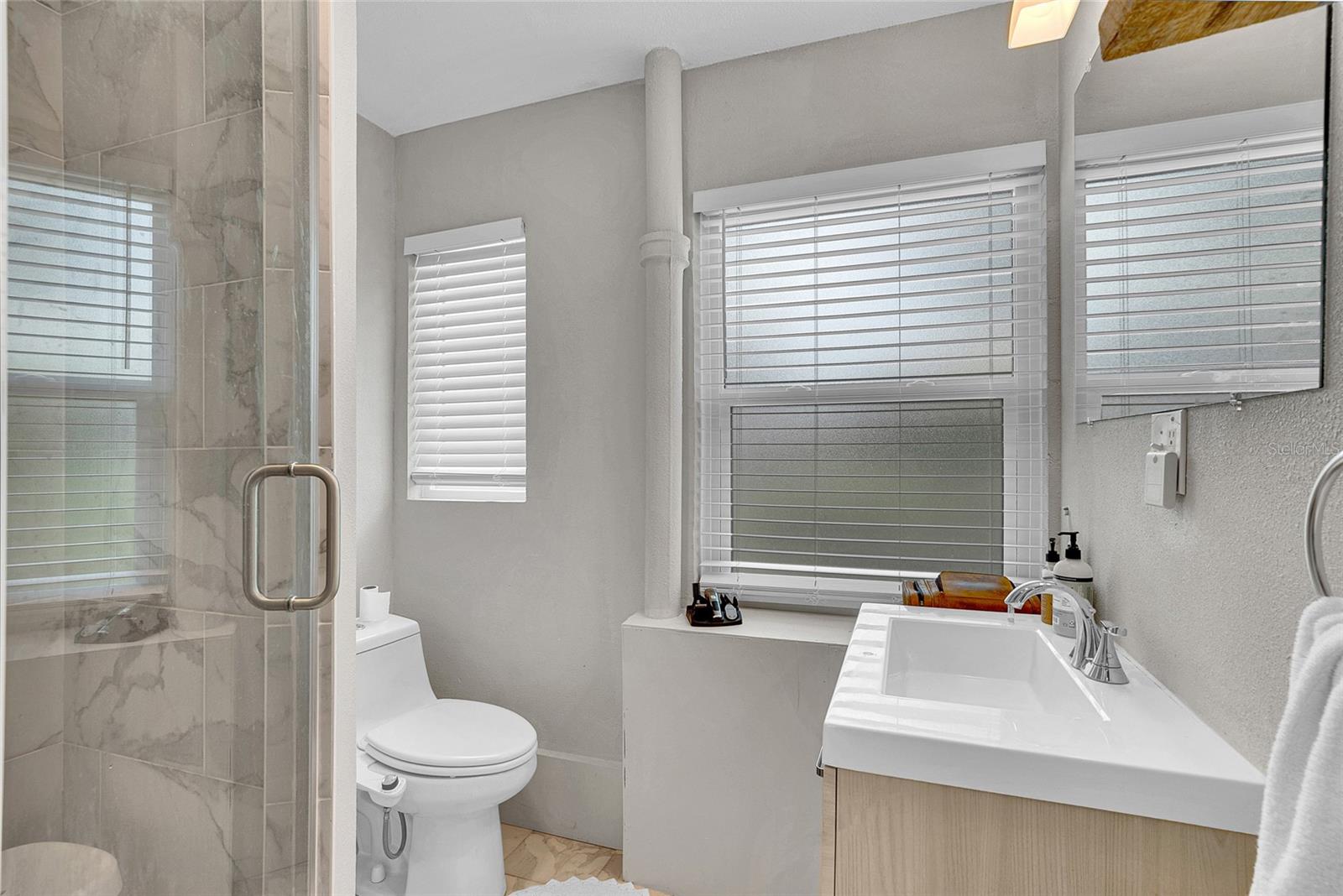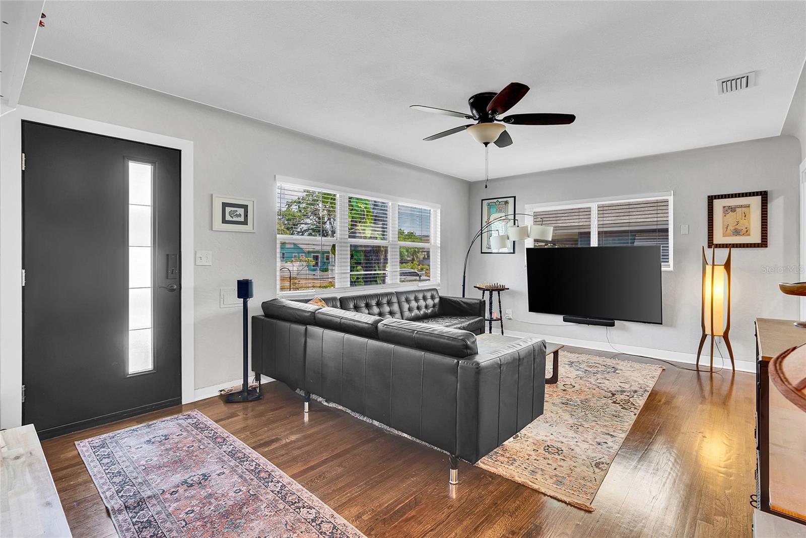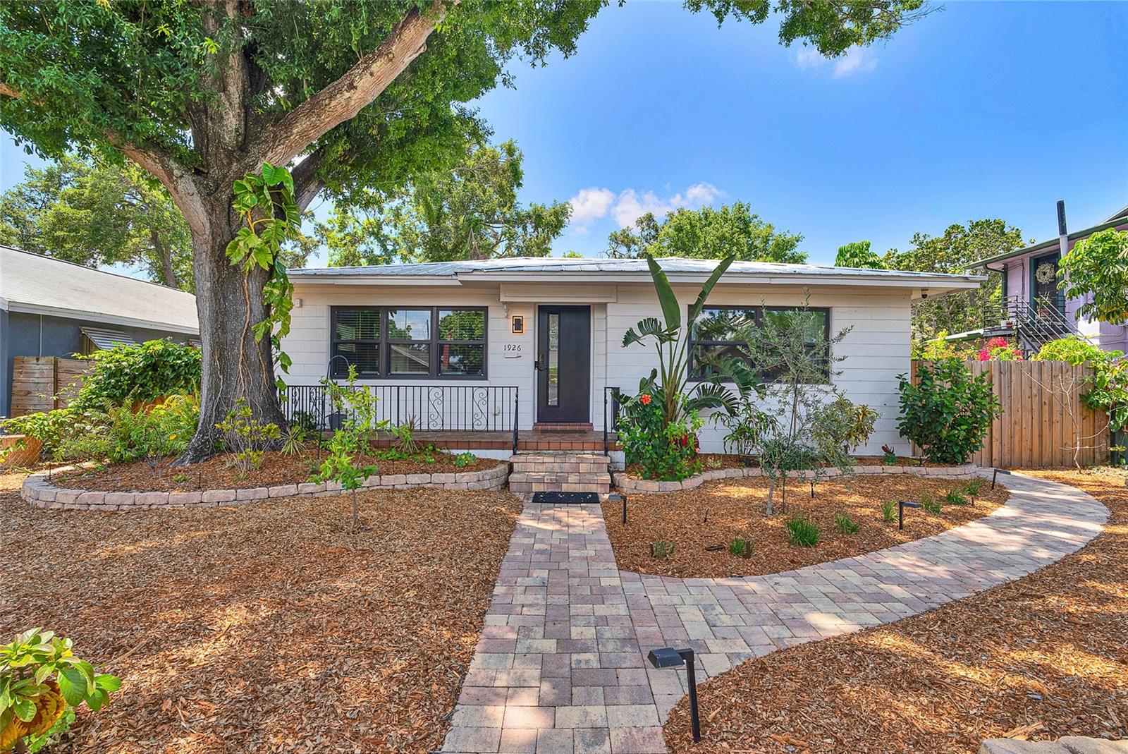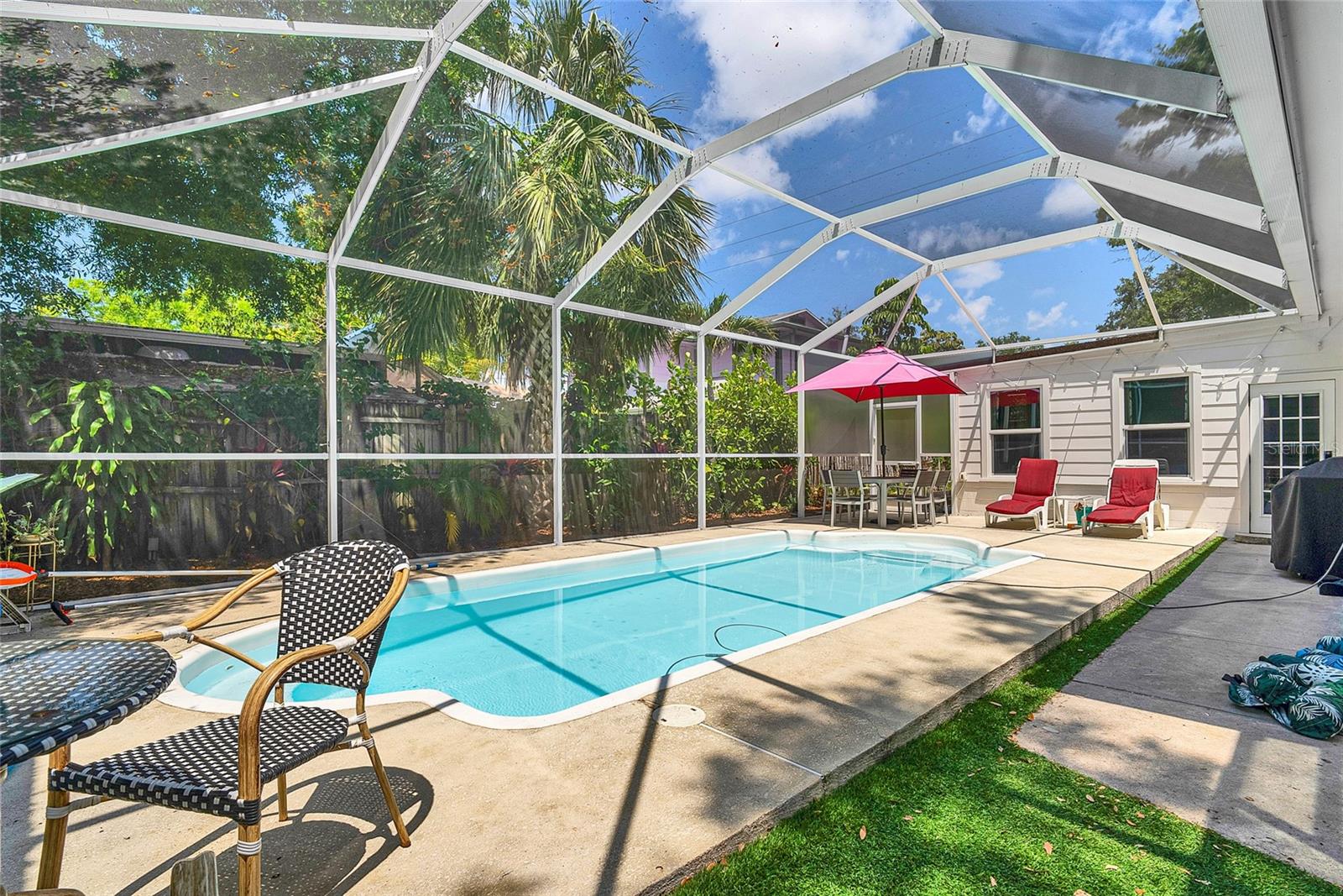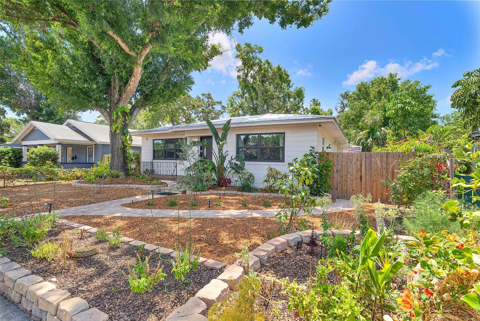 Nestled on a brick street in the Historic Kenwood neighborhood, this beautifully maintained pool home offers the balance of city living with peaceful comfort. Ideally positioned between the vibrant EDGE and Grand Central Districts, you'll enjoy easy access to an eclectic mix of galleries, beloved local businesses, restaurants and bars. This prime location also offers exceptional connectivity to I-275, making travel throughout the city convenient. The Trails Crossing project is a visionary public-private partnership transforming four blocks beneath the I-275 into a dynamic park featuring biking paths, illuminated murals, playground, container-style retail, dog park, sculptures, and a green amphitheater—creating a vibrant new hub for recreation and community just steps from your door. The home itself boasts concrete block construction (a rarity in the neighborhood) in a High-and-Dry flood zone elevation, providing peace of mind and long-term savings. Upgrades that improve storm protection and energy efficiency include: 2020 metal roof w/ hurricane clips and spray foam insulation, 2022 storm impact windows, and 2022 vaulted pool enclosure. In addition to significantly reduced insurance costs this home has earned Platinum certification from Pearl, a nationally recognized leader in home performance ratings, thanks to a new high efficiency heat pump and ducts, hospital-grade filtration with fresh air ventilation, renewable solar power w/ electric vehicle charging and smart tech monitoring for air quality and energy usage. These strategic home improvements keep electric costs to a minimum. Interior highlights include a peaceful atmosphere with abundant natural light; as you walk into the main living room you’ll notice original floors and graceful cove ceiling while appreciating the absence of city sounds, thanks to upgraded windows and insulation. The thoughtful split floor plan has two bedrooms with deep reach-in closets, a shared bathroom with tub and additional laundry hook-ups for an optional second laundry space. The beautiful eat-in kitchen features GE induction range and Cafe refrigerator. Large picture windows grace the kitchen and formal dining room, where you’re greeted by built-in service bar with matching granite countertop. The home features over 300 additional heated square feet of multipurpose office space. The private owner’s retreat sits on the North side of the home with separate access to the enclosed patio. Outdoor living is equally impressive, with native landscaping and a heated saltwater pool, enclosed for added comfort and privacy. Behind the property there is alley access w/ parking pad and secure gate. The side yard has three rain barrel tanks and raised garden beds. A flourishing productive garden in the front provides attractive low maintenance curb appeal while growing herbs, fruits and veggies. Weather sensing micro irrigation, landscaping mulch, and artificial turf ensure hassle-free enjoyment year round. Whether hosting around the tropical pool, tending the garden, or basking in the tranquility of a truly energy-efficient home, this property has it all. As part of the Historic Kenwood Artist's Enclave overlay, this home also offers exciting potential for home-based businesses. The Kenwood Enclave hosts events, further enriching this dynamic neighborhood. Don’t miss the opportunity to own a home that combines the charm of Historic Kenwood with the energy of St. Petersburg's most exciting new developments.