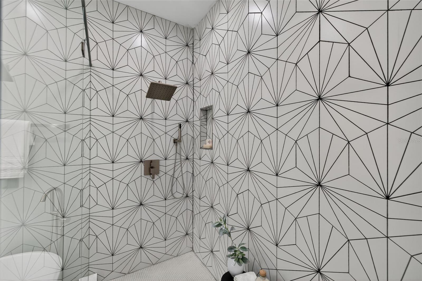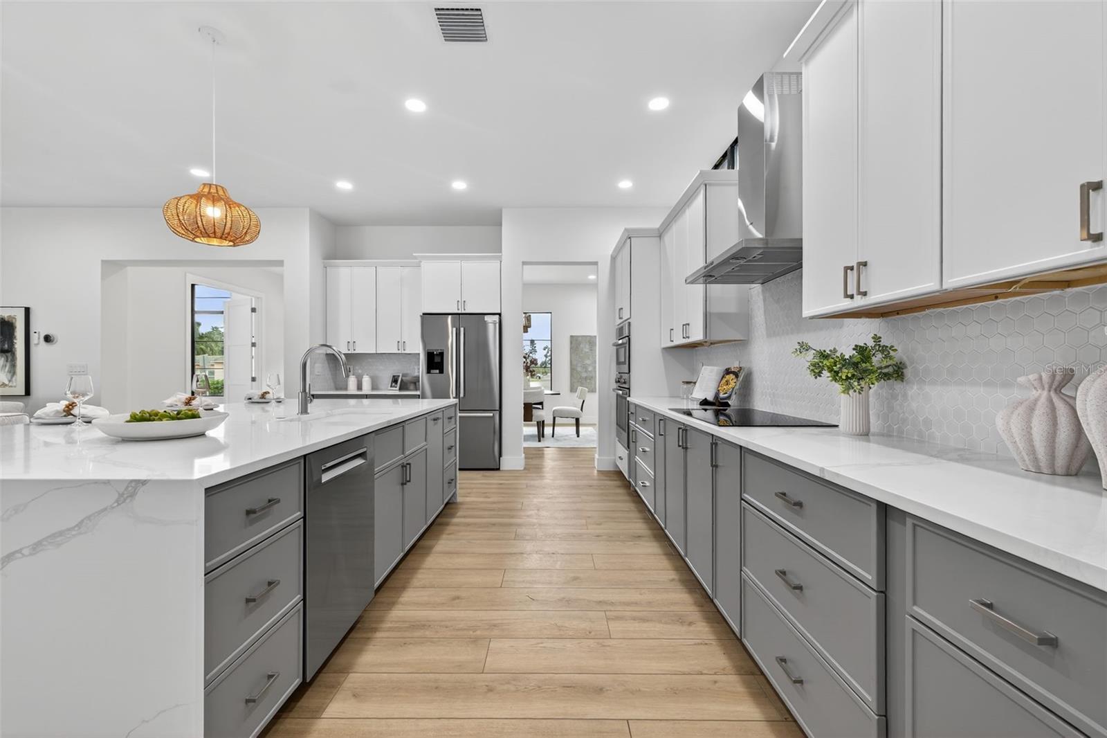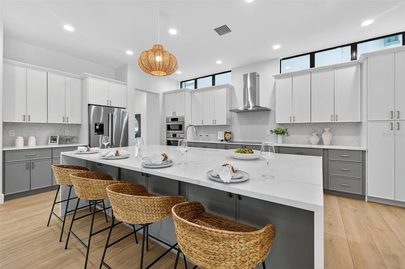 From the moment you step inside, the home’s refined design and natural light set the tone. A flexible front room serves perfectly as a bedroom, office, or media space and includes a built-in wet bar including a wine refrigerator that's ideal for remote work or welcoming guests. The formal dining room with room for 12 guests sits just off the chef’s kitchen, creating a seamless layout for entertaining. The kitchen is a true showpiece, showcasing a Bosch stainless steel refrigerator, cooktop, range hood, and built-in oven with a combination microwave/convection unit. Elegant quartz countertops, 42" cabinets with under-cabinet lighting, LED accents, a convenient Lazy Susan, and a stunning 10-foot waterfall-edge island—comfortably seating six—complete this exceptional culinary space. The open living area is anchored by an elegant feature wall and expansive 4-panel sliding glass wall that fully open to the outdoors.