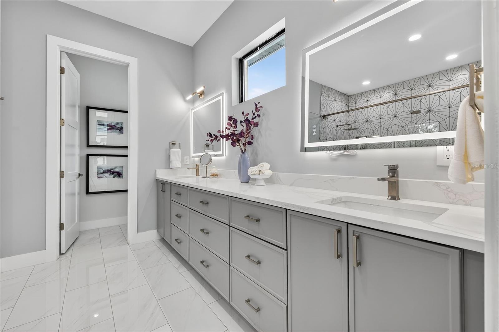 The expansive master suite is a true sanctuary, featuring an oversized walk-in closet and a spa-inspired bathroom with a double vanity, Roman soaking tub, glass-enclosed shower, and Kelner’s signature smart mirrors. Every finish reflects modern elegance paired with everyday functionality.