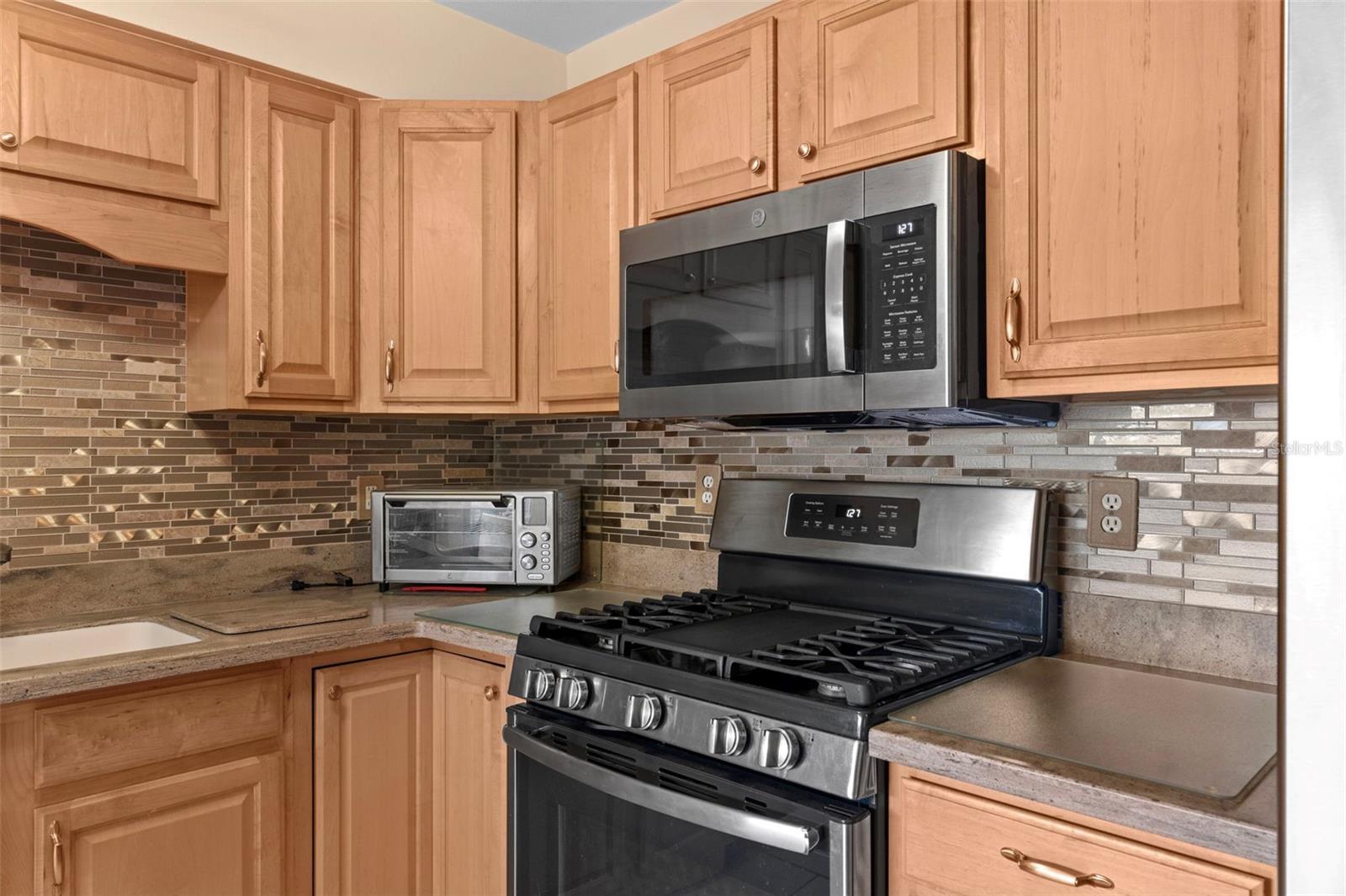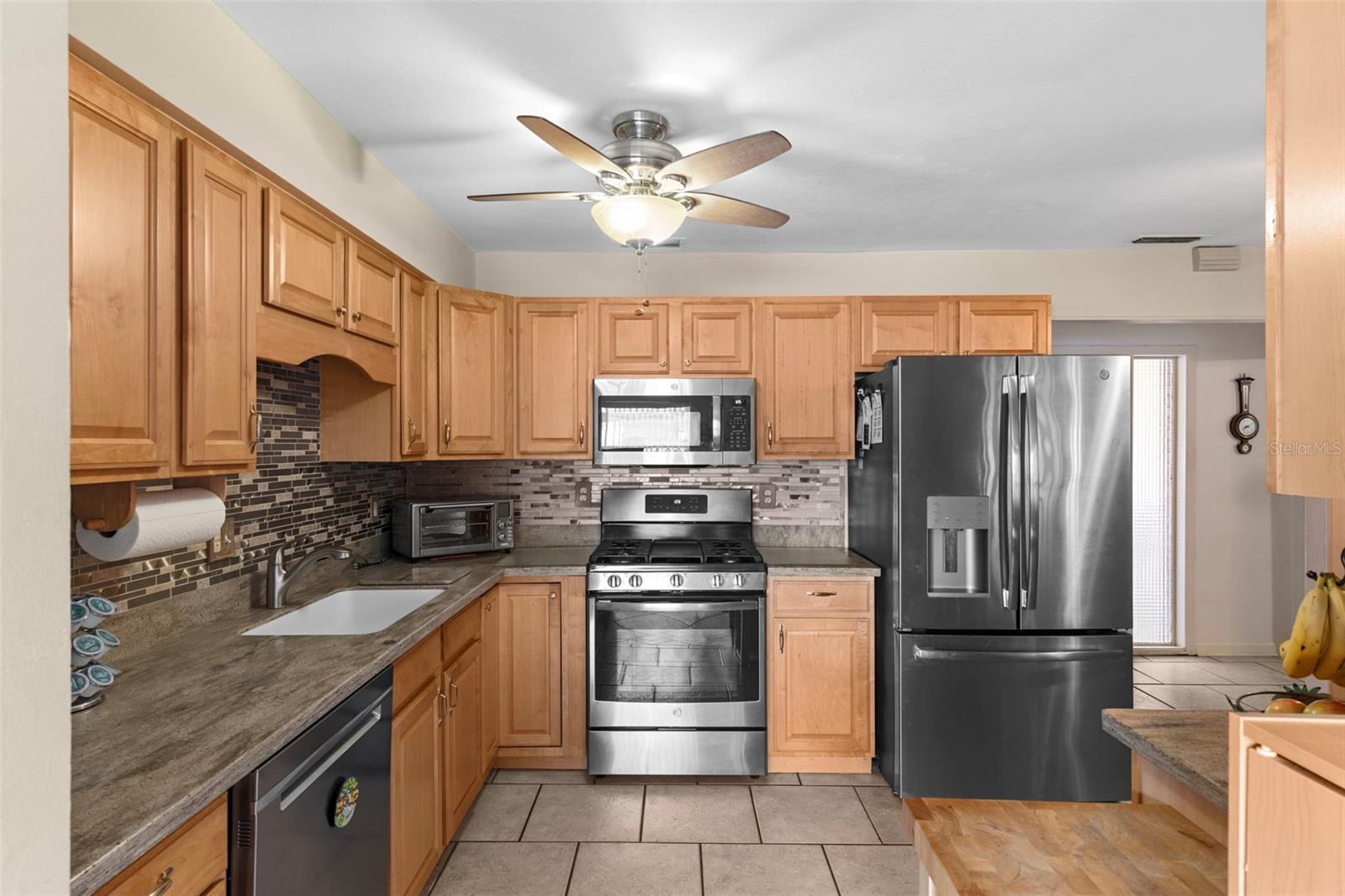 Inside, thoughtful updates create a bright, inviting environment suited to a variety of lifestyles. The three-bedroom, two-bath layout includes spacious living and dining areas designed for everyday comfort. The upgraded kitchen showcases granite countertops, solid wood cabinetry, a mosaic tile backsplash, and a complete suite of natural gas-powered appliances—including a gas range, gas dryer, and gas water heater—for efficient and reliable performance.