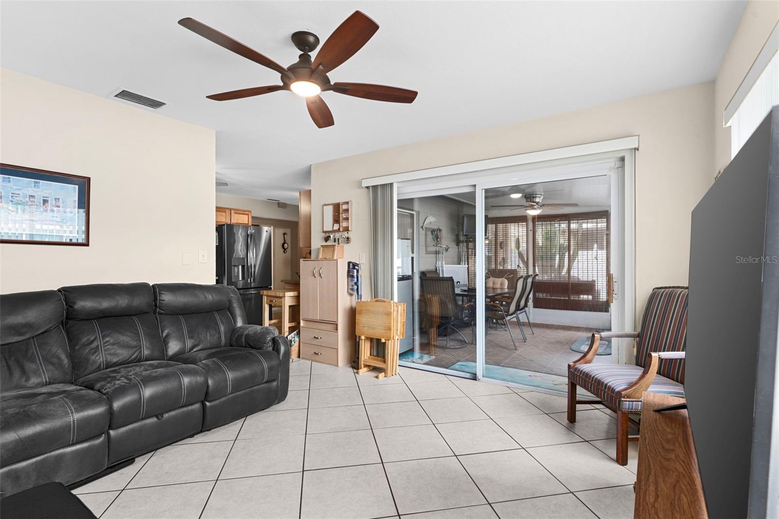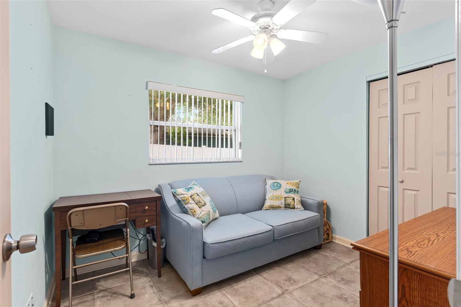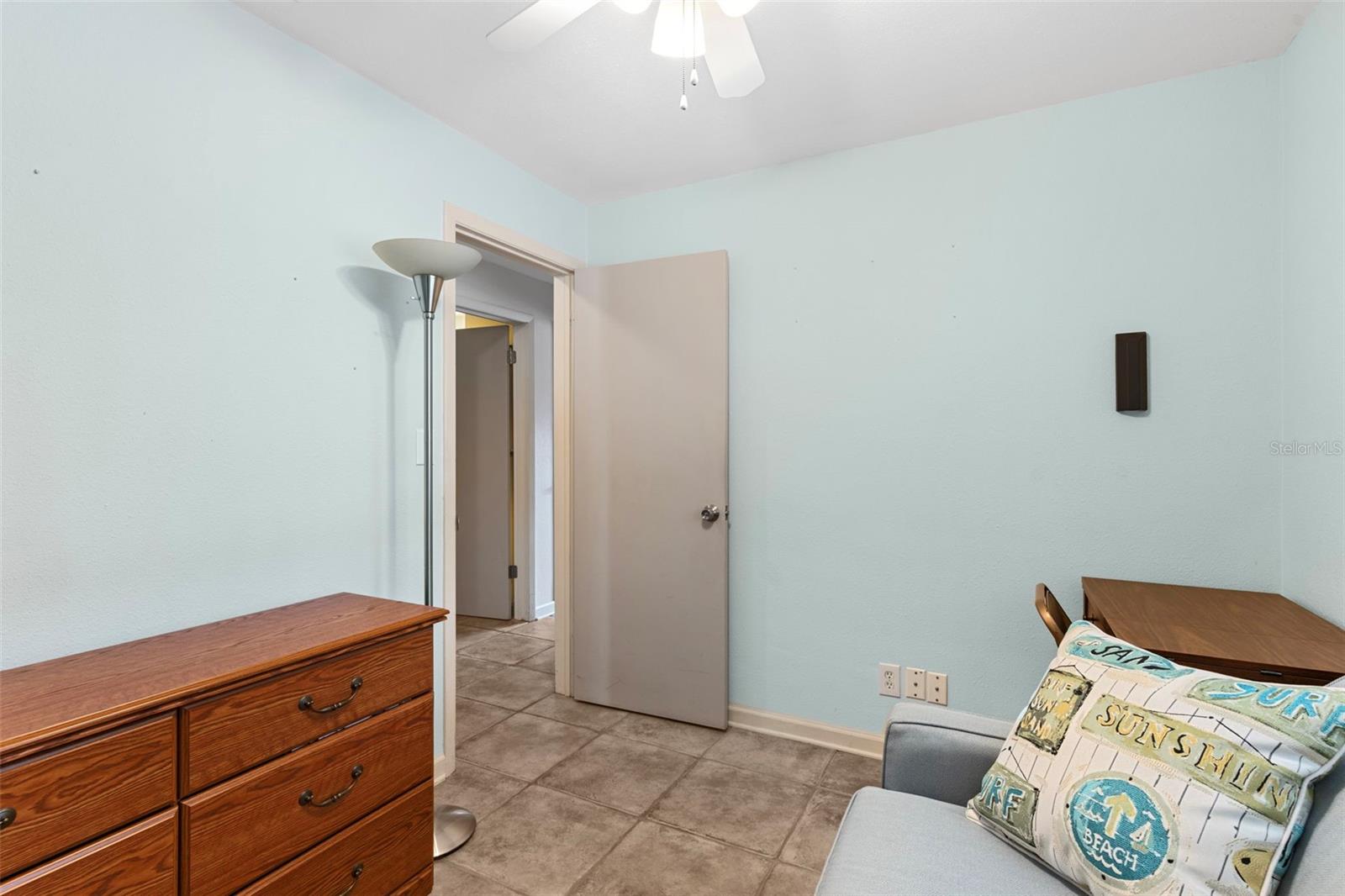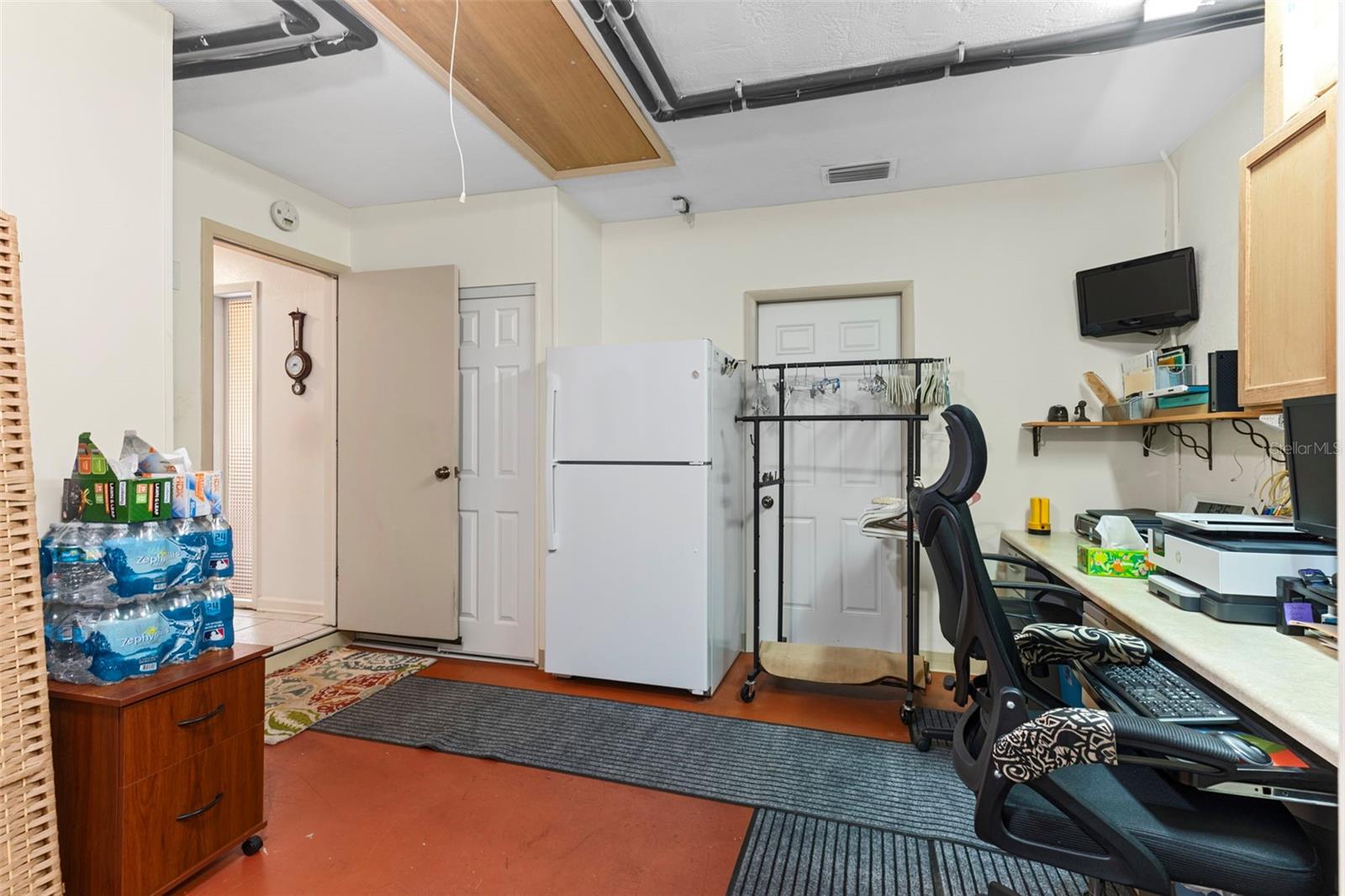 The fully enclosed, tiled porch adds an adaptable extension of living space—ideal for enjoying morning coffee, reading, or creative pursuits. The converted garage serves as a convenient laundry and workstation area for home projects or organization, and can easily be restored to a garage if desired.