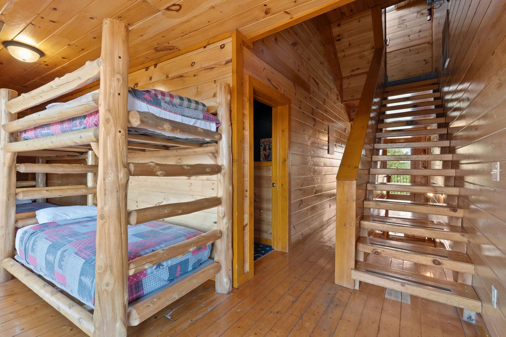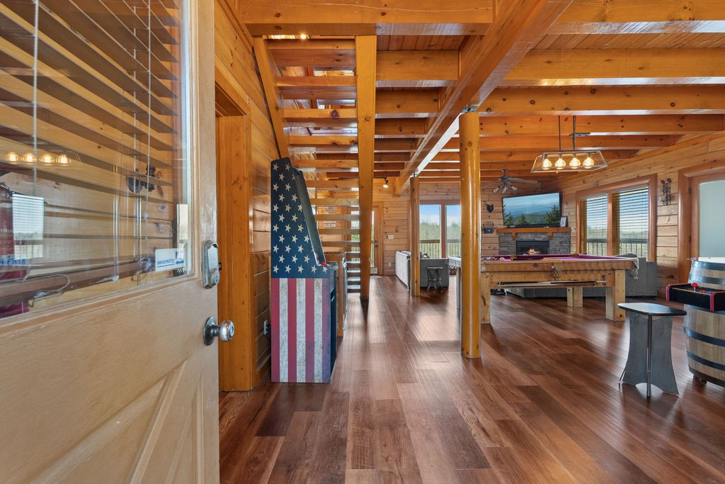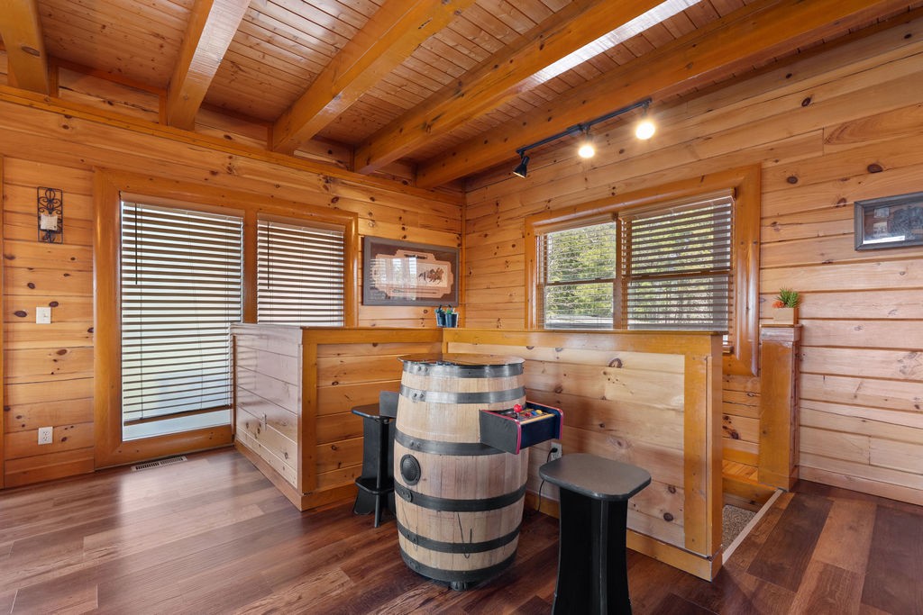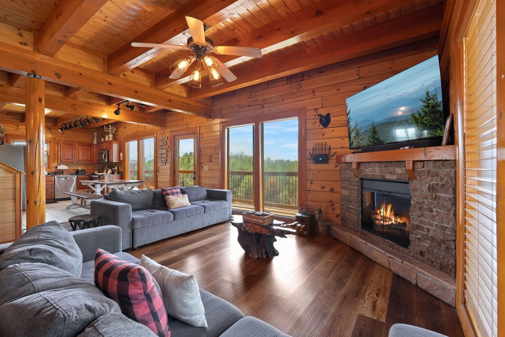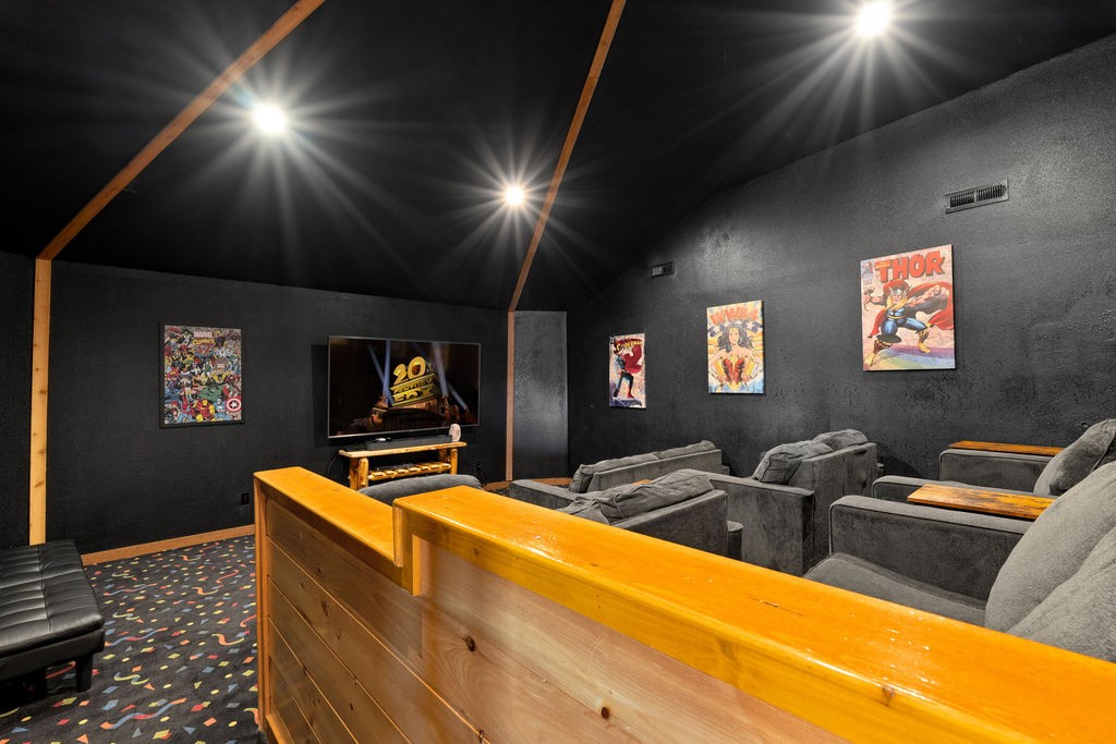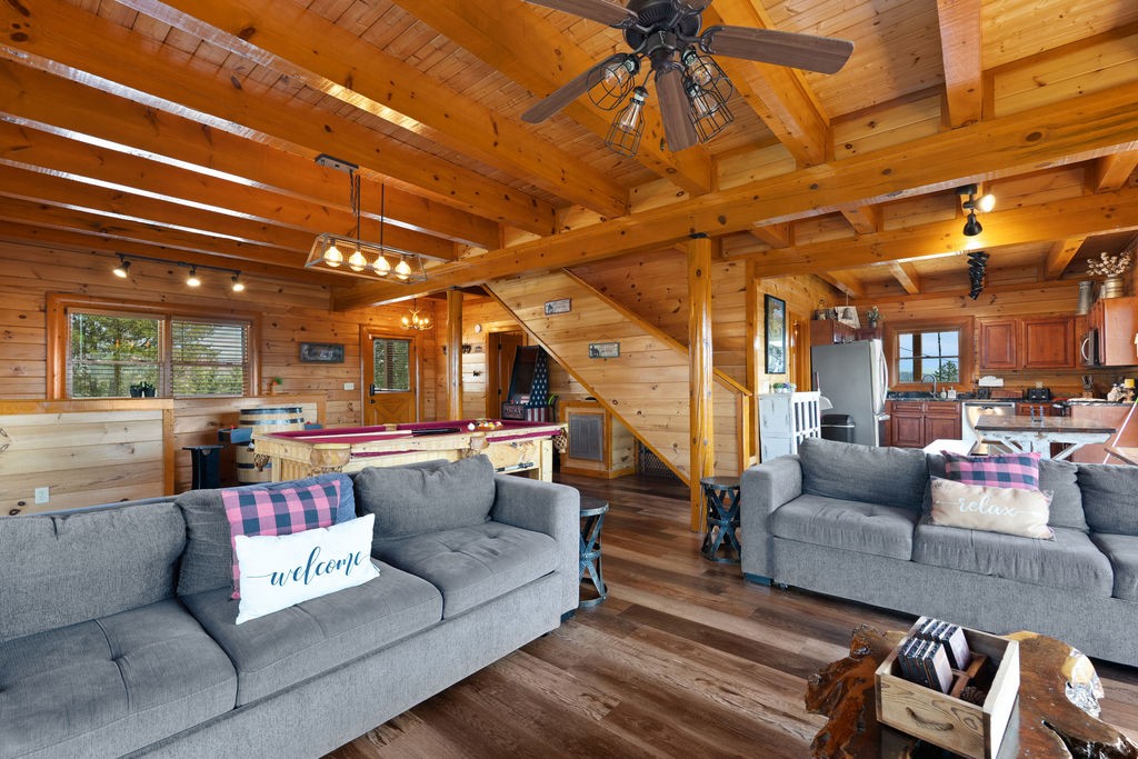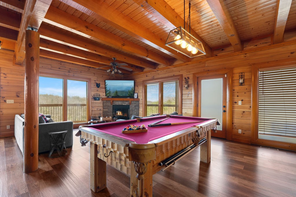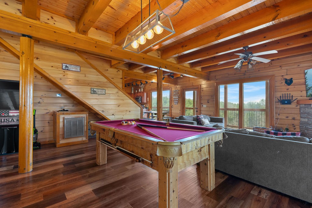 Inside, you’ll find an inviting layout spread across four levels, offering plenty of space for guests to gather or unwind. The home features a private indoor pool, game room, and theater room—ideal for entertaining groups year-round. A top-floor lookout room provides an elevated vantage point to take in the surrounding scenery. Multiple decks extend the living space outdoors, where you can enjoy peaceful wooded surroundings along with mountain and lake views—perfect for morning coffee or relaxed evening gatherings.