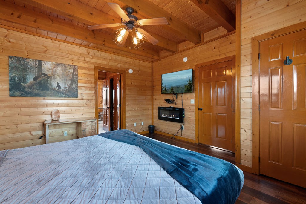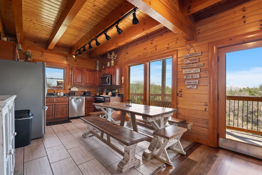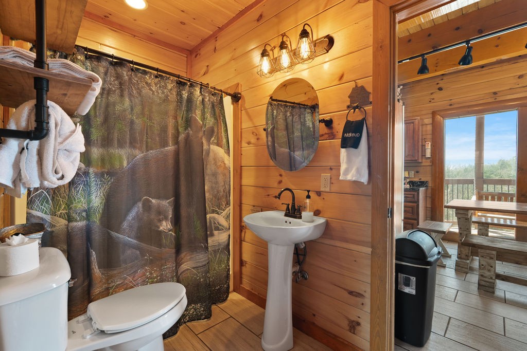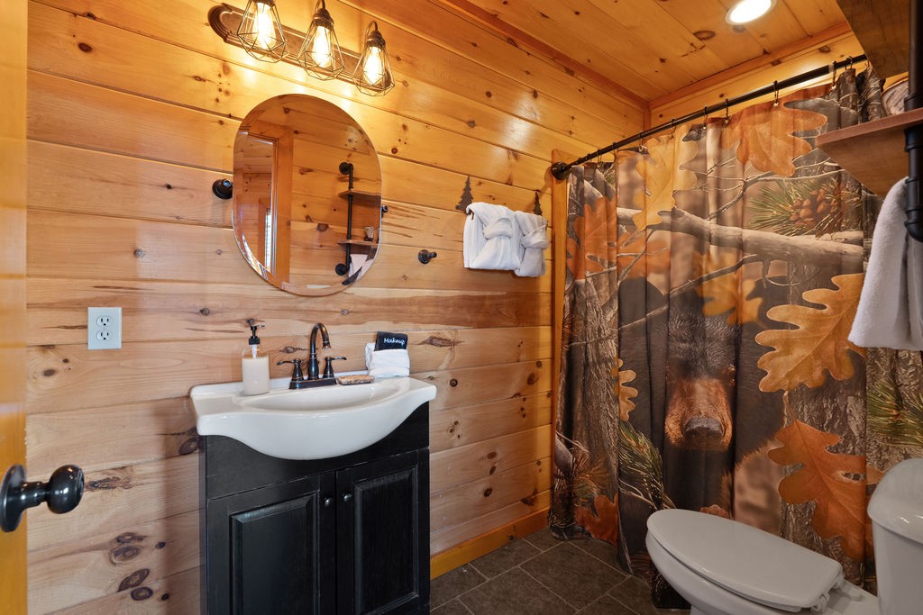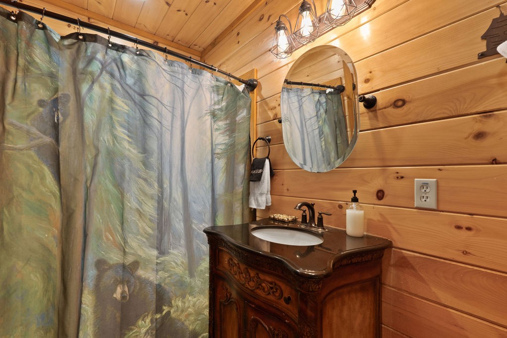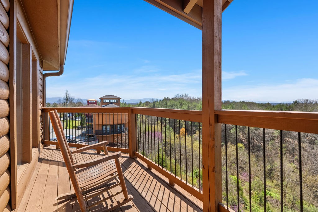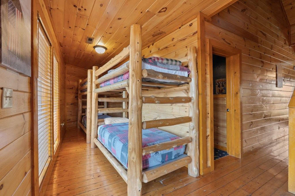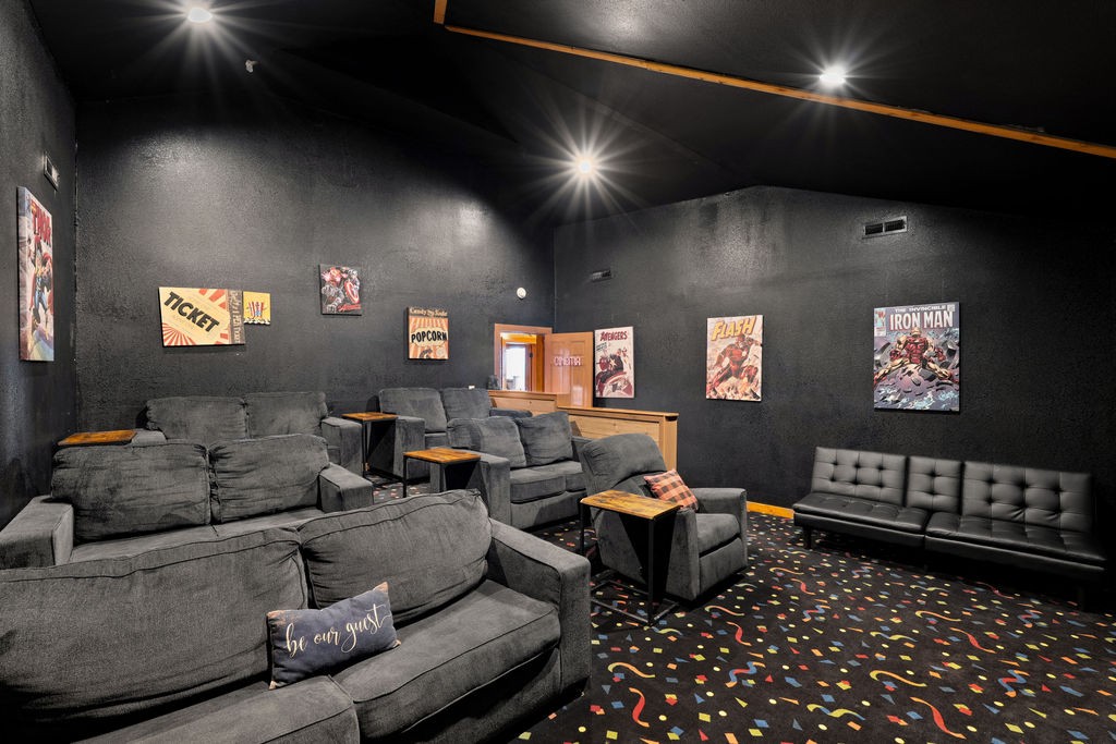 Inside, you’ll find an inviting layout spread across four levels, offering plenty of space for guests to gather or unwind. The home features a private indoor pool, game room, and theater room—ideal for entertaining groups year-round. A top-floor lookout room provides an elevated vantage point to take in the surrounding scenery. Multiple decks extend the living space outdoors, where you can enjoy peaceful wooded surroundings along with mountain and lake views—perfect for morning coffee or relaxed evening gatherings.