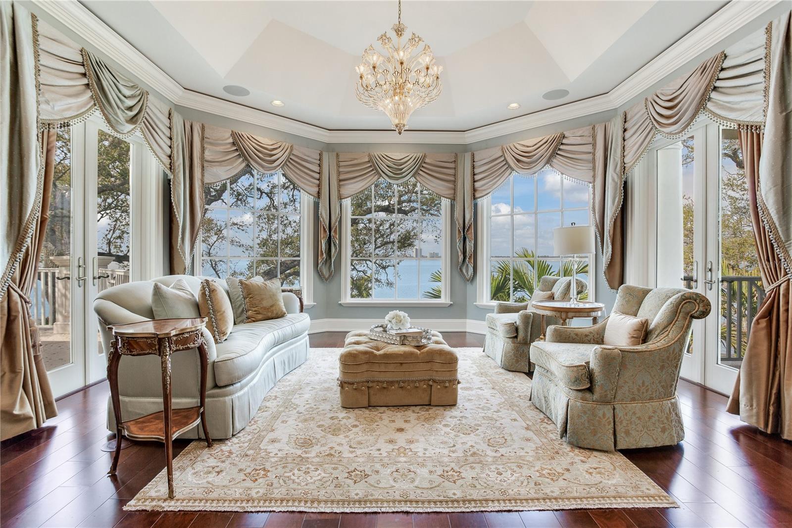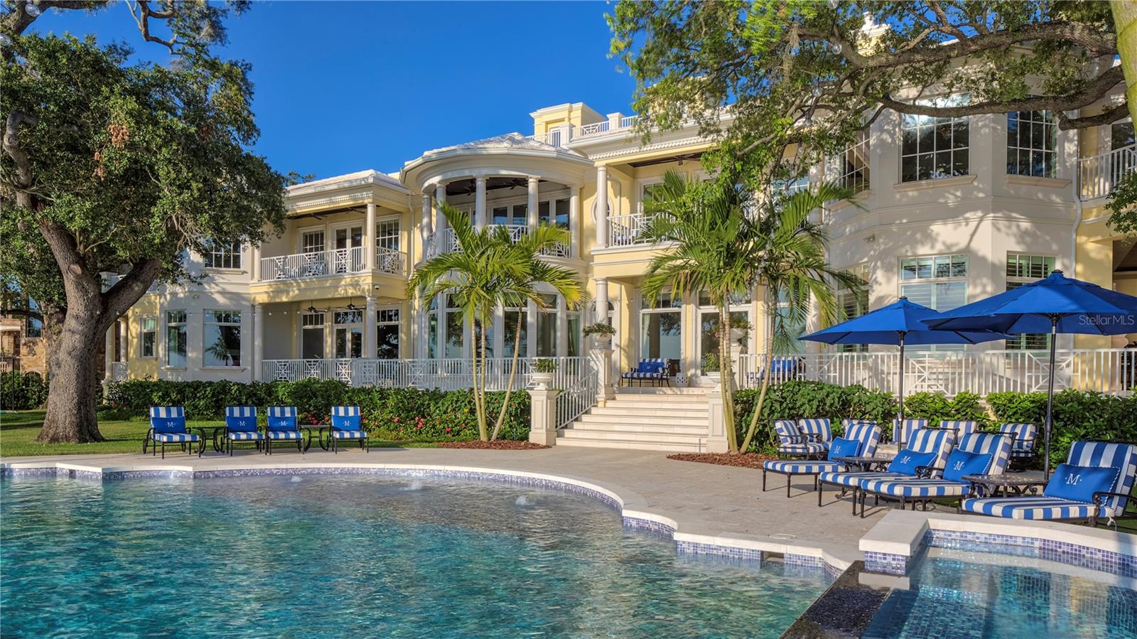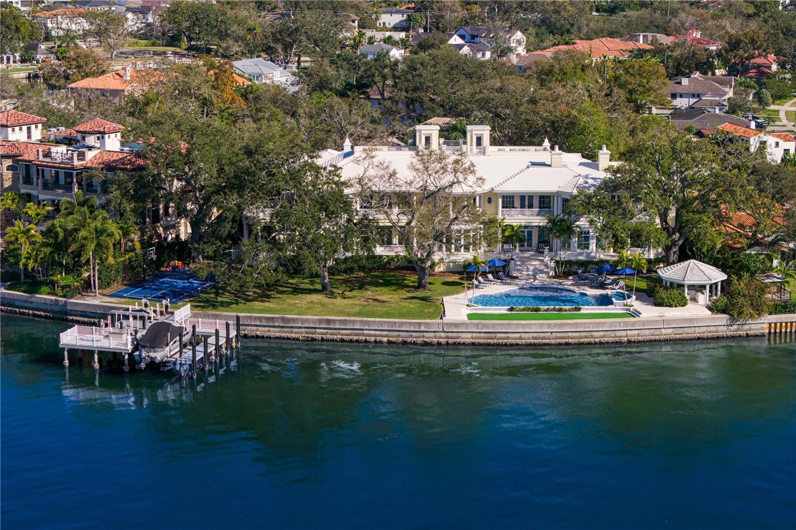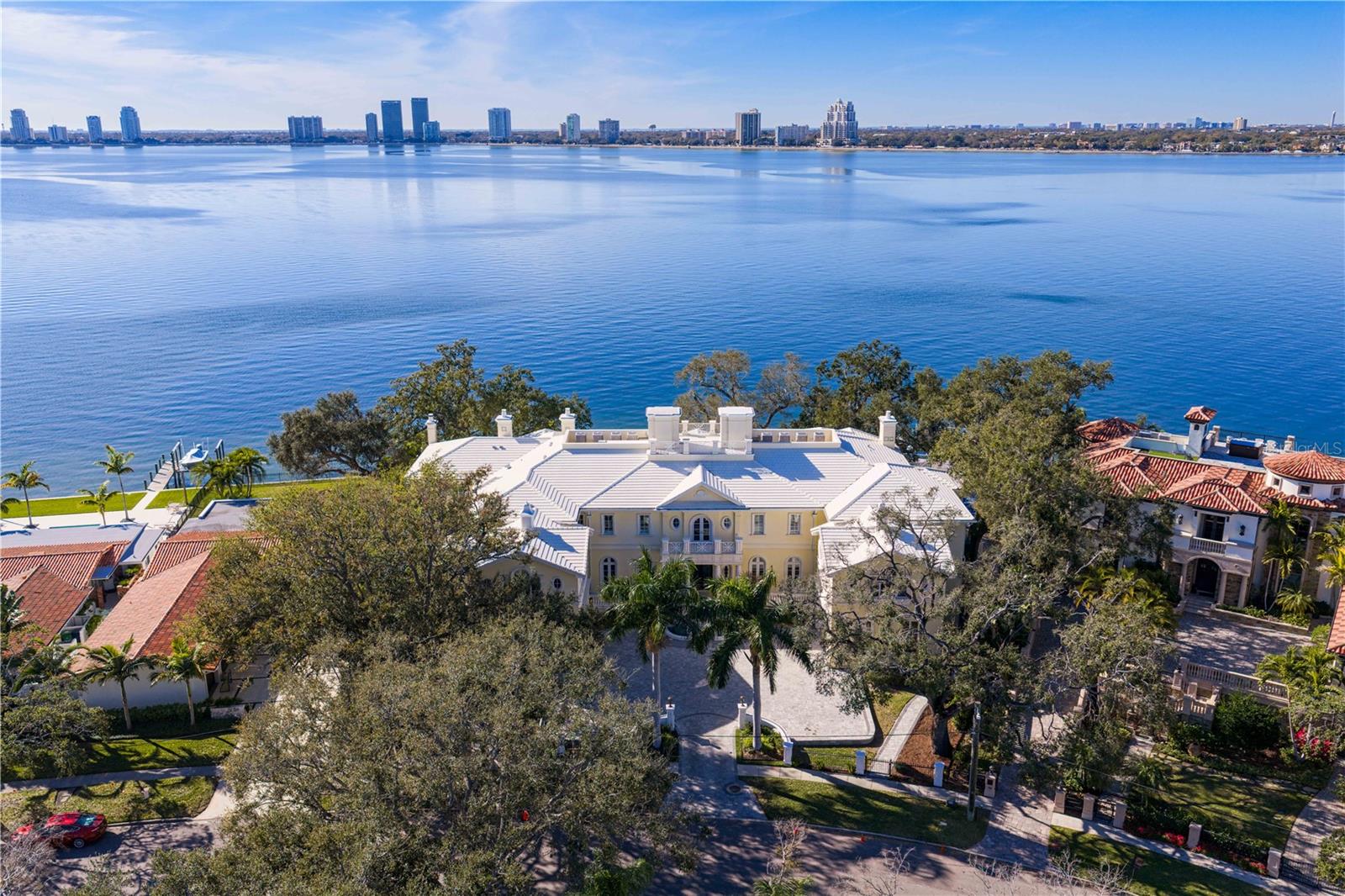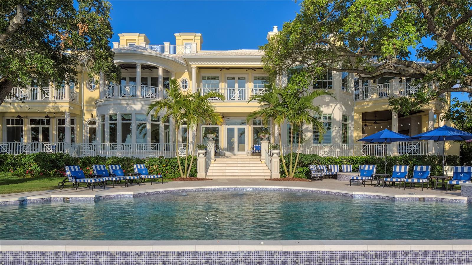 Experience the height of Livable Luxury in this extraordinary estate designed by Thomas Everett Lamb and built by Windstar Homes, an award-winning custom builder with over 100 industry accolades for craftsmanship and architectural excellence. Positioned on the open bay along Davis Islands, this one-of-a-kind residence blends timeless design with resort-style living. Created for grand-scale entertaining and refined everyday living, the home captures sweeping bay views, expansive terraces, and meticulously curated interiors. A stately arrival welcomes with parking for 9 vehicles and a 4-car garage, framed by hand-cast cement trim, shell detailing, and custom copper lanterns. Twin fountains accent the circular glass-paneled French doors, opening to a breathtaking foyer highlighted by a sweeping spiral staircase, intricate filigree ironwork, layered crown and dentil moldings, and a dramatic domed ceiling. The Grand Salon and formal dining spaces, including a dining alcove flanked by dual wine rooms with beveled glass, feature hardwood floors, hand-carved limestone fireplaces, and floor-to-ceiling arched windows. Walls of glass frame the west-facing veranda, gazebo, pool, fire pit, party dock, pickleball court, and unobstructed open bay. Exceptional craftsmanship is evident throughout, with concealed air-conditioning vents seamlessly integrated within the crown molding, deep windowsills, and extensive custom millwork. The chef’s kitchen centers around a massive island with beveled stone countertops and dual crystal chandeliers, complemented by Sub-Zero refrigeration, double dishwashers, and a Wolf range with griddle. A fully equipped scullery kitchen offers commercial refrigeration, double ovens, and additional prep space, ideal for catered events. A butler’s pantry, mudroom, and secondary laundry enhance daily functionality. Seamless indoor-outdoor living unfolds as the kitchen and great room open to a covered terrace featuring a pizza oven, warming drawer, beverage refrigerator, ice maker, sink, gas grill, and generous seating and dining areas overlooking the pool and bay. The first level also includes a bayfront office with custom cabinetry and fireplace, a game room with bar and adjacent theater, as well as a gym, craft, and multipurpose spaces. A private guest suite with rotunda seating, kitchenette, and elaborate bath completes the main floor. Upstairs, the primary suite is a private sanctuary occupying nearly one-third of the level. Entered through a grand vestibule, it features a bayfront sitting room with terrace access, limestone fireplace, dual custom walk-in closets with crystal chandeliers, and a spa-inspired bath with fireplace, steam shower, and marble finishes. Additional bedroom suites offer ensuite baths, custom cabinetry, and tranquil water or garden views, with many opening to private terraces. A separate guest or nanny suite, accessible via stairs and a hidden passage, includes a full kitchen, living area, bedroom, walk-in closet, laundry, and full bath. Outdoor living rivals a private resort, with a gazebo featuring marble bar seating for ten, a resort-style pool, fire pit, multiple terraces, pool baths, and a fully equipped kitchen. A crow’s nest terrace captures west-facing sunsets over the bay. With elevator access, 3 staircases, integrated technology, whole-home audio, and thoughtfully designed flow, this Davis Islands estate delivers architectural grandeur, modern luxury, and an unparalleled waterfront lifestyle.