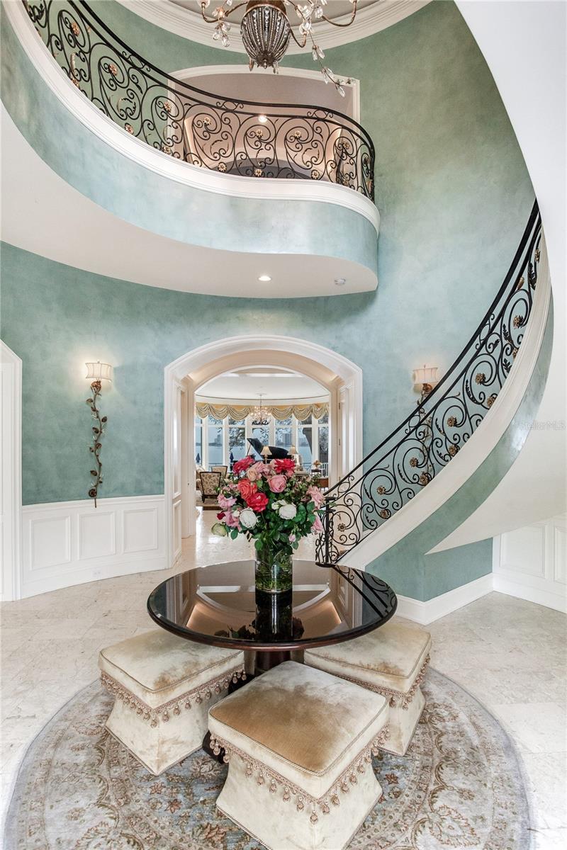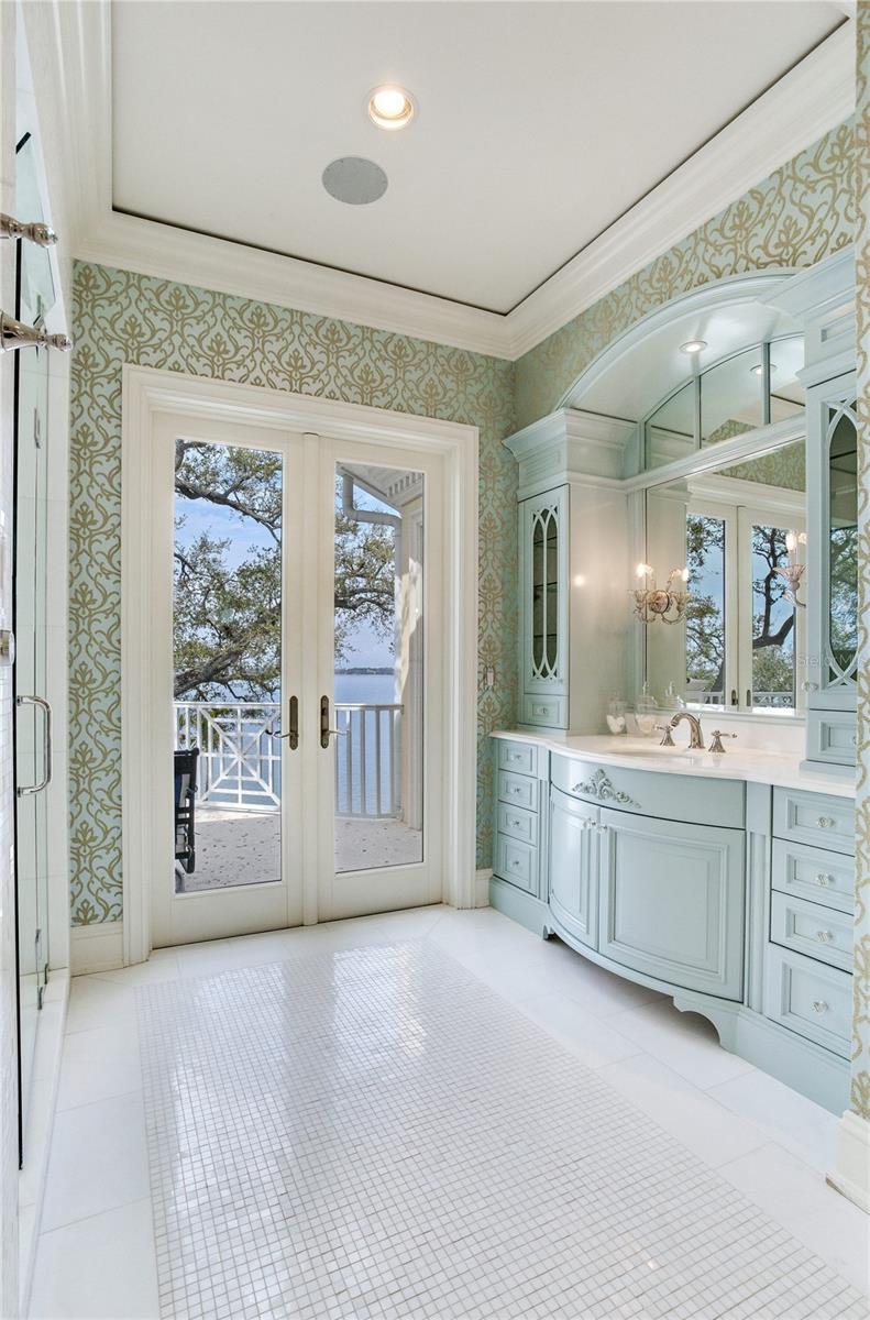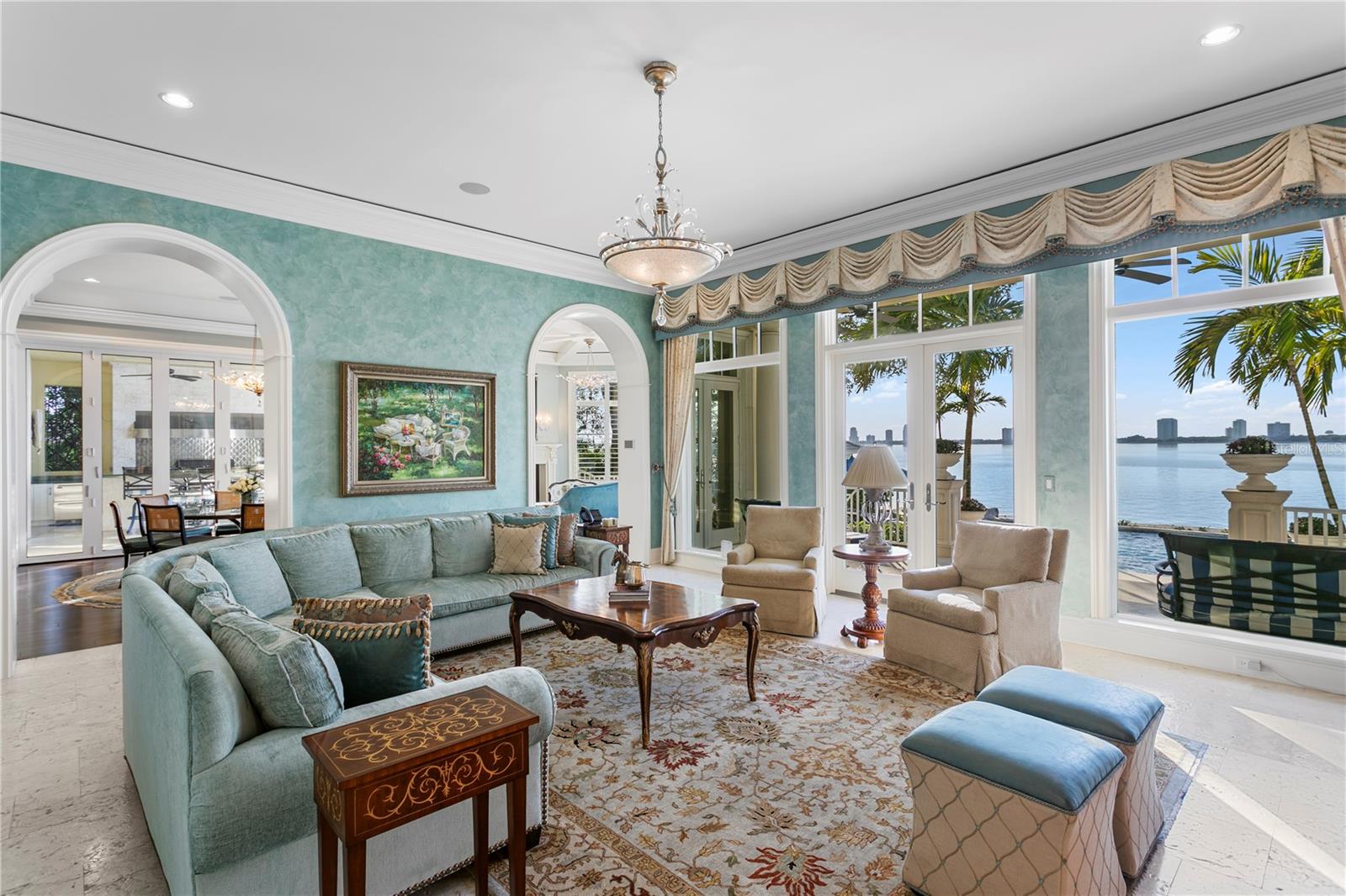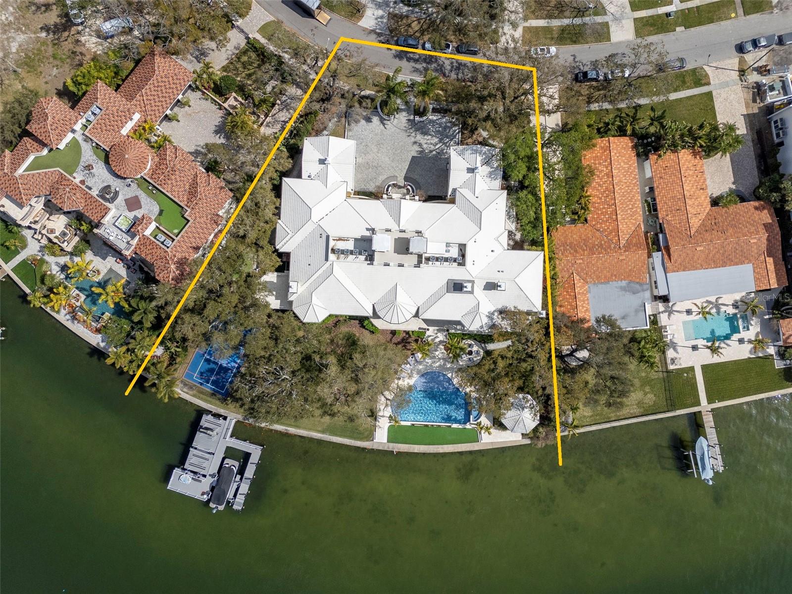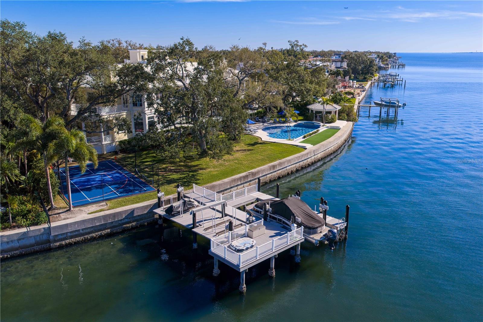 Experience the height of Livable Luxury in this extraordinary estate designed by Thomas Everett Lamb and built by Windstar Homes, an award-winning custom builder with over 100 industry accolades for craftsmanship and architectural excellence. Positioned on the open bay along Davis Islands, this one-of-a-kind residence blends timeless design with resort-style living. Created for grand-scale entertaining and refined everyday living, the home captures sweeping bay views, expansive terraces, and meticulously curated interiors. A stately arrival welcomes with parking for 9 vehicles and a 4-car garage, framed by hand-cast cement trim, shell detailing, and custom copper lanterns. Twin fountains accent the circular glass-paneled French doors, opening to a breathtaking foyer highlighted by a sweeping spiral staircase, intricate filigree ironwork, layered crown and dentil moldings, and a dramatic domed ceiling. The Grand Salon and formal dining spaces, including a dining alcove flanked by dual wine rooms with beveled glass, feature hardwood floors, hand-carved limestone fireplaces, and floor-to-ceiling arched windows. Walls of glass frame the west-facing veranda, gazebo, pool, fire pit, party dock, pickleball court, and unobstructed open bay. Exceptional craftsmanship is evident throughout, with concealed air-conditioning vents seamlessly integrated within the crown molding, deep windowsills, and extensive custom millwork. The chef’s kitchen centers around a massive island with beveled stone countertops and dual crystal chandeliers, complemented by Sub-Zero refrigeration, double dishwashers, and a Wolf range with griddle. A fully equipped scullery kitchen offers commercial refrigeration, double ovens, and additional prep space, ideal for catered events. A butler’s pantry, mudroom, and secondary laundry enhance daily functionality. Seamless indoor-outdoor living unfolds as the kitchen and great room open to a covered terrace featuring a pizza oven, warming drawer, beverage refrigerator, ice maker, sink, gas grill, and generous seating and dining areas overlooking the pool and bay. The first level also includes a bayfront office with custom cabinetry and fireplace, a game room with bar and adjacent theater, as well as a gym, craft, and multipurpose spaces. A private guest suite with rotunda seating, kitchenette, and elaborate bath completes the main floor. Upstairs, the primary suite is a private sanctuary occupying nearly one-third of the level. Entered through a grand vestibule, it features a bayfront sitting room with terrace access, limestone fireplace, dual custom walk-in closets with crystal chandeliers, and a spa-inspired bath with fireplace, steam shower, and marble finishes. Additional bedroom suites offer ensuite baths, custom cabinetry, and tranquil water or garden views, with many opening to private terraces. A separate guest or nanny suite, accessible via stairs and a hidden passage, includes a full kitchen, living area, bedroom, walk-in closet, laundry, and full bath. Outdoor living rivals a private resort, with a gazebo featuring marble bar seating for ten, a resort-style pool, fire pit, multiple terraces, pool baths, and a fully equipped kitchen. A crow’s nest terrace captures west-facing sunsets over the bay. With elevator access, 3 staircases, integrated technology, whole-home audio, and thoughtfully designed flow, this Davis Islands estate delivers architectural grandeur, modern luxury, and an unparalleled waterfront lifestyle.