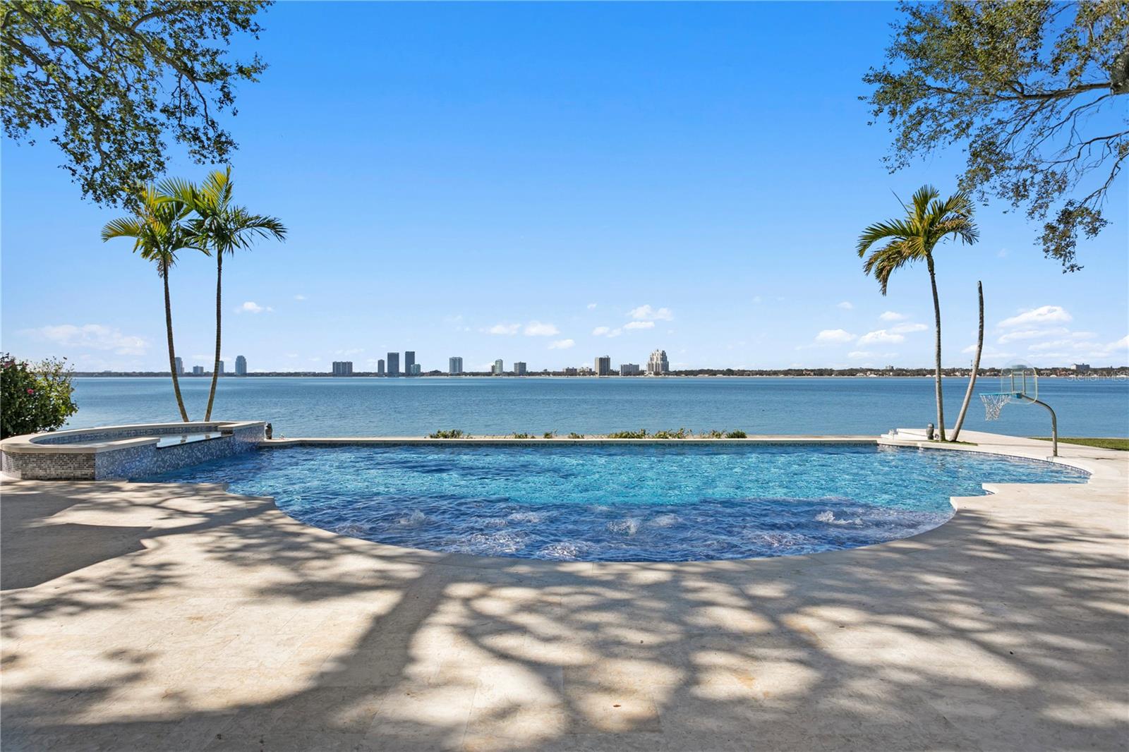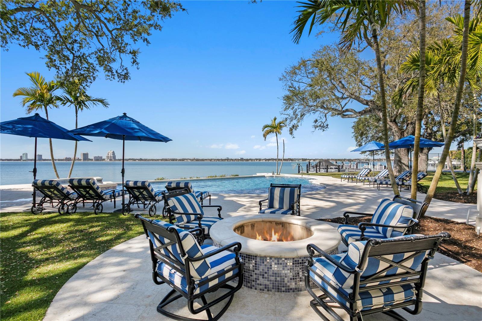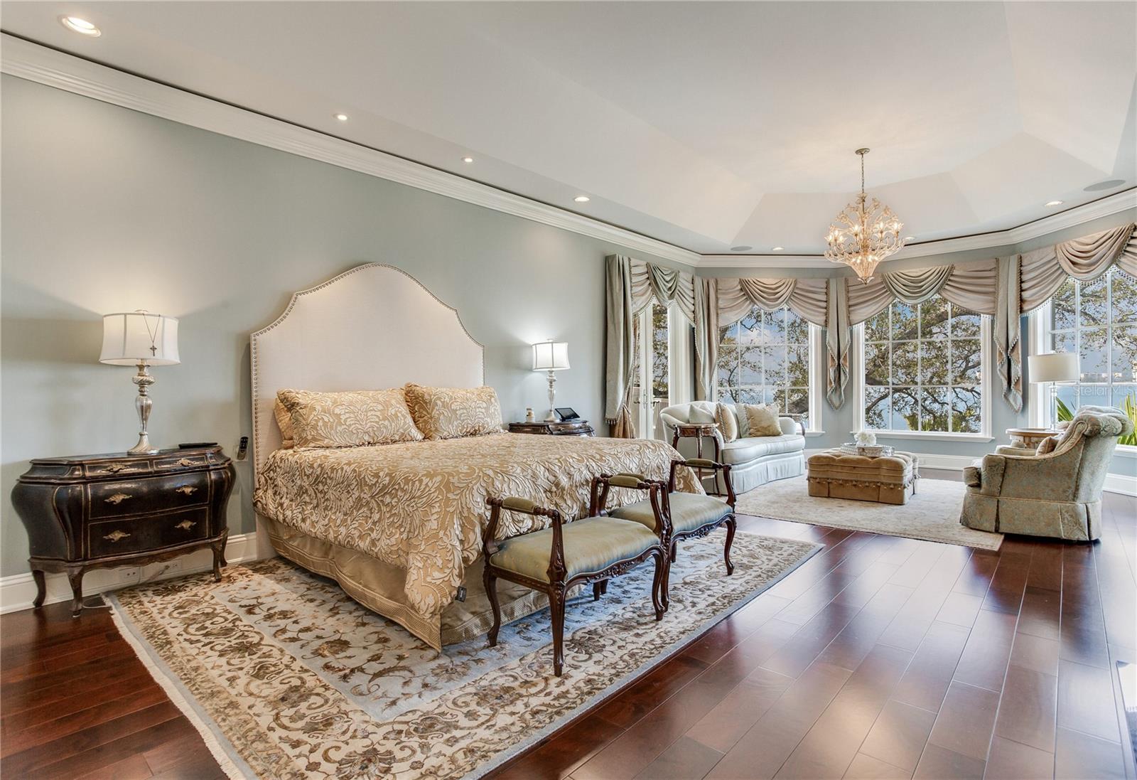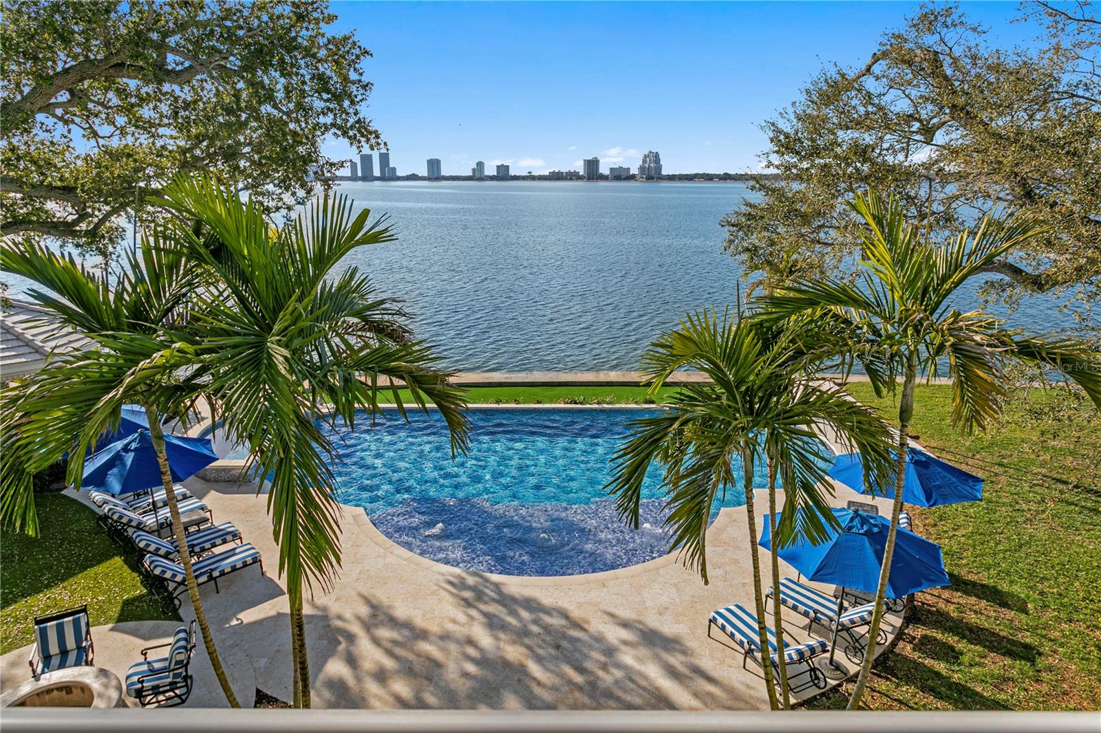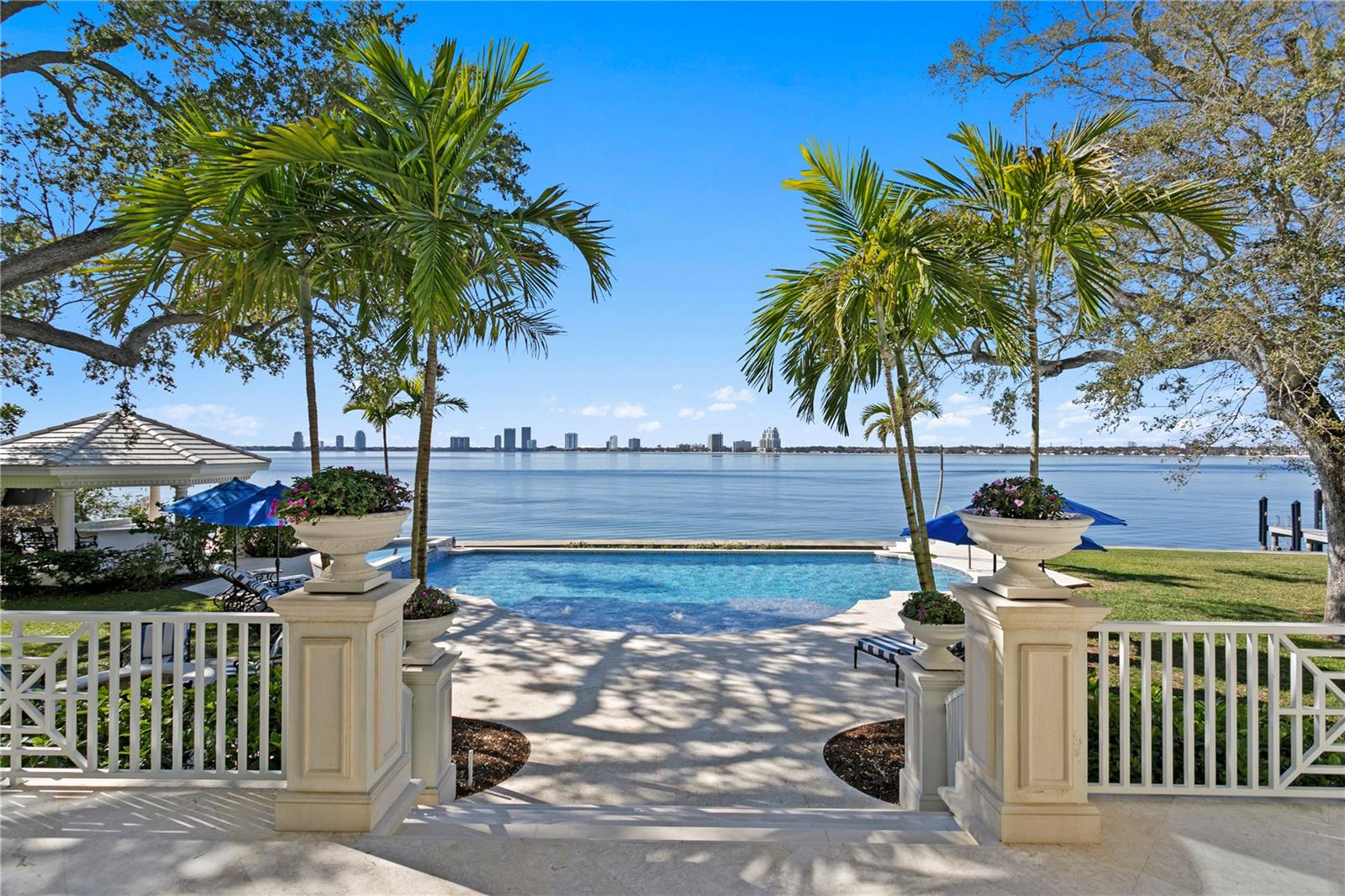 Experience the height of Livable Luxury in this extraordinary estate designed by Thomas Everett Lamb and built by Windstar Homes, an award-winning custom builder with over 100 industry accolades for craftsmanship and architectural excellence. Positioned on the open bay along Davis Islands, this one-of-a-kind residence blends timeless design with resort-style living. Created for grand-scale entertaining and refined everyday living, the home captures sweeping bay views, expansive terraces, and meticulously curated interiors. A stately arrival welcomes with parking for 9 vehicles and a 4-car garage, framed by hand-cast cement trim, shell detailing, and custom copper lanterns. Twin fountains accent the circular glass-paneled French doors, opening to a breathtaking foyer highlighted by a sweeping spiral staircase, intricate filigree ironwork, layered crown and dentil moldings, and a dramatic domed ceiling. The Grand Salon and formal dining spaces, including a dining alcove flanked by dual wine rooms with beveled glass, feature hardwood floors, hand-carved limestone fireplaces, and floor-to-ceiling arched windows. Walls of glass frame the west-facing veranda, gazebo, pool, fire pit, party dock, pickleball court, and unobstructed open bay. Exceptional craftsmanship is evident throughout, with concealed air-conditioning vents seamlessly integrated within the crown molding, deep windowsills, and extensive custom millwork. The chef’s kitchen centers around a massive island with beveled stone countertops and dual crystal chandeliers, complemented by Sub-Zero refrigeration, double dishwashers, and a Wolf range with griddle. A fully equipped scullery kitchen offers commercial refrigeration, double ovens, and additional prep space, ideal for catered events. A butler’s pantry, mudroom, and secondary laundry enhance daily functionality. Seamless indoor-outdoor living unfolds as the kitchen and great room open to a covered terrace featuring a pizza oven, warming drawer, beverage refrigerator, ice maker, sink, gas grill, and generous seating and dining areas overlooking the pool and bay. The first level also includes a bayfront office with custom cabinetry and fireplace, a game room with bar and adjacent theater, as well as a gym, craft, and multipurpose spaces. A private guest suite with rotunda seating, kitchenette, and elaborate bath completes the main floor. Upstairs, the primary suite is a private sanctuary occupying nearly one-third of the level. Entered through a grand vestibule, it features a bayfront sitting room with terrace access, limestone fireplace, dual custom walk-in closets with crystal chandeliers, and a spa-inspired bath with fireplace, steam shower, and marble finishes. Additional bedroom suites offer ensuite baths, custom cabinetry, and tranquil water or garden views, with many opening to private terraces. A separate guest or nanny suite, accessible via stairs and a hidden passage, includes a full kitchen, living area, bedroom, walk-in closet, laundry, and full bath. Outdoor living rivals a private resort, with a gazebo featuring marble bar seating for ten, a resort-style pool, fire pit, multiple terraces, pool baths, and a fully equipped kitchen. A crow’s nest terrace captures west-facing sunsets over the bay. With elevator access, 3 staircases, integrated technology, whole-home audio, and thoughtfully designed flow, this Davis Islands estate delivers architectural grandeur, modern luxury, and an unparalleled waterfront lifestyle.