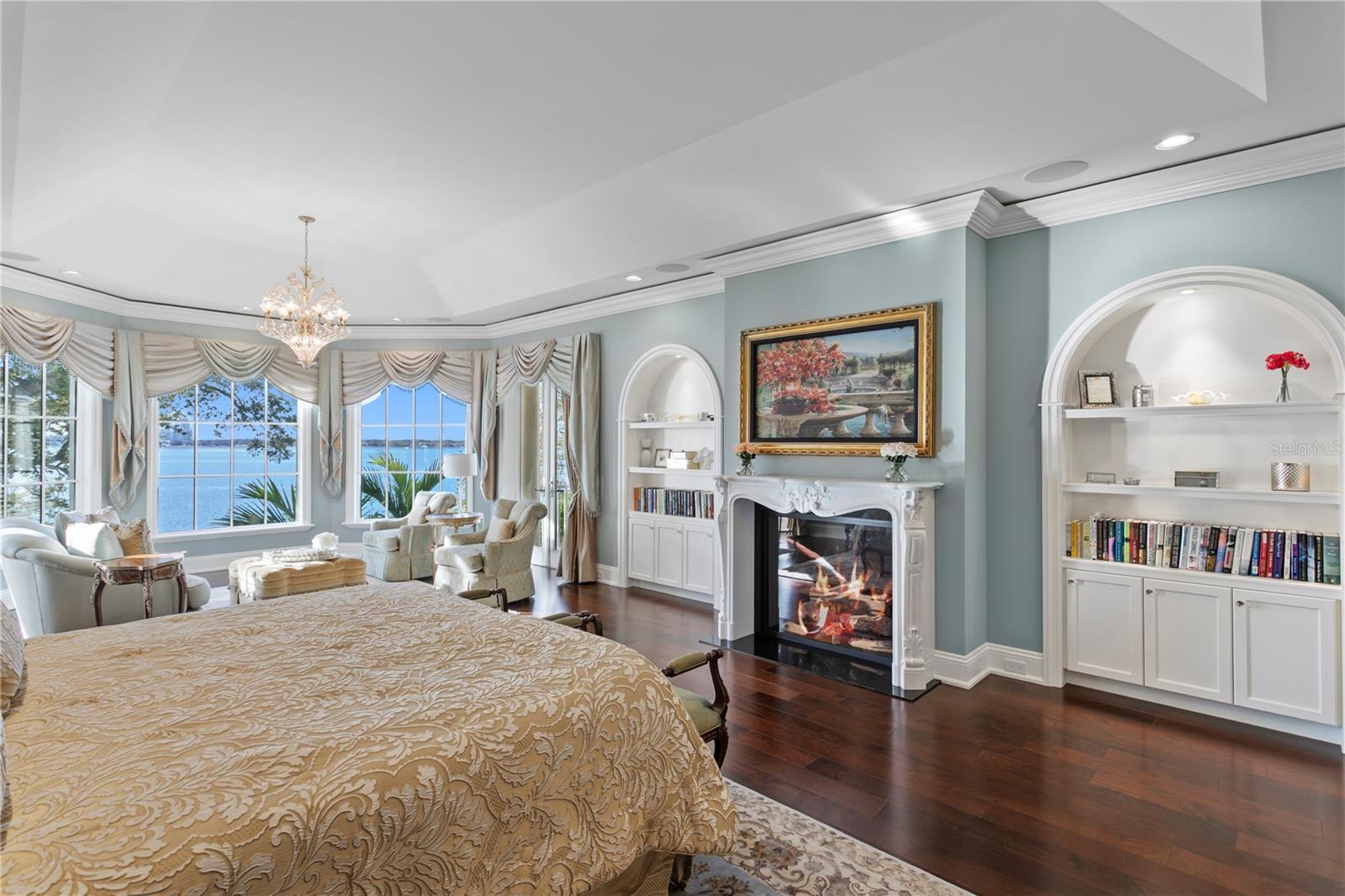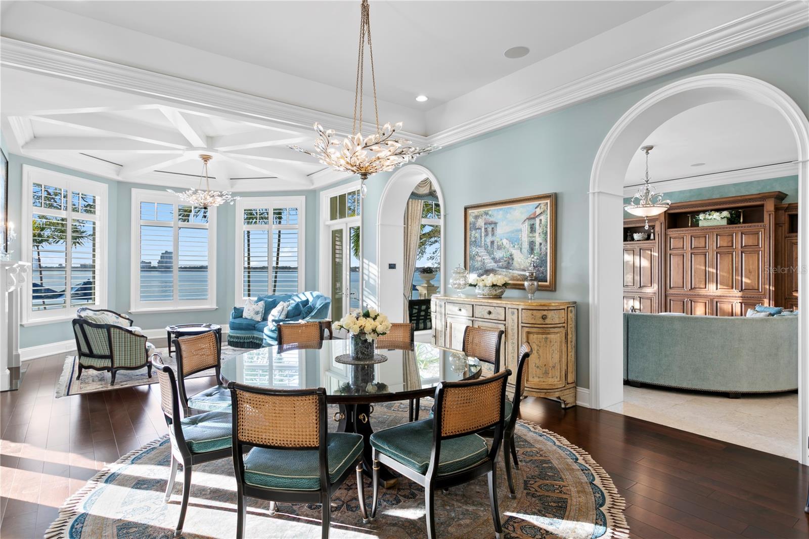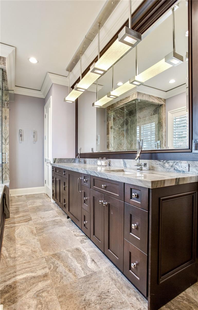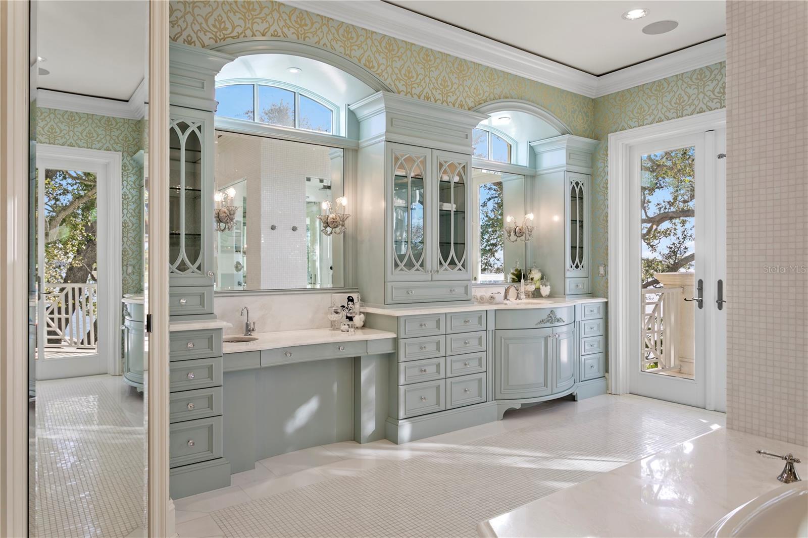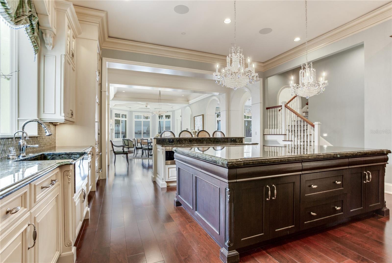 Experience the height of Livable Luxury in this extraordinary estate designed by Thomas Everett Lamb and built by Windstar Homes, an award-winning custom builder with over 100 industry accolades for craftsmanship and architectural excellence. Positioned on the open bay along Davis Islands, this one-of-a-kind residence blends timeless design with resort-style living. Created for grand-scale entertaining and refined everyday living, the home captures sweeping bay views, expansive terraces, and meticulously curated interiors. A stately arrival welcomes with parking for 9 vehicles and a 4-car garage, framed by hand-cast cement trim, shell detailing, and custom copper lanterns. Twin fountains accent the circular glass-paneled French doors, opening to a breathtaking foyer highlighted by a sweeping spiral staircase, intricate filigree ironwork, layered crown and dentil moldings, and a dramatic domed ceiling. The Grand Salon and formal dining spaces, including a dining alcove flanked by dual wine rooms with beveled glass, feature hardwood floors, hand-carved limestone fireplaces, and floor-to-ceiling arched windows. Walls of glass frame the west-facing veranda, gazebo, pool, fire pit, party dock, pickleball court, and unobstructed open bay. Exceptional craftsmanship is evident throughout, with concealed air-conditioning vents seamlessly integrated within the crown molding, deep windowsills, and extensive custom millwork. The chef’s kitchen centers around a massive island with beveled stone countertops and dual crystal chandeliers, complemented by Sub-Zero refrigeration, double dishwashers, and a Wolf range with griddle. A fully equipped scullery kitchen offers commercial refrigeration, double ovens, and additional prep space, ideal for catered events. A butler’s pantry, mudroom, and secondary laundry enhance daily functionality. Seamless indoor-outdoor living unfolds as the kitchen and great room open to a covered terrace featuring a pizza oven, warming drawer, beverage refrigerator, ice maker, sink, gas grill, and generous seating and dining areas overlooking the pool and bay. The first level also includes a bayfront office with custom cabinetry and fireplace, a game room with bar and adjacent theater, as well as a gym, craft, and multipurpose spaces. A private guest suite with rotunda seating, kitchenette, and elaborate bath completes the main floor. Upstairs, the primary suite is a private sanctuary occupying nearly one-third of the level. Entered through a grand vestibule, it features a bayfront sitting room with terrace access, limestone fireplace, dual custom walk-in closets with crystal chandeliers, and a spa-inspired bath with fireplace, steam shower, and marble finishes. Additional bedroom suites offer ensuite baths, custom cabinetry, and tranquil water or garden views, with many opening to private terraces. A separate guest or nanny suite, accessible via stairs and a hidden passage, includes a full kitchen, living area, bedroom, walk-in closet, laundry, and full bath. Outdoor living rivals a private resort, with a gazebo featuring marble bar seating for ten, a resort-style pool, fire pit, multiple terraces, pool baths, and a fully equipped kitchen. A crow’s nest terrace captures west-facing sunsets over the bay. With elevator access, 3 staircases, integrated technology, whole-home audio, and thoughtfully designed flow, this Davis Islands estate delivers architectural grandeur, modern luxury, and an unparalleled waterfront lifestyle.