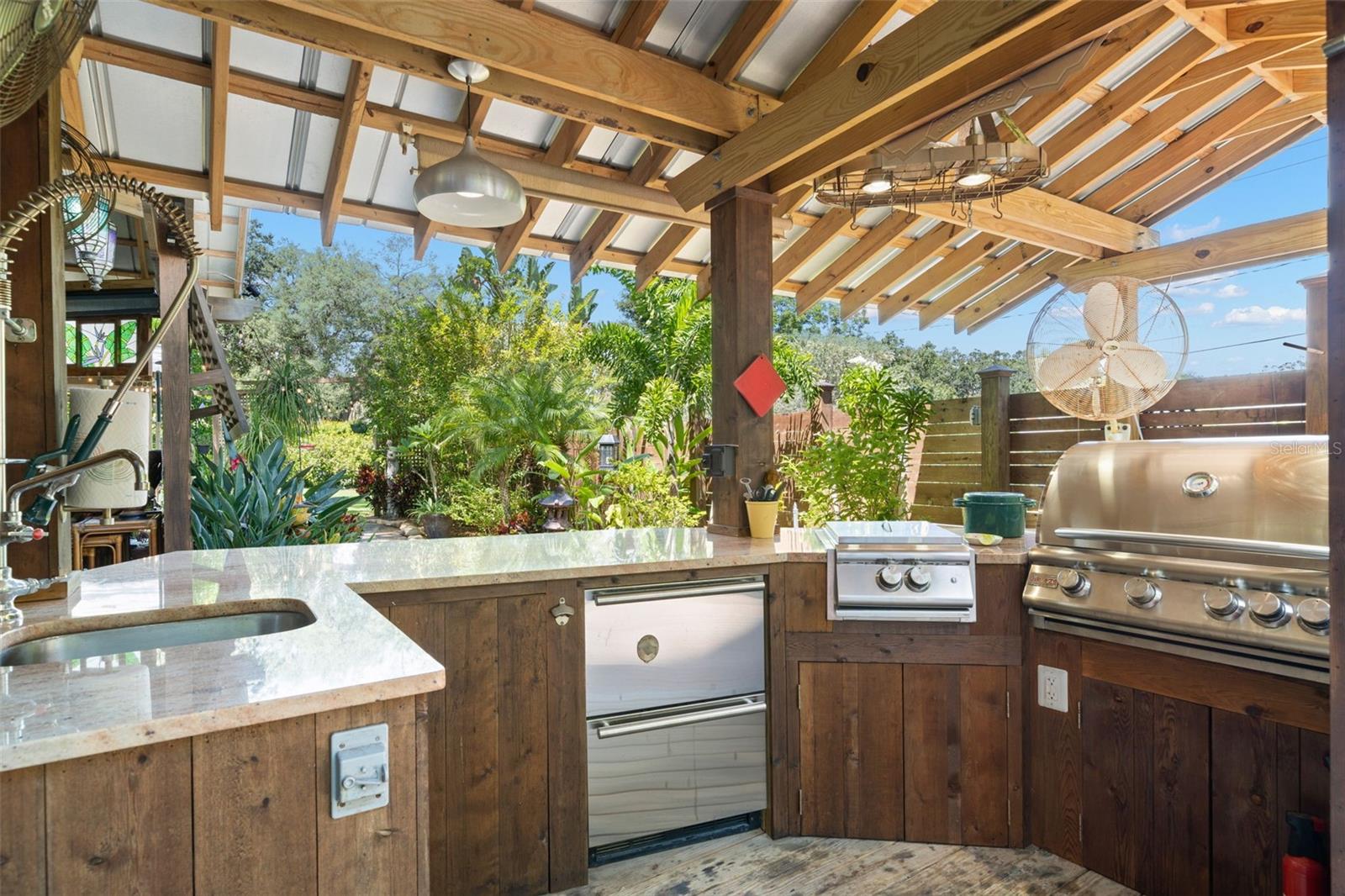 privacy and protection. The outdoor kitchen provides ample storage for meal prep, serving and