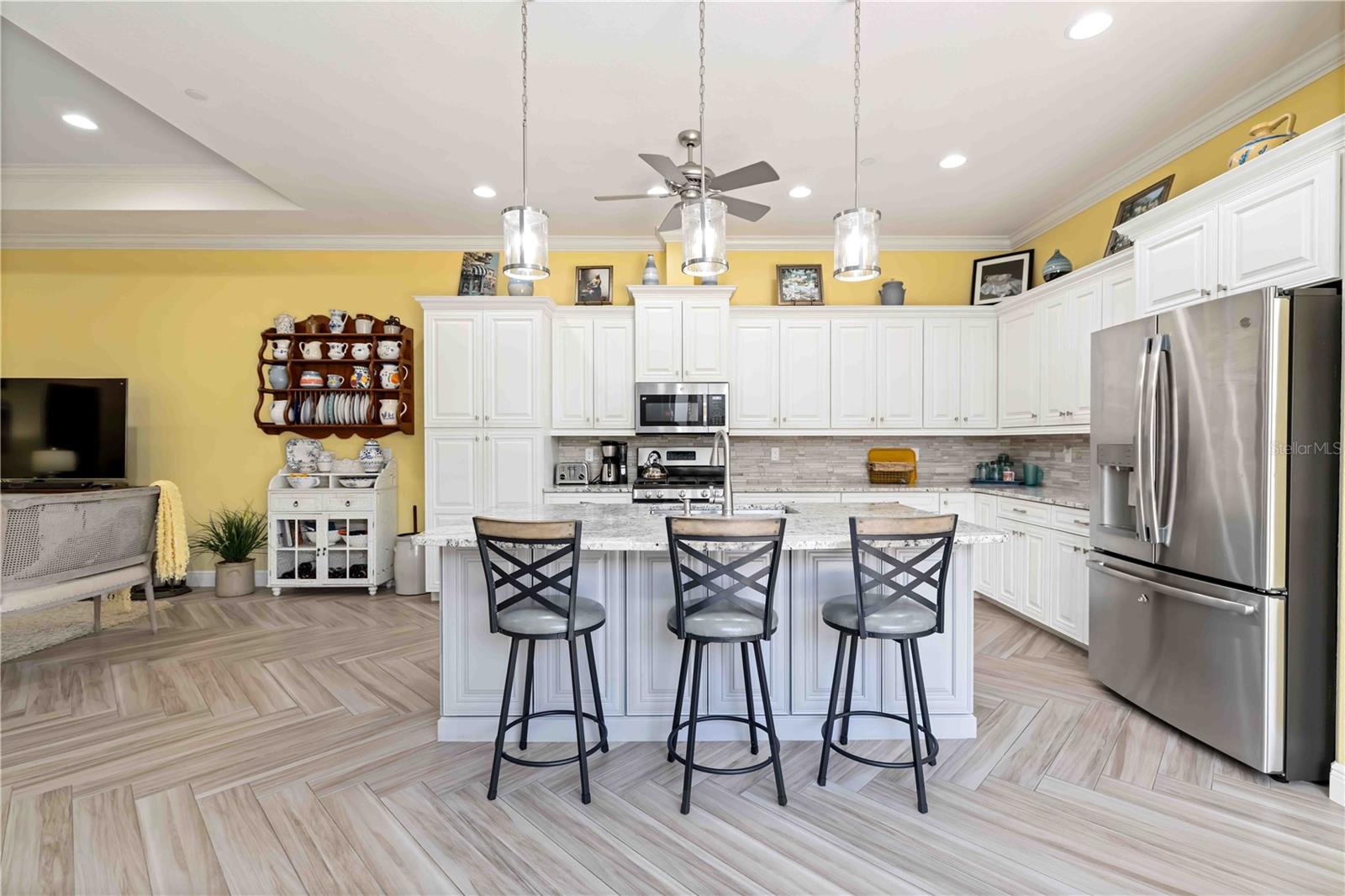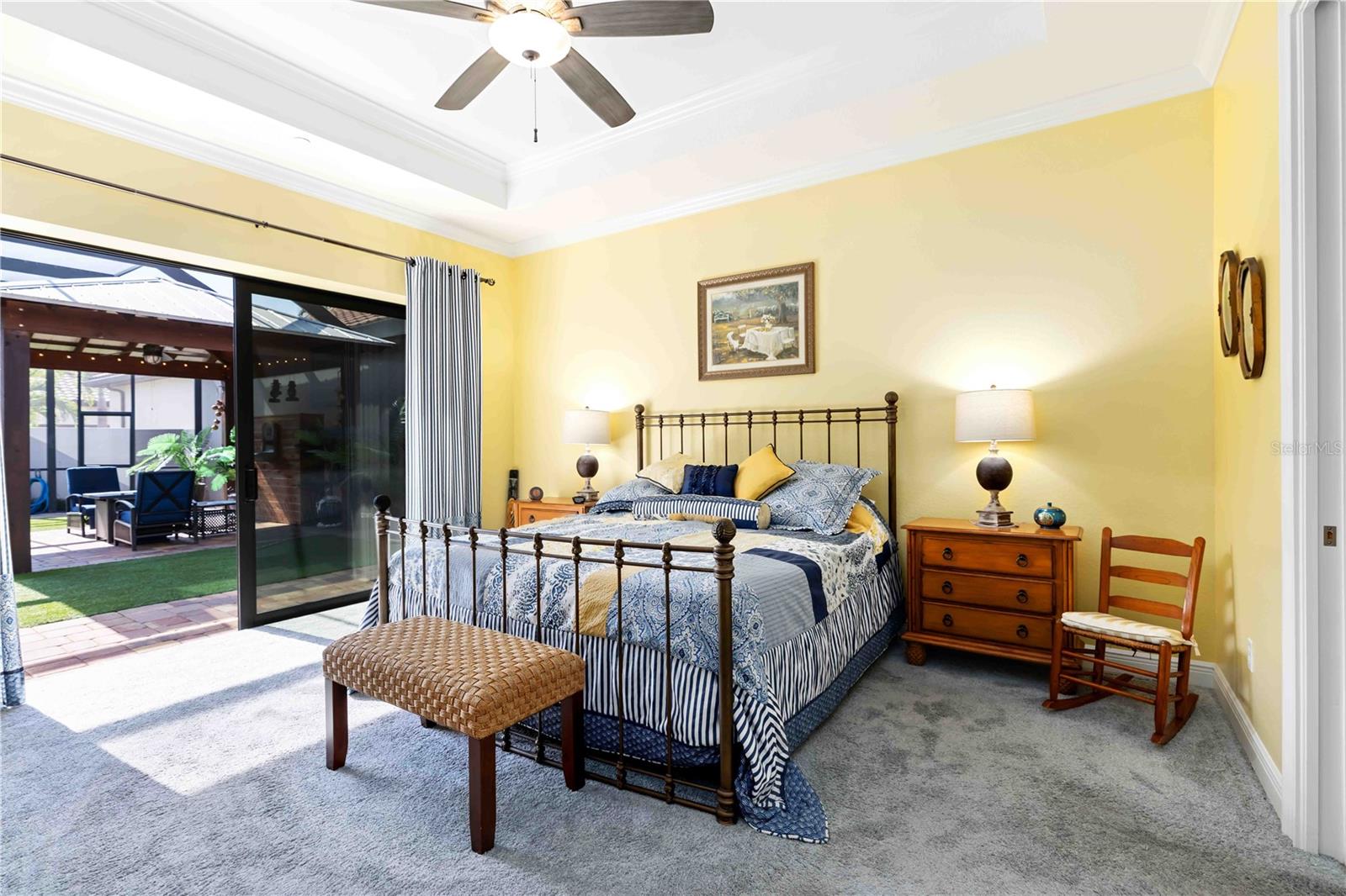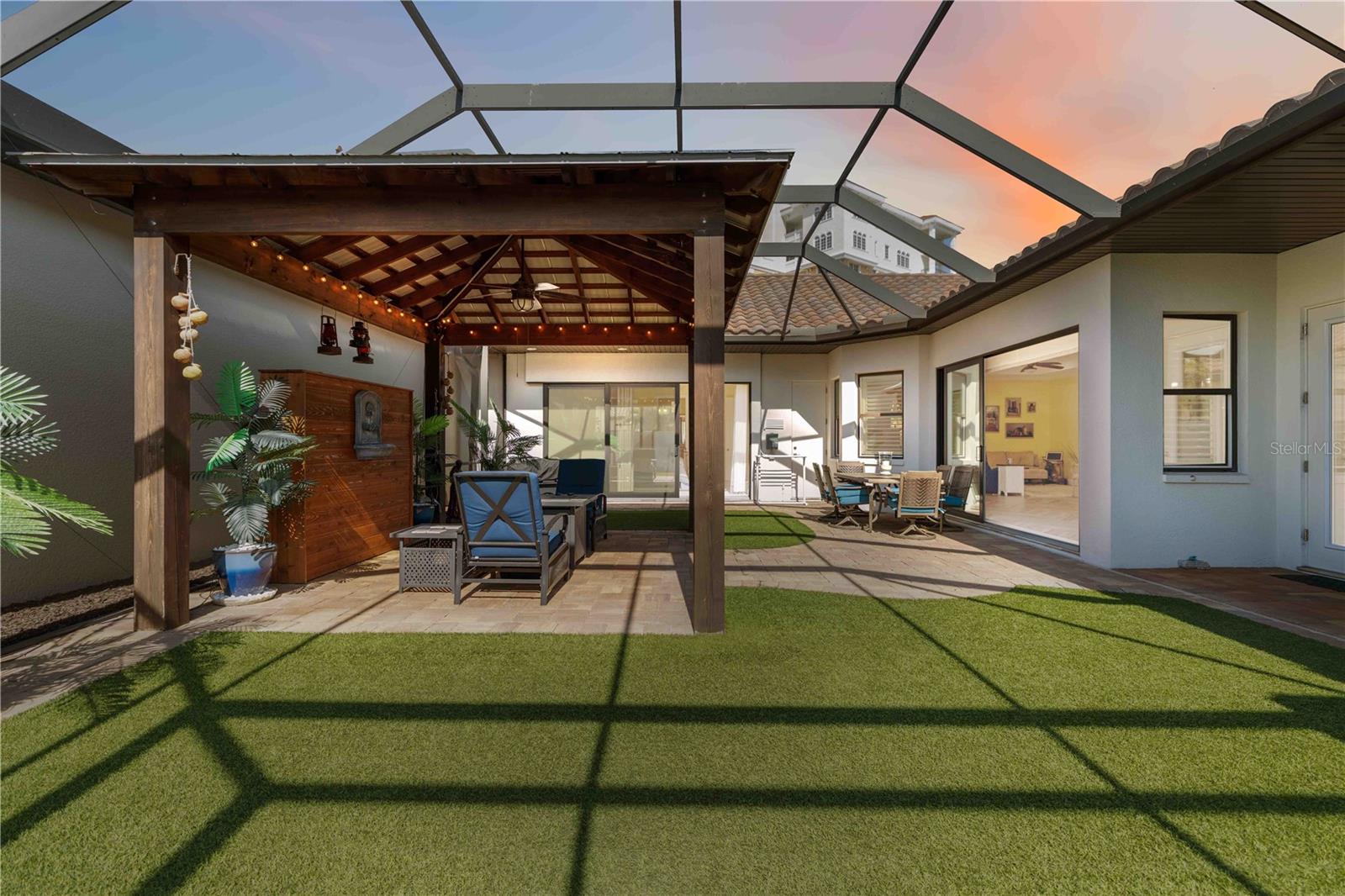 The backyard is a true highlight, offering a private, resort-style setting under the screened enclosure. A stunning covered pavilion anchors the space, complete with warm wood accents, decorative lighting, and room for lounging or dining. The surrounding turf courtyard keeps the area low-maintenance and usable year-round, while wide sliding glass doors connect the outdoor retreat to the interior living areas—perfect for entertaining, relaxing, or enjoying the island breeze.