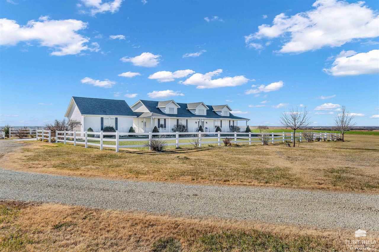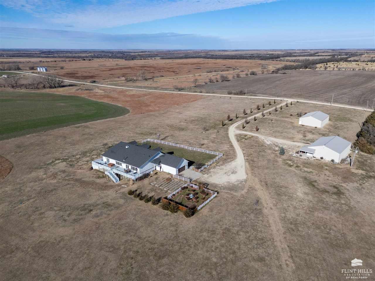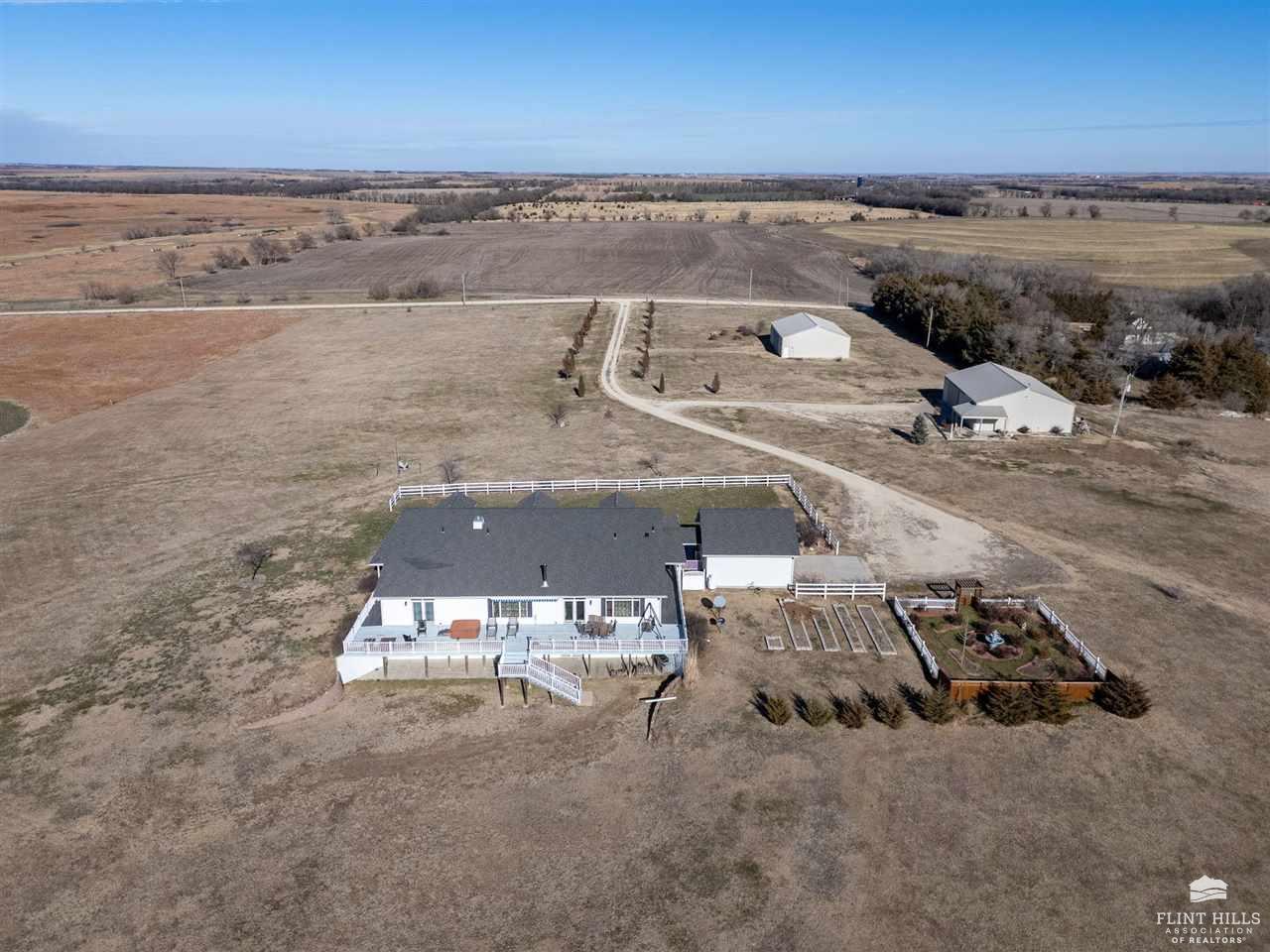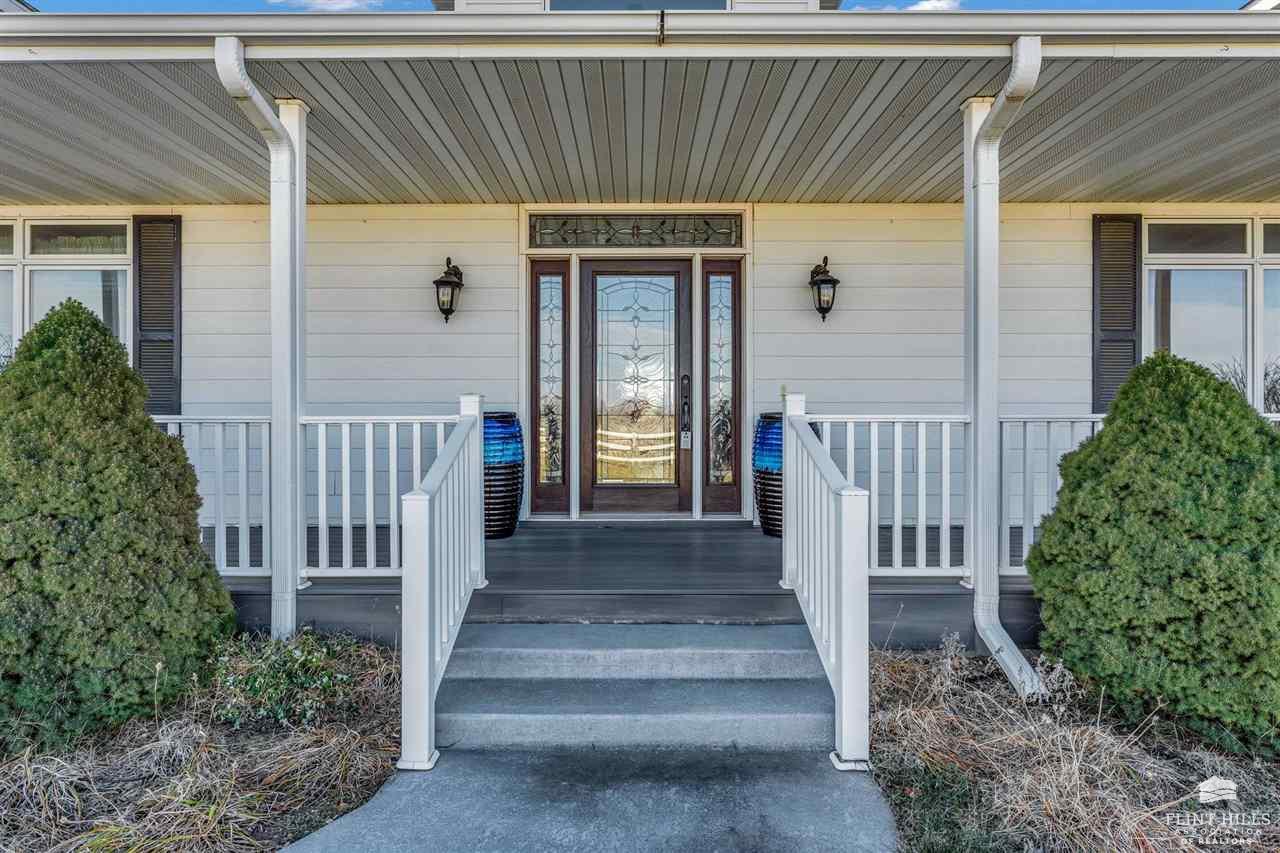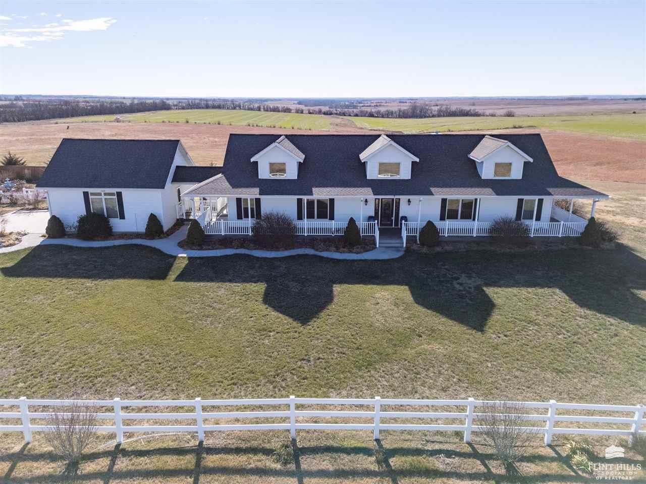 BE AWE STRUCK as you pull down the well manicured entrance to this charming countryside home nestled on 19.8 acres of serene land, featuring two 40x60 outbuildings. The inviting wrap-around porch leads you to the front entrance where you're greeted by vaulted ceilings, stunning marble floors, and an open-concept floor plan that flows seamlessly throughout the main level which is over 3000 total square feet. The spacious kitchen is complete with newer appliances, custom cabinets, gorgeous high grade granite countertops and large eat-in bar which is perfect for entertaining. The family room & primary bedroom feature elegant double sided gas fireplaces w/beautiful custom mantels. Step outside onto the back deck where you can enjoy peaceful views of the surrounding prairie land, ideal for outdoor living and relaxation. The full, unfinished basement with a walk-out to the backyard provides endless potential for additional living space or customization to suit your needs.