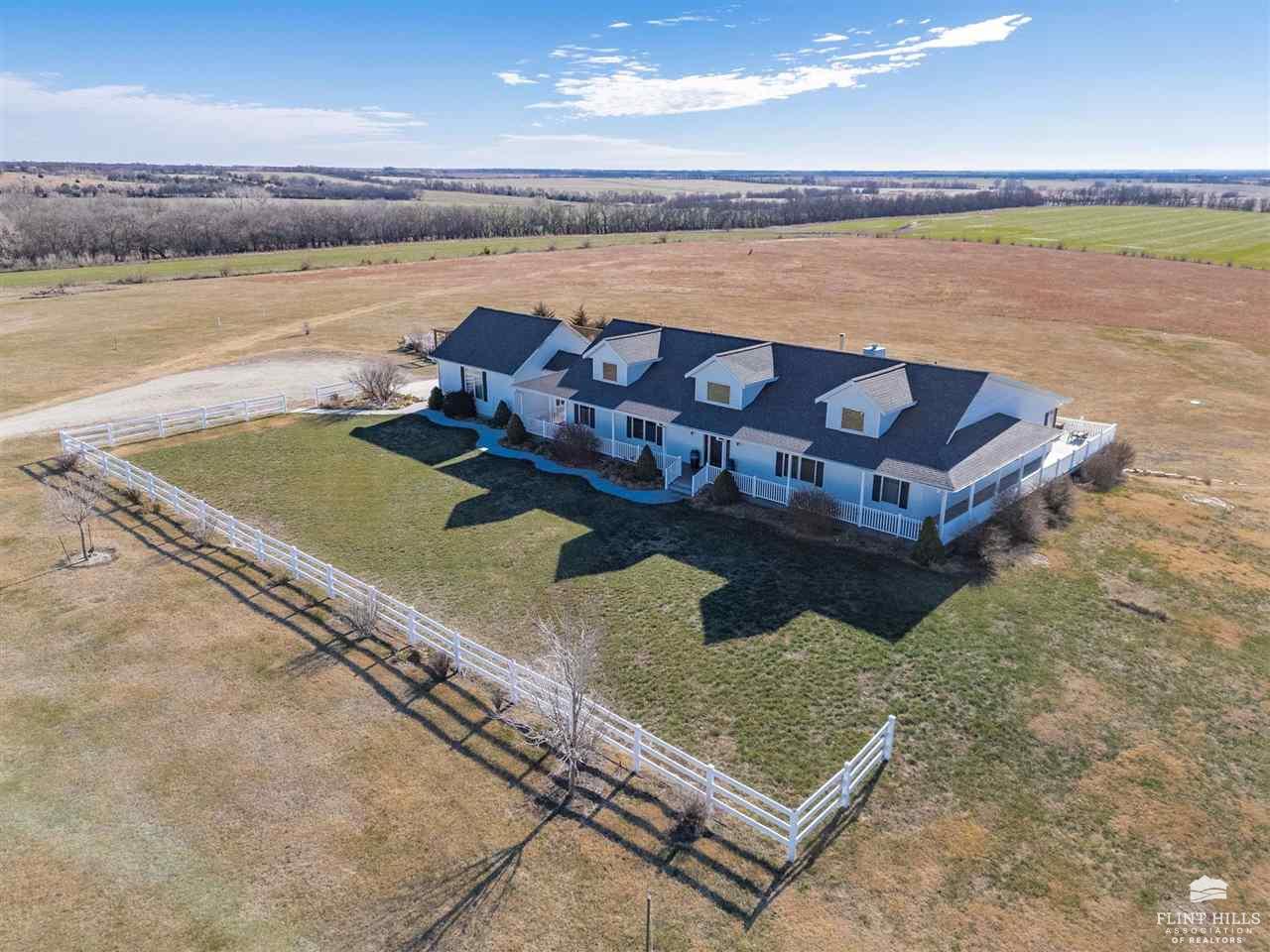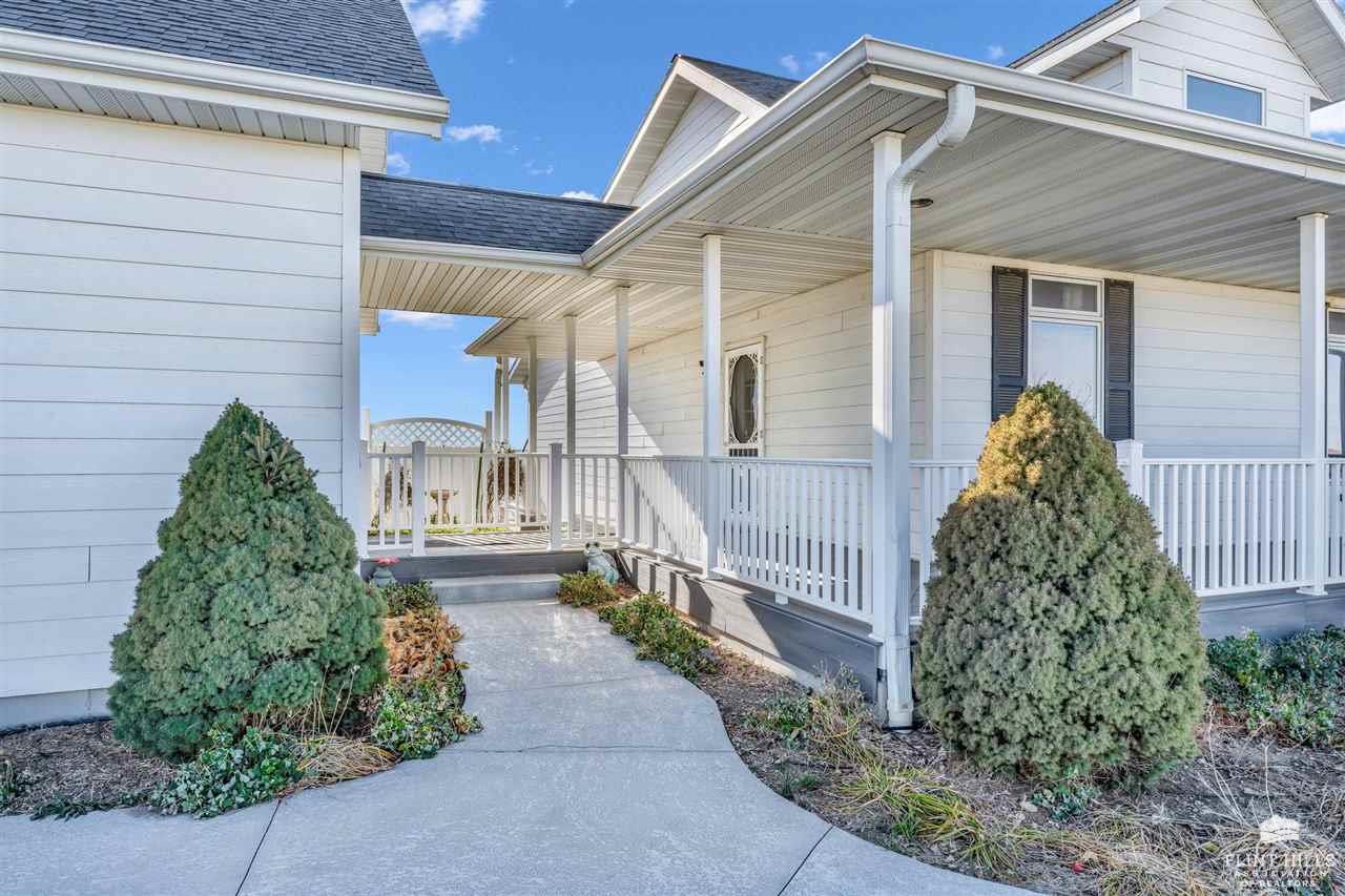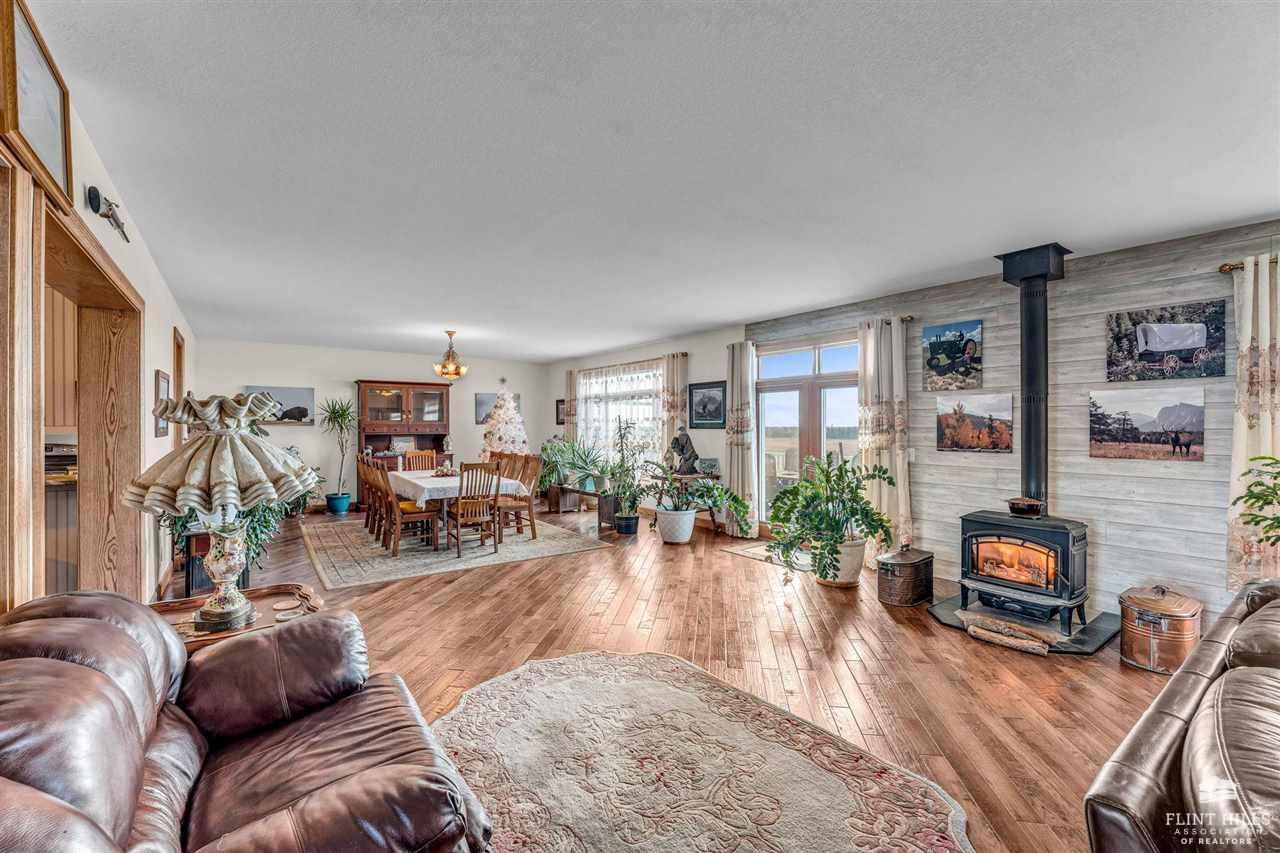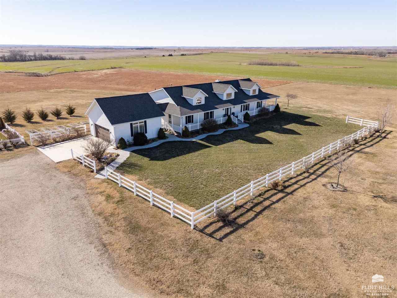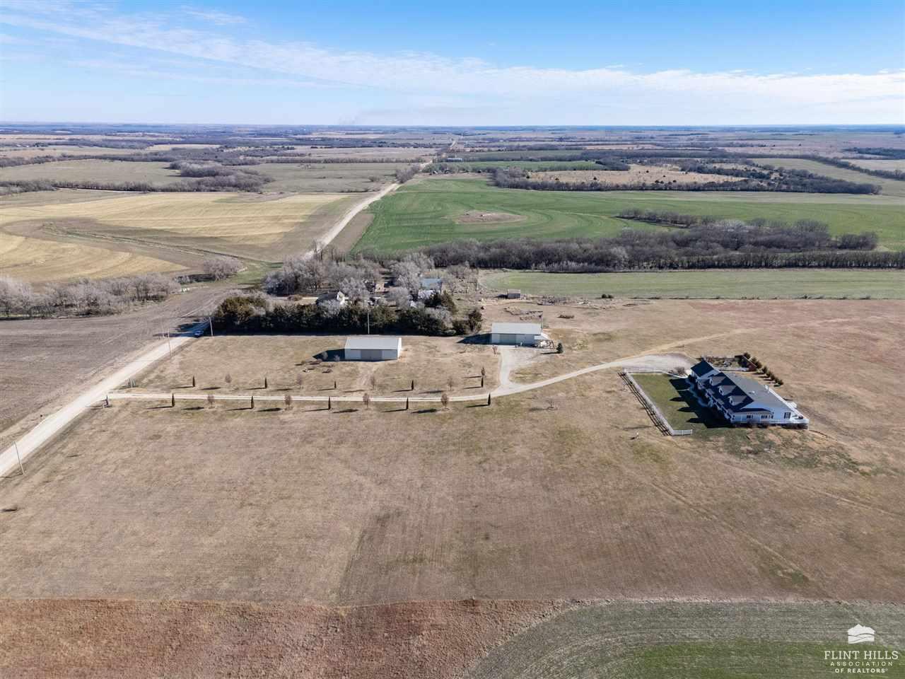 BE AWE STRUCK as you pull down the well manicured entrance to this charming countryside home nestled on 19.8 acres of serene land, featuring two 40x60 outbuildings. The inviting wrap-around porch leads you to the front entrance where you're greeted by vaulted ceilings, stunning marble floors, and an open-concept floor plan that flows seamlessly throughout the main level which is over 3000 total square feet. The spacious kitchen is complete with newer appliances, custom cabinets, gorgeous high grade granite countertops and large eat-in bar which is perfect for entertaining. The family room & primary bedroom feature elegant double sided gas fireplaces w/beautiful custom mantels. Step outside onto the back deck where you can enjoy peaceful views of the surrounding prairie land, ideal for outdoor living and relaxation. The full, unfinished basement with a walk-out to the backyard provides endless potential for additional living space or customization to suit your needs.