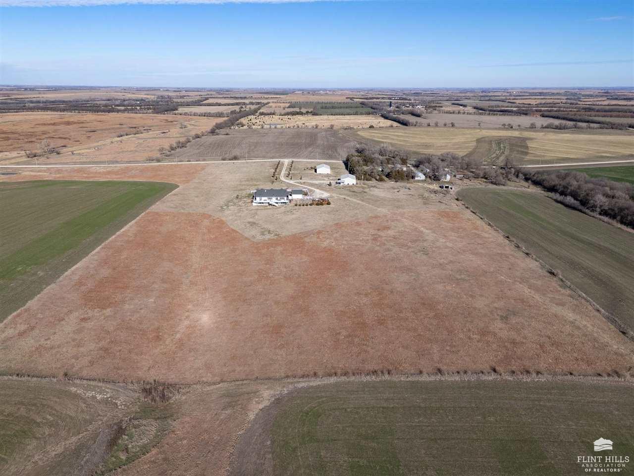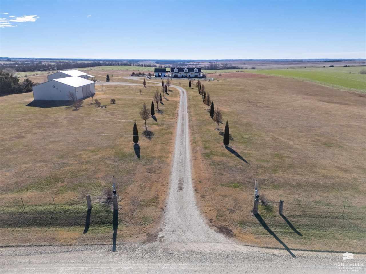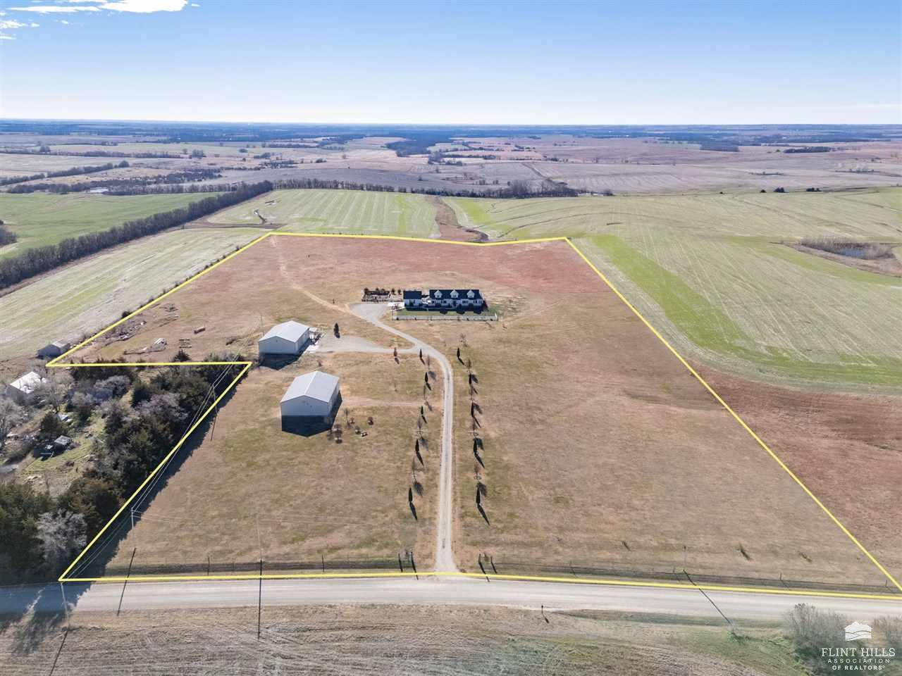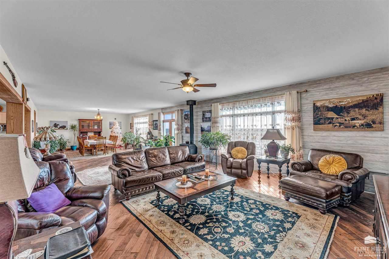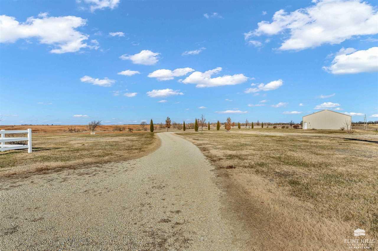 BE AWE STRUCK as you pull down the well manicured entrance to this charming countryside home nestled on 19.8 acres of serene land, featuring two 40x60 outbuildings. The inviting wrap-around porch leads you to the front entrance where you're greeted by vaulted ceilings, stunning marble floors, and an open-concept floor plan that flows seamlessly throughout the main level which is over 3000 total square feet. The spacious kitchen is complete with newer appliances, custom cabinets, gorgeous high grade granite countertops and large eat-in bar which is perfect for entertaining. The family room & primary bedroom feature elegant double sided gas fireplaces w/beautiful custom mantels. Step outside onto the back deck where you can enjoy peaceful views of the surrounding prairie land, ideal for outdoor living and relaxation. The full, unfinished basement with a walk-out to the backyard provides endless potential for additional living space or customization to suit your needs.