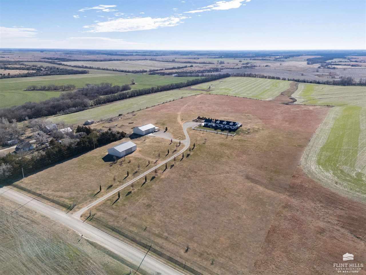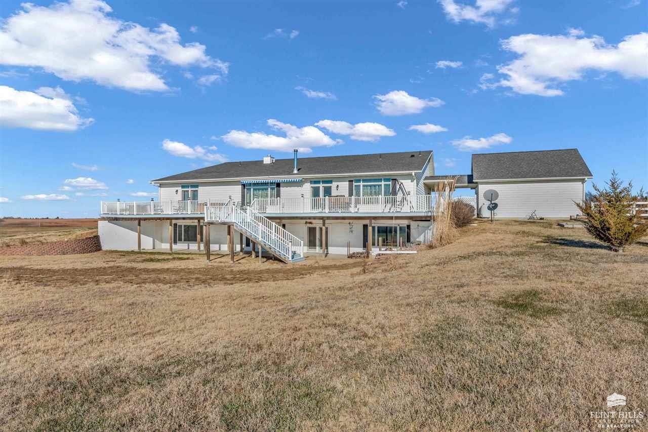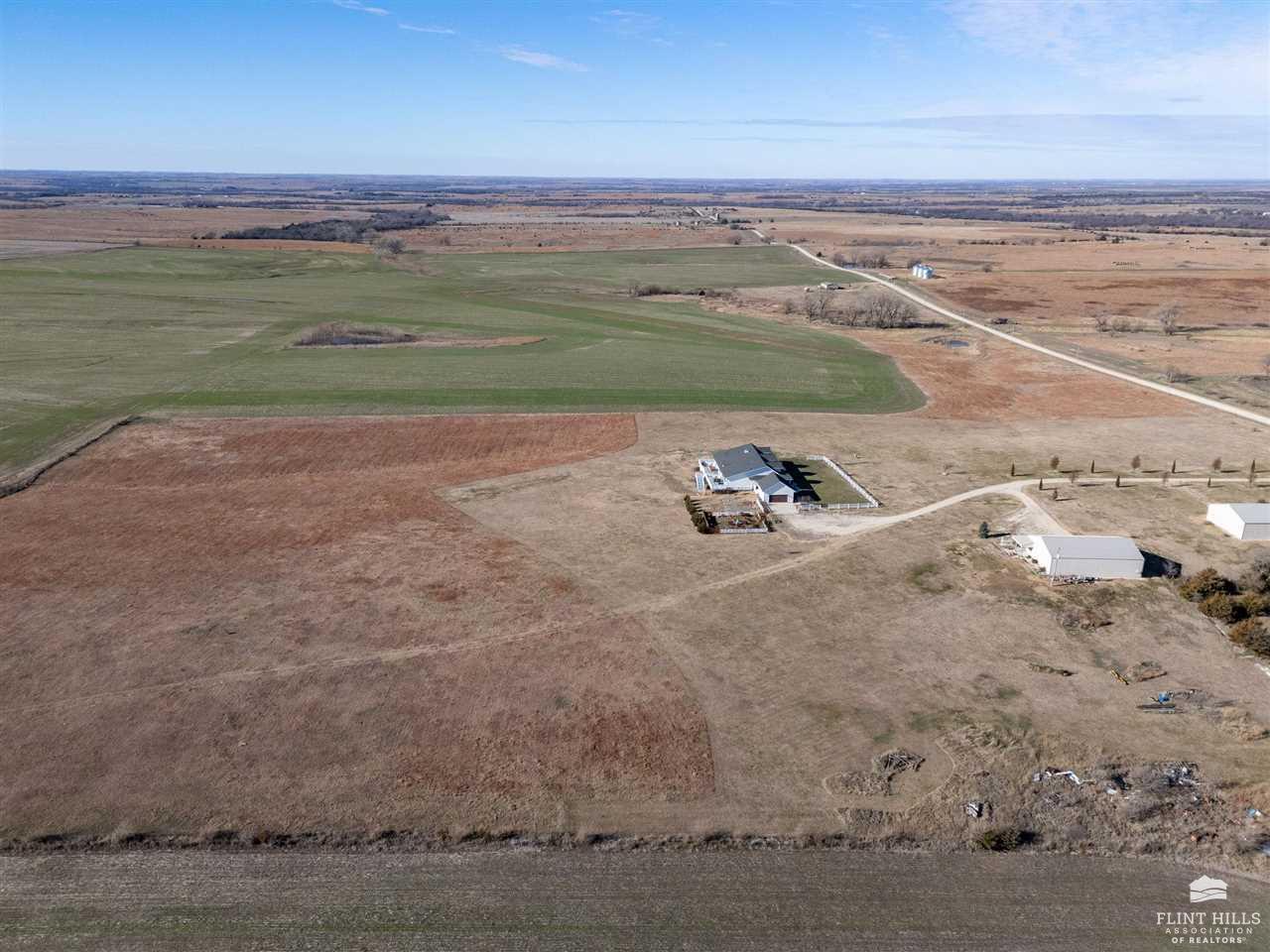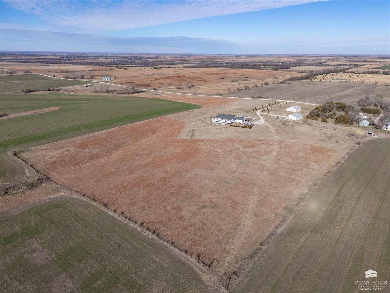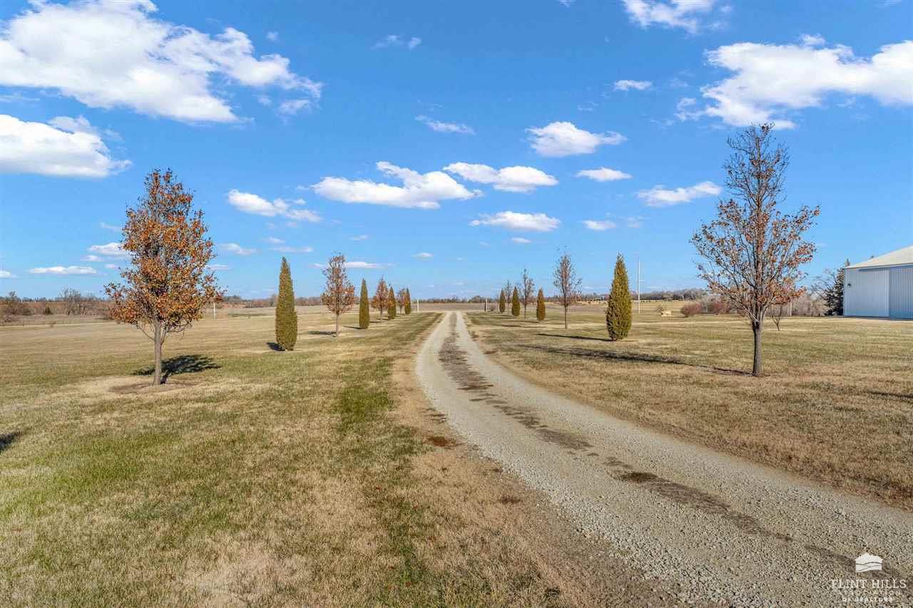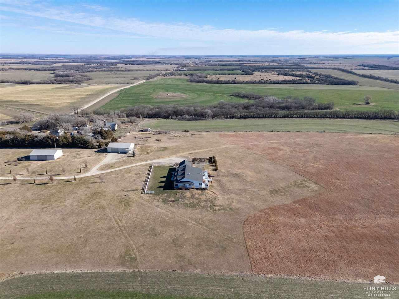 BE AWE STRUCK as you pull down the well manicured entrance to this charming countryside home nestled on 19.8 acres of serene land, featuring two 40x60 outbuildings. The inviting wrap-around porch leads you to the front entrance where you're greeted by vaulted ceilings, stunning marble floors, and an open-concept floor plan that flows seamlessly throughout the main level which is over 3000 total square feet. The spacious kitchen is complete with newer appliances, custom cabinets, gorgeous high grade granite countertops and large eat-in bar which is perfect for entertaining. The family room & primary bedroom feature elegant double sided gas fireplaces w/beautiful custom mantels. Step outside onto the back deck where you can enjoy peaceful views of the surrounding prairie land, ideal for outdoor living and relaxation. The full, unfinished basement with a walk-out to the backyard provides endless potential for additional living space or customization to suit your needs.