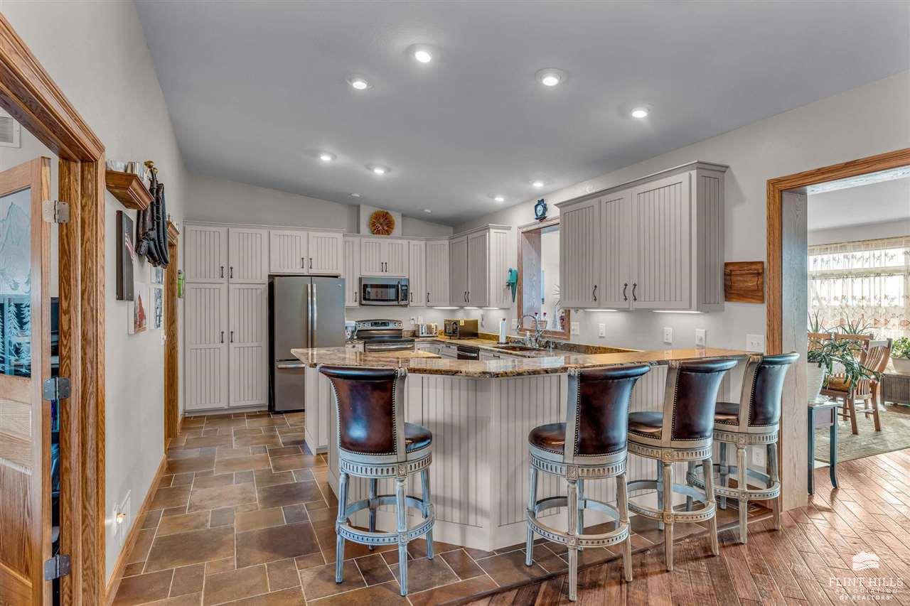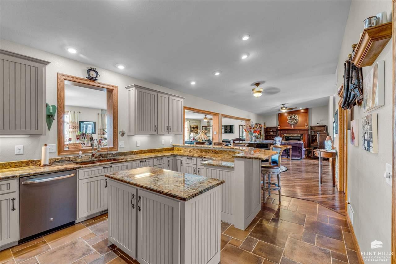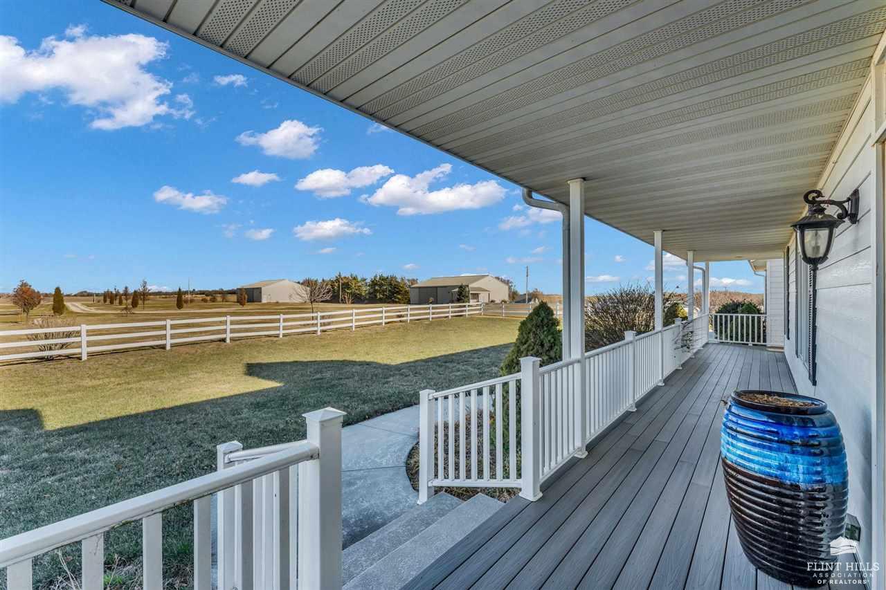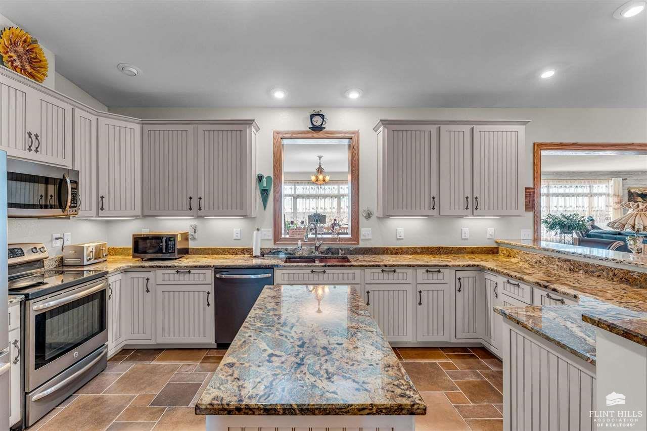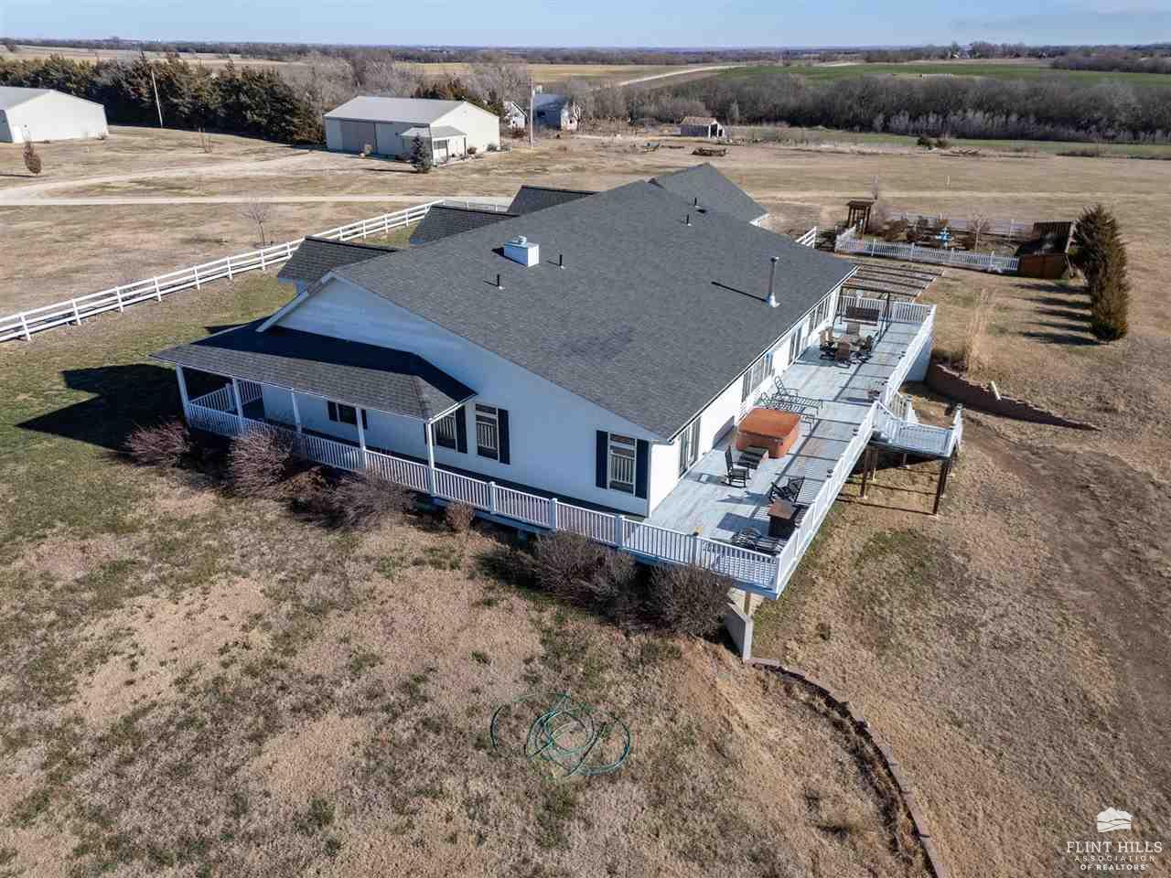 BE AWE STRUCK as you pull down the well manicured entrance to this charming countryside home nestled on 19.8 acres of serene land, featuring two 40x60 outbuildings. The inviting wrap-around porch leads you to the front entrance where you're greeted by vaulted ceilings, stunning marble floors, and an open-concept floor plan that flows seamlessly throughout the main level which is over 3000 total square feet. The spacious kitchen is complete with newer appliances, custom cabinets, gorgeous high grade granite countertops and large eat-in bar which is perfect for entertaining. The family room & primary bedroom feature elegant double sided gas fireplaces w/beautiful custom mantels. Step outside onto the back deck where you can enjoy peaceful views of the surrounding prairie land, ideal for outdoor living and relaxation. The full, unfinished basement with a walk-out to the backyard provides endless potential for additional living space or customization to suit your needs.