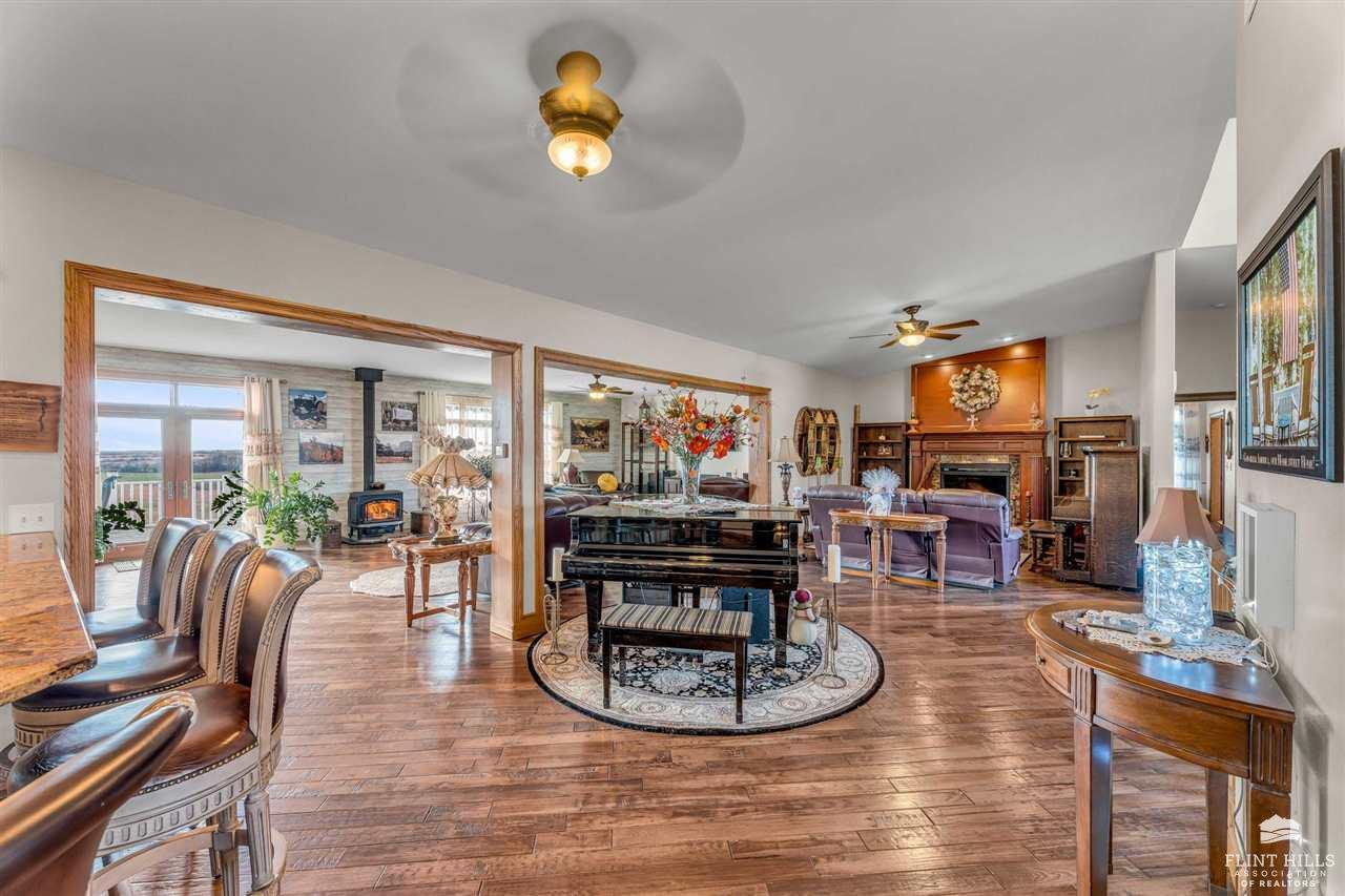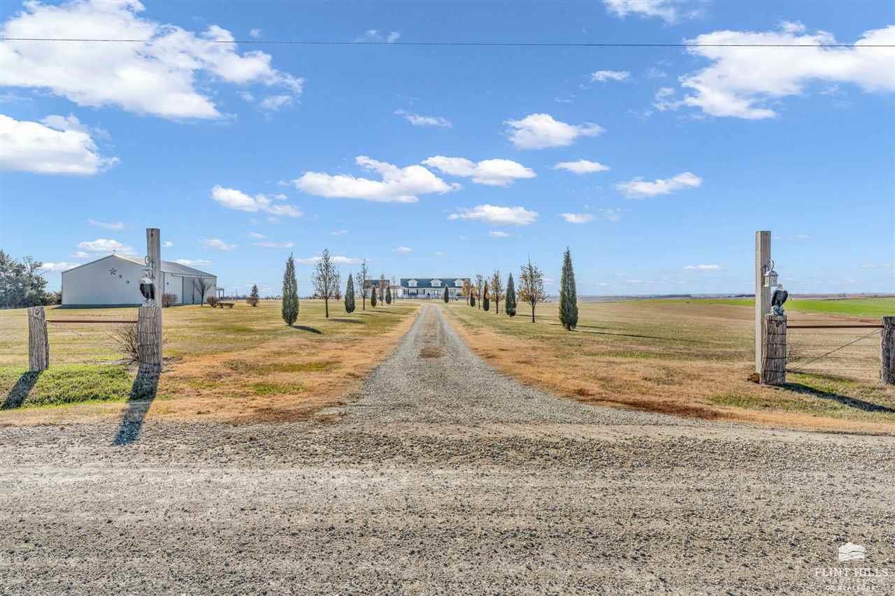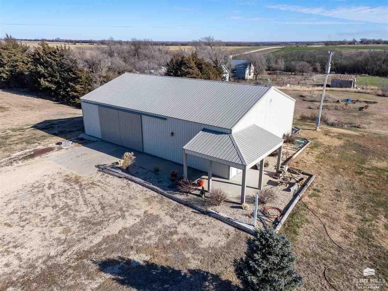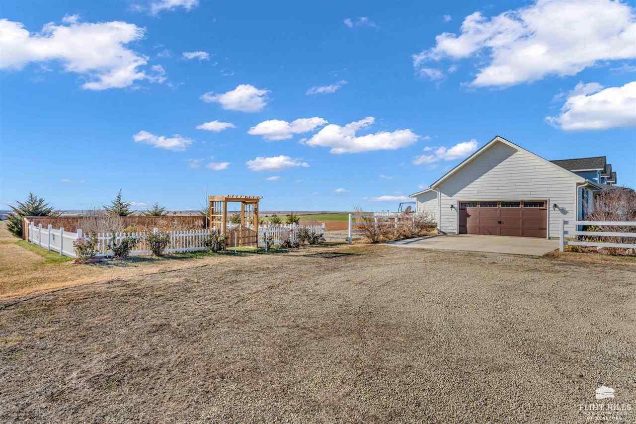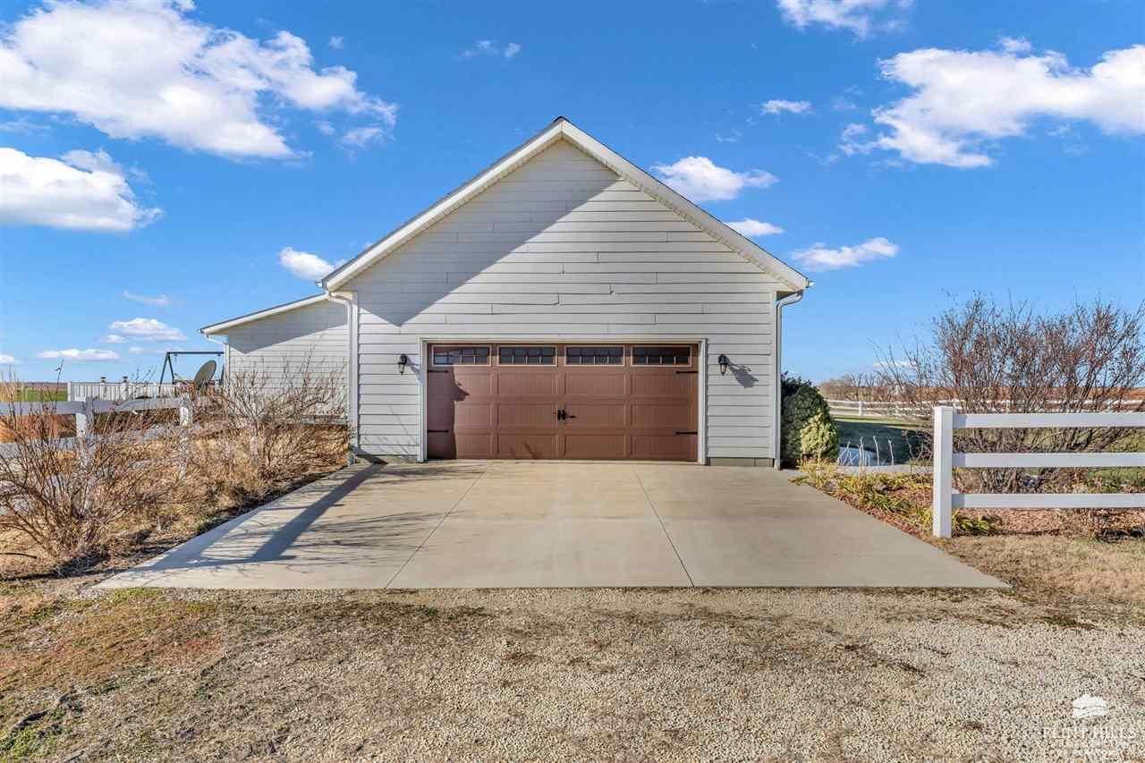 BE AWE STRUCK as you pull down the well manicured entrance to this charming countryside home nestled on 19.8 acres of serene land, featuring two 40x60 outbuildings. The inviting wrap-around porch leads you to the front entrance where you're greeted by vaulted ceilings, stunning marble floors, and an open-concept floor plan that flows seamlessly throughout the main level which is over 3000 total square feet. The spacious kitchen is complete with newer appliances, custom cabinets, gorgeous high grade granite countertops and large eat-in bar which is perfect for entertaining. The family room & primary bedroom feature elegant double sided gas fireplaces w/beautiful custom mantels. Step outside onto the back deck where you can enjoy peaceful views of the surrounding prairie land, ideal for outdoor living and relaxation. The full, unfinished basement with a walk-out to the backyard provides endless potential for additional living space or customization to suit your needs.