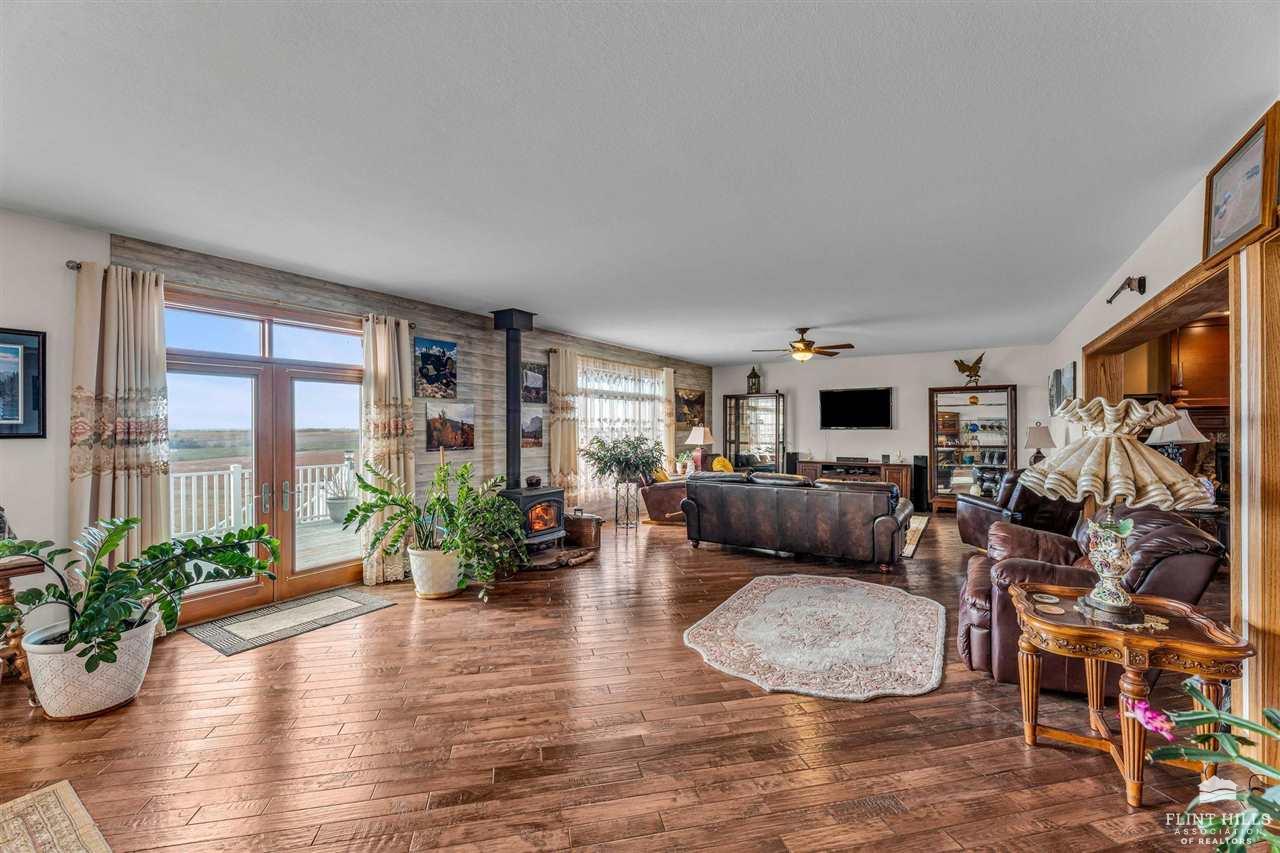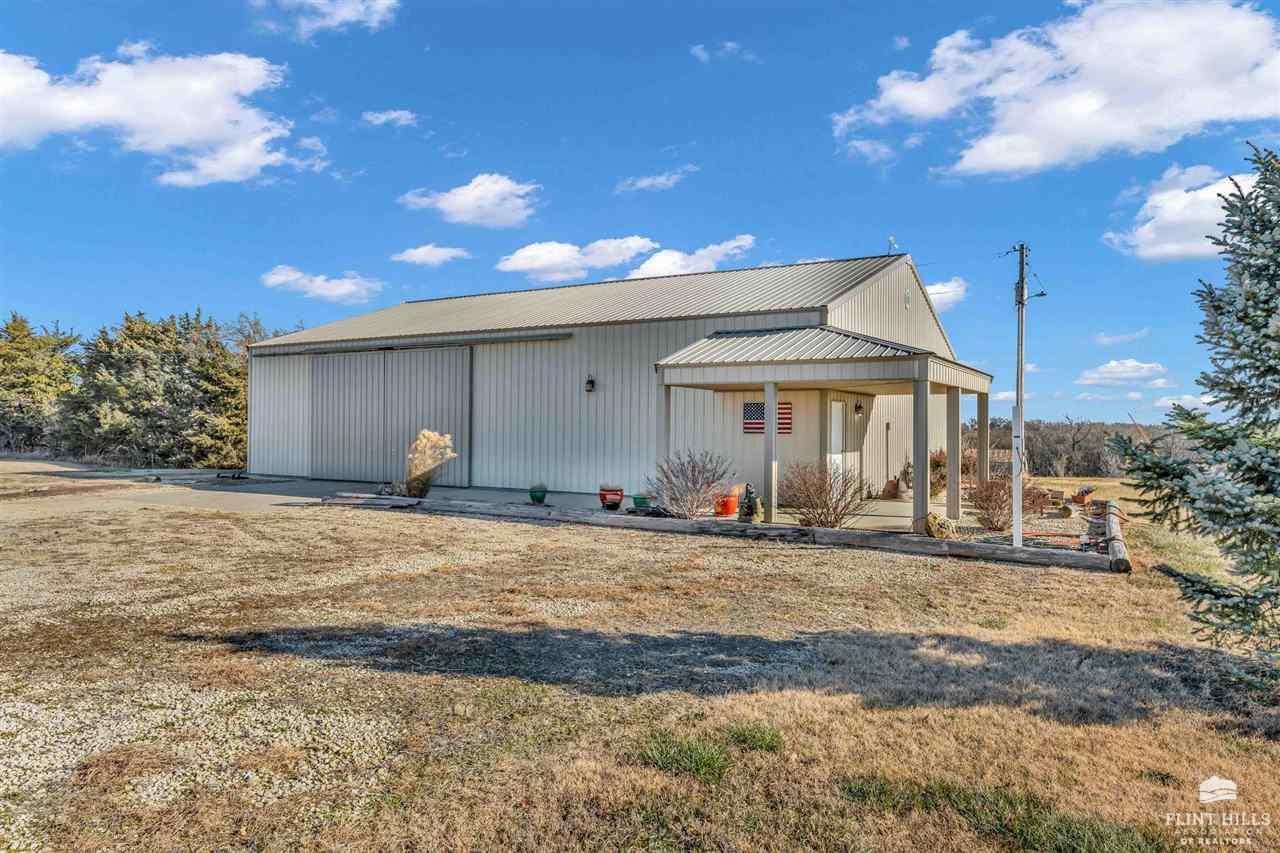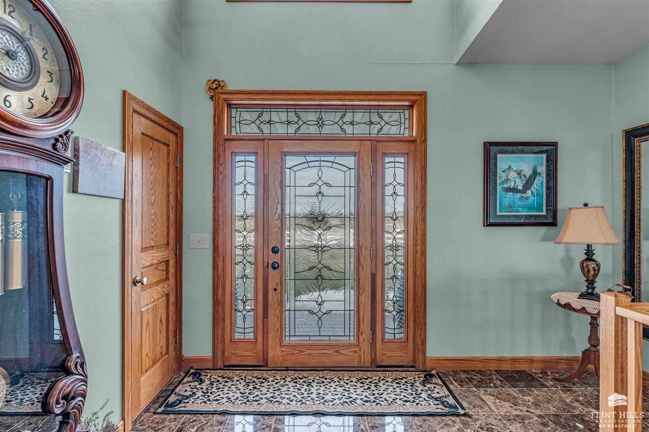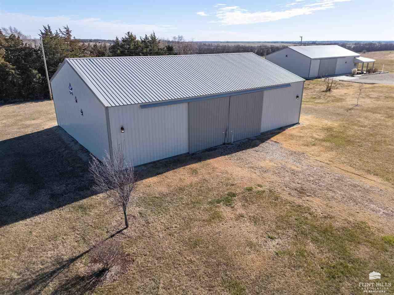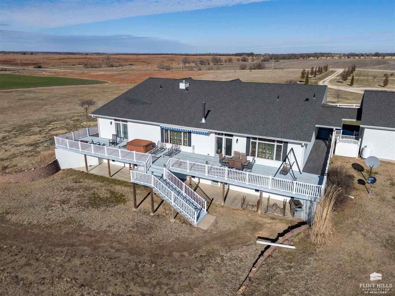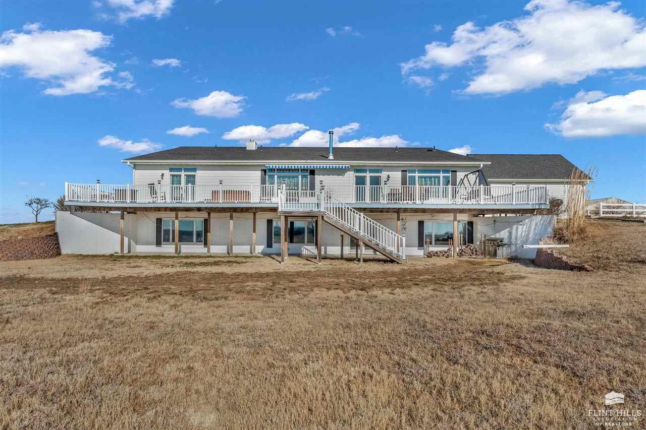BE AWE STRUCK as you pull down the well manicured entrance to this charming countryside home nestled on 19.8 acres of serene land, featuring two 40x60 outbuildings. The inviting wrap-around porch leads you to the front entrance where you're greeted by vaulted ceilings, stunning marble floors, and an open-concept floor plan that flows seamlessly throughout the main level which is over 3000 total square feet. The spacious kitchen is complete with newer appliances, custom cabinets, gorgeous high grade granite countertops and large eat-in bar which is perfect for entertaining. The family room & primary bedroom feature elegant double sided gas fireplaces w/beautiful custom mantels. Step outside onto the back deck where you can enjoy peaceful views of the surrounding prairie land, ideal for outdoor living and relaxation. The full, unfinished basement with a walk-out to the backyard provides endless potential for additional living space or customization to suit your needs.