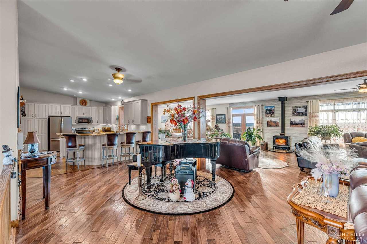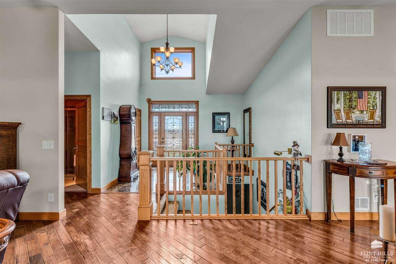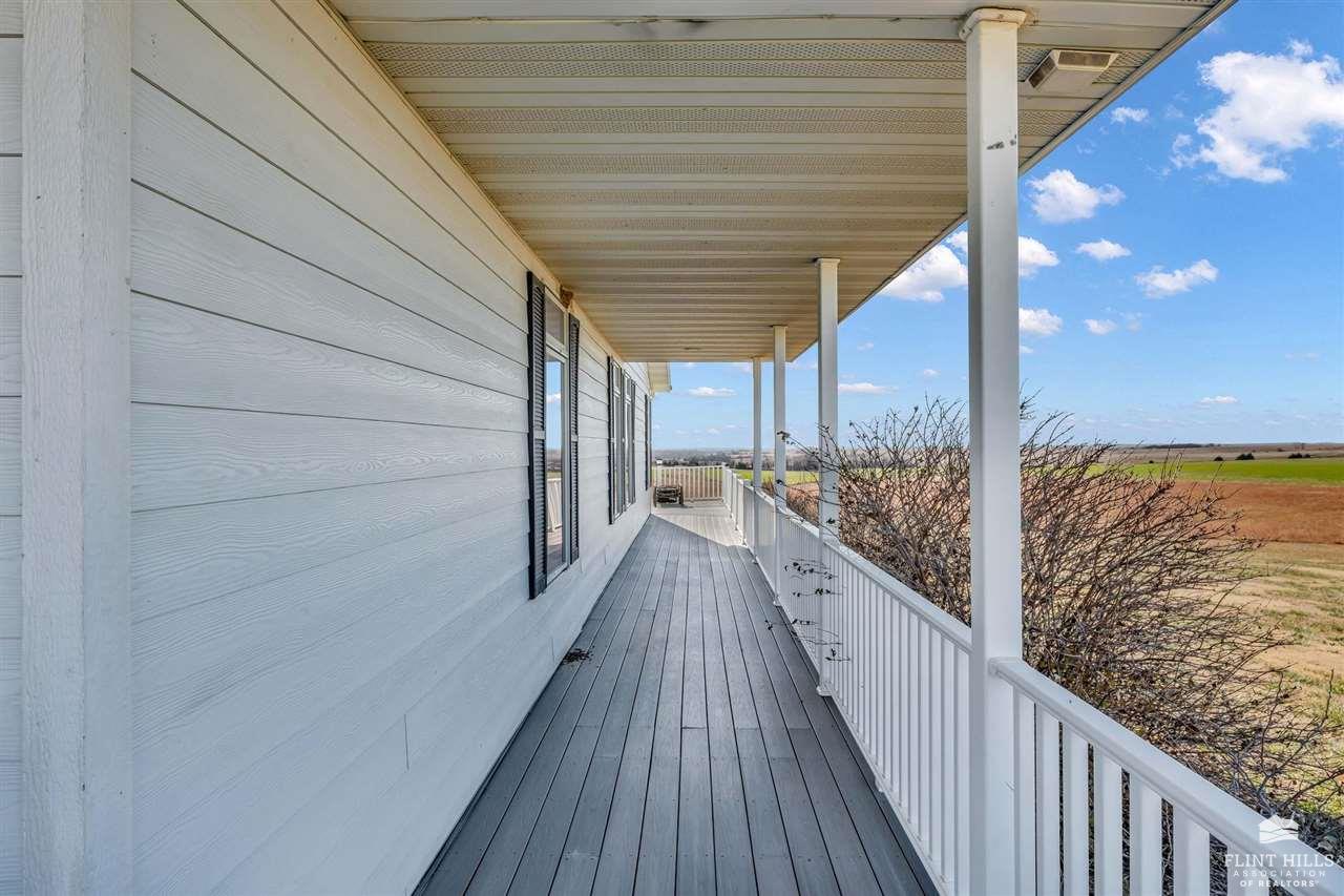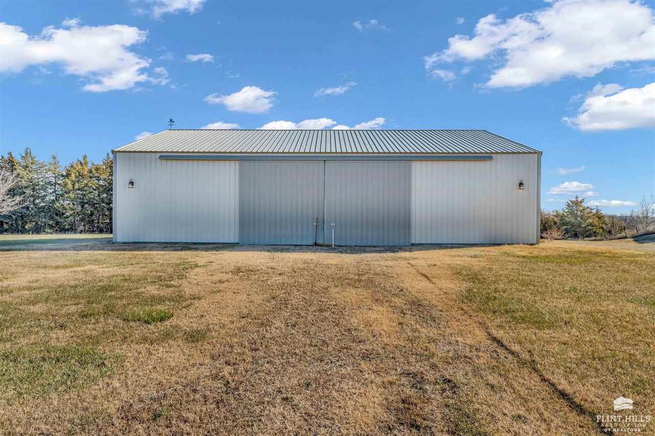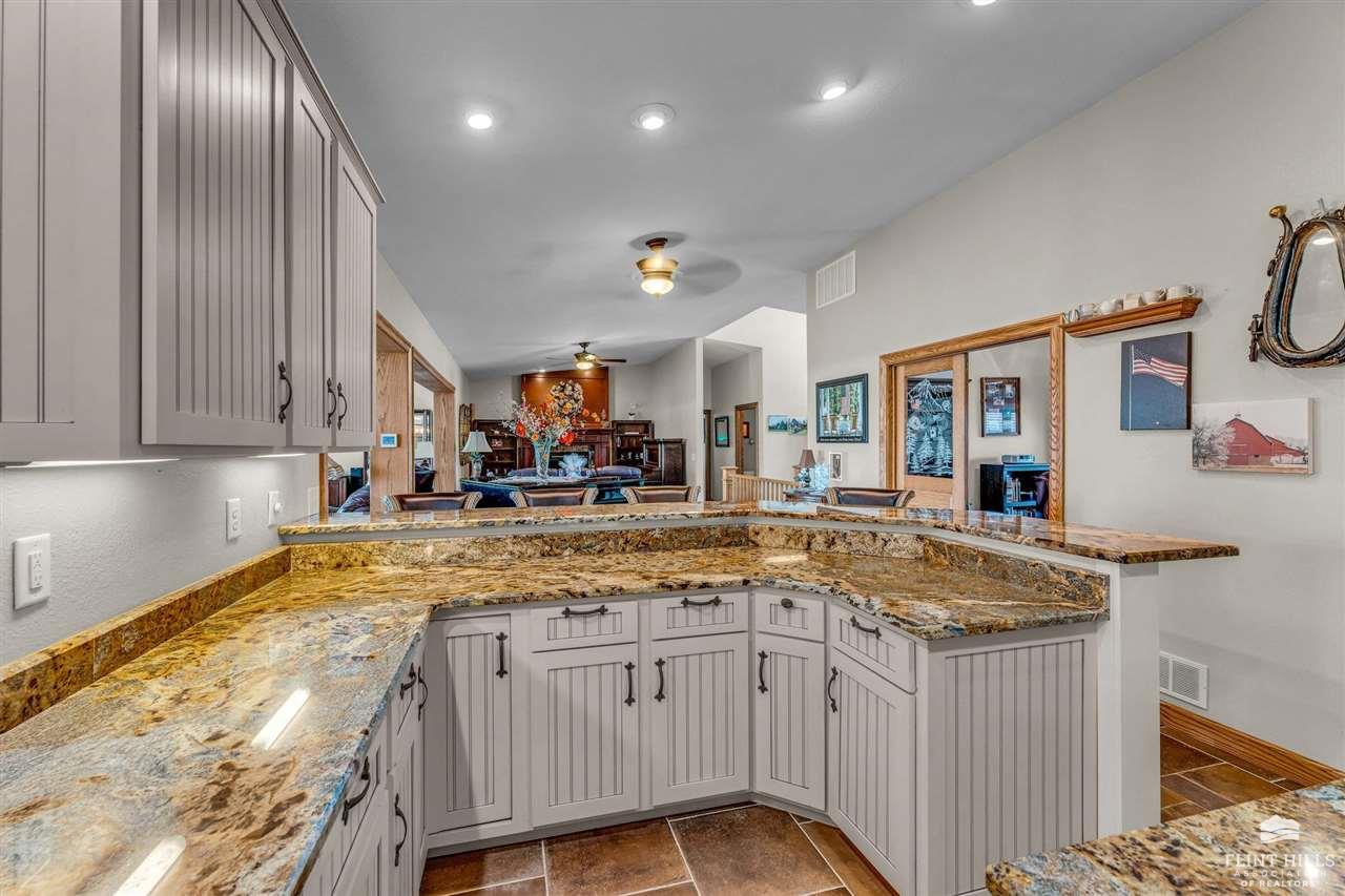 BE AWE STRUCK as you pull down the well manicured entrance to this charming countryside home nestled on 19.8 acres of serene land, featuring two 40x60 outbuildings. The inviting wrap-around porch leads you to the front entrance where you're greeted by vaulted ceilings, stunning marble floors, and an open-concept floor plan that flows seamlessly throughout the main level which is over 3000 total square feet. The spacious kitchen is complete with newer appliances, custom cabinets, gorgeous high grade granite countertops and large eat-in bar which is perfect for entertaining. The family room & primary bedroom feature elegant double sided gas fireplaces w/beautiful custom mantels. Step outside onto the back deck where you can enjoy peaceful views of the surrounding prairie land, ideal for outdoor living and relaxation. The full, unfinished basement with a walk-out to the backyard provides endless potential for additional living space or customization to suit your needs.