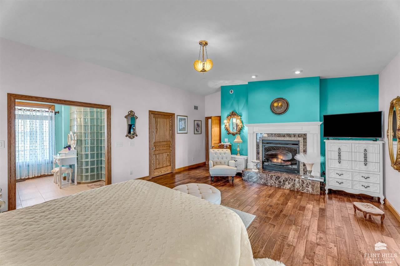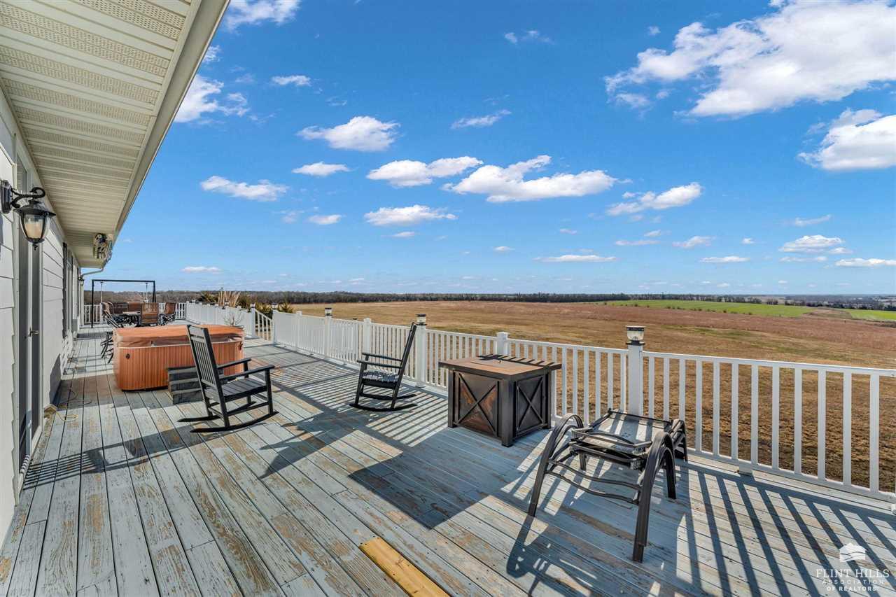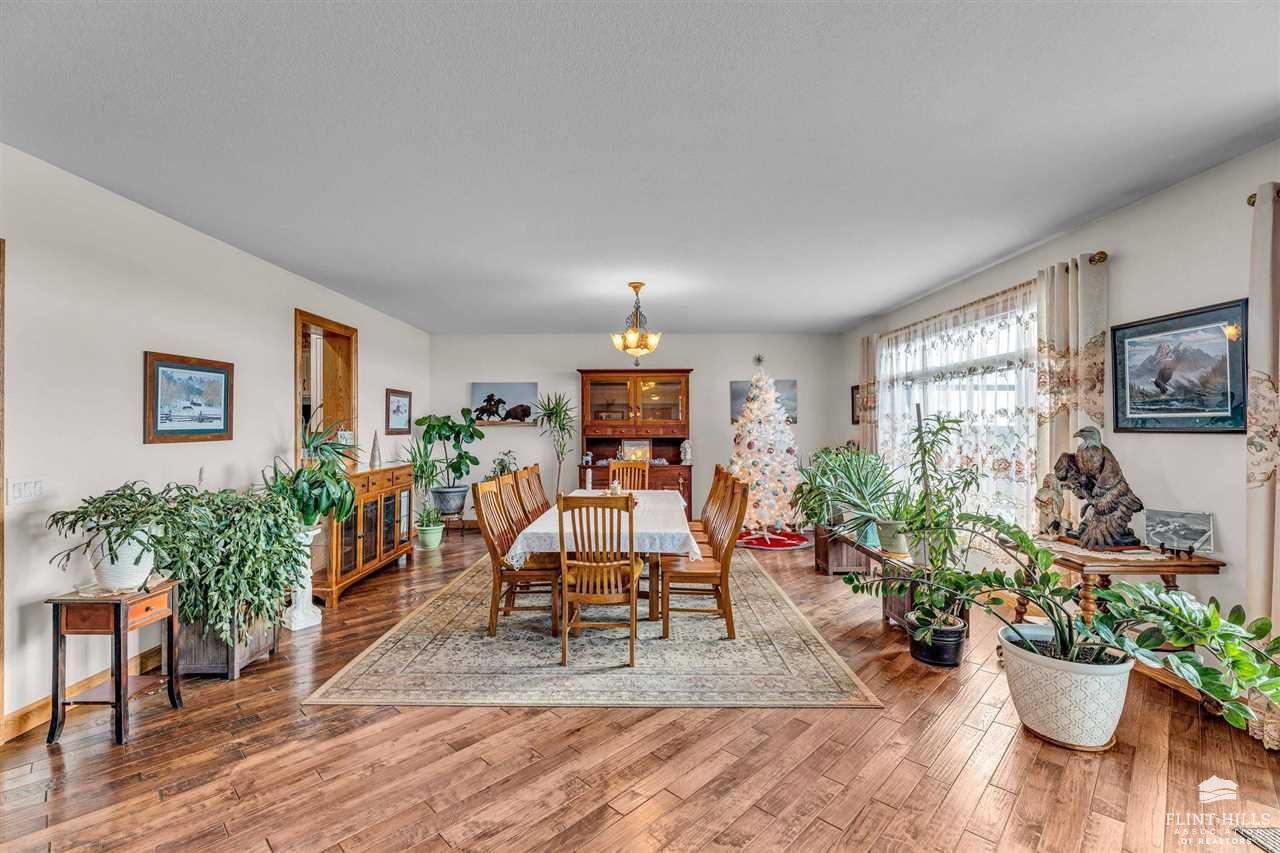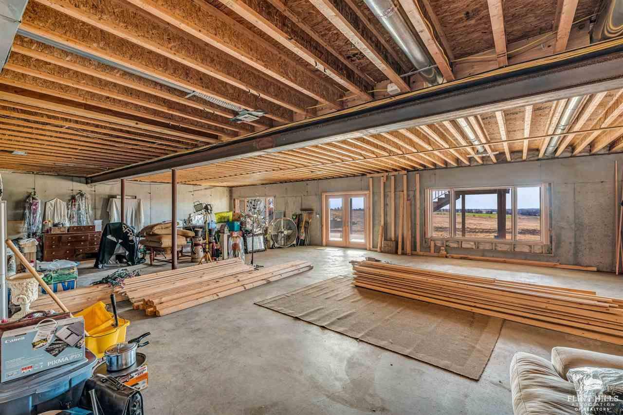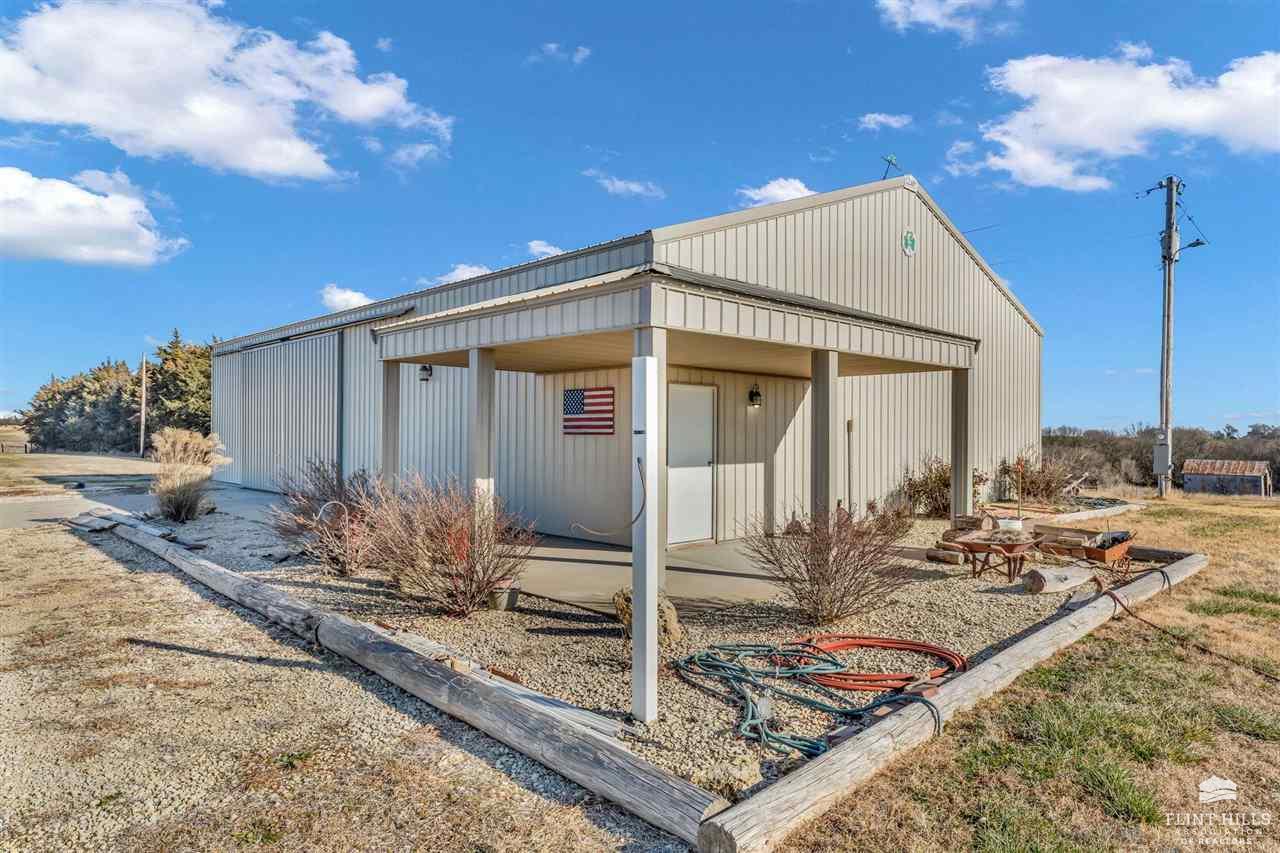 BE AWE STRUCK as you pull down the well manicured entrance to this charming countryside home nestled on 19.8 acres of serene land, featuring two 40x60 outbuildings. The inviting wrap-around porch leads you to the front entrance where you're greeted by vaulted ceilings, stunning marble floors, and an open-concept floor plan that flows seamlessly throughout the main level which is over 3000 total square feet. The spacious kitchen is complete with newer appliances, custom cabinets, gorgeous high grade granite countertops and large eat-in bar which is perfect for entertaining. The family room & primary bedroom feature elegant double sided gas fireplaces w/beautiful custom mantels. Step outside onto the back deck where you can enjoy peaceful views of the surrounding prairie land, ideal for outdoor living and relaxation. The full, unfinished basement with a walk-out to the backyard provides endless potential for additional living space or customization to suit your needs.