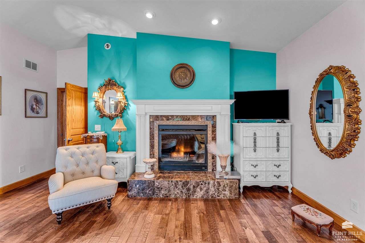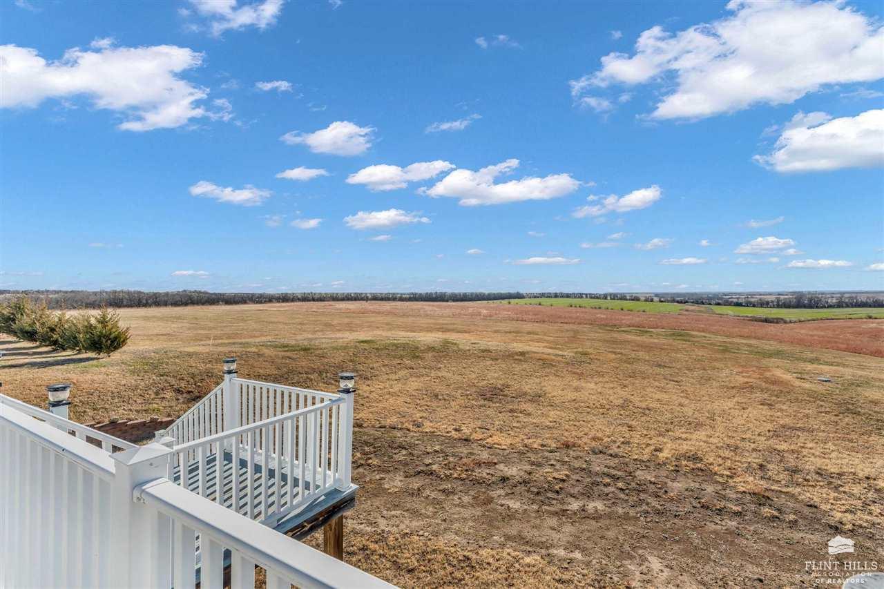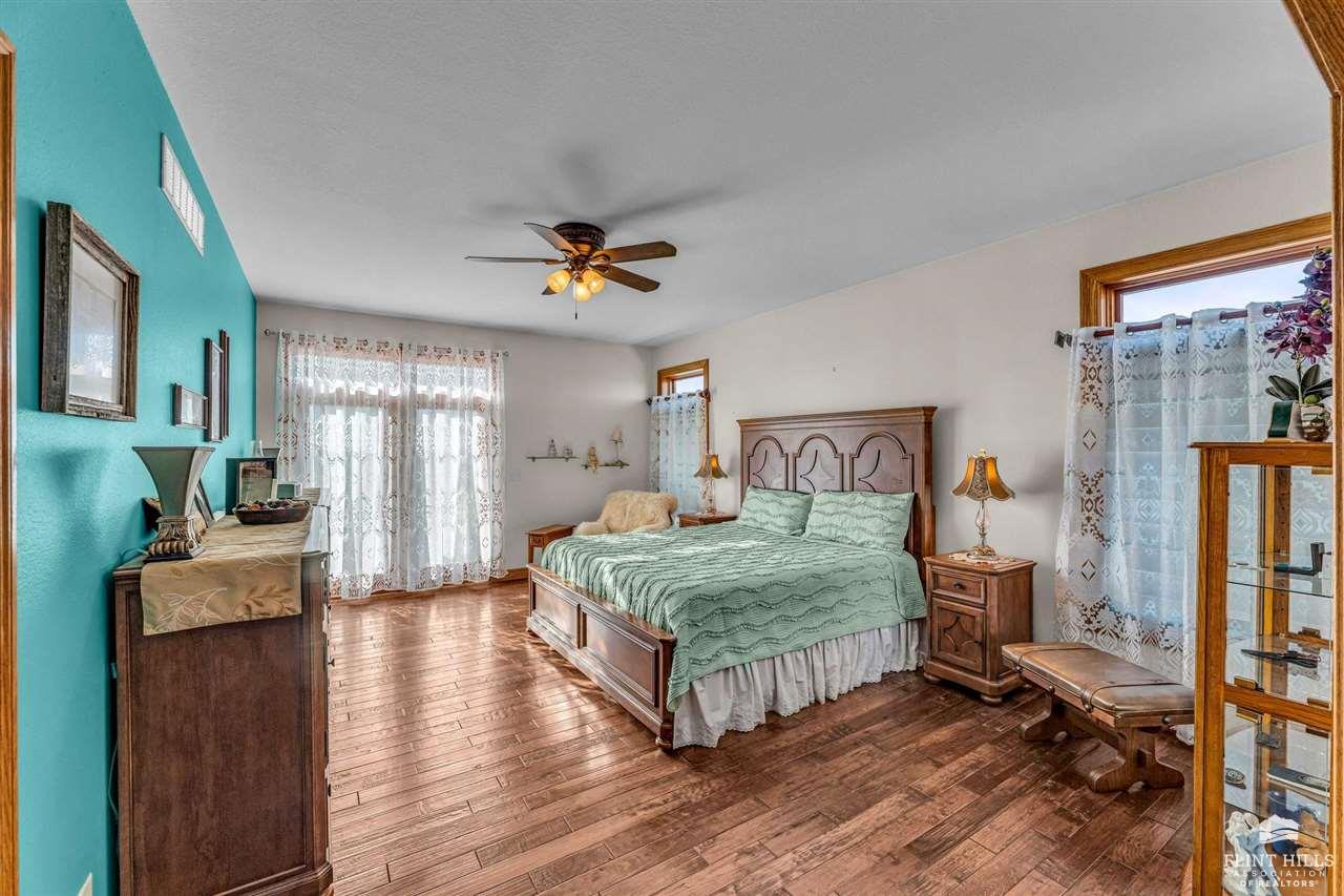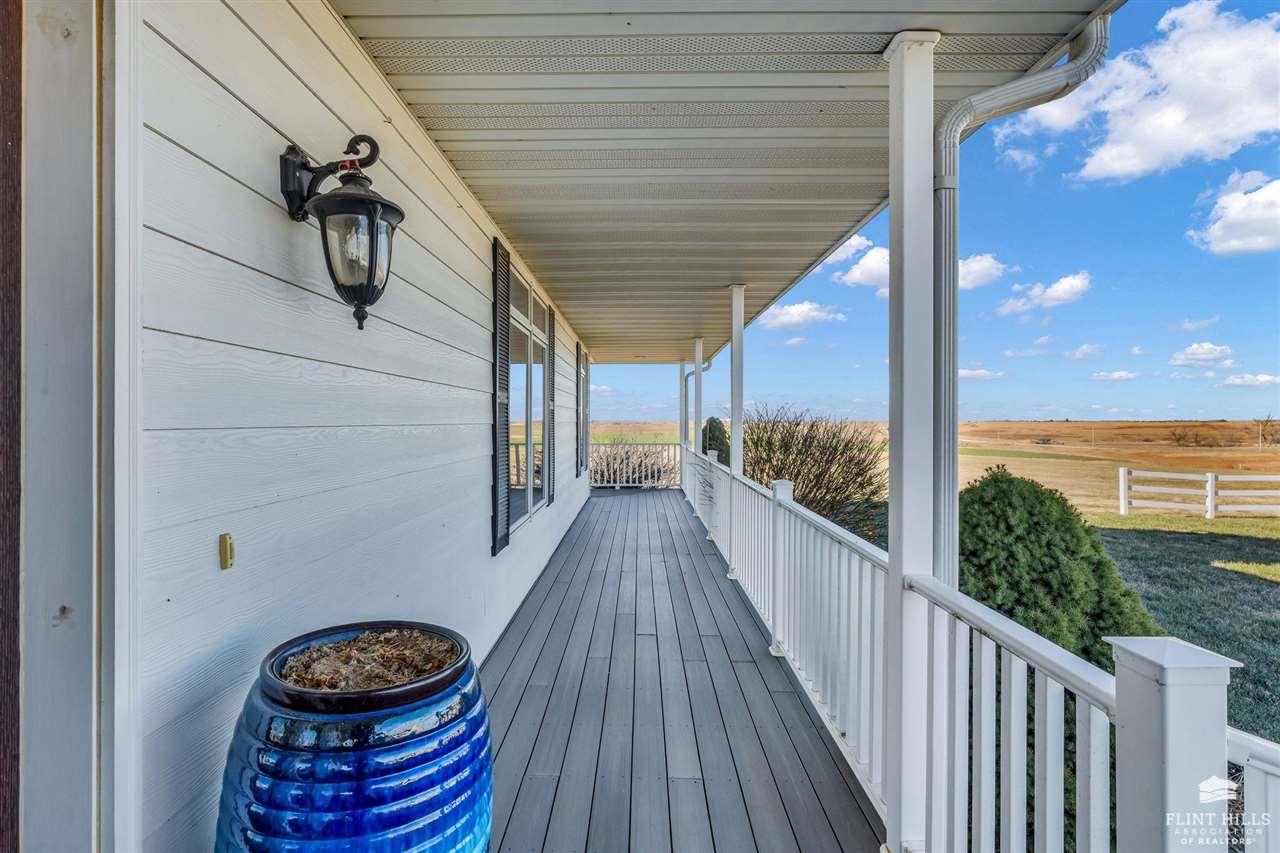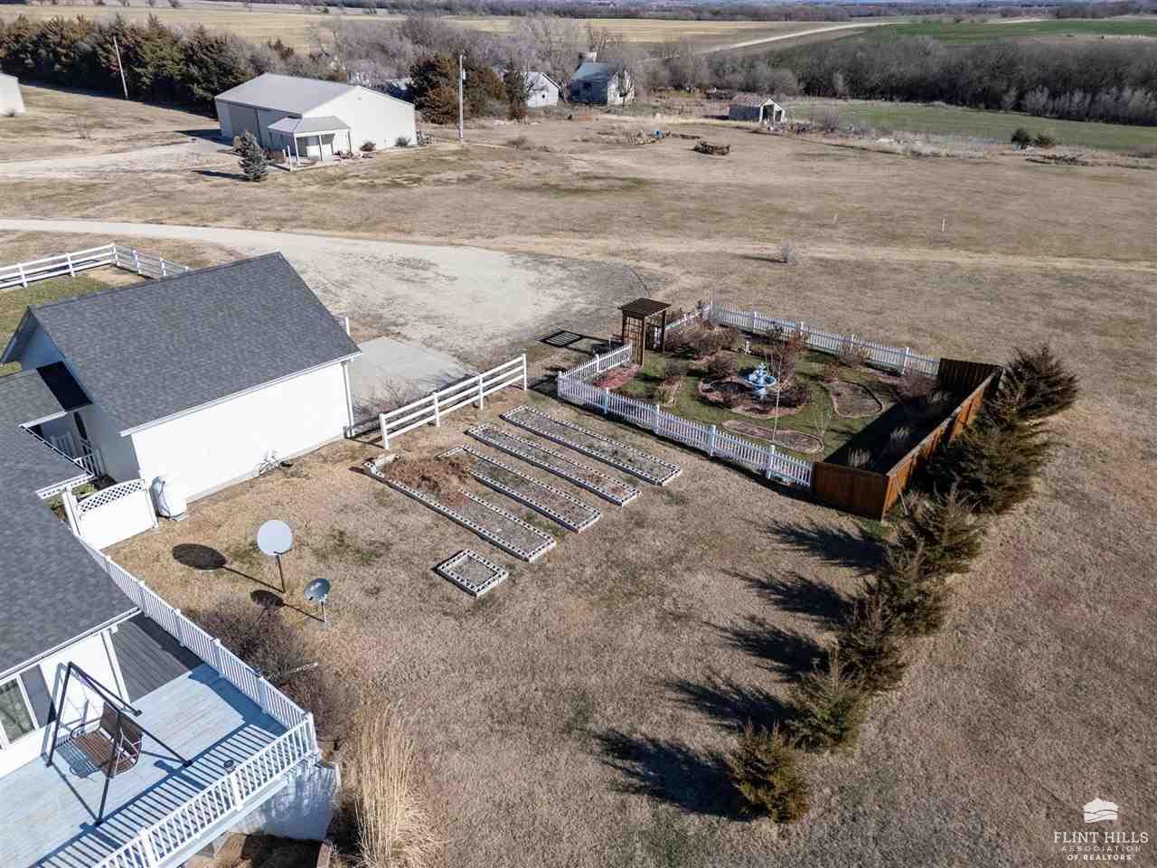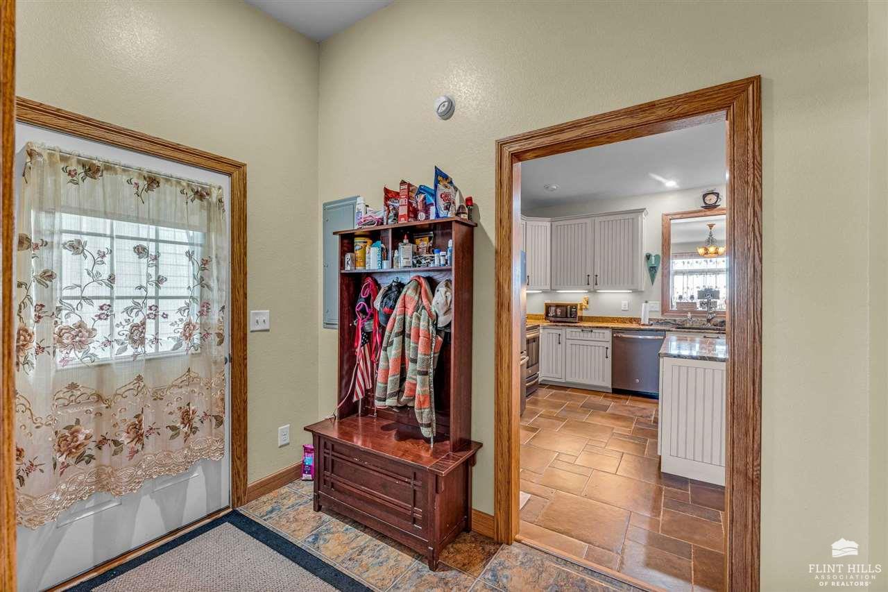 BE AWE STRUCK as you pull down the well manicured entrance to this charming countryside home nestled on 19.8 acres of serene land, featuring two 40x60 outbuildings. The inviting wrap-around porch leads you to the front entrance where you're greeted by vaulted ceilings, stunning marble floors, and an open-concept floor plan that flows seamlessly throughout the main level which is over 3000 total square feet. The spacious kitchen is complete with newer appliances, custom cabinets, gorgeous high grade granite countertops and large eat-in bar which is perfect for entertaining. The family room & primary bedroom feature elegant double sided gas fireplaces w/beautiful custom mantels. Step outside onto the back deck where you can enjoy peaceful views of the surrounding prairie land, ideal for outdoor living and relaxation. The full, unfinished basement with a walk-out to the backyard provides endless potential for additional living space or customization to suit your needs.
