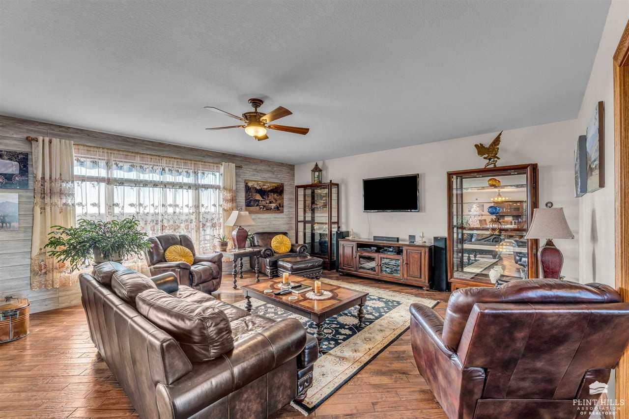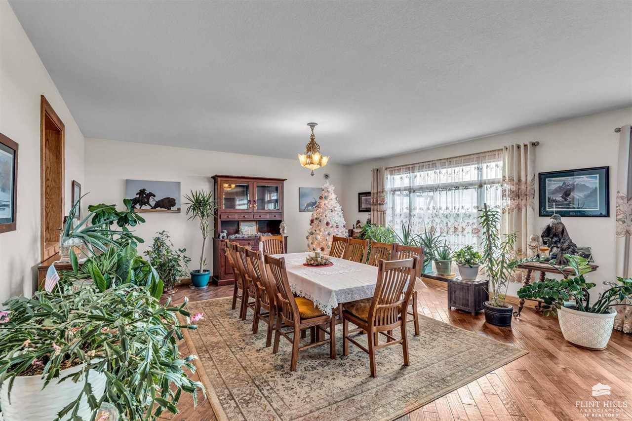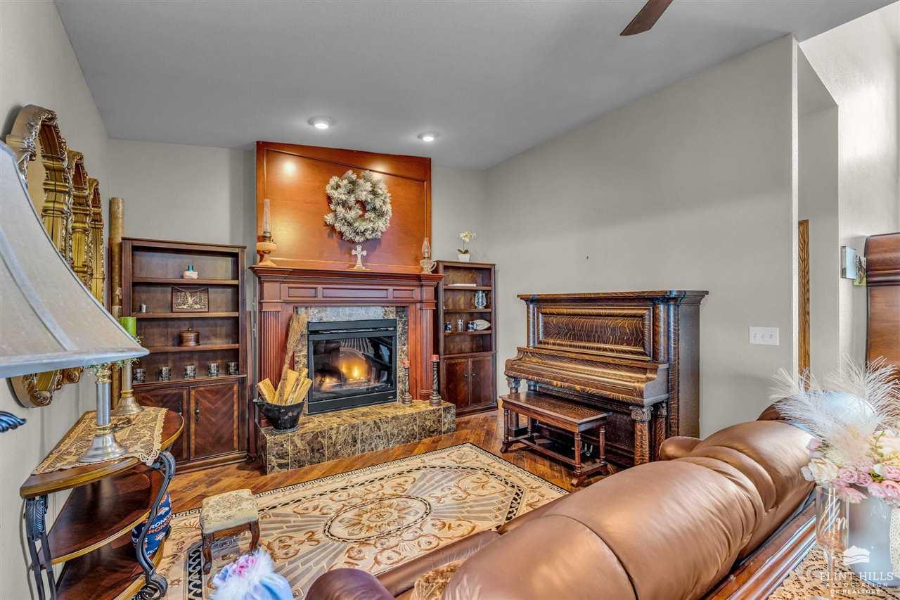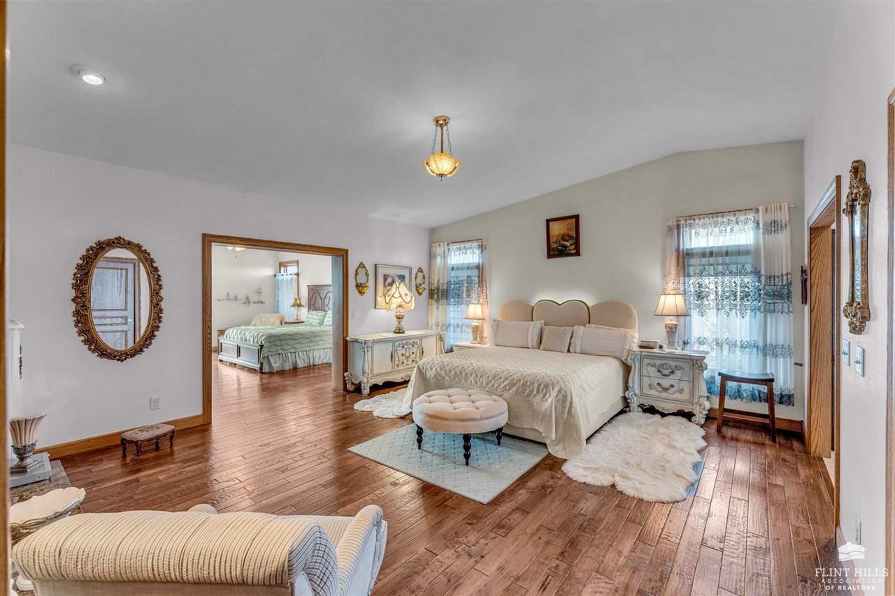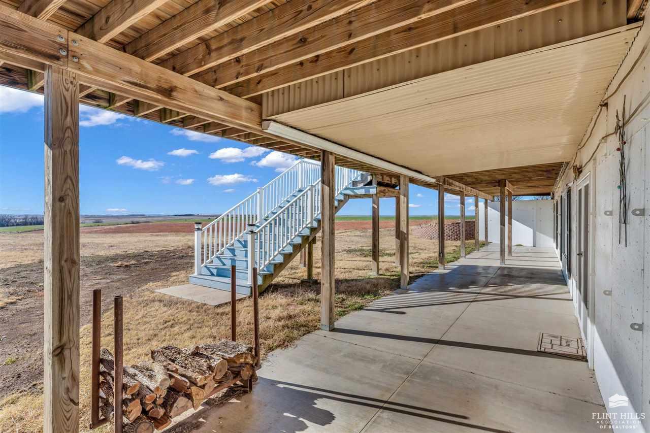 BE AWE STRUCK as you pull down the well manicured entrance to this charming countryside home nestled on 19.8 acres of serene land, featuring two 40x60 outbuildings. The inviting wrap-around porch leads you to the front entrance where you're greeted by vaulted ceilings, stunning marble floors, and an open-concept floor plan that flows seamlessly throughout the main level which is over 3000 total square feet. The spacious kitchen is complete with newer appliances, custom cabinets, gorgeous high grade granite countertops and large eat-in bar which is perfect for entertaining. The family room & primary bedroom feature elegant double sided gas fireplaces w/beautiful custom mantels. Step outside onto the back deck where you can enjoy peaceful views of the surrounding prairie land, ideal for outdoor living and relaxation. The full, unfinished basement with a walk-out to the backyard provides endless potential for additional living space or customization to suit your needs.