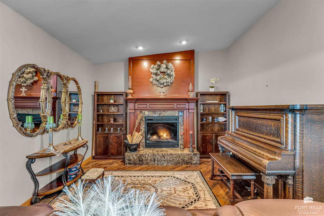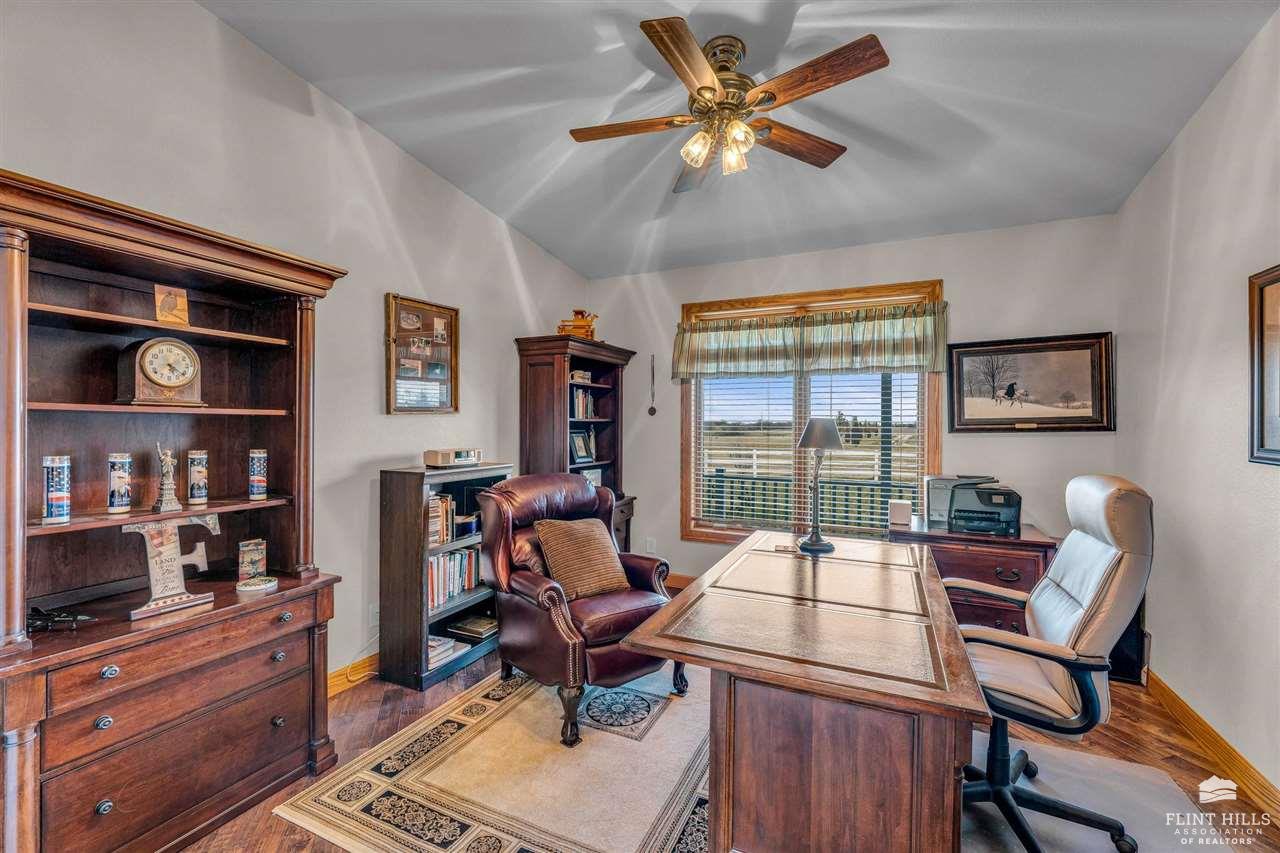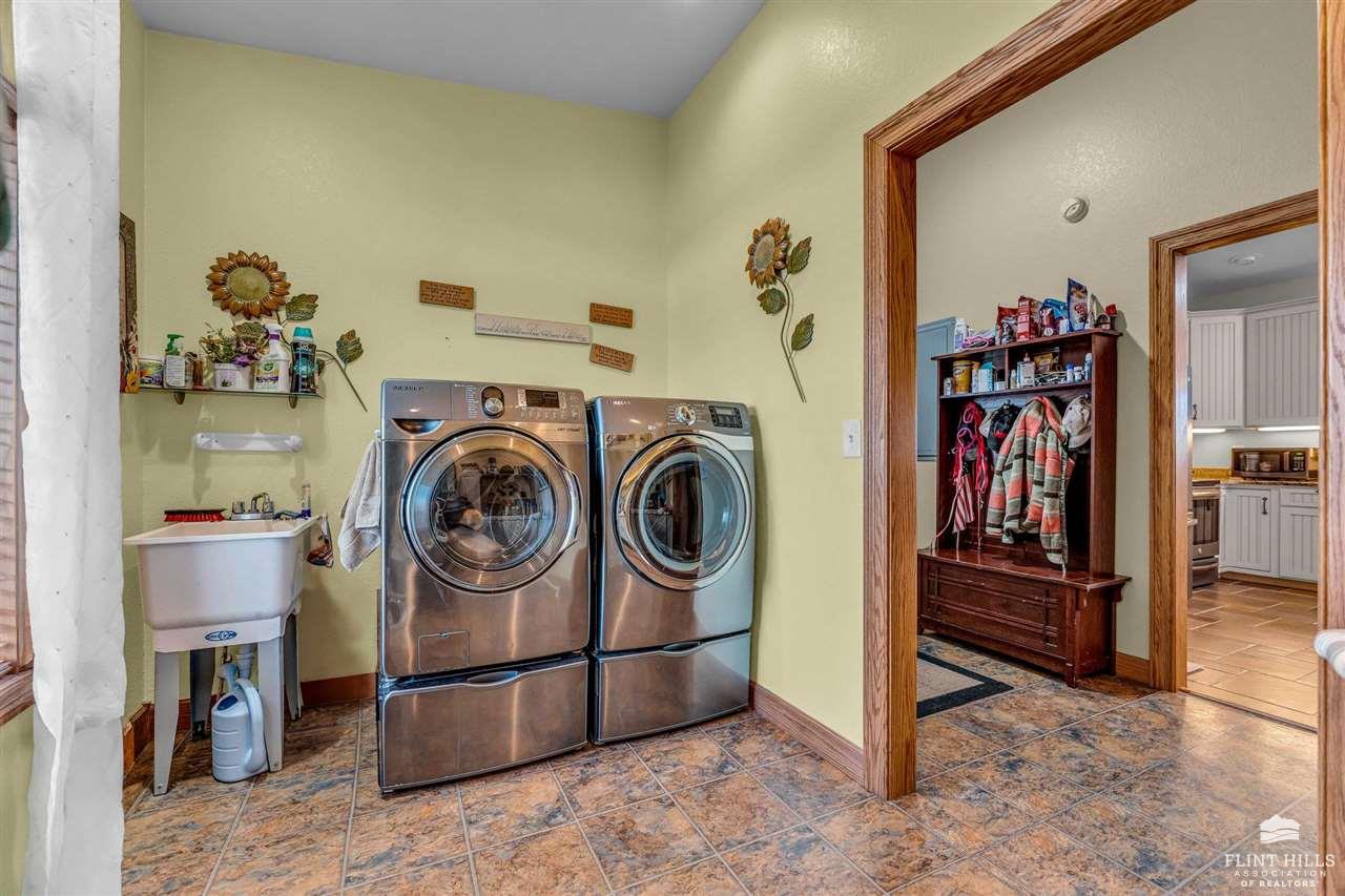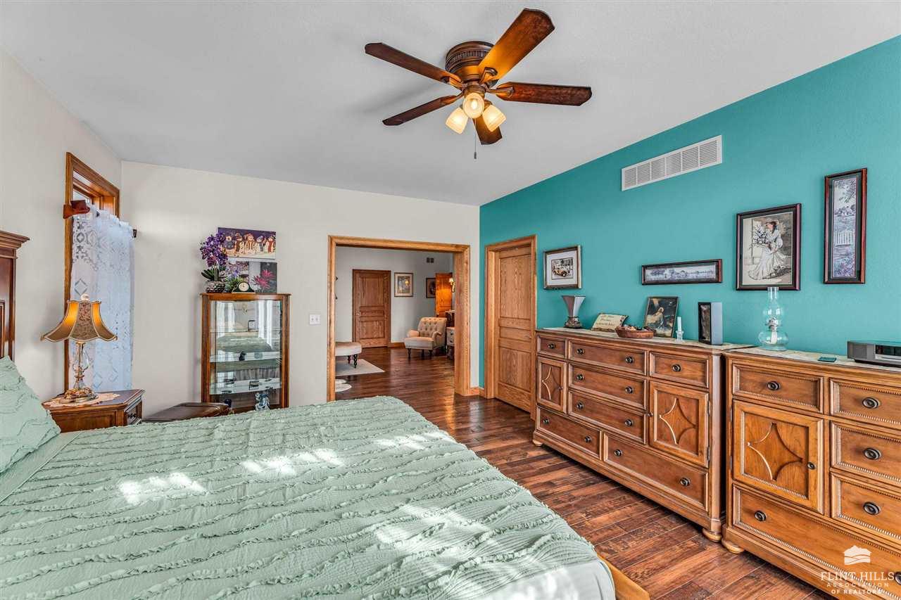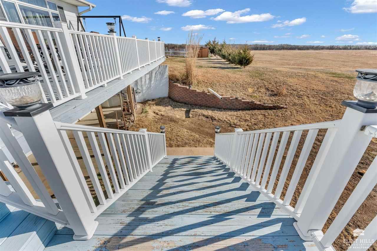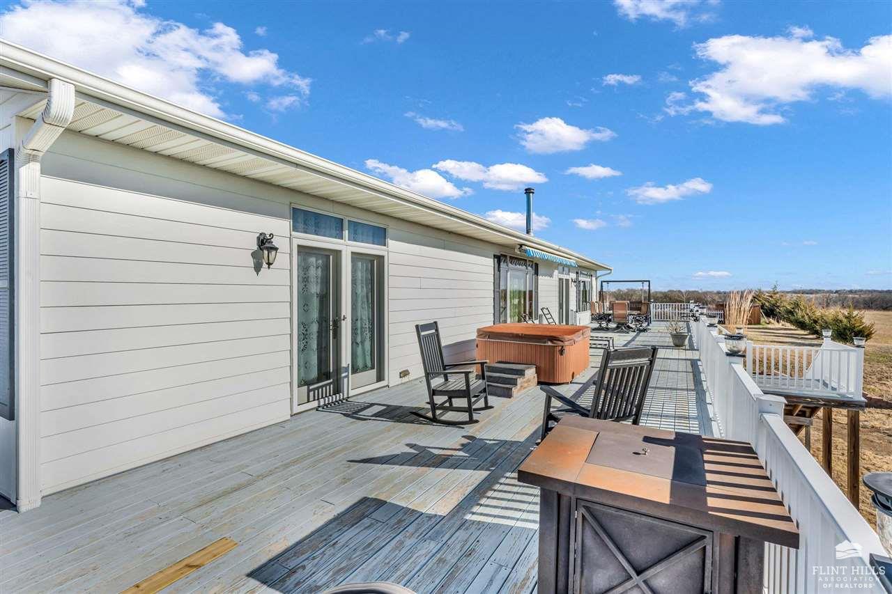 BE AWE STRUCK as you pull down the well manicured entrance to this charming countryside home nestled on 19.8 acres of serene land, featuring two 40x60 outbuildings. The inviting wrap-around porch leads you to the front entrance where you're greeted by vaulted ceilings, stunning marble floors, and an open-concept floor plan that flows seamlessly throughout the main level which is over 3000 total square feet. The spacious kitchen is complete with newer appliances, custom cabinets, gorgeous high grade granite countertops and large eat-in bar which is perfect for entertaining. The family room & primary bedroom feature elegant double sided gas fireplaces w/beautiful custom mantels. Step outside onto the back deck where you can enjoy peaceful views of the surrounding prairie land, ideal for outdoor living and relaxation. The full, unfinished basement with a walk-out to the backyard provides endless potential for additional living space or customization to suit your needs.