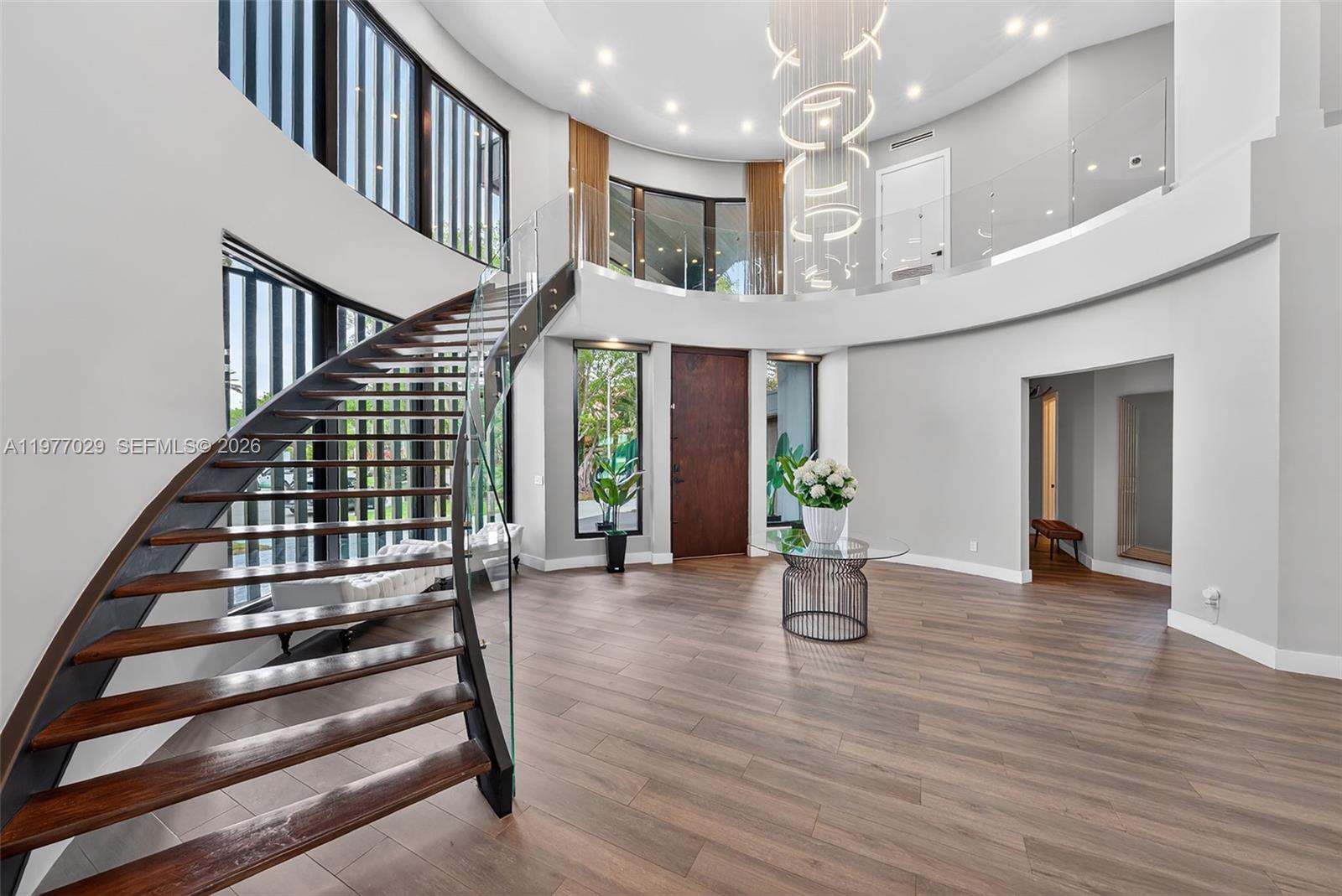Rare offering in Windmill Ranch Estates featuring one of the largest waterfront cul-de-sac point lots currently available in the community. This exceptional property sits on a private 44,219 SF acre-plus lot with water views on both sides and remarkable privacy. The unique contemporary residence offers 5 bedrooms, 5.5 bathrooms, and a private office that can easily serve as a sixth bedroom. The home showcases dramatic 28-foot ceilings, expansive glass walls, and a striking architectural design filled with natural light. Architectural highlights include a spectacular two-story library with a spiral staircase, a grand sweeping staircase, spacious living areas, and a gourmet kitchen with quartz countertops and stainless steel appliances. The primary suite features dual bathrooms and oversized walk-in closets. Outdoor spaces include a pool, multiple terraces, and a summer kitchen, ideal for entertaining while enjoying beautiful sunset and water views.