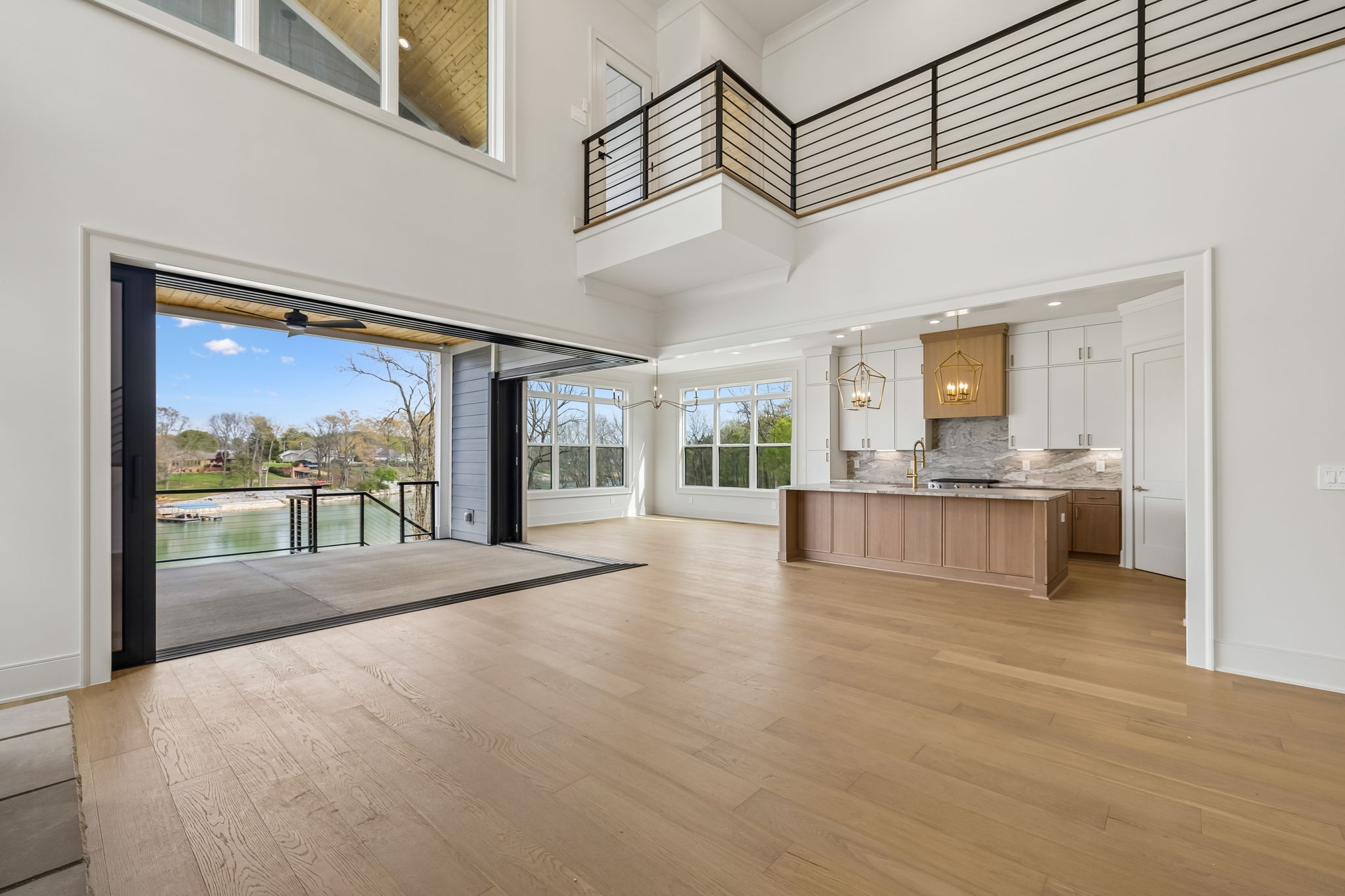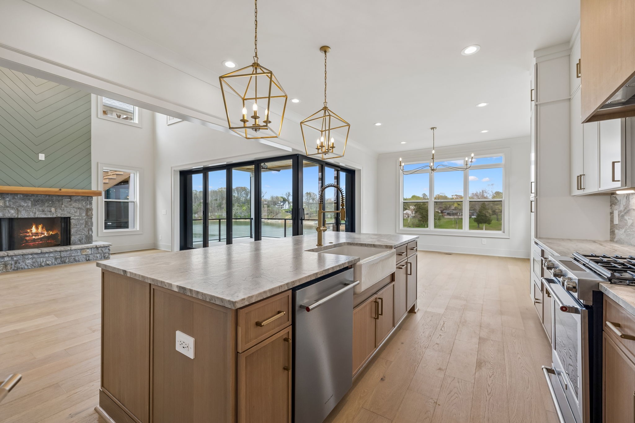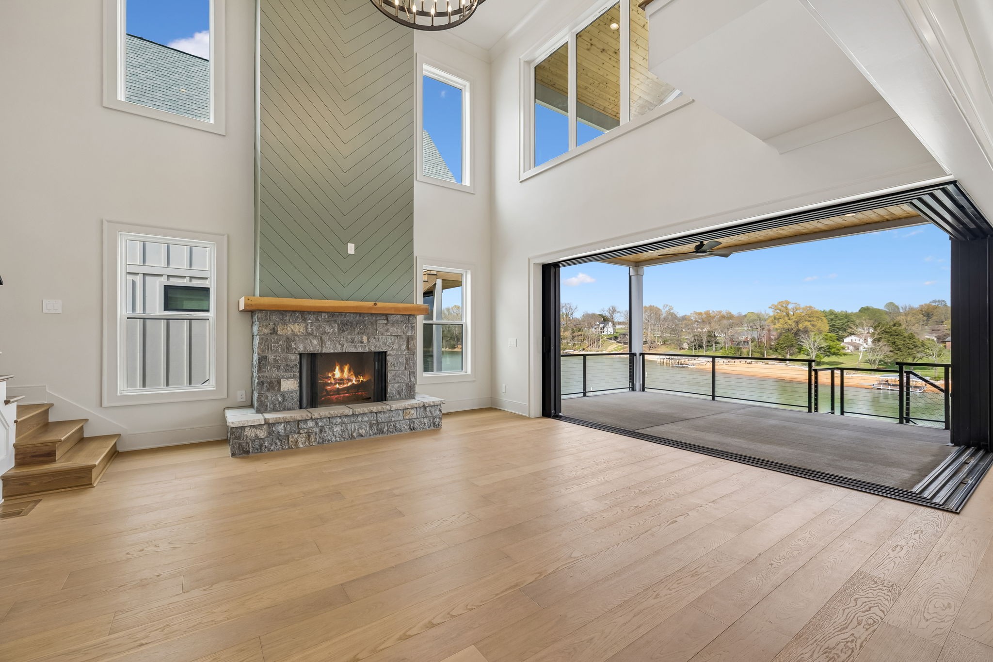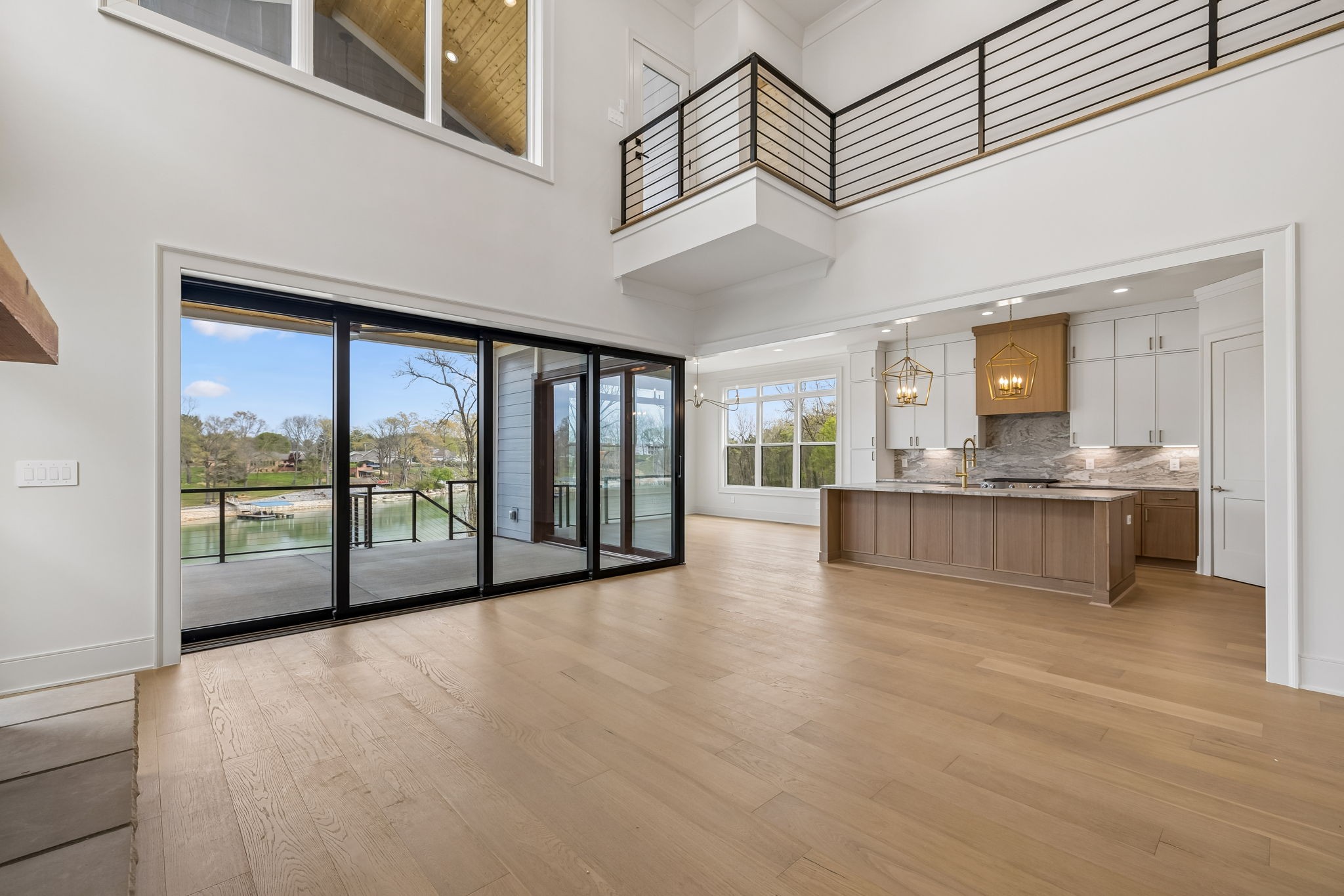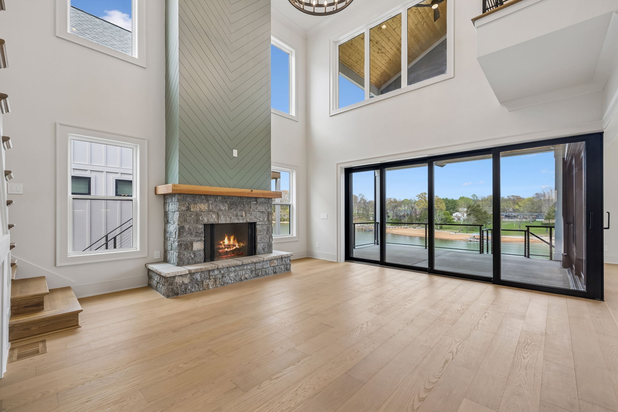 The main level features 10’ ceilings, 8’ solid-core doors, and a dramatic 21’ vaulted family room with a floor-to-ceiling natural stone fireplace. Pocketing glass sliders open to a covered porch with stunning lake views. The kitchen includes custom Tiger cabinetry to the ceiling with soft-close doors and drawers, pull-out shelving, and KitchenAid Professional appliances. Wide-plank white oak hardwood flooring runs throughout. A spacious mudroom offers additional cabinetry, countertop workspace, washer/dryer, extra refrigerator, and custom drop zone. A main-level bedroom with attached bath adds flexibility.