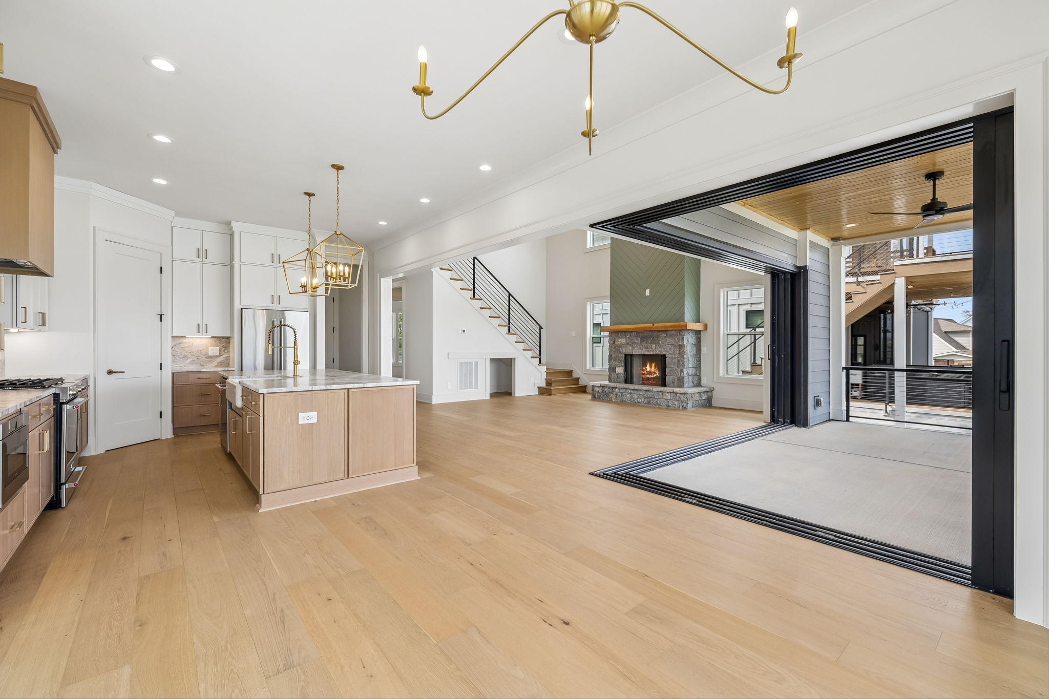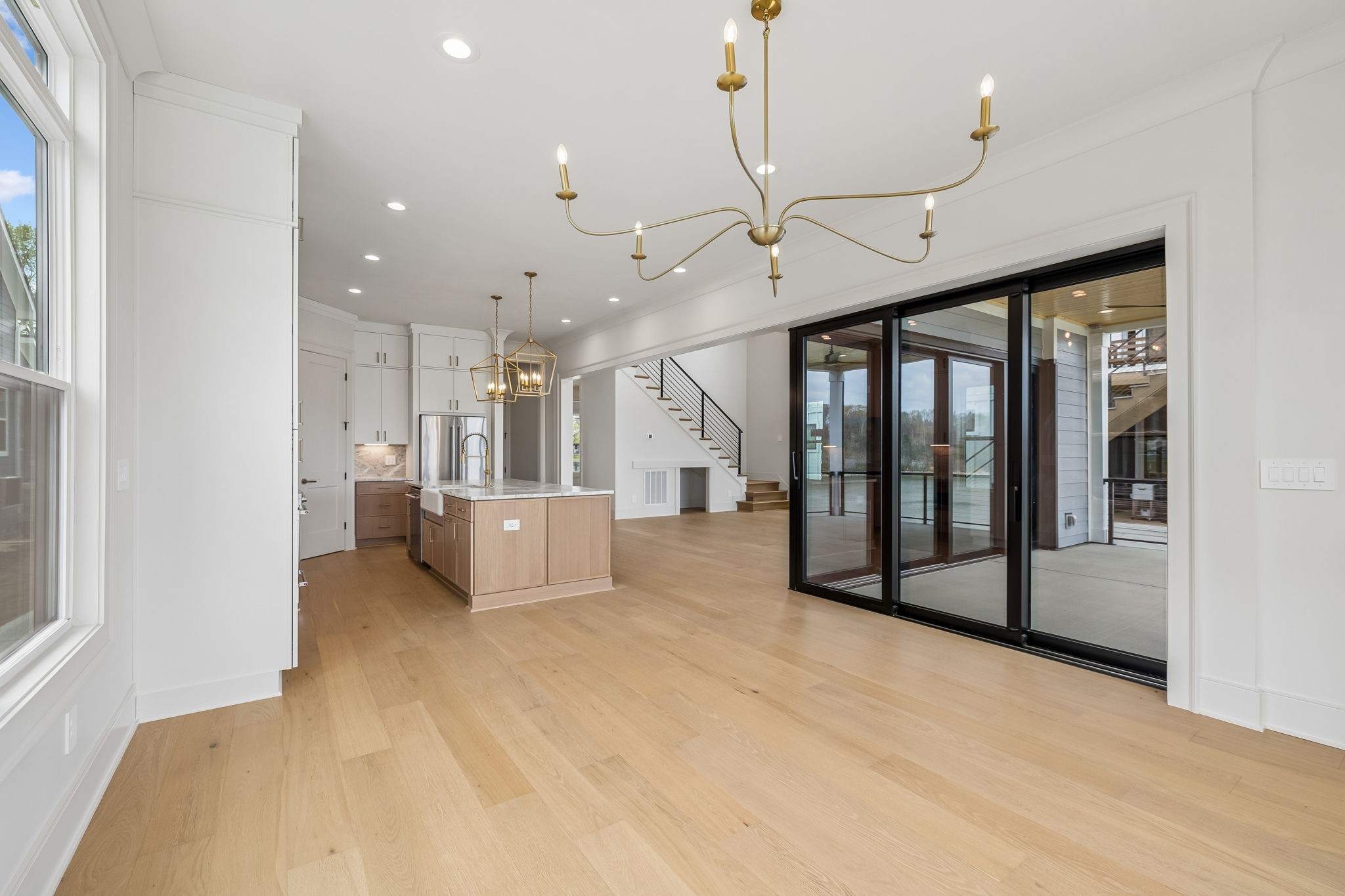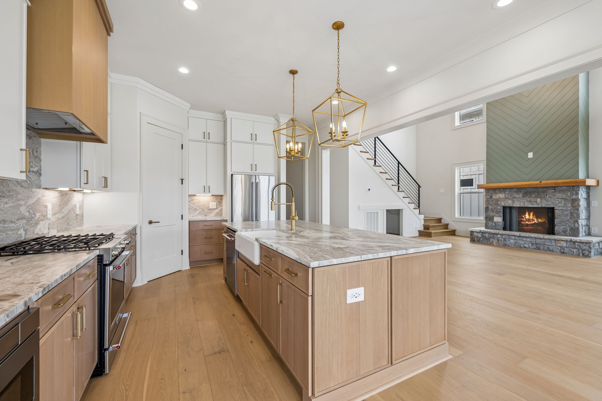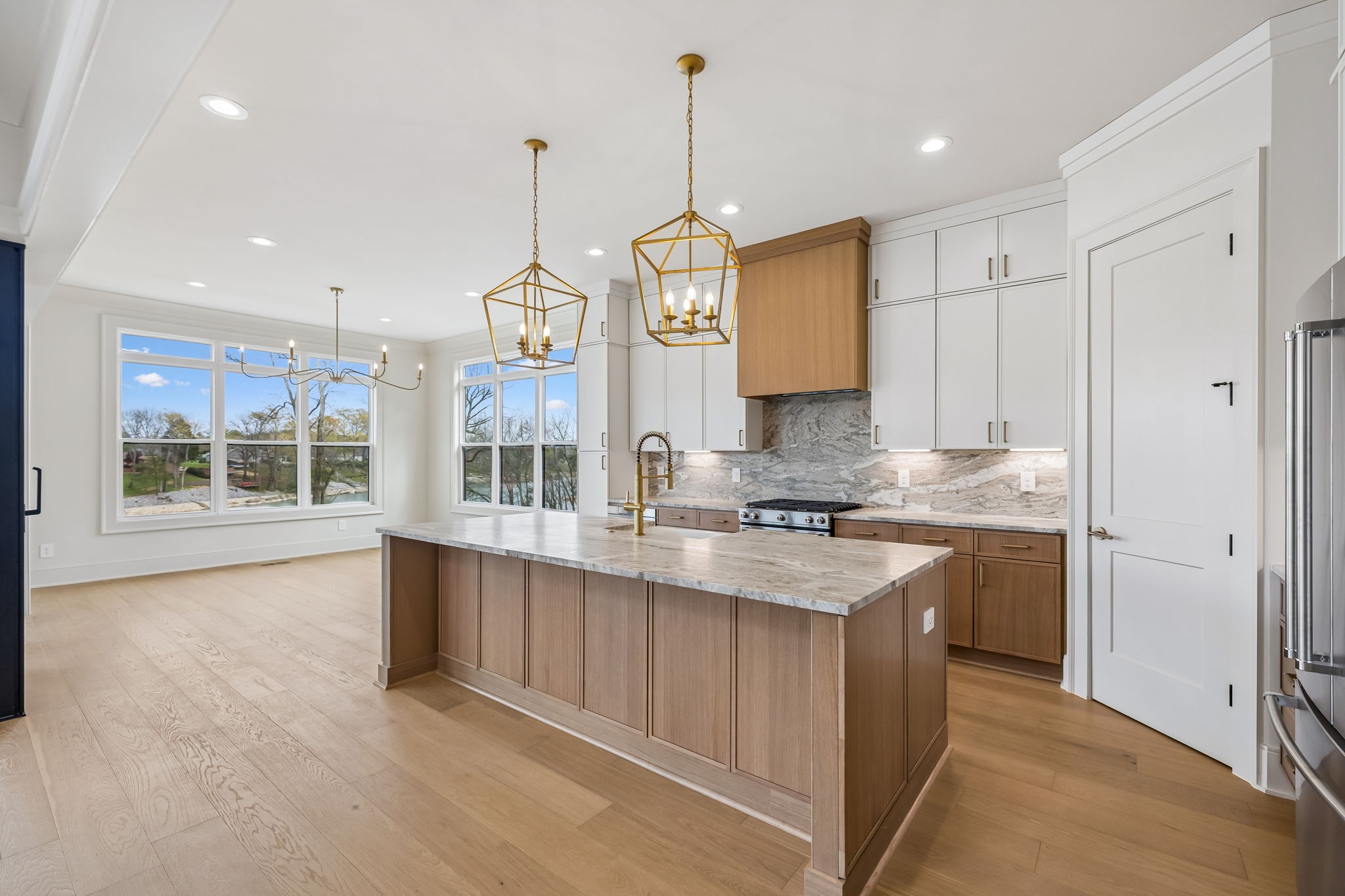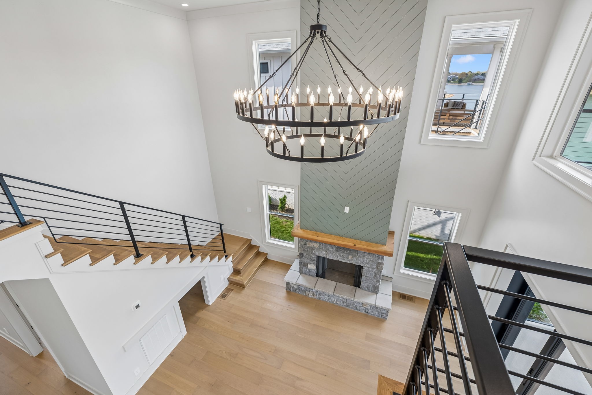 The main level features 10’ ceilings, 8’ solid-core doors, and a dramatic 21’ vaulted family room with a floor-to-ceiling natural stone fireplace. Pocketing glass sliders open to a covered porch with stunning lake views. The kitchen includes custom Tiger cabinetry to the ceiling with soft-close doors and drawers, pull-out shelving, and KitchenAid Professional appliances. Wide-plank white oak hardwood flooring runs throughout. A spacious mudroom offers additional cabinetry, countertop workspace, washer/dryer, extra refrigerator, and custom drop zone. A main-level bedroom with attached bath adds flexibility.