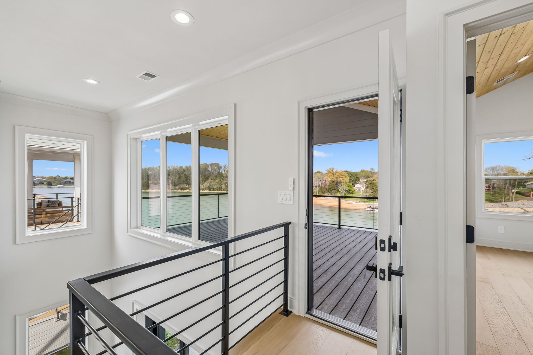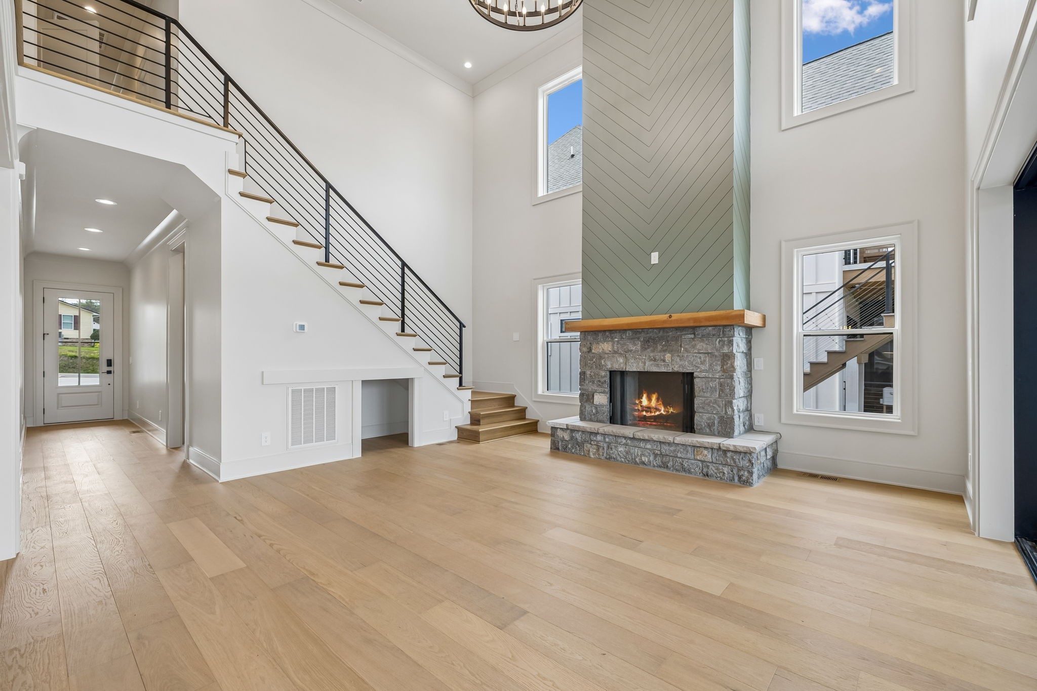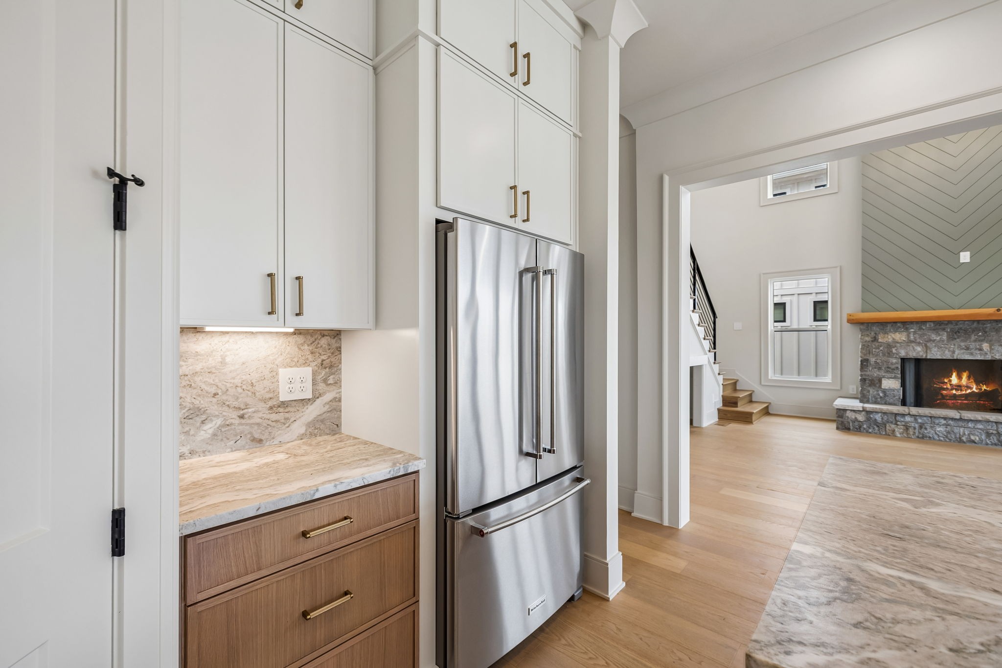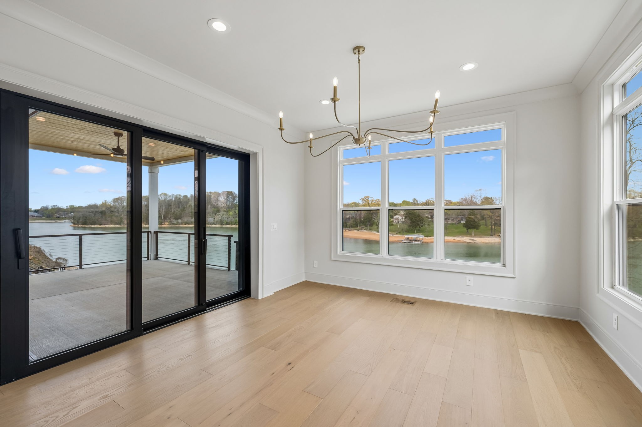 The main level features 10’ ceilings, 8’ solid-core doors, and a dramatic 21’ vaulted family room with a floor-to-ceiling natural stone fireplace. Pocketing glass sliders open to a covered porch with stunning lake views. The kitchen includes custom Tiger cabinetry to the ceiling with soft-close doors and drawers, pull-out shelving, and KitchenAid Professional appliances. Wide-plank white oak hardwood flooring runs throughout. A spacious mudroom offers additional cabinetry, countertop workspace, washer/dryer, extra refrigerator, and custom drop zone. A main-level bedroom with attached bath adds flexibility.
