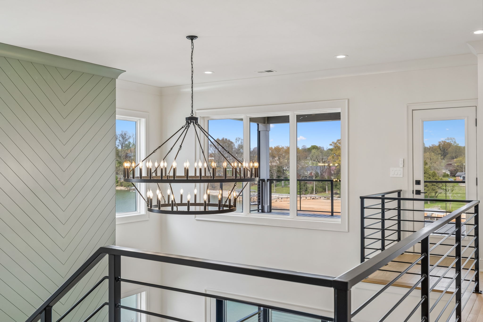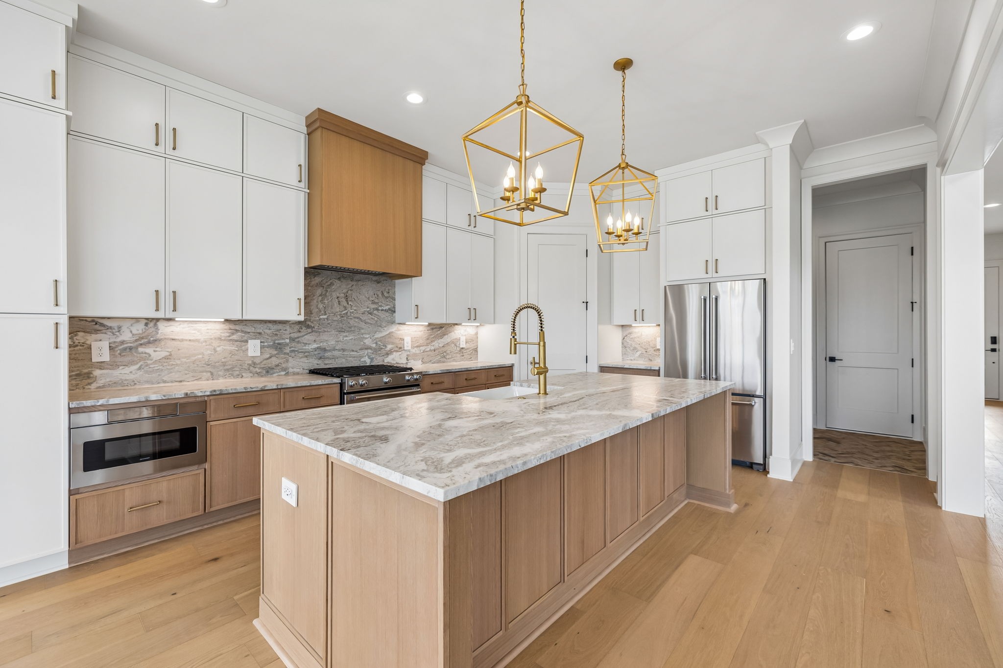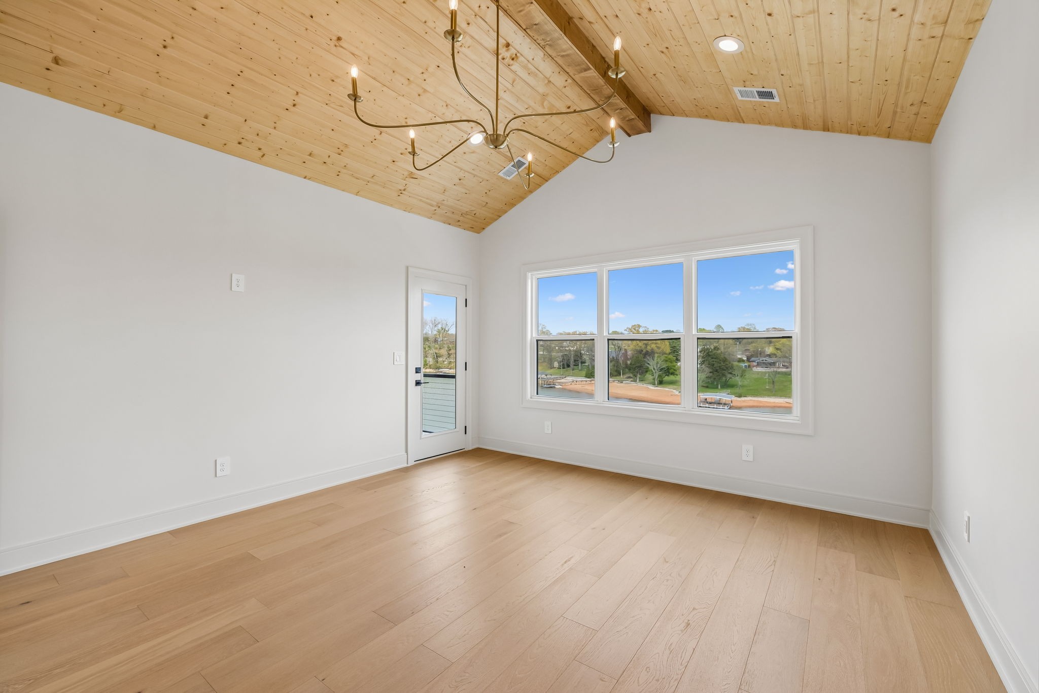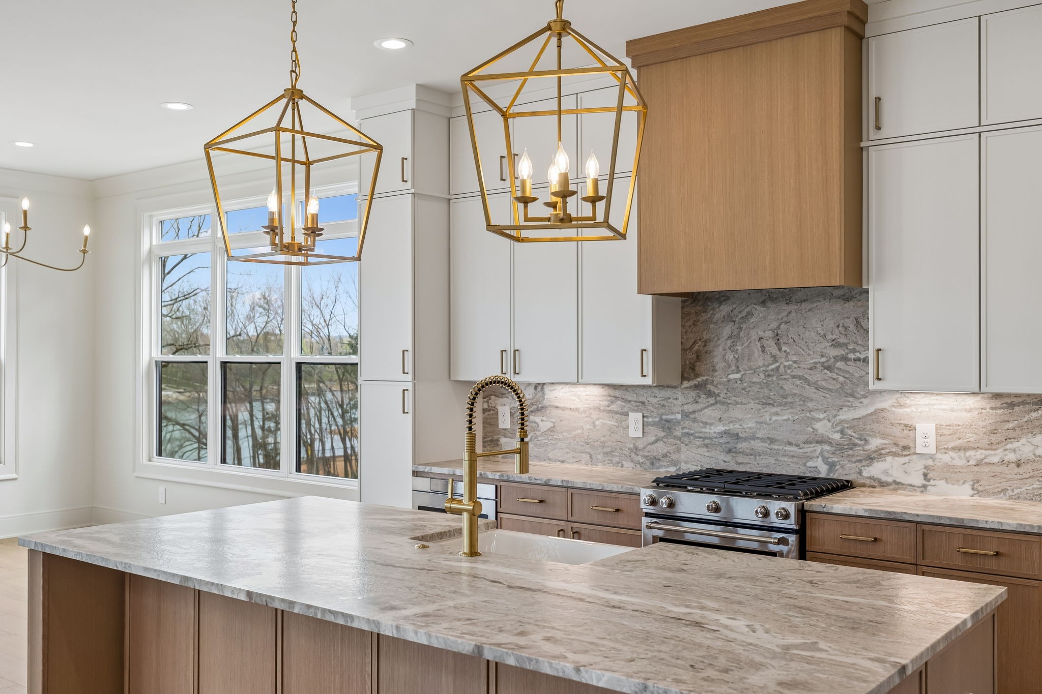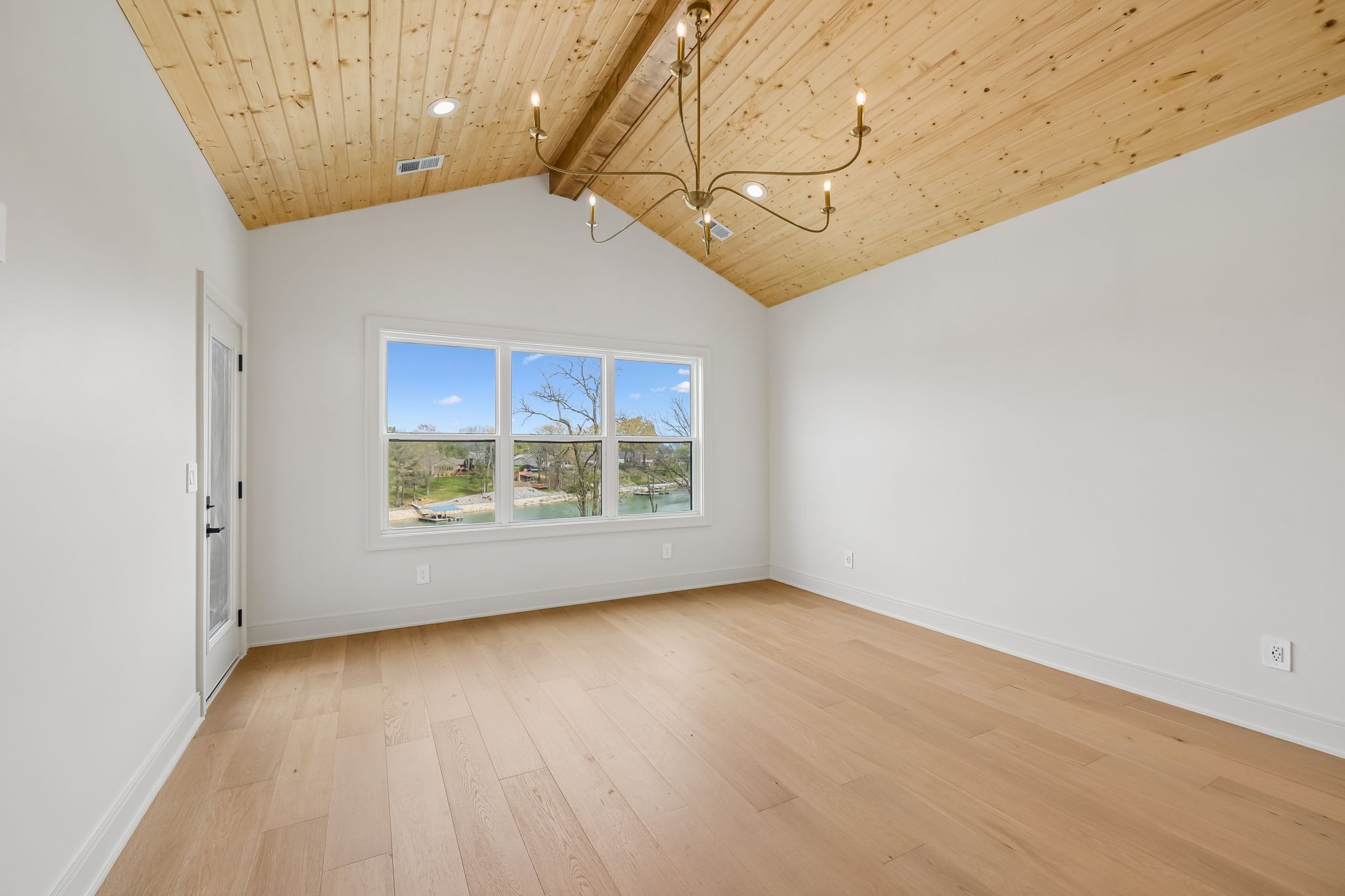 The main level features 10’ ceilings, 8’ solid-core doors, and a dramatic 21’ vaulted family room with a floor-to-ceiling natural stone fireplace. Pocketing glass sliders open to a covered porch with stunning lake views. The kitchen includes custom Tiger cabinetry to the ceiling with soft-close doors and drawers, pull-out shelving, and KitchenAid Professional appliances. Wide-plank white oak hardwood flooring runs throughout. A spacious mudroom offers additional cabinetry, countertop workspace, washer/dryer, extra refrigerator, and custom drop zone. A main-level bedroom with attached bath adds flexibility.