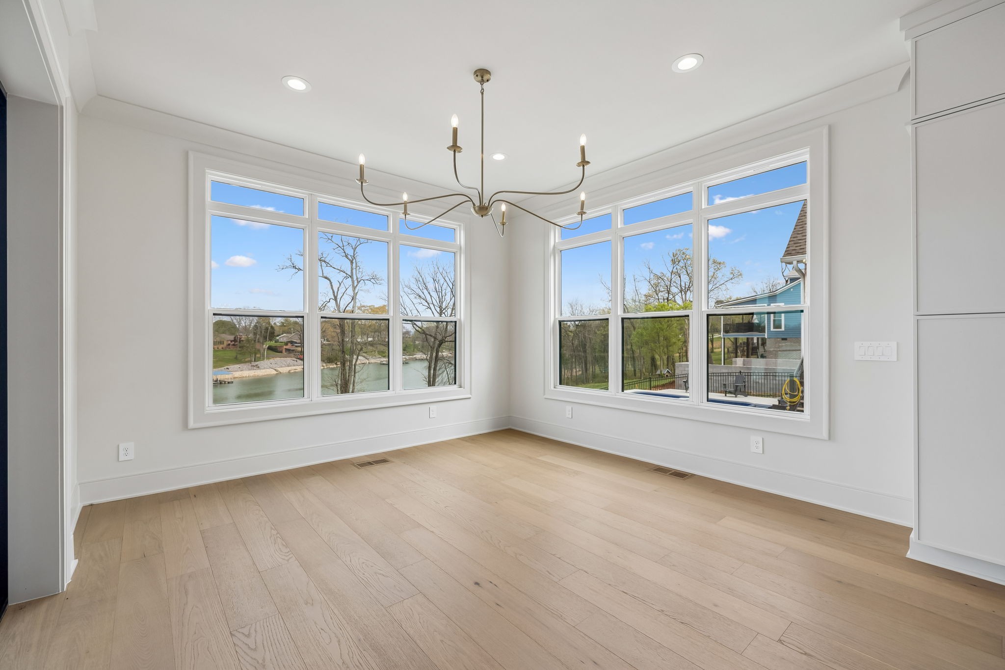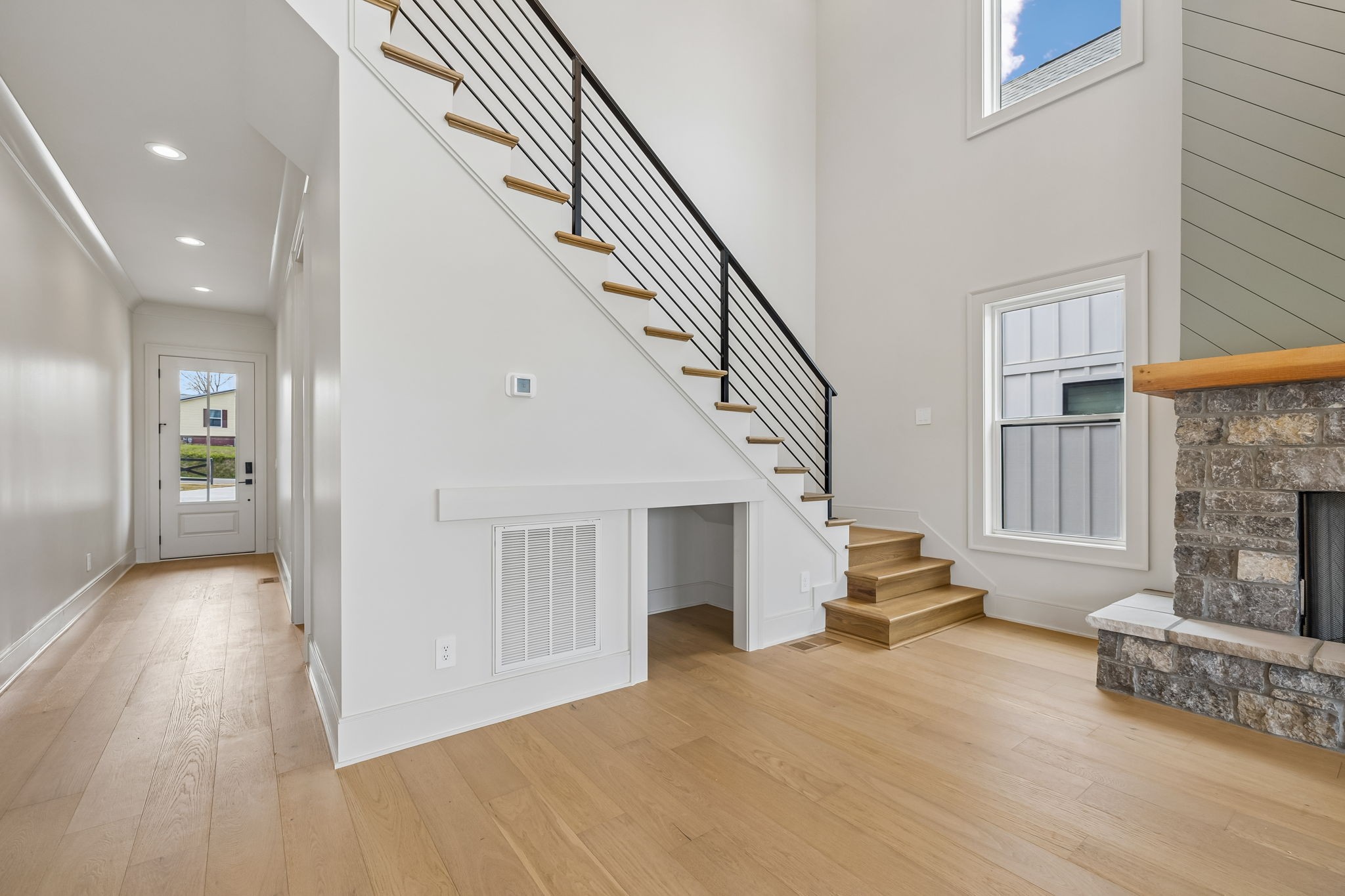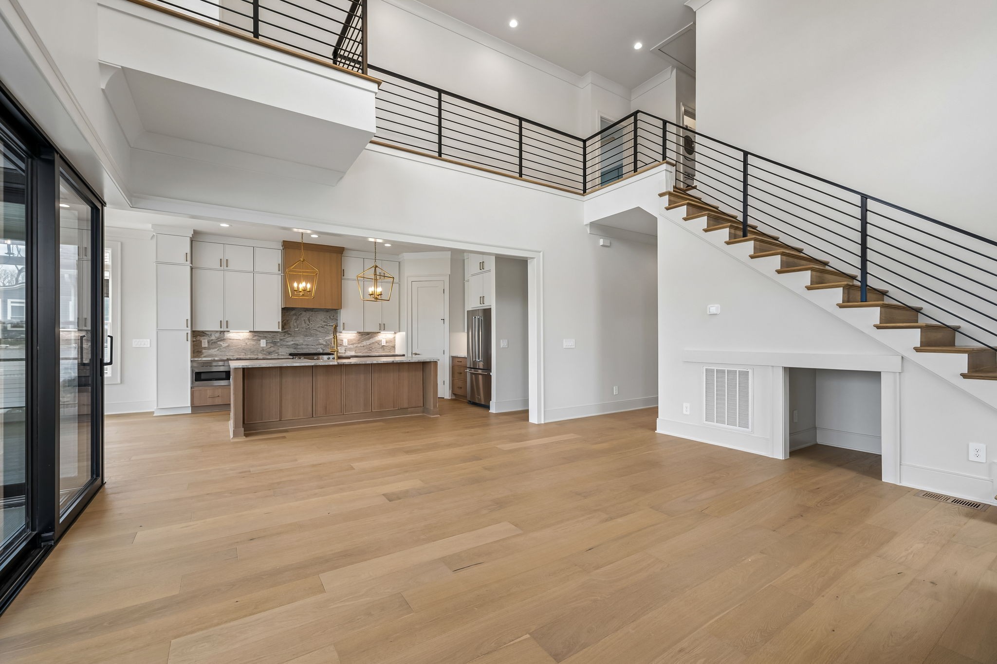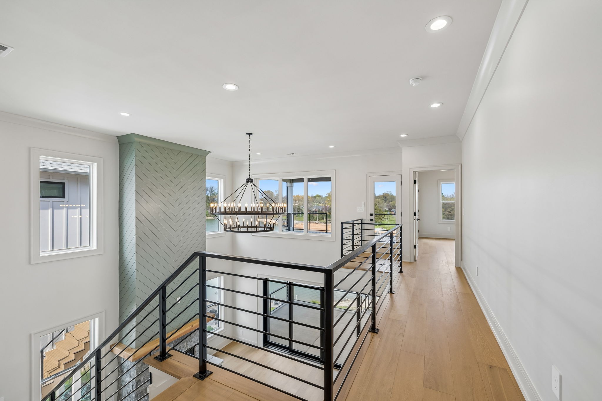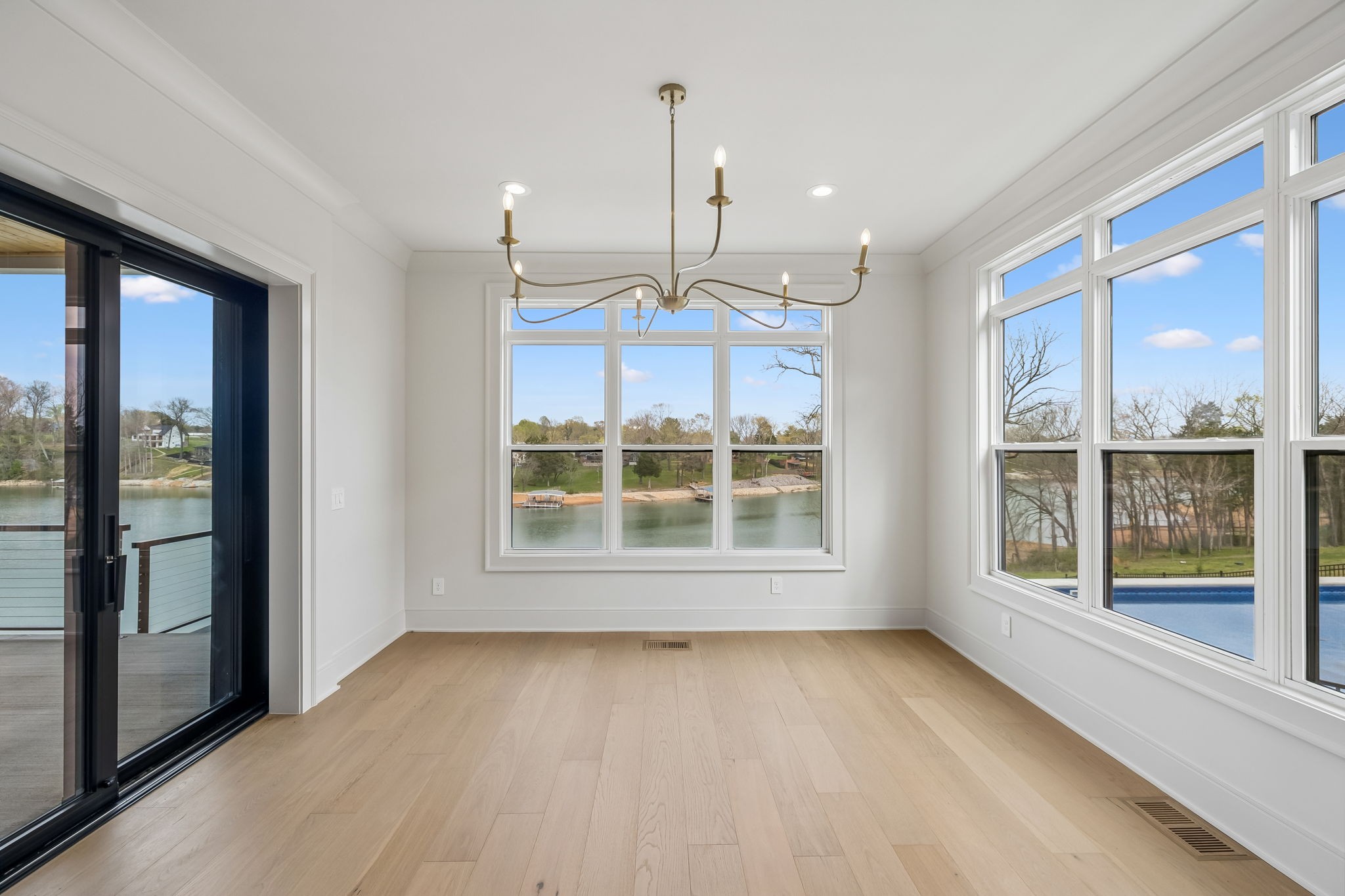 The main level features 10’ ceilings, 8’ solid-core doors, and a dramatic 21’ vaulted family room with a floor-to-ceiling natural stone fireplace. Pocketing glass sliders open to a covered porch with stunning lake views. The kitchen includes custom Tiger cabinetry to the ceiling with soft-close doors and drawers, pull-out shelving, and KitchenAid Professional appliances. Wide-plank white oak hardwood flooring runs throughout. A spacious mudroom offers additional cabinetry, countertop workspace, washer/dryer, extra refrigerator, and custom drop zone. A main-level bedroom with attached bath adds flexibility.