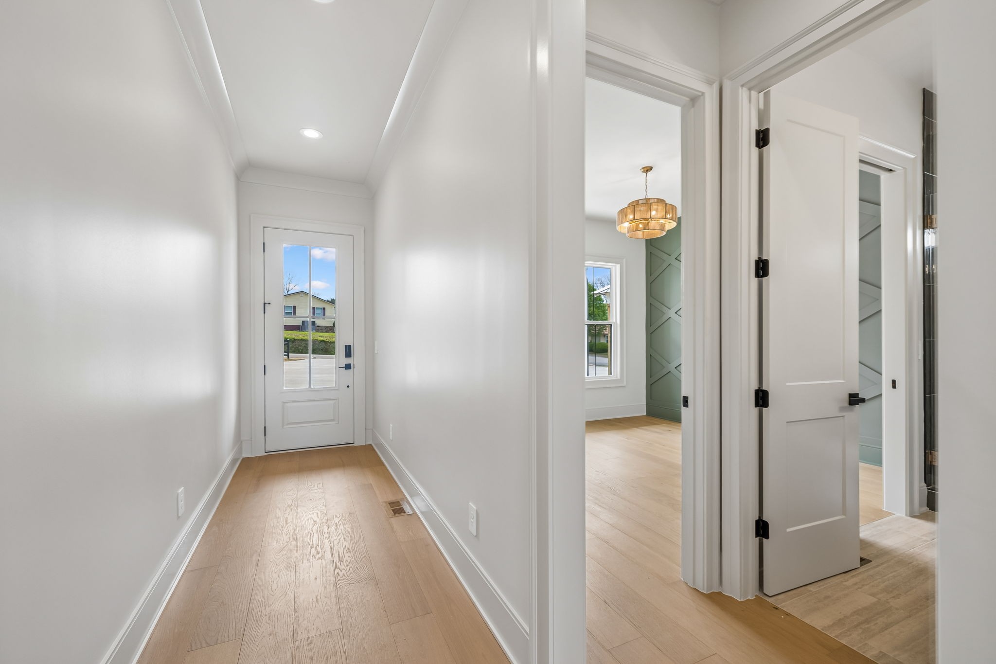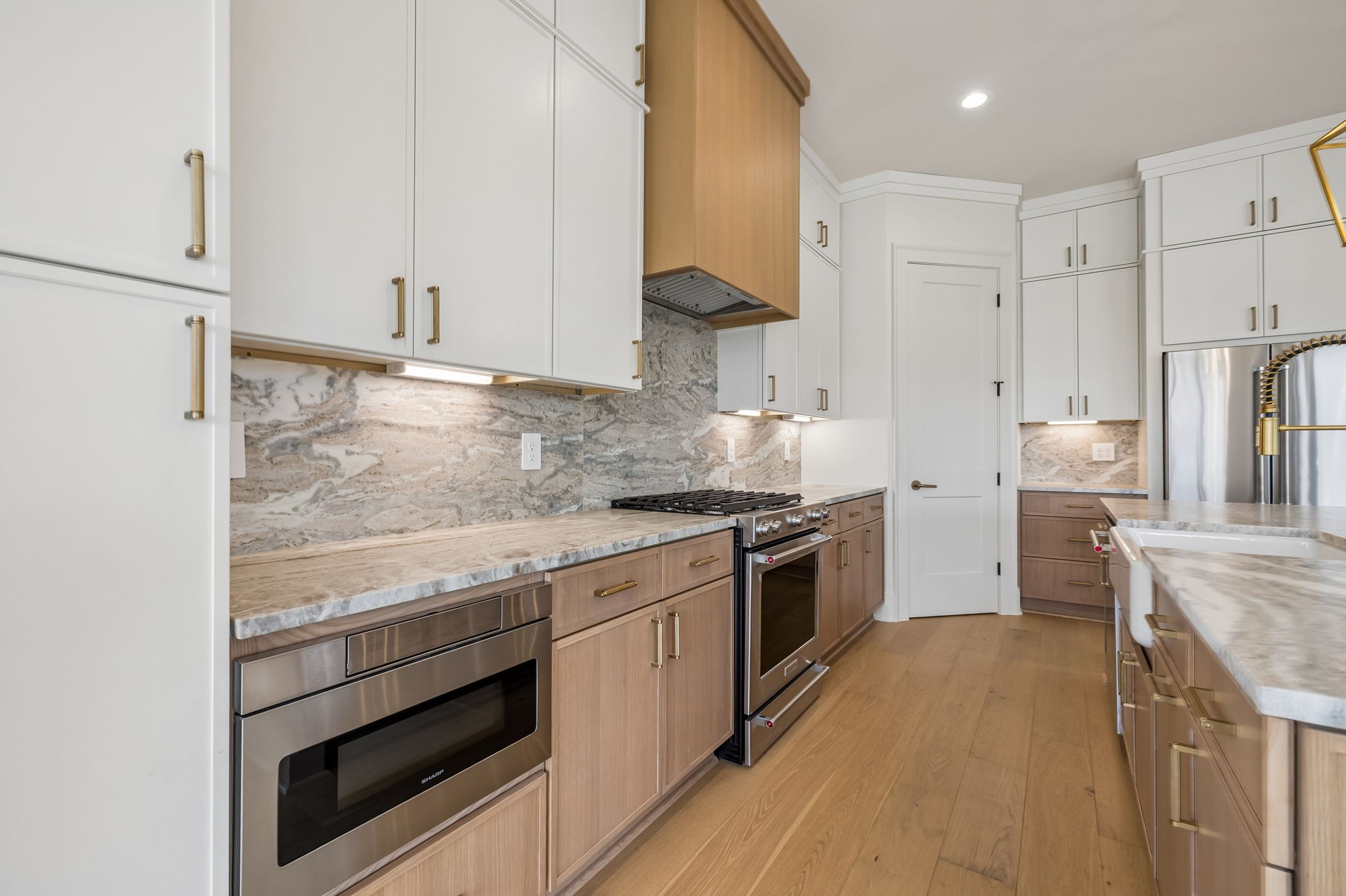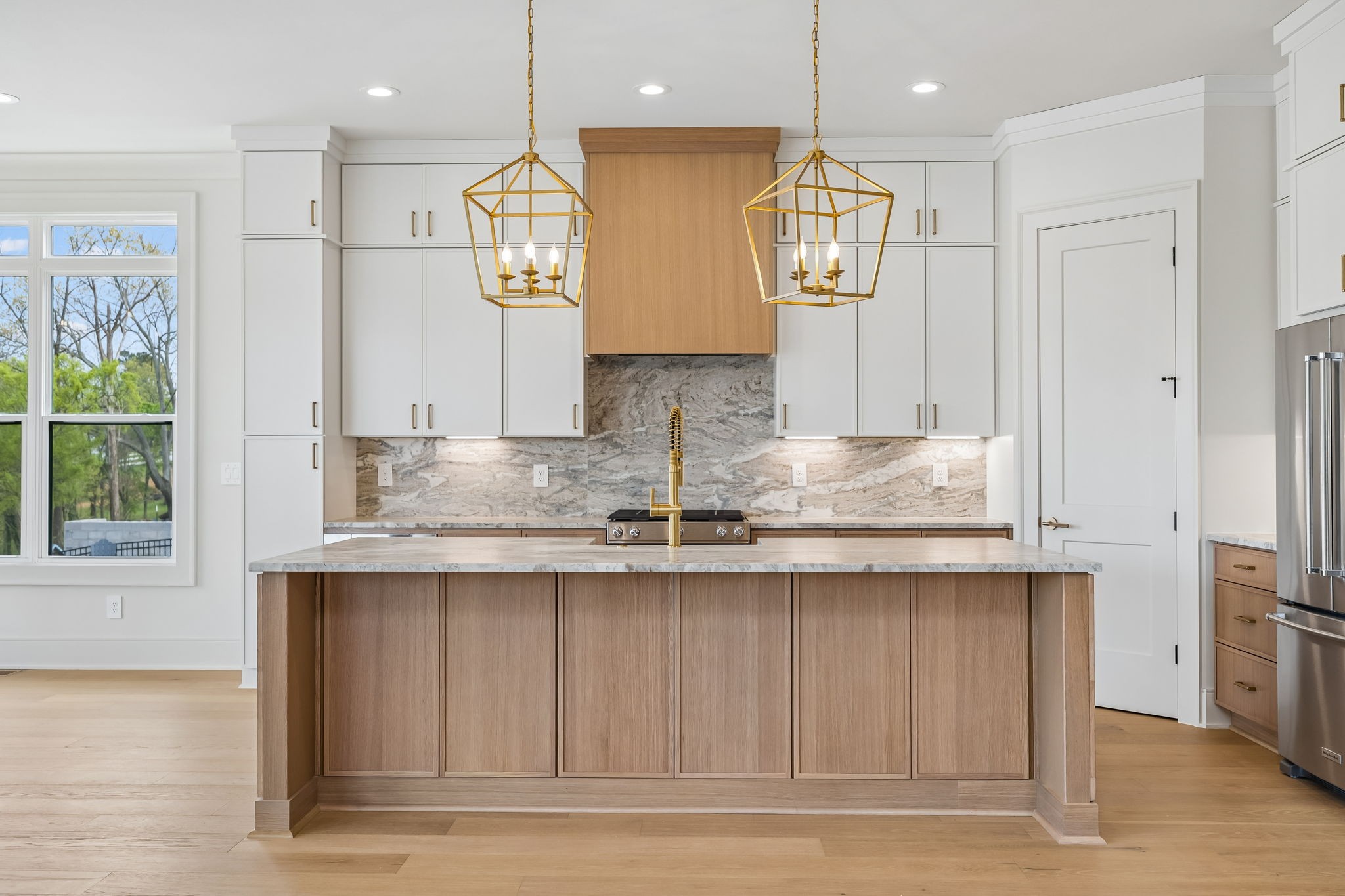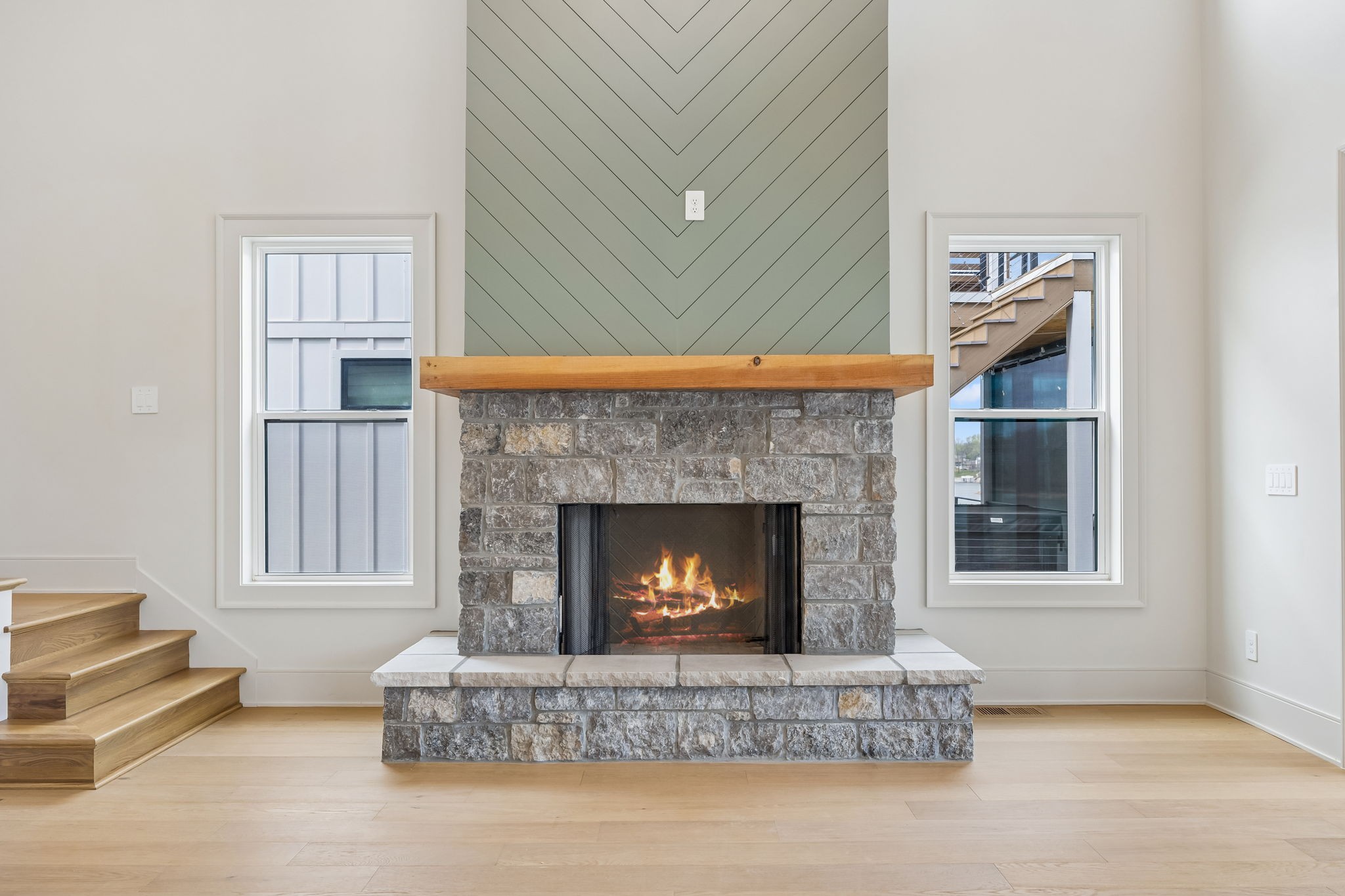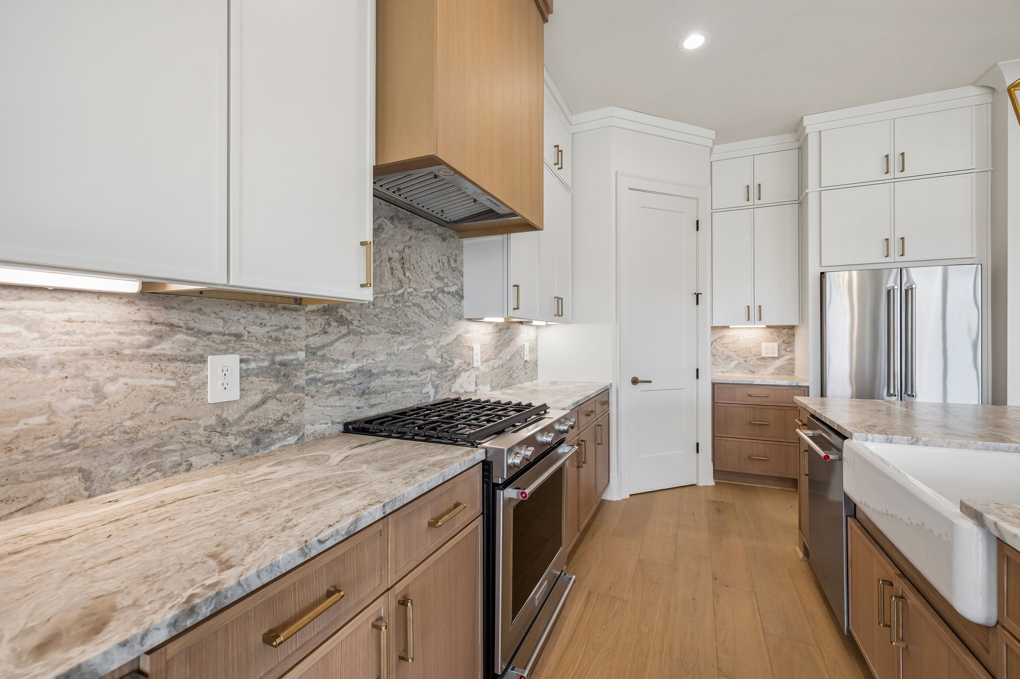The main level features 10’ ceilings, 8’ solid-core doors, and a dramatic 21’ vaulted family room with a floor-to-ceiling natural stone fireplace. Pocketing glass sliders open to a covered porch with stunning lake views. The kitchen includes custom Tiger cabinetry to the ceiling with soft-close doors and drawers, pull-out shelving, and KitchenAid Professional appliances. Wide-plank white oak hardwood flooring runs throughout. A spacious mudroom offers additional cabinetry, countertop workspace, washer/dryer, extra refrigerator, and custom drop zone. A main-level bedroom with attached bath adds flexibility.