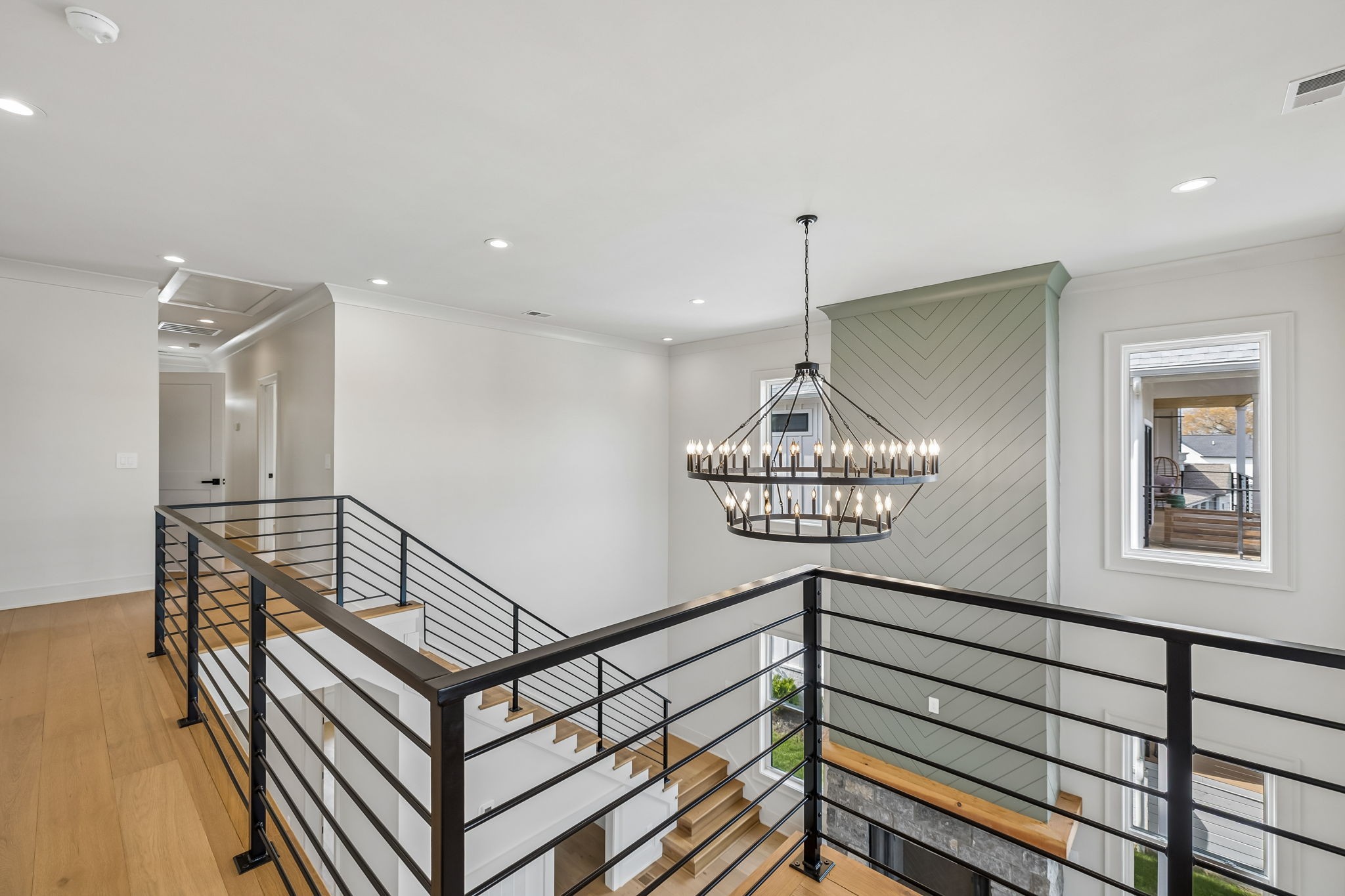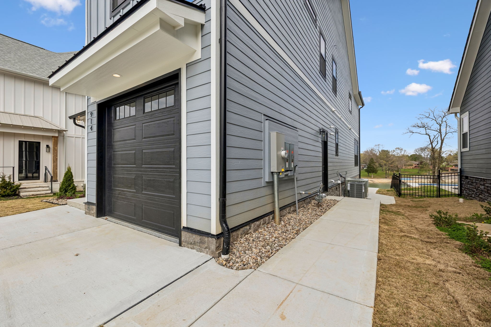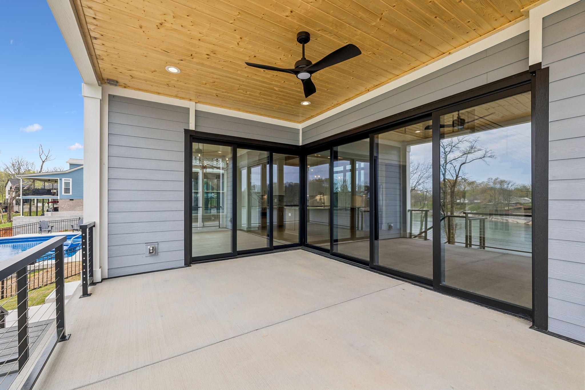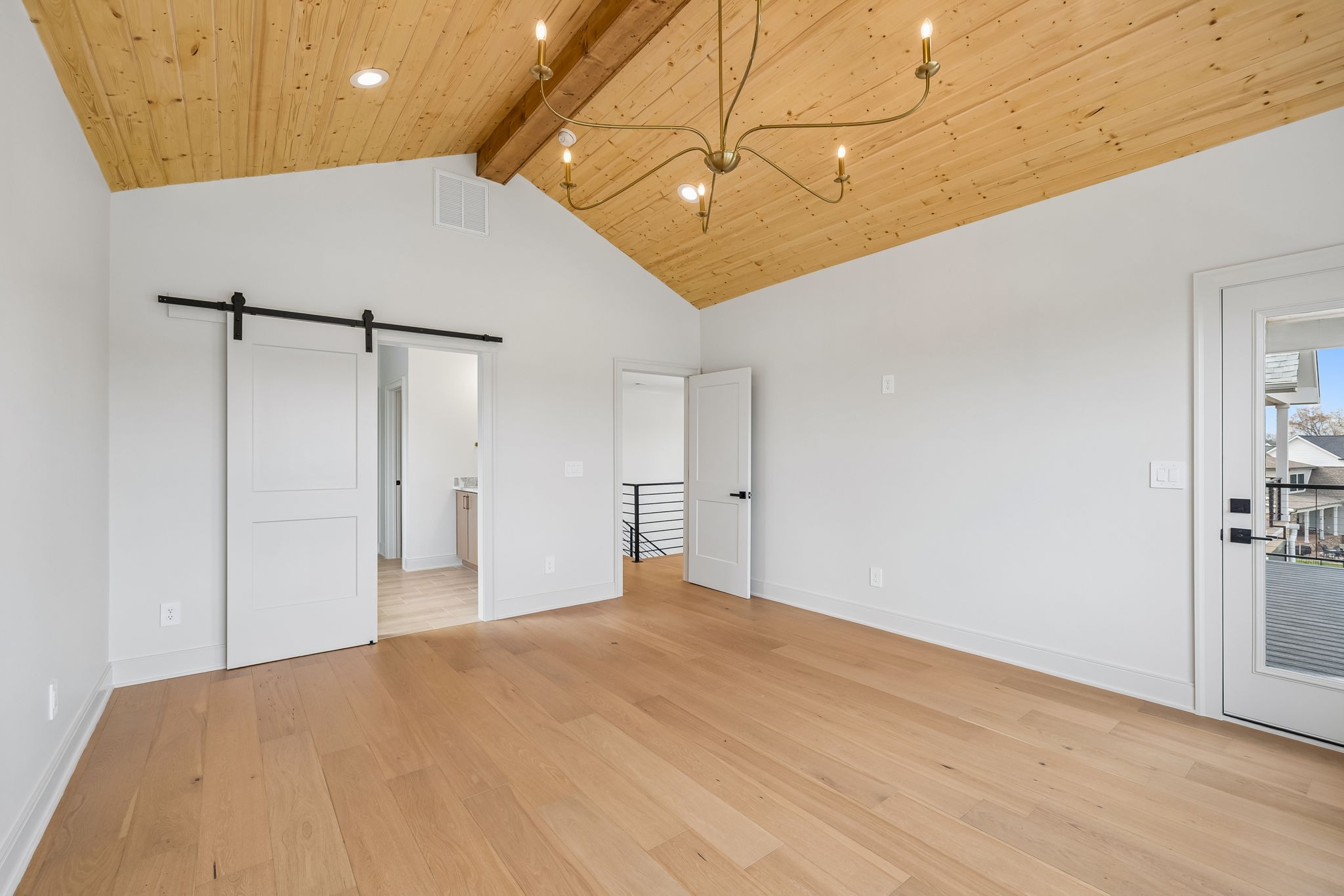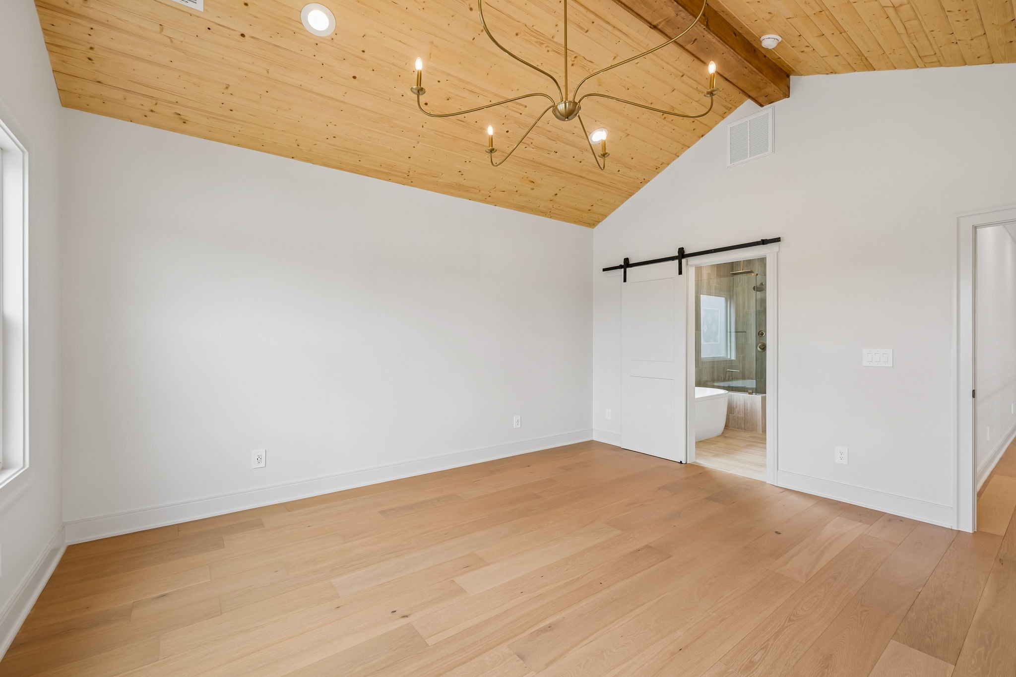 The main level features 10’ ceilings, 8’ solid-core doors, and a dramatic 21’ vaulted family room with a floor-to-ceiling natural stone fireplace. Pocketing glass sliders open to a covered porch with stunning lake views. The kitchen includes custom Tiger cabinetry to the ceiling with soft-close doors and drawers, pull-out shelving, and KitchenAid Professional appliances. Wide-plank white oak hardwood flooring runs throughout. A spacious mudroom offers additional cabinetry, countertop workspace, washer/dryer, extra refrigerator, and custom drop zone. A main-level bedroom with attached bath adds flexibility.