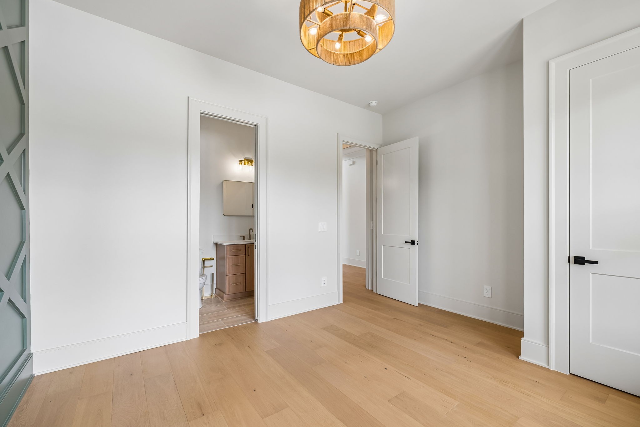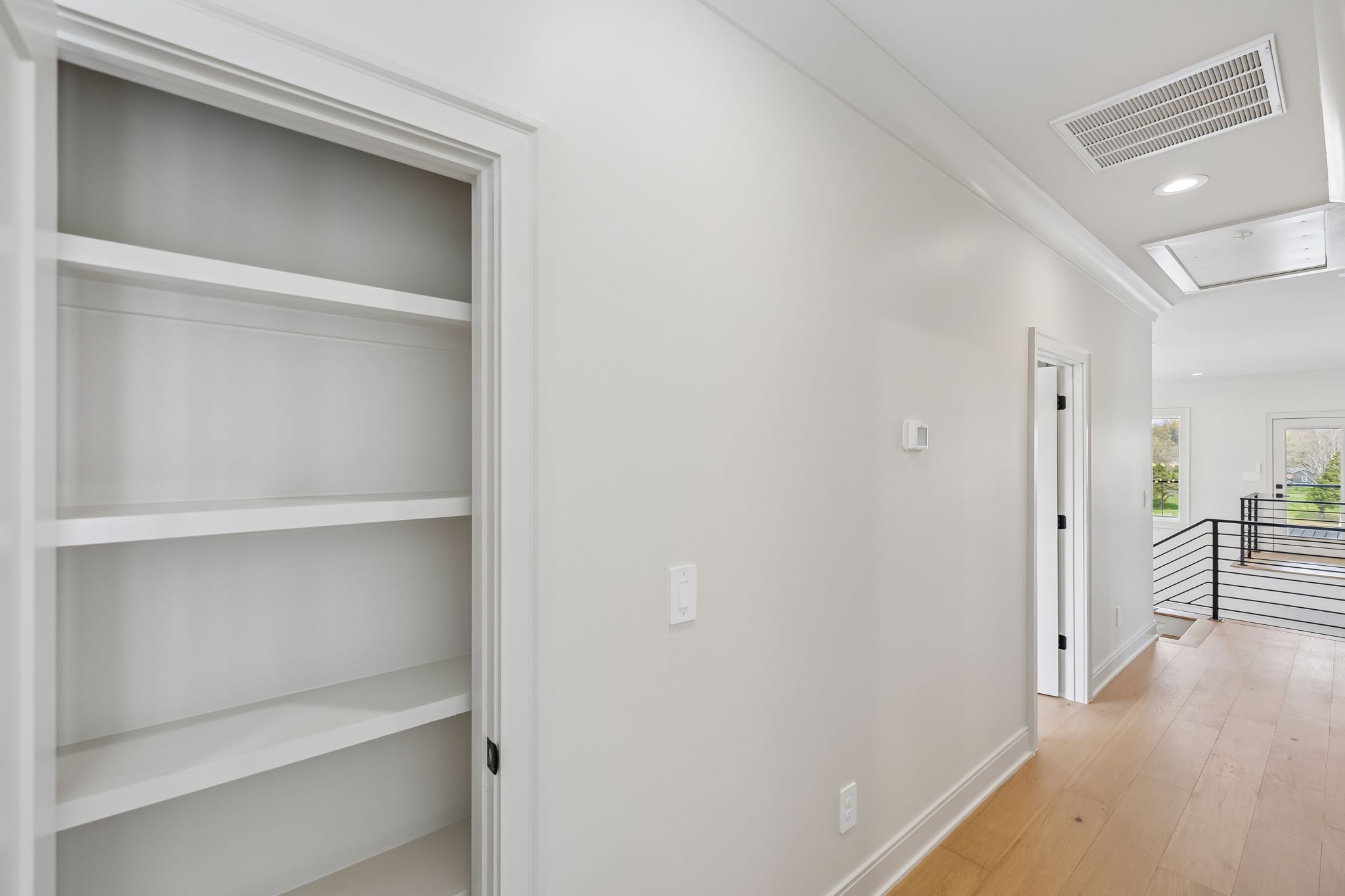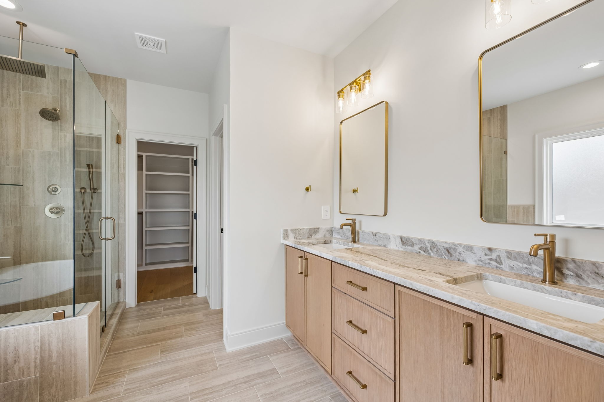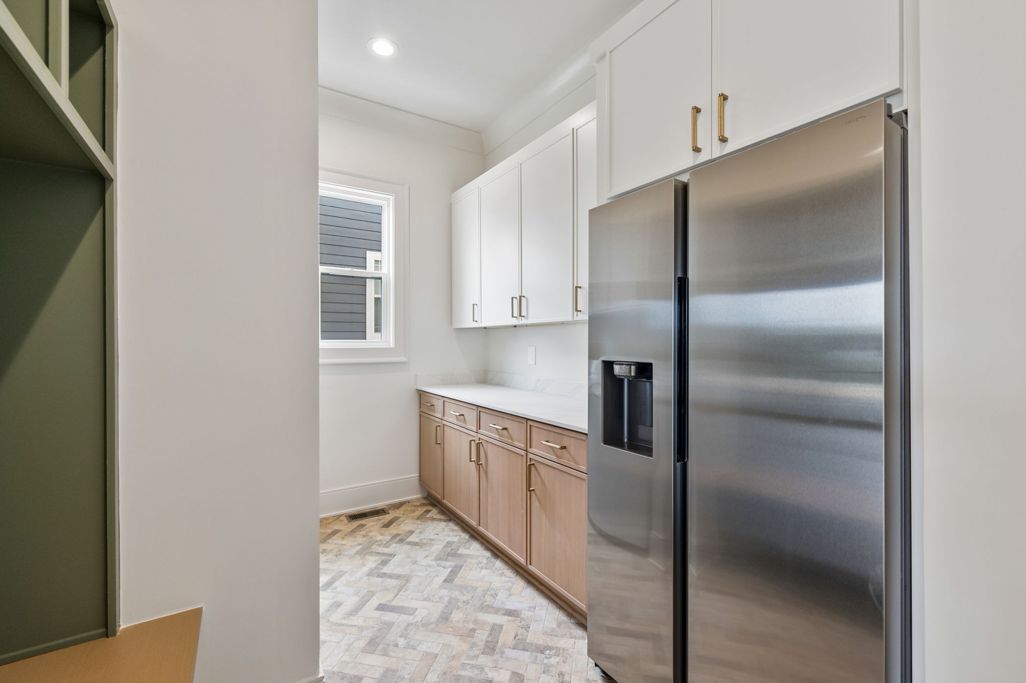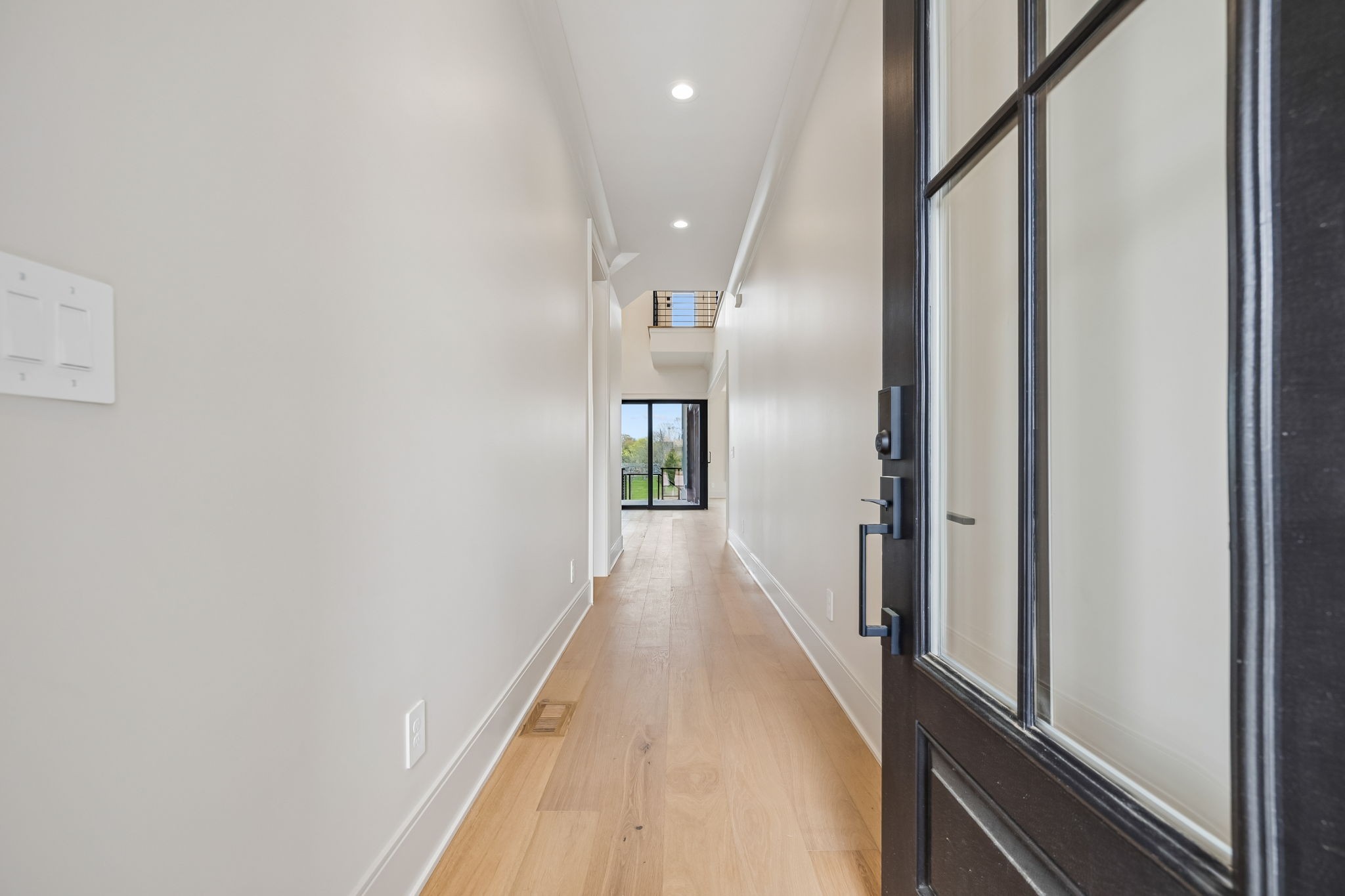 The main level features 10’ ceilings, 8’ solid-core doors, and a dramatic 21’ vaulted family room with a floor-to-ceiling natural stone fireplace. Pocketing glass sliders open to a covered porch with stunning lake views. The kitchen includes custom Tiger cabinetry to the ceiling with soft-close doors and drawers, pull-out shelving, and KitchenAid Professional appliances. Wide-plank white oak hardwood flooring runs throughout. A spacious mudroom offers additional cabinetry, countertop workspace, washer/dryer, extra refrigerator, and custom drop zone. A main-level bedroom with attached bath adds flexibility.