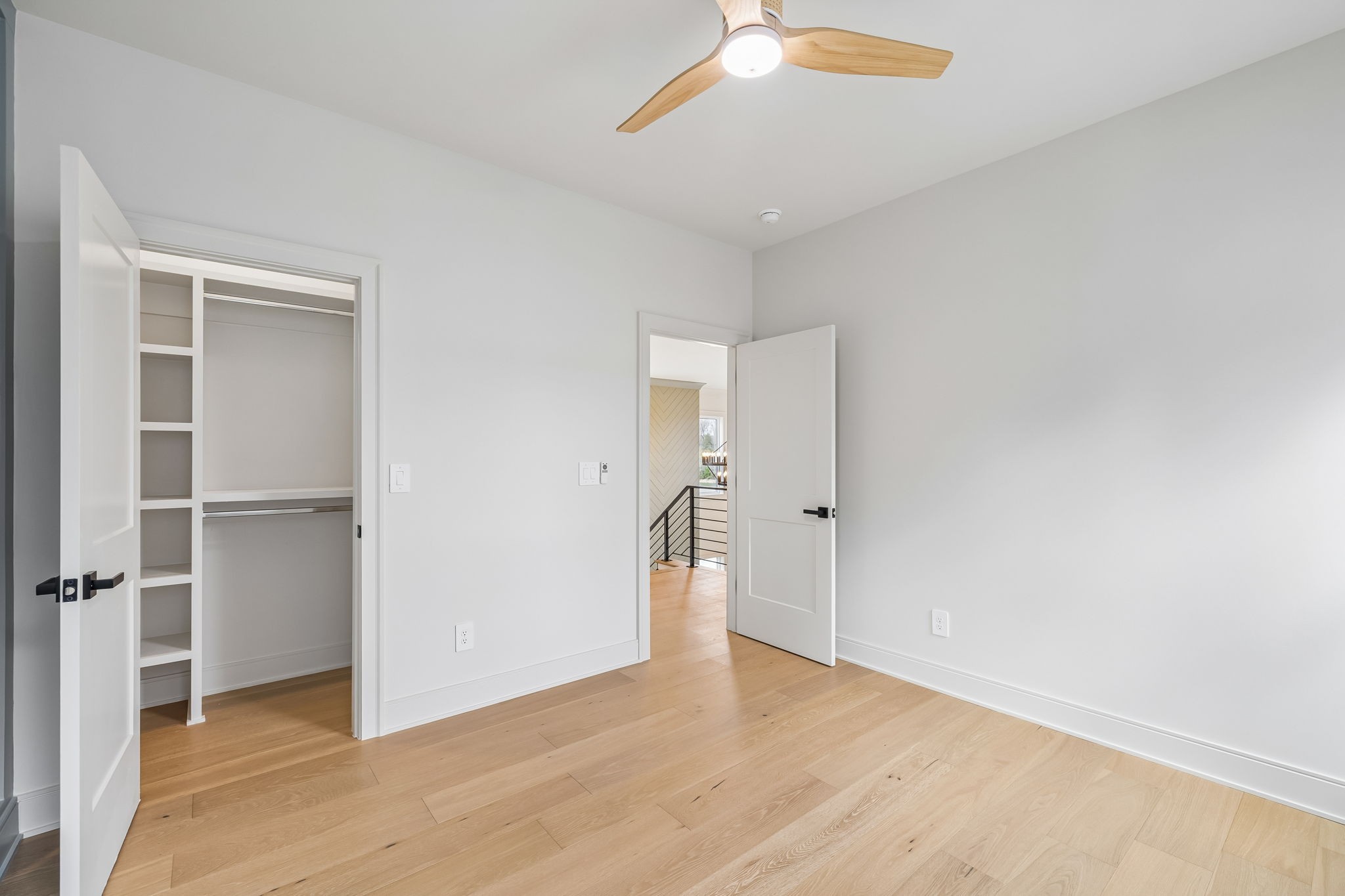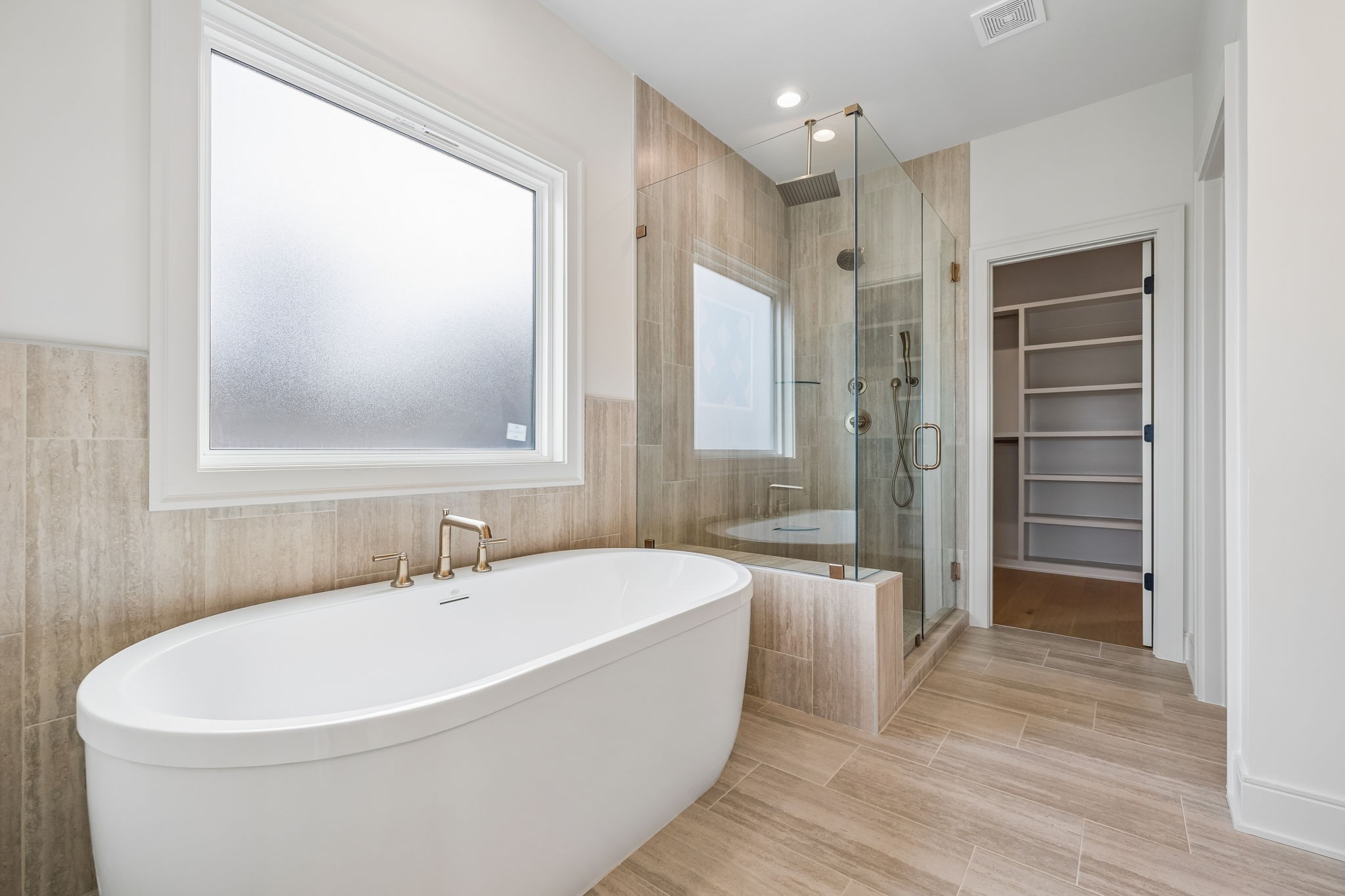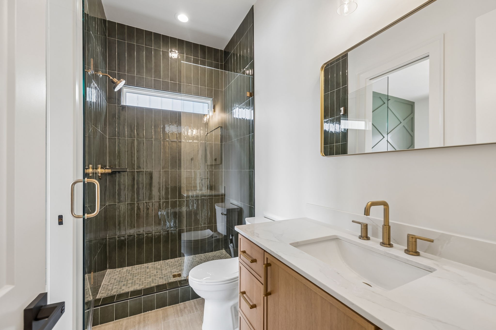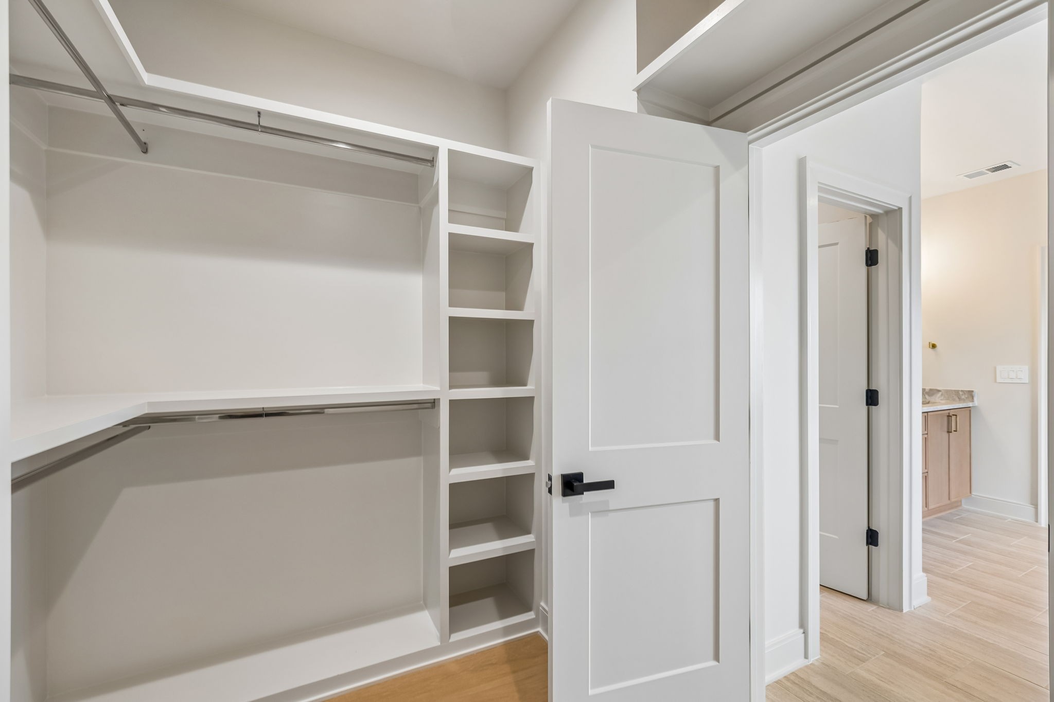 The main level features 10’ ceilings, 8’ solid-core doors, and a dramatic 21’ vaulted family room with a floor-to-ceiling natural stone fireplace. Pocketing glass sliders open to a covered porch with stunning lake views. The kitchen includes custom Tiger cabinetry to the ceiling with soft-close doors and drawers, pull-out shelving, and KitchenAid Professional appliances. Wide-plank white oak hardwood flooring runs throughout. A spacious mudroom offers additional cabinetry, countertop workspace, washer/dryer, extra refrigerator, and custom drop zone. A main-level bedroom with attached bath adds flexibility.