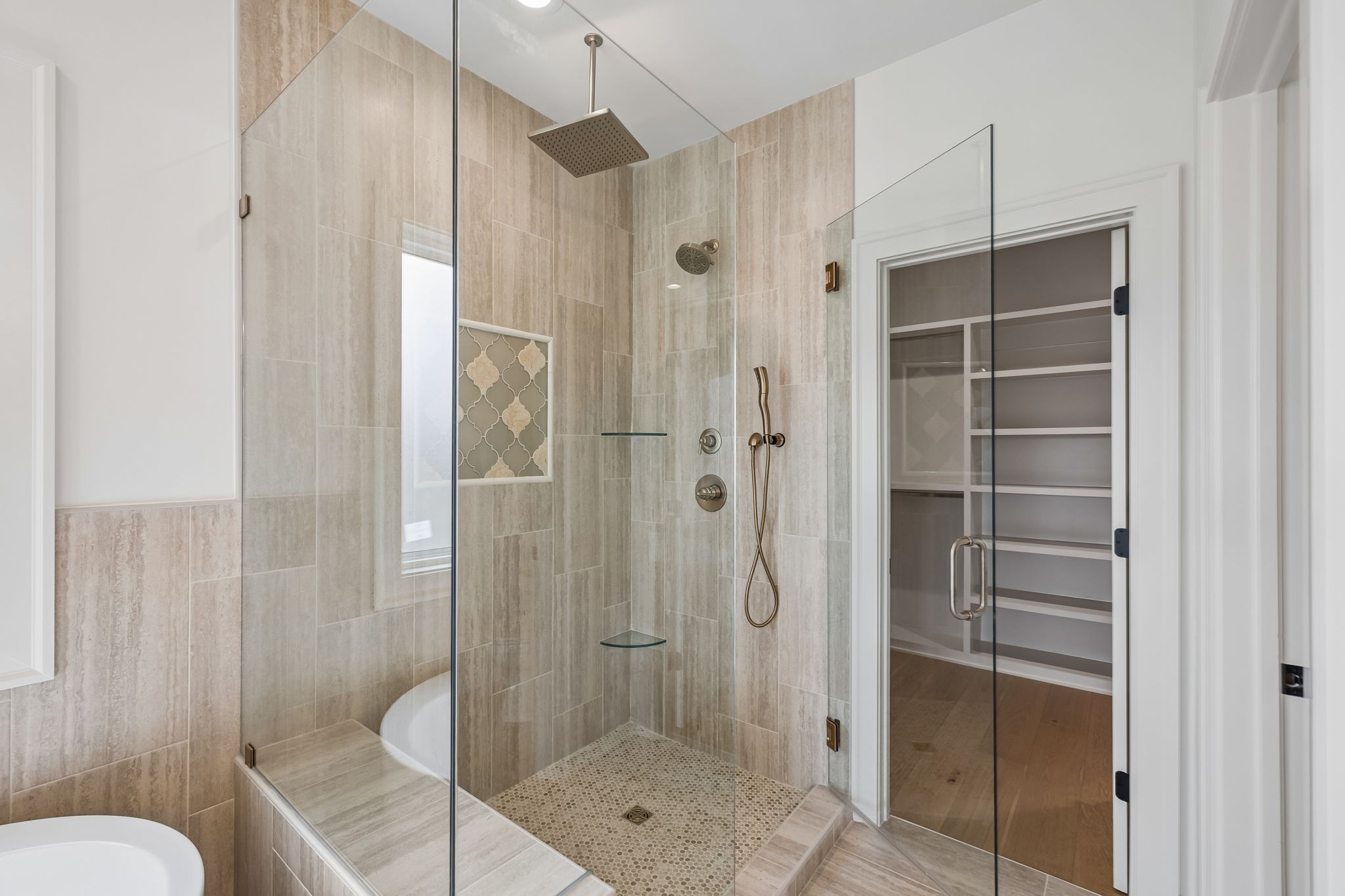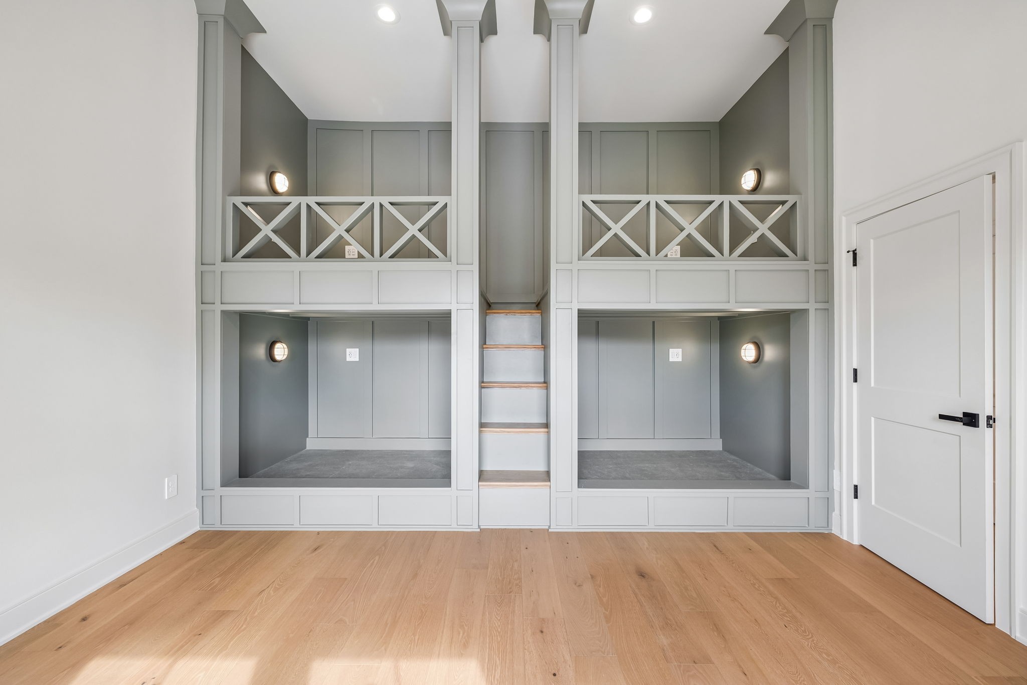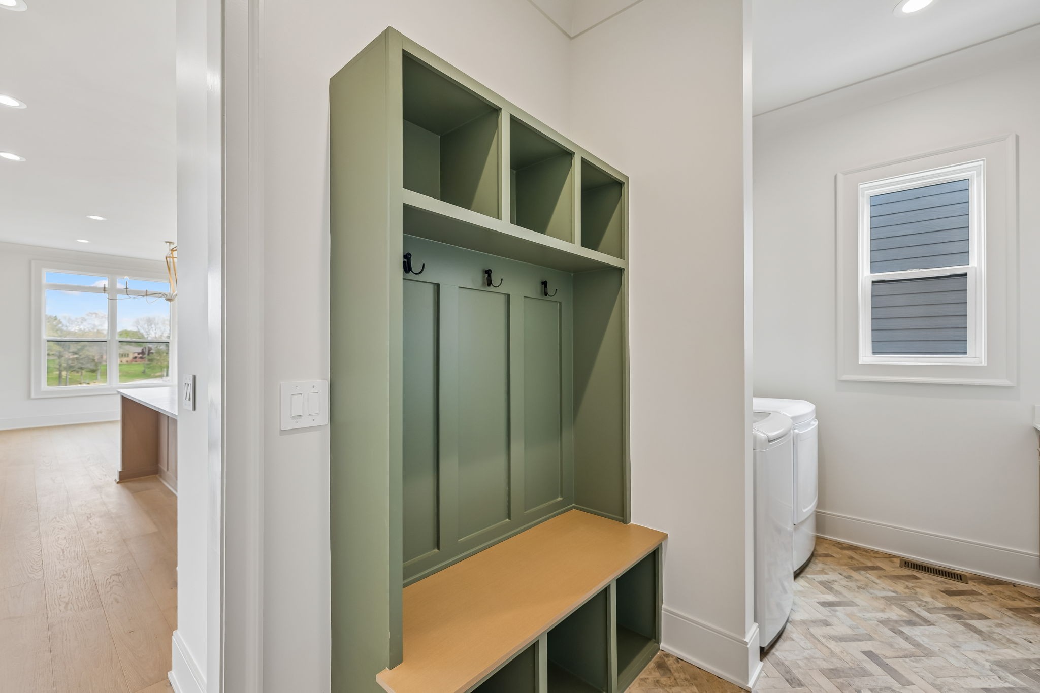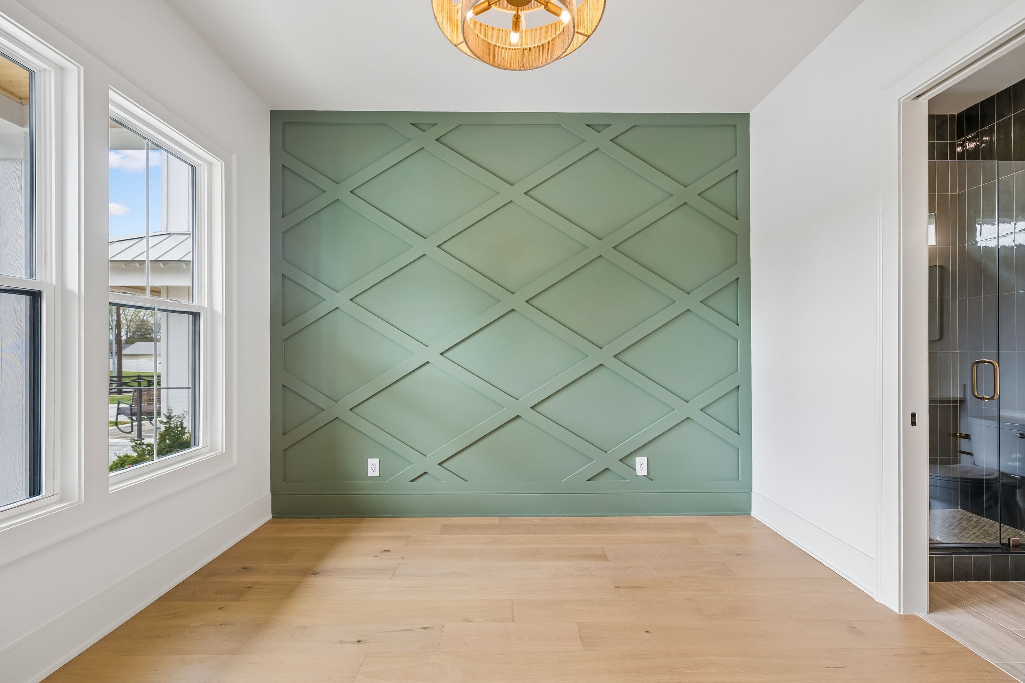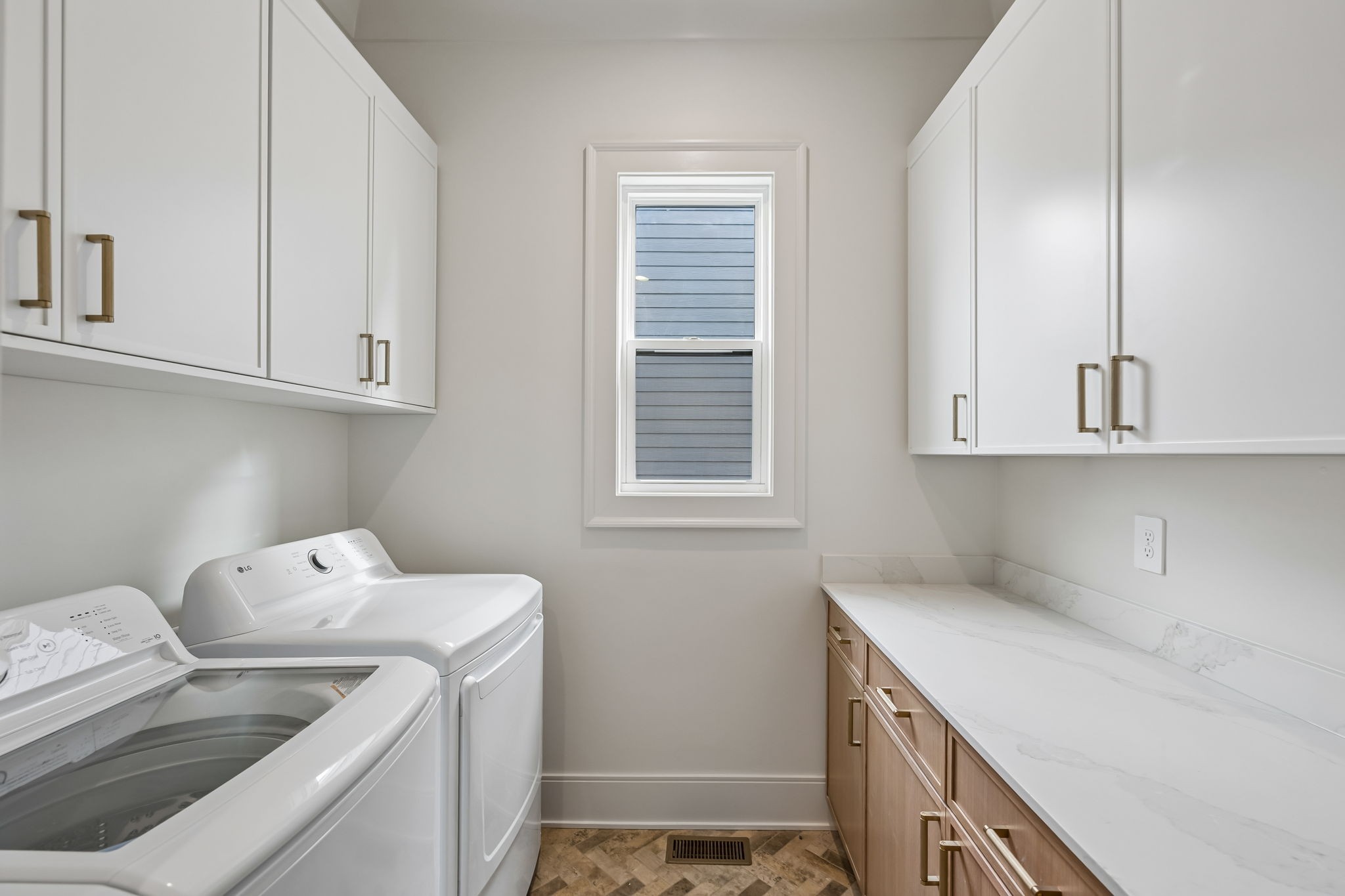 The main level features 10’ ceilings, 8’ solid-core doors, and a dramatic 21’ vaulted family room with a floor-to-ceiling natural stone fireplace. Pocketing glass sliders open to a covered porch with stunning lake views. The kitchen includes custom Tiger cabinetry to the ceiling with soft-close doors and drawers, pull-out shelving, and KitchenAid Professional appliances. Wide-plank white oak hardwood flooring runs throughout. A spacious mudroom offers additional cabinetry, countertop workspace, washer/dryer, extra refrigerator, and custom drop zone. A main-level bedroom with attached bath adds flexibility.