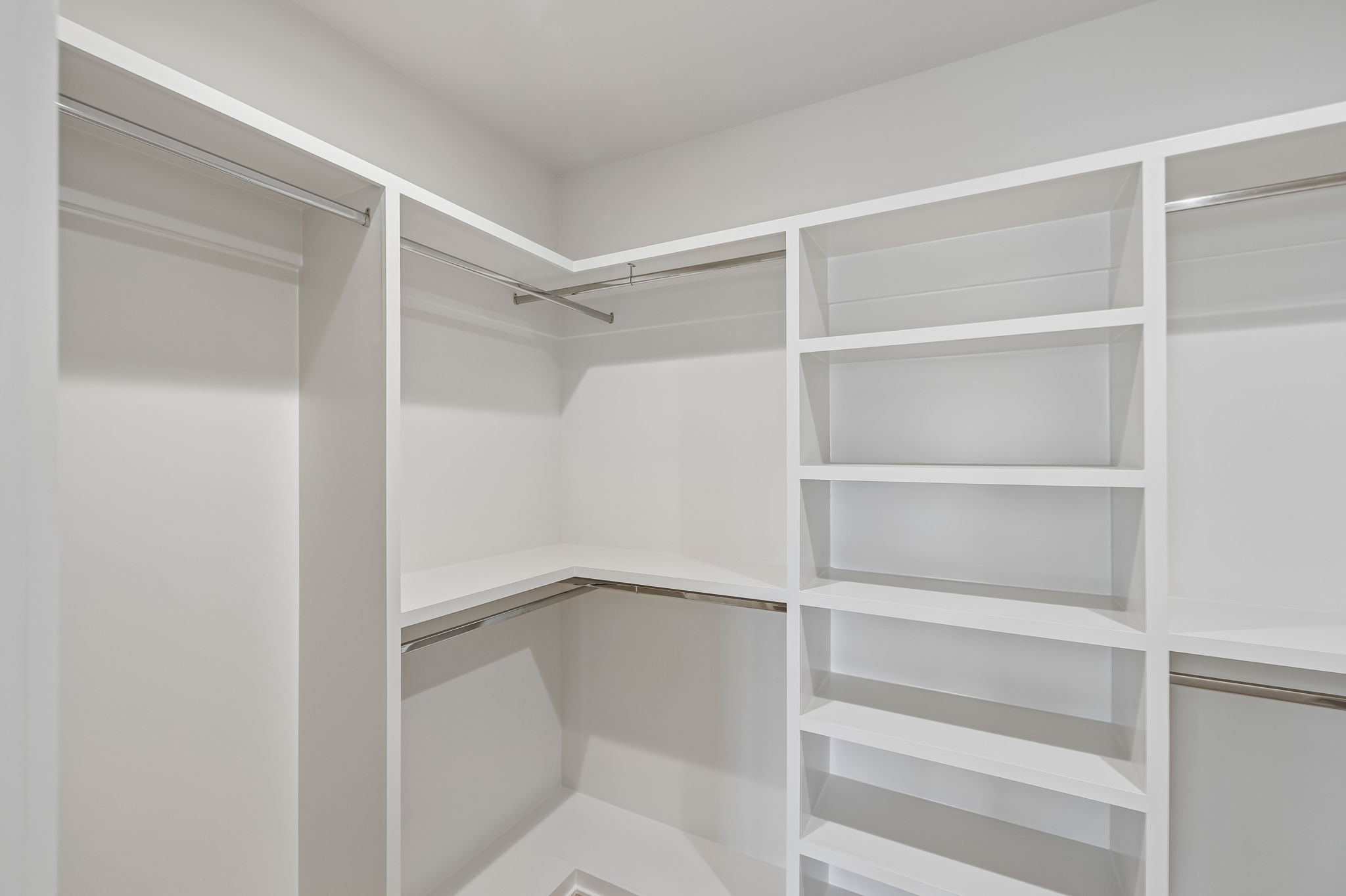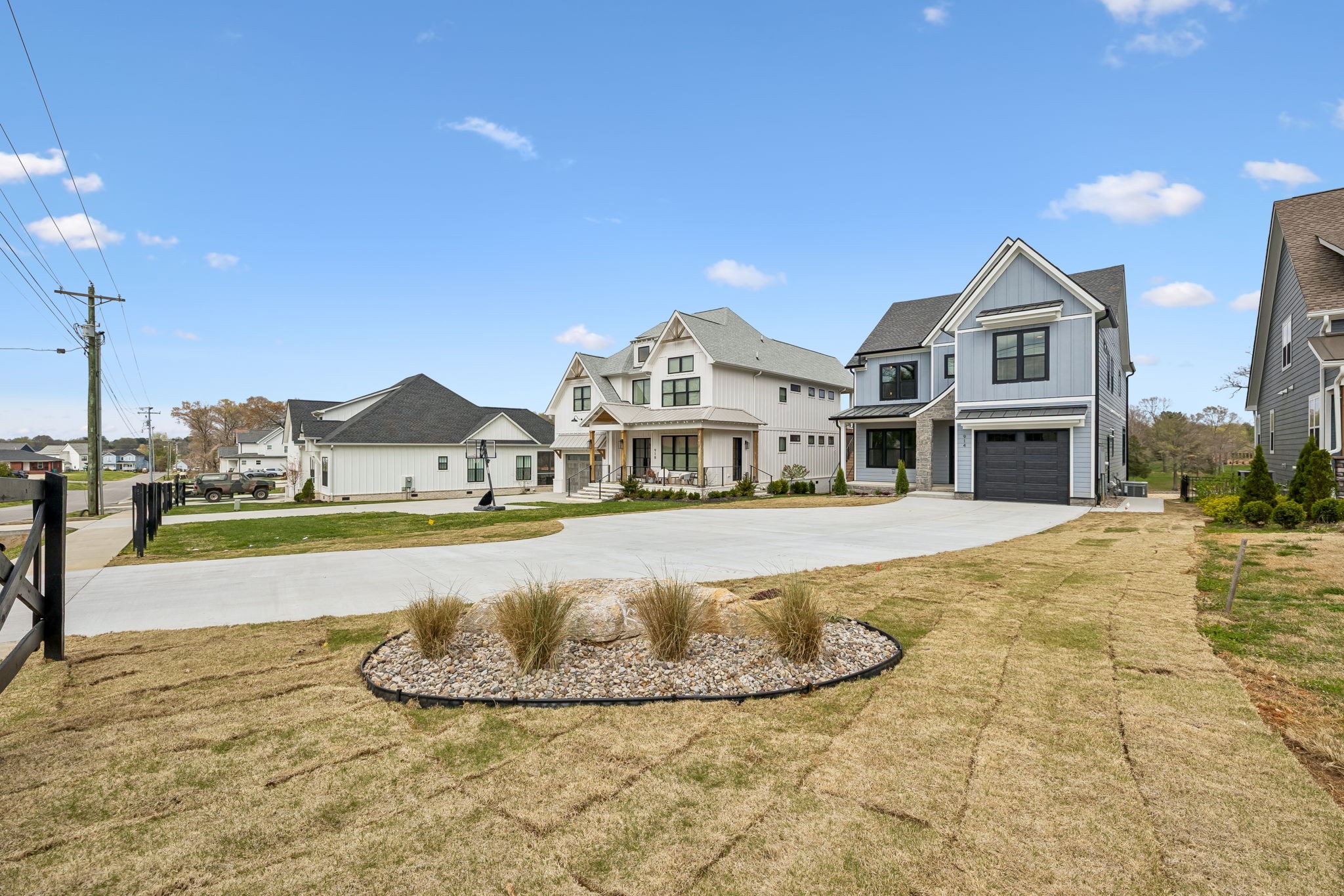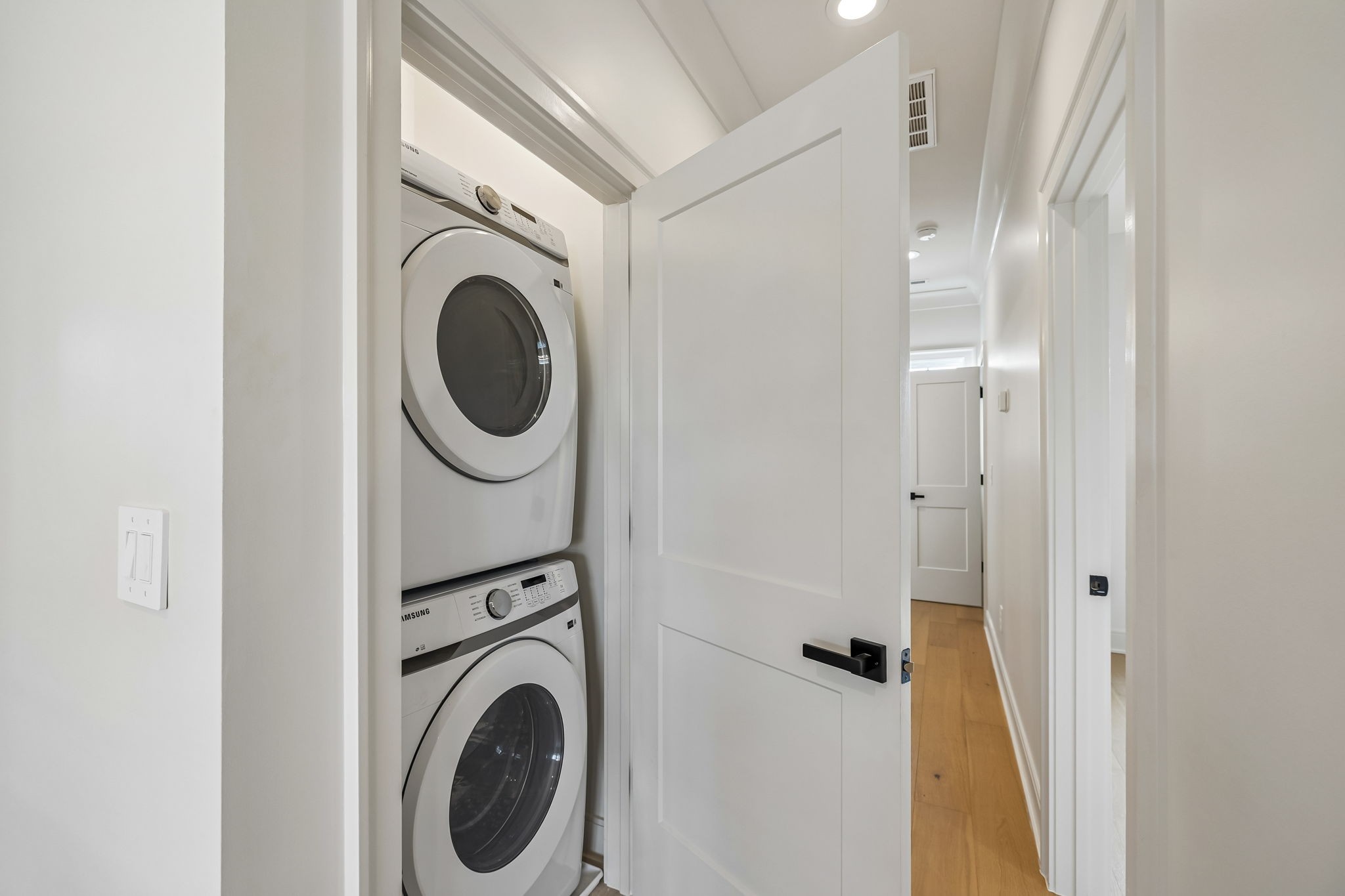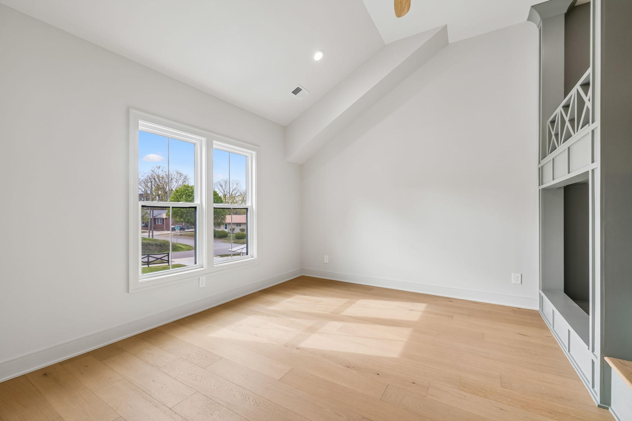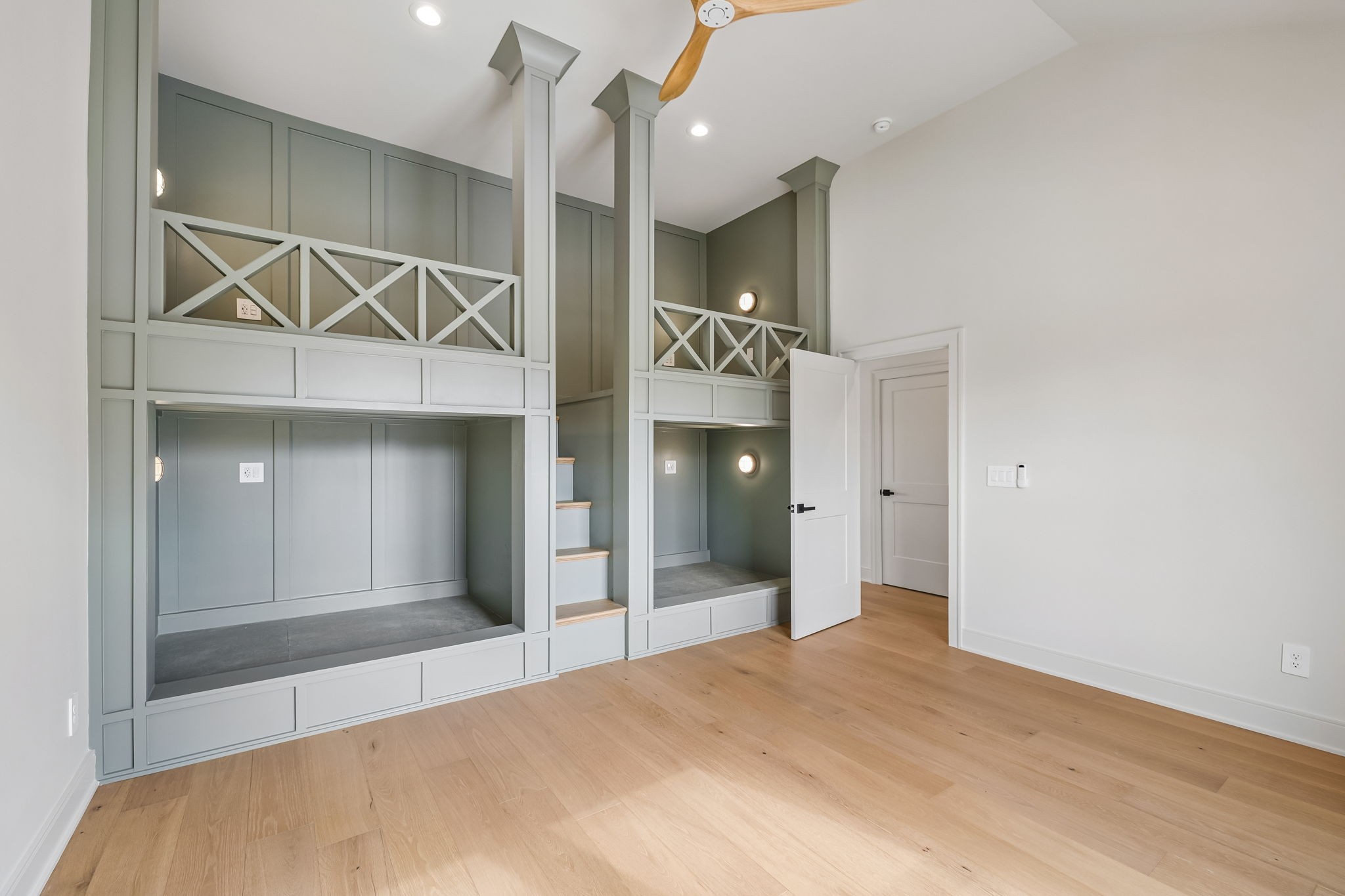 The main level features 10’ ceilings, 8’ solid-core doors, and a dramatic 21’ vaulted family room with a floor-to-ceiling natural stone fireplace. Pocketing glass sliders open to a covered porch with stunning lake views. The kitchen includes custom Tiger cabinetry to the ceiling with soft-close doors and drawers, pull-out shelving, and KitchenAid Professional appliances. Wide-plank white oak hardwood flooring runs throughout. A spacious mudroom offers additional cabinetry, countertop workspace, washer/dryer, extra refrigerator, and custom drop zone. A main-level bedroom with attached bath adds flexibility.