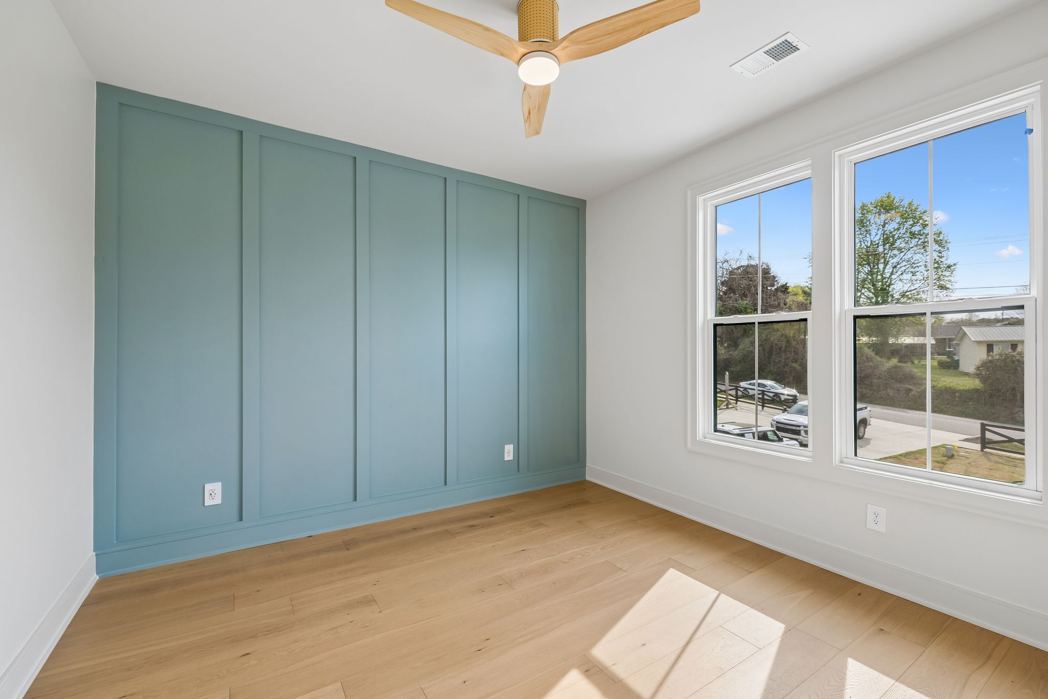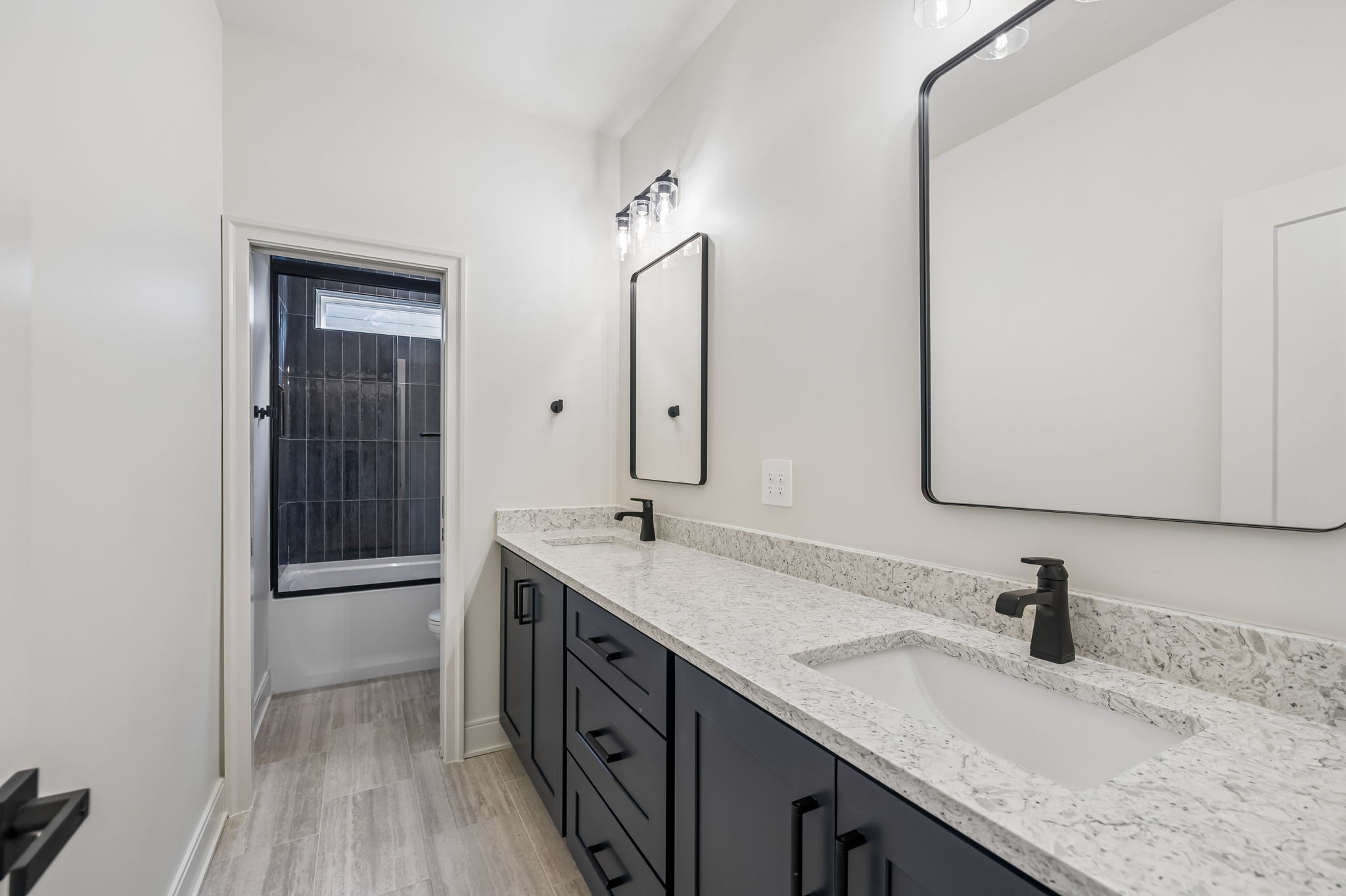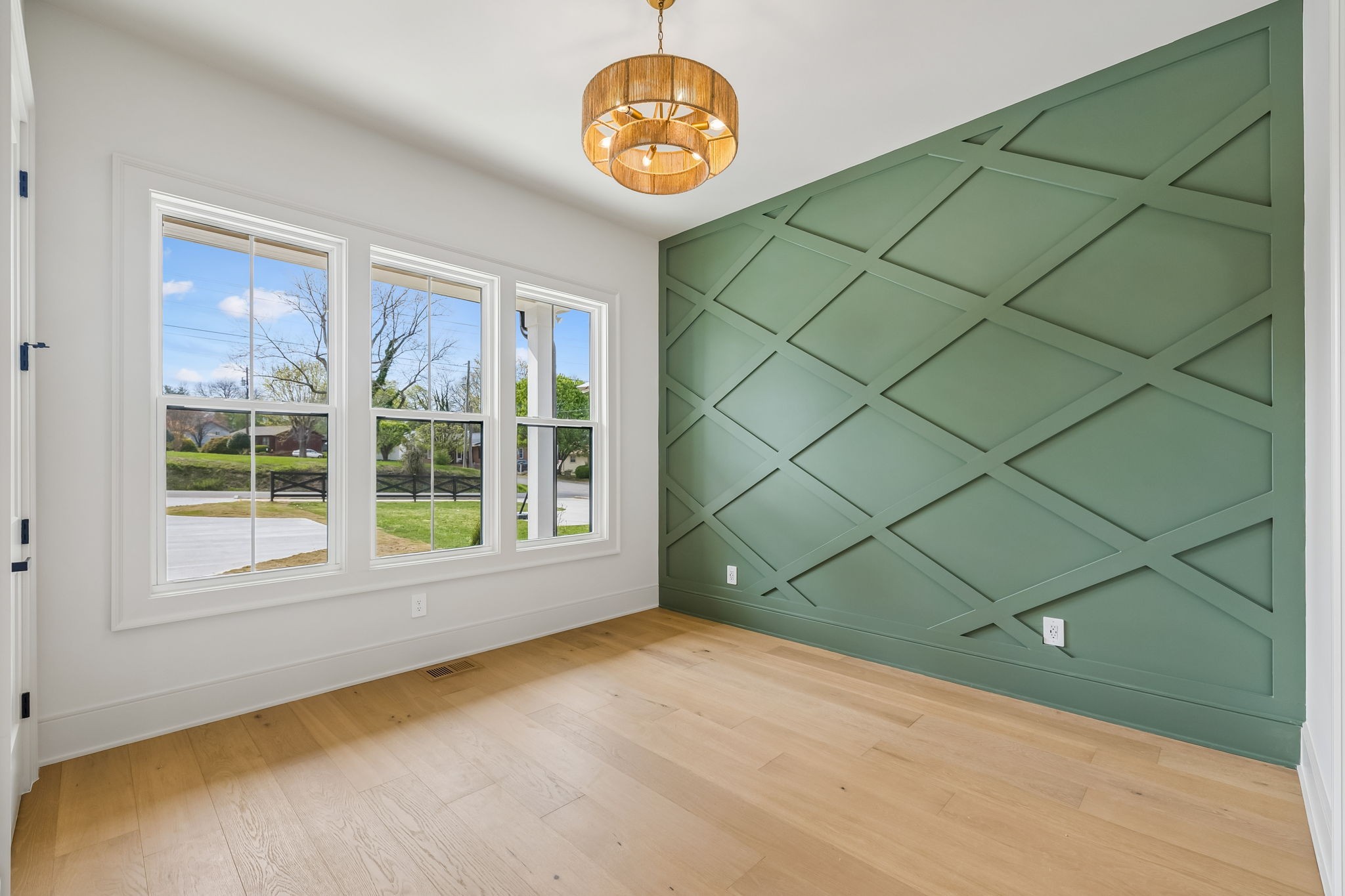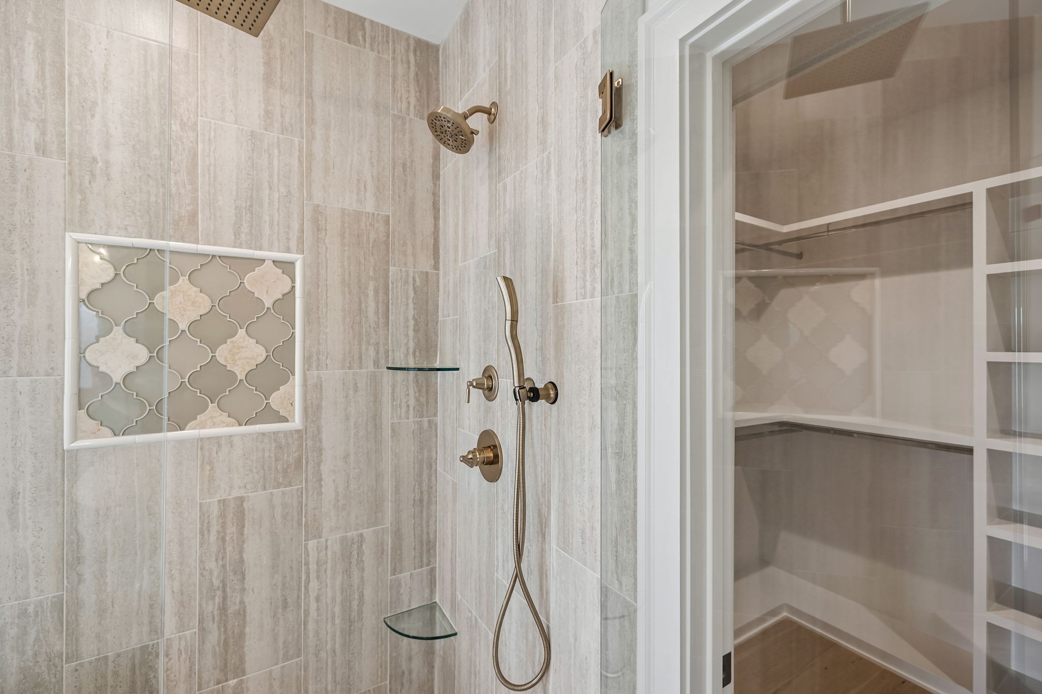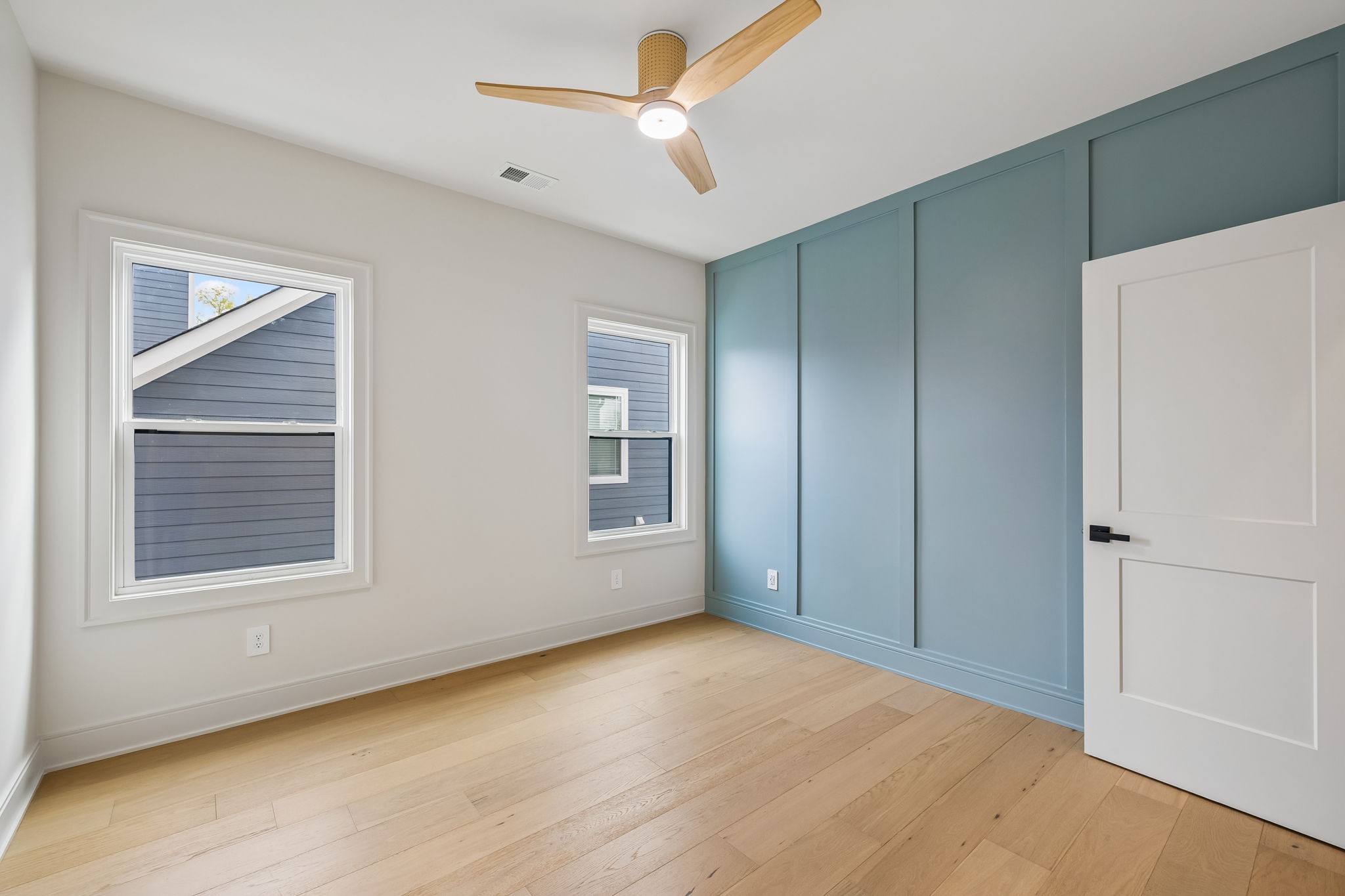 The main level features 10’ ceilings, 8’ solid-core doors, and a dramatic 21’ vaulted family room with a floor-to-ceiling natural stone fireplace. Pocketing glass sliders open to a covered porch with stunning lake views. The kitchen includes custom Tiger cabinetry to the ceiling with soft-close doors and drawers, pull-out shelving, and KitchenAid Professional appliances. Wide-plank white oak hardwood flooring runs throughout. A spacious mudroom offers additional cabinetry, countertop workspace, washer/dryer, extra refrigerator, and custom drop zone. A main-level bedroom with attached bath adds flexibility.