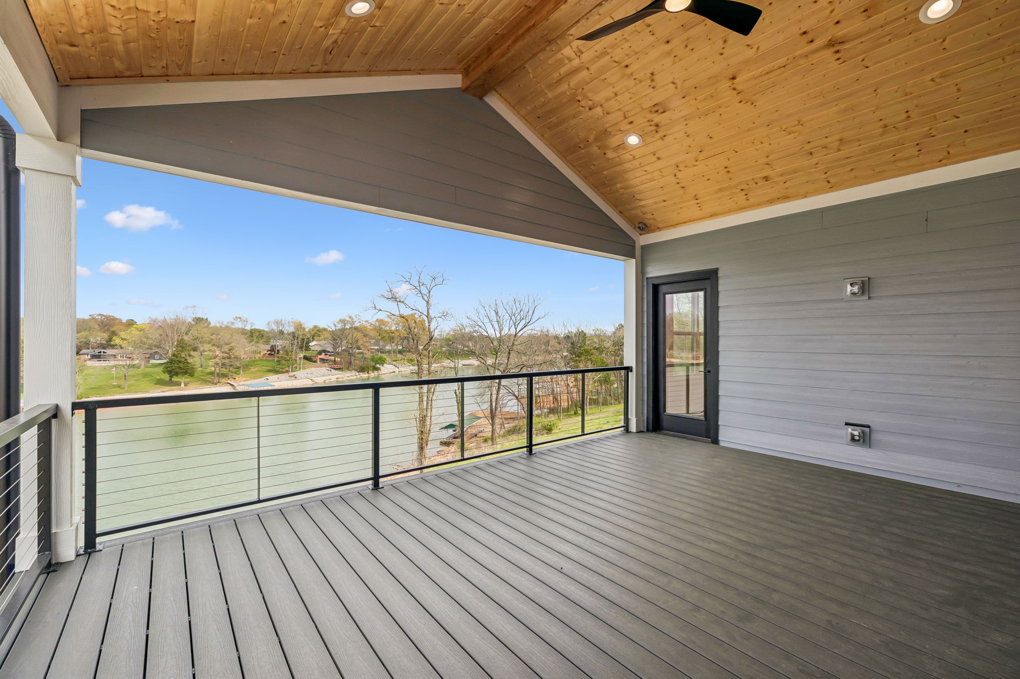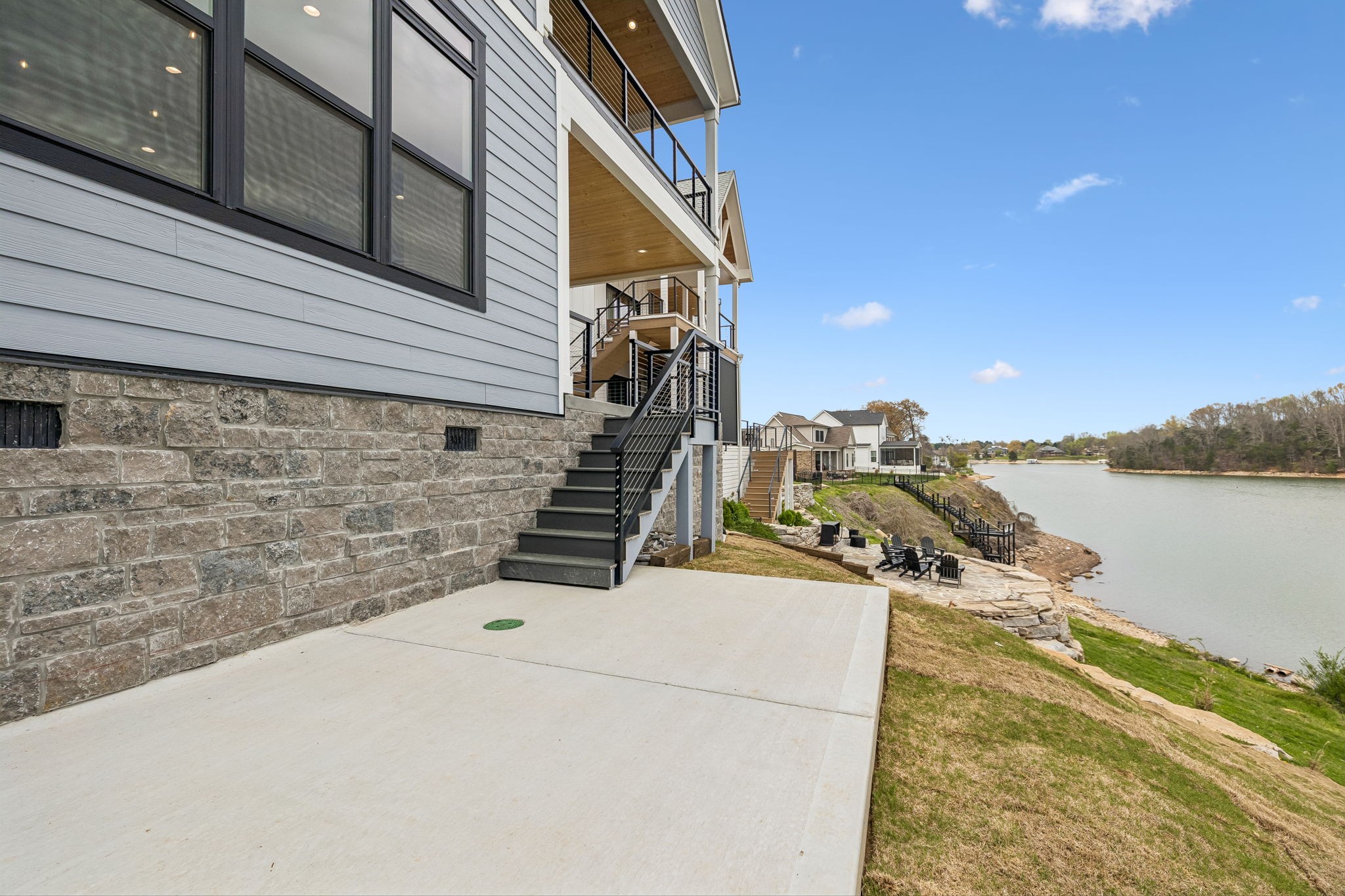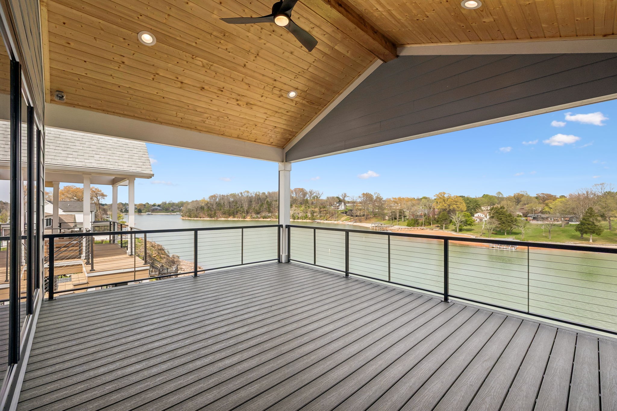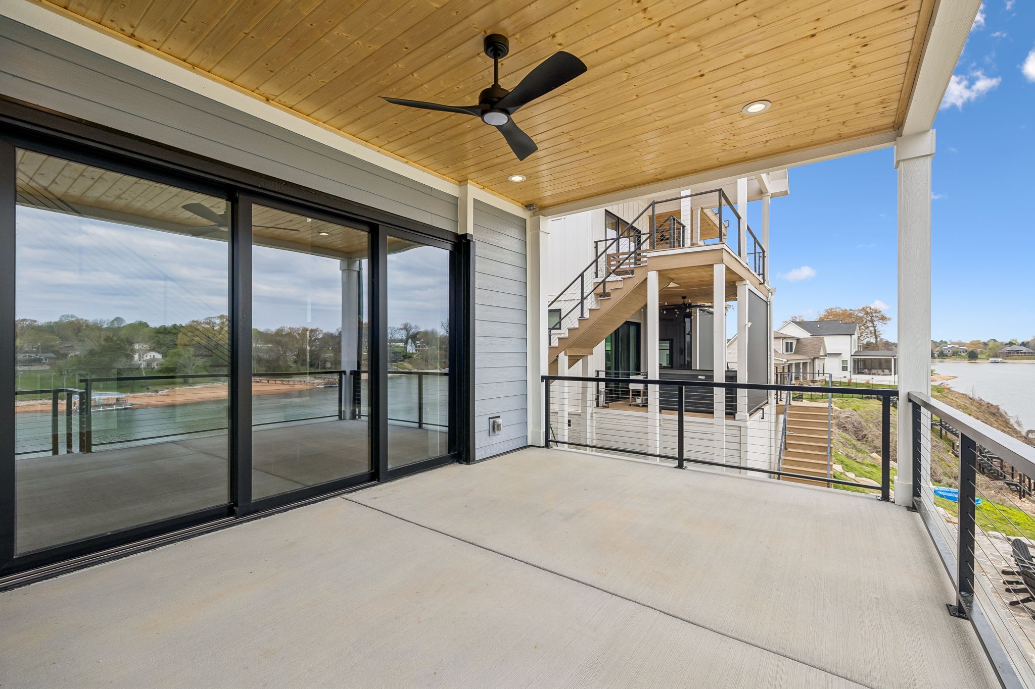 Upstairs includes the primary suite with spa-style bath and private covered balcony overlooking the lake, along with two additional bedrooms, a full bath, bunk room, and second laundry.