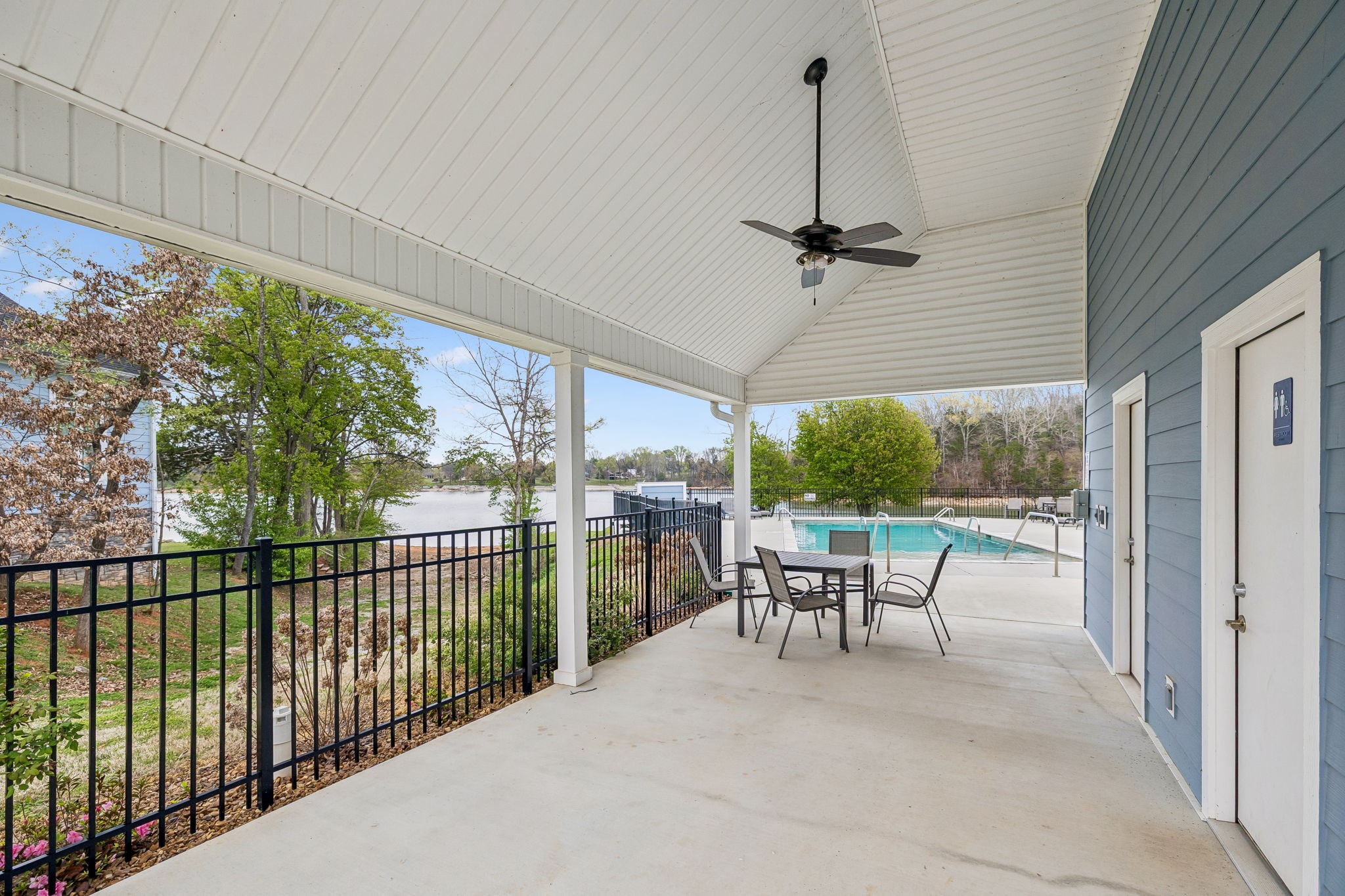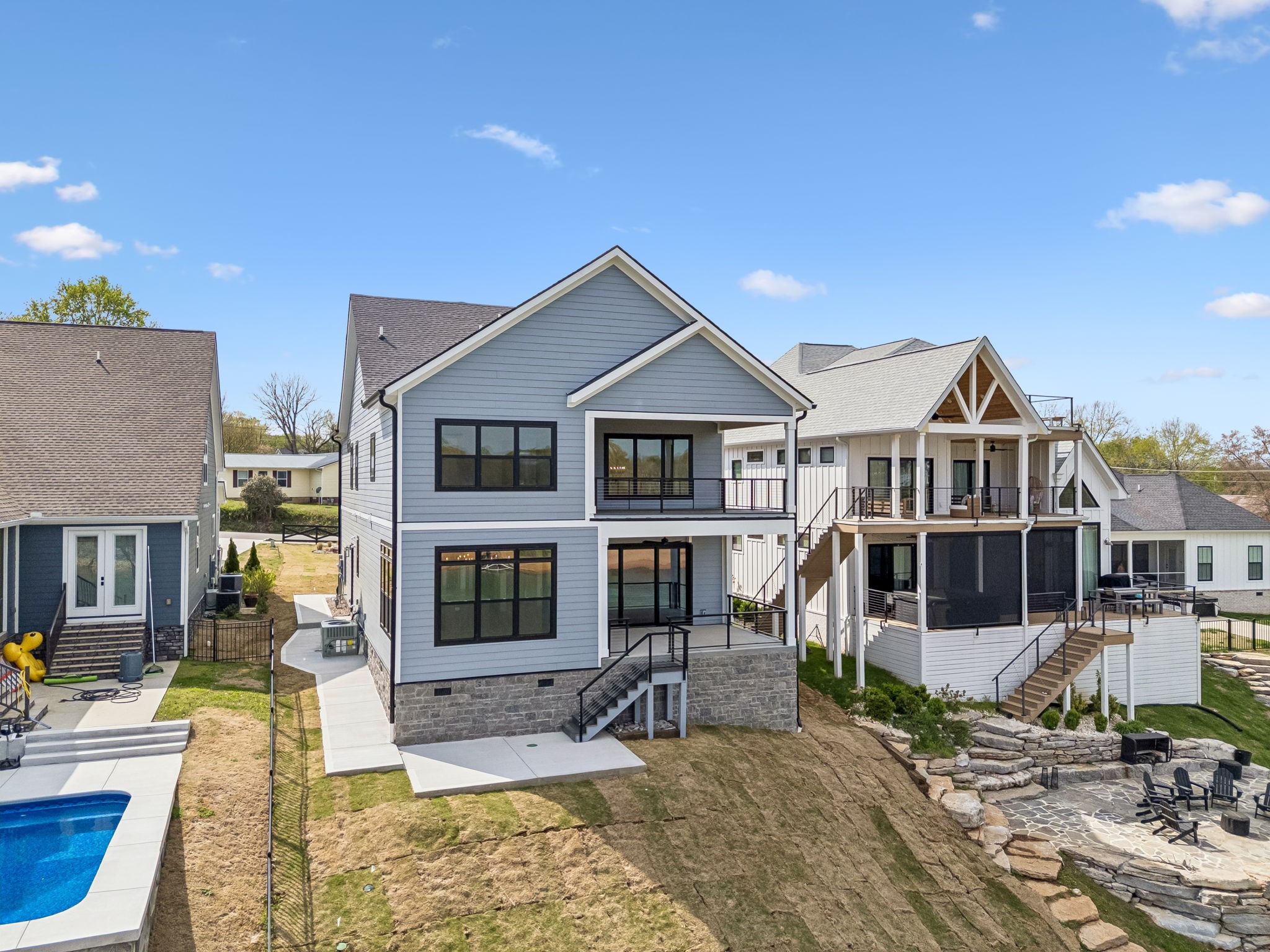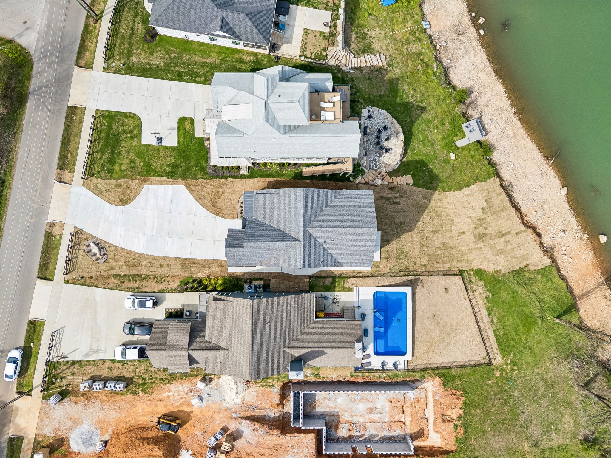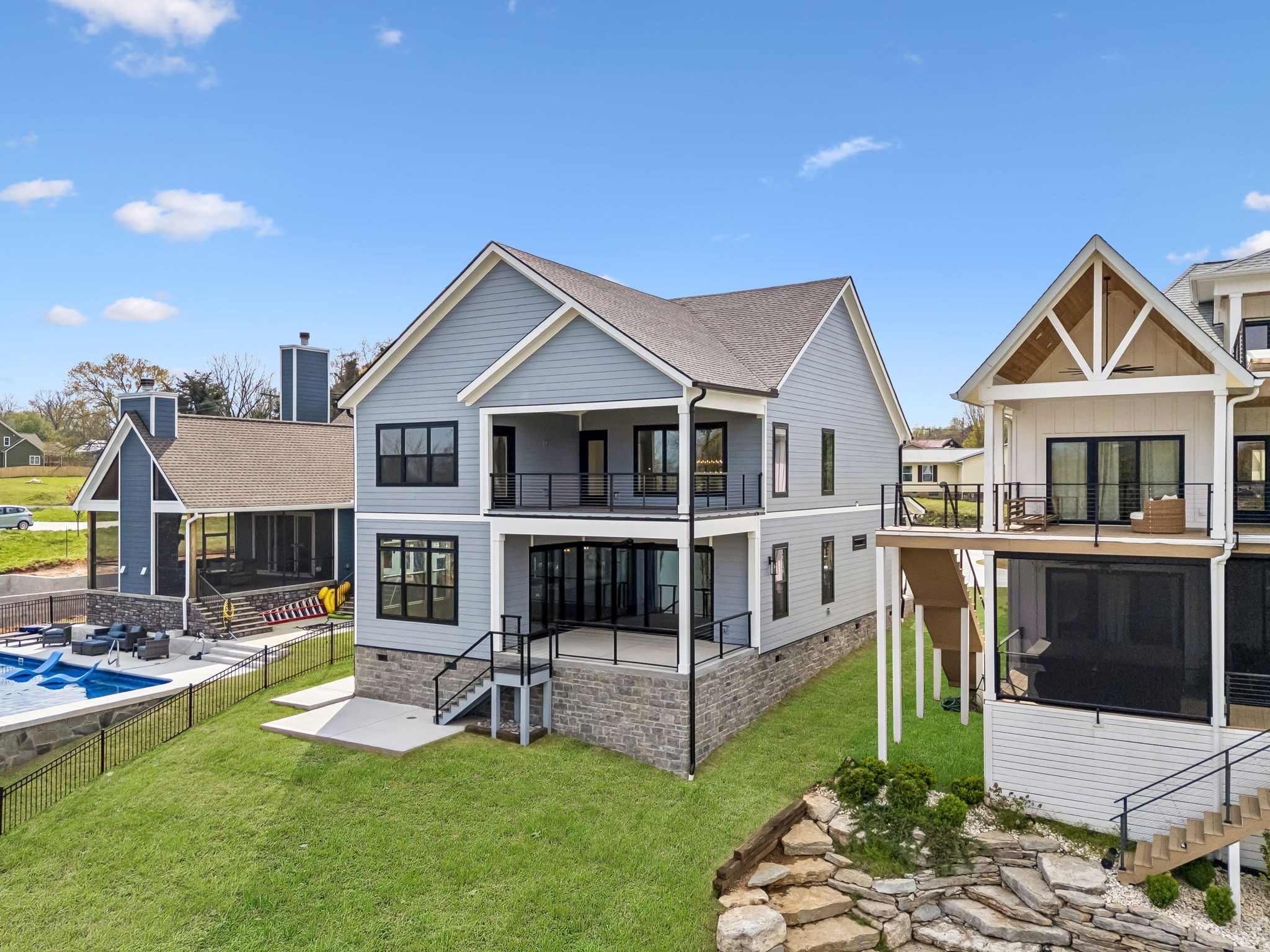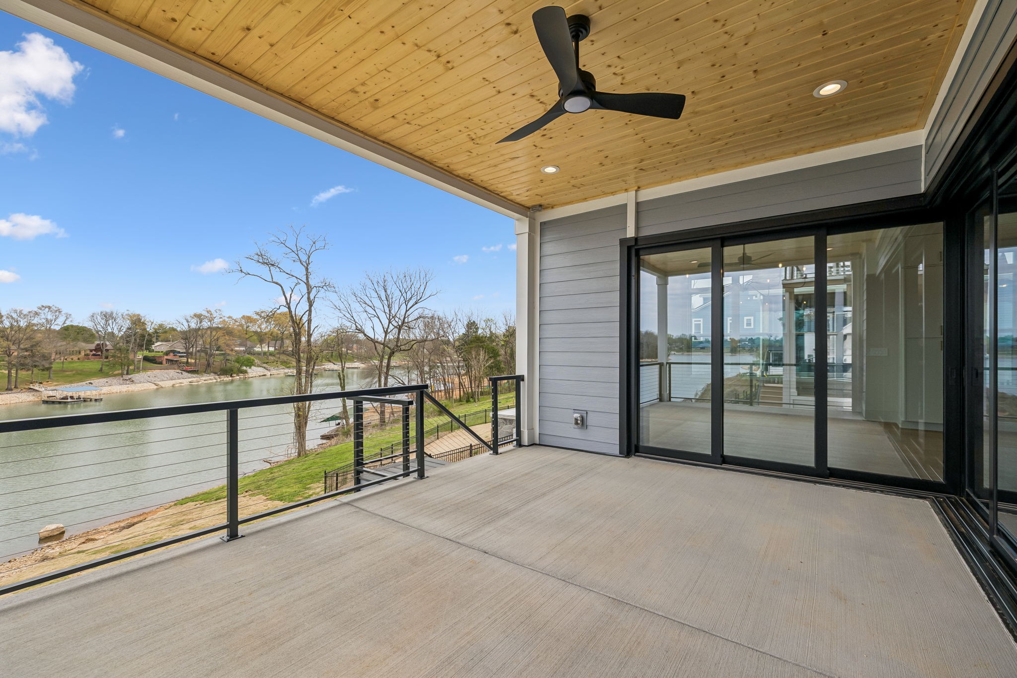Upstairs includes the primary suite with spa-style bath and private covered balcony overlooking the lake, along with two additional bedrooms, a full bath, bunk room, and second laundry.