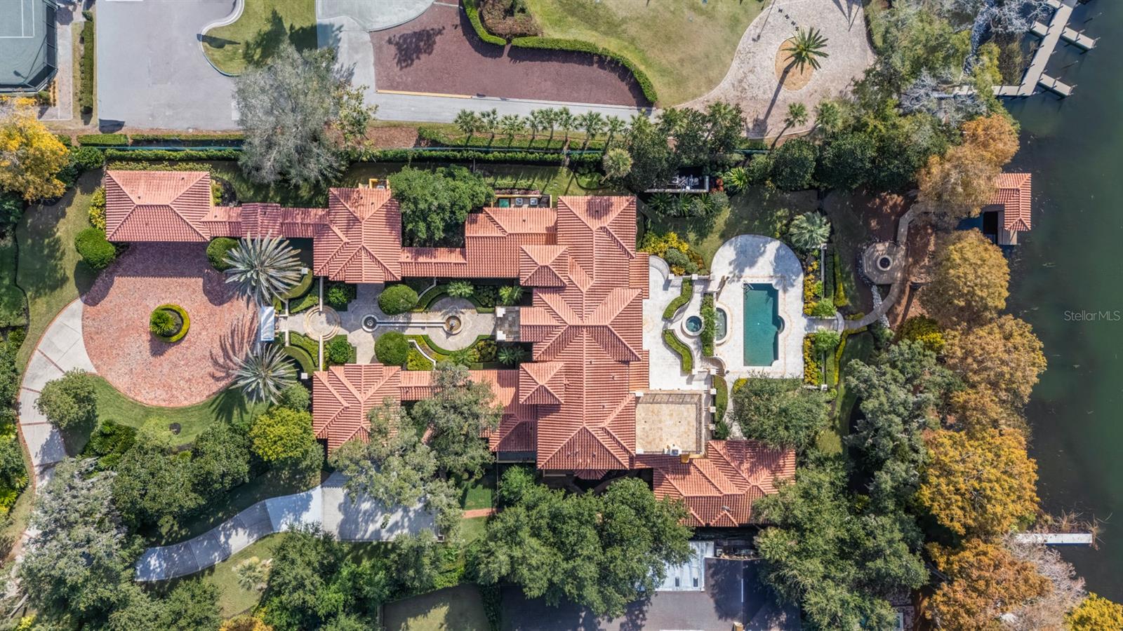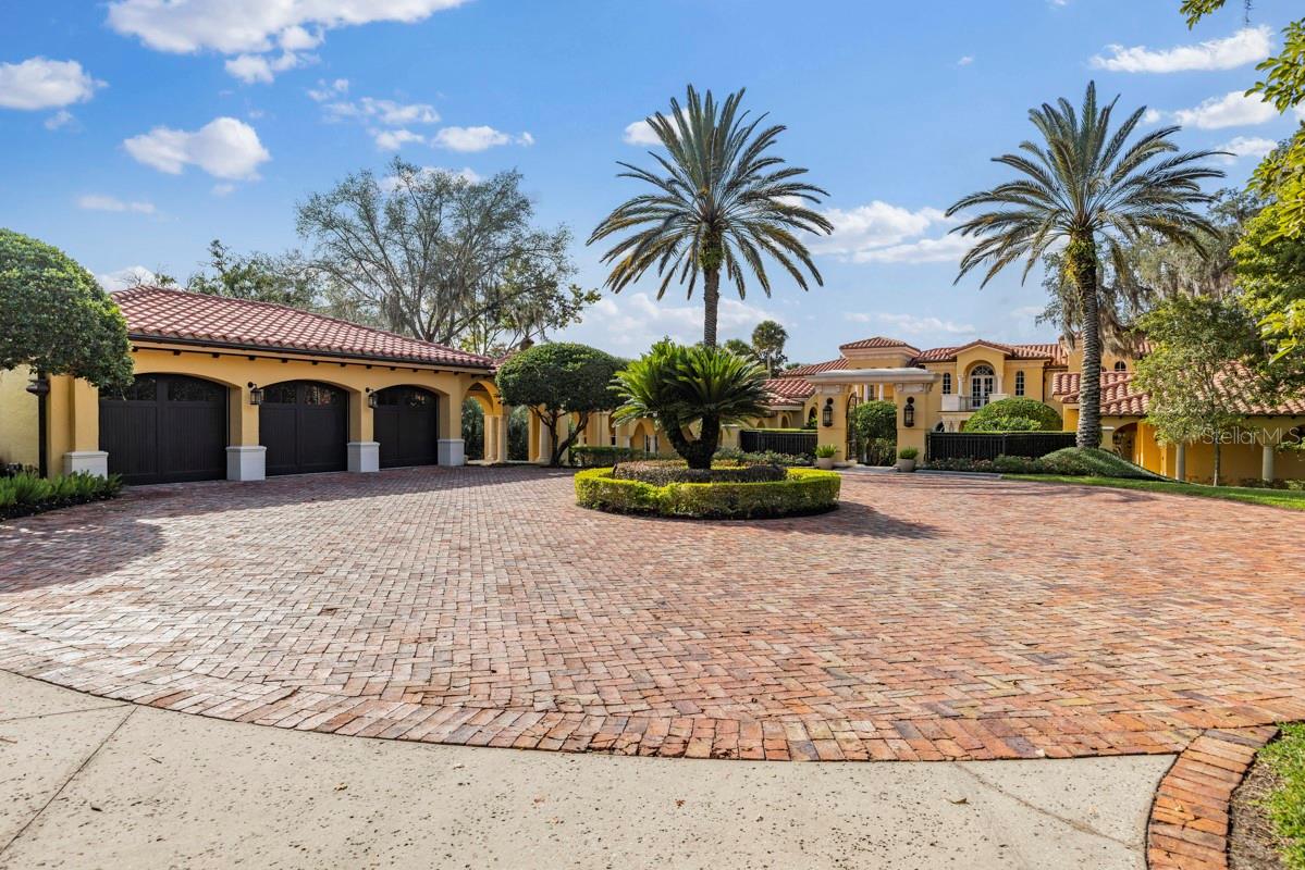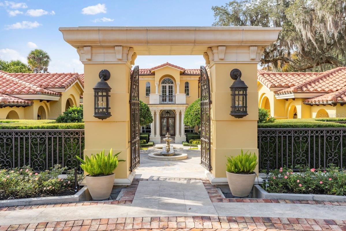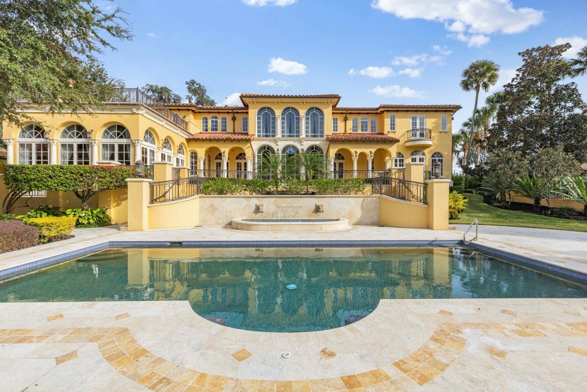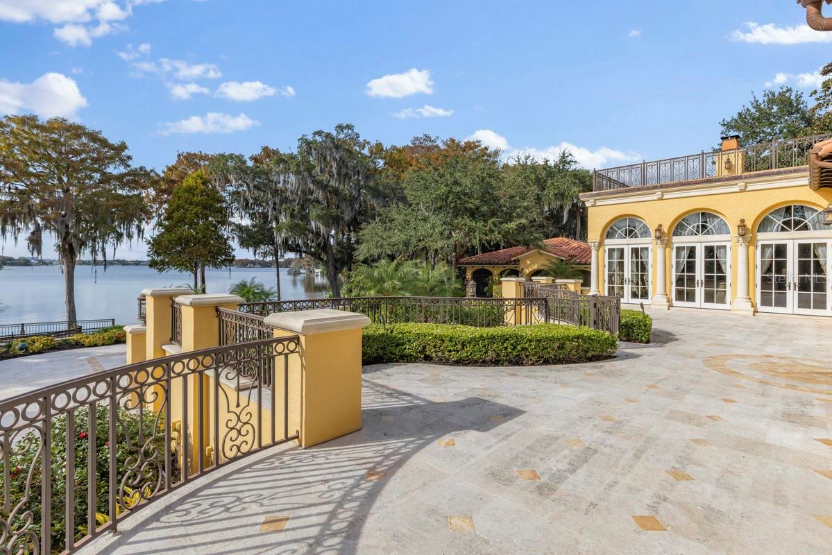 Elegant Mediterranean estate, masterfully crafted by Akers Custom Homes and set within the heart of the Vias. Privately tucked behind a gated drive, the approach unfolds to a grand circular motor court framed by lush, manicured grounds spanning over two acres with impressive sunset views across Lake Maitland. Every element of the estate is thoughtfully connected by covered walkways, including five garages (three-car and two-car) and two motor courts, a detached office or seventh bedroom suite, and a lakeside pool cabana, creating a seamless blend of function, elegance and architectural harmony in this one-owner Lake Maitland residence. A dramatic arrival sets the tone as a flowing water feature guides guests along the walkway to the front entry. Inside, the grand foyer opens to a breathtaking gathering room, anchored by soaring two-story windows that frame panoramic lake views, the expansive terrace and terraced outdoor space. A dedicated space for a grand piano enhances the home’s capacity for elegant entertainment and memorable gatherings. The spacious kitchen overlooks the family room and is positioned alongside a dedicated bar, breakfast room and dining room. The family room, warmed by a gas fireplace, is filled with natural light and opens through a wall of French doors to the open terrace, blurring the line between indoor and outdoor living. The first-floor primary suite is a serene retreat with French doors to a covered outdoor space, a fireside sitting area wrapped in custom bookshelves, and a spa-inspired bath featuring a large glass shower, soaking tub, expansive walk-in closet, and a versatile flex room ideal for yoga, massage or expanded wardrobe space. A full guest suite with en-suite bath and walk-in closet is also on the main level. Upstairs, a grand mezzanine overlooks the gathering room, offering a dramatic extension of the living areas. French doors open to a front balcony, while the west wing features two bedrooms with a shared private living room and full bath. The east wing hosts two additional bedroom suites, each with walk-in closets and en-suite baths, one enhanced by a private sitting area and access to a spacious rear balcony. Off the kitchen, a wrought-iron gate leads to the basement level, where a refrigerated wine cellar, theater room, and generous storage space await. Outdoors, the stunning terrace showcases a heated spa, sparkling lakeside pool, expansive gas fire pit and an extraordinary 700-square-foot pool cabana that offers a wraparound screened porch with summer kitchen, a full bar, gaming area and full bath, ideal for lakeside entertaining. Elevated above the water for commanding views and shielded from the main road for complete privacy, this remarkable estate is a masterpiece, designed for multi-generational living and destined to create lasting memories for generations to come.